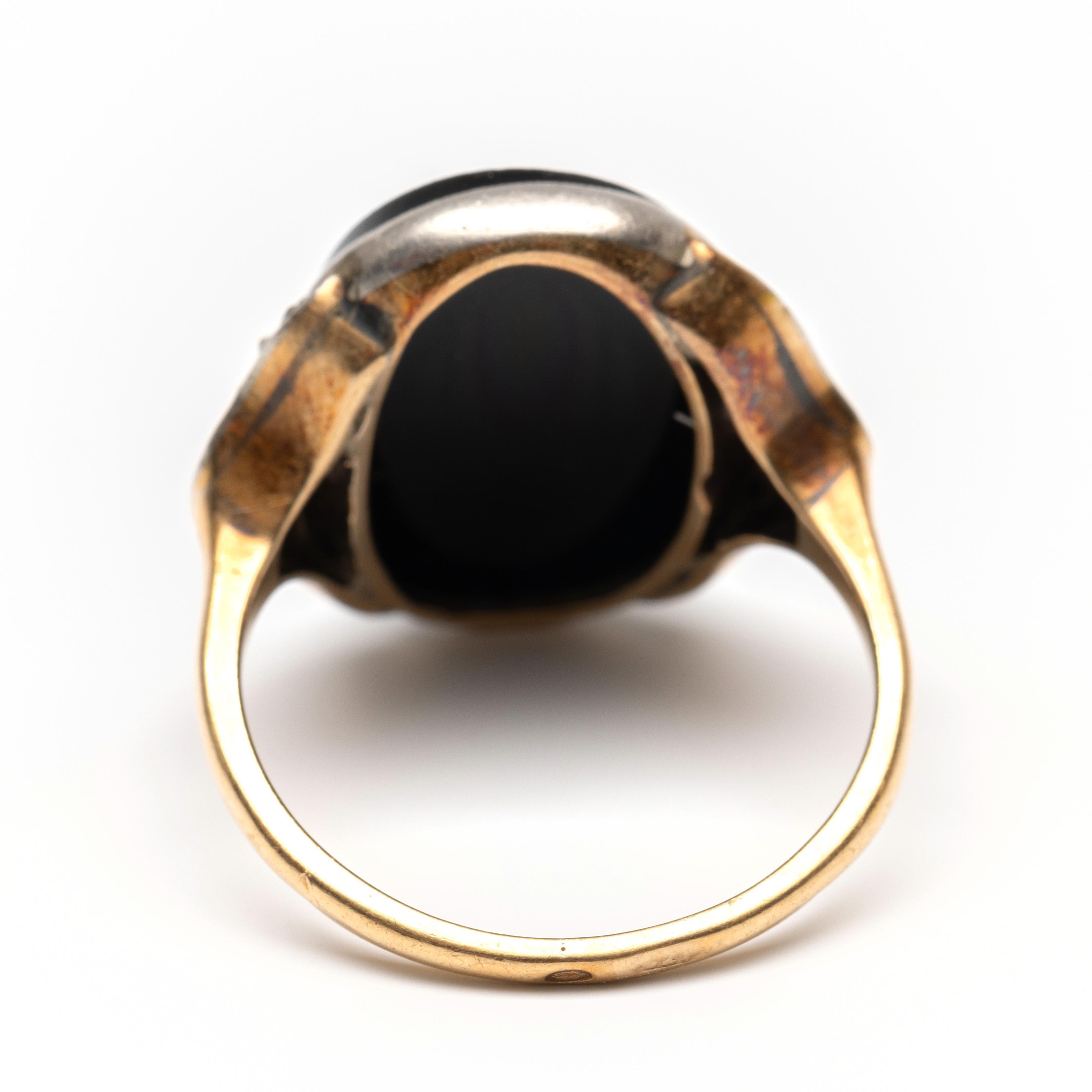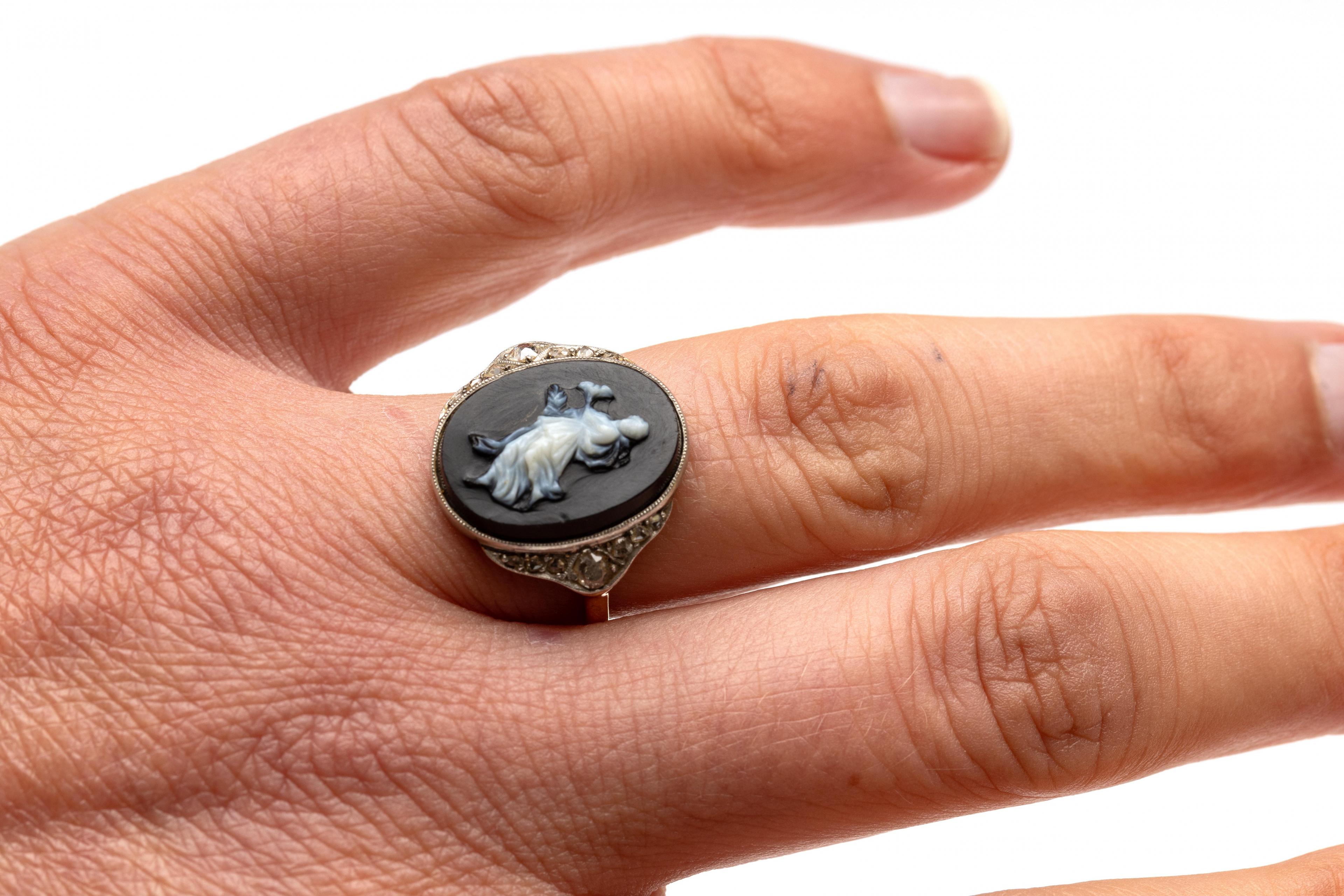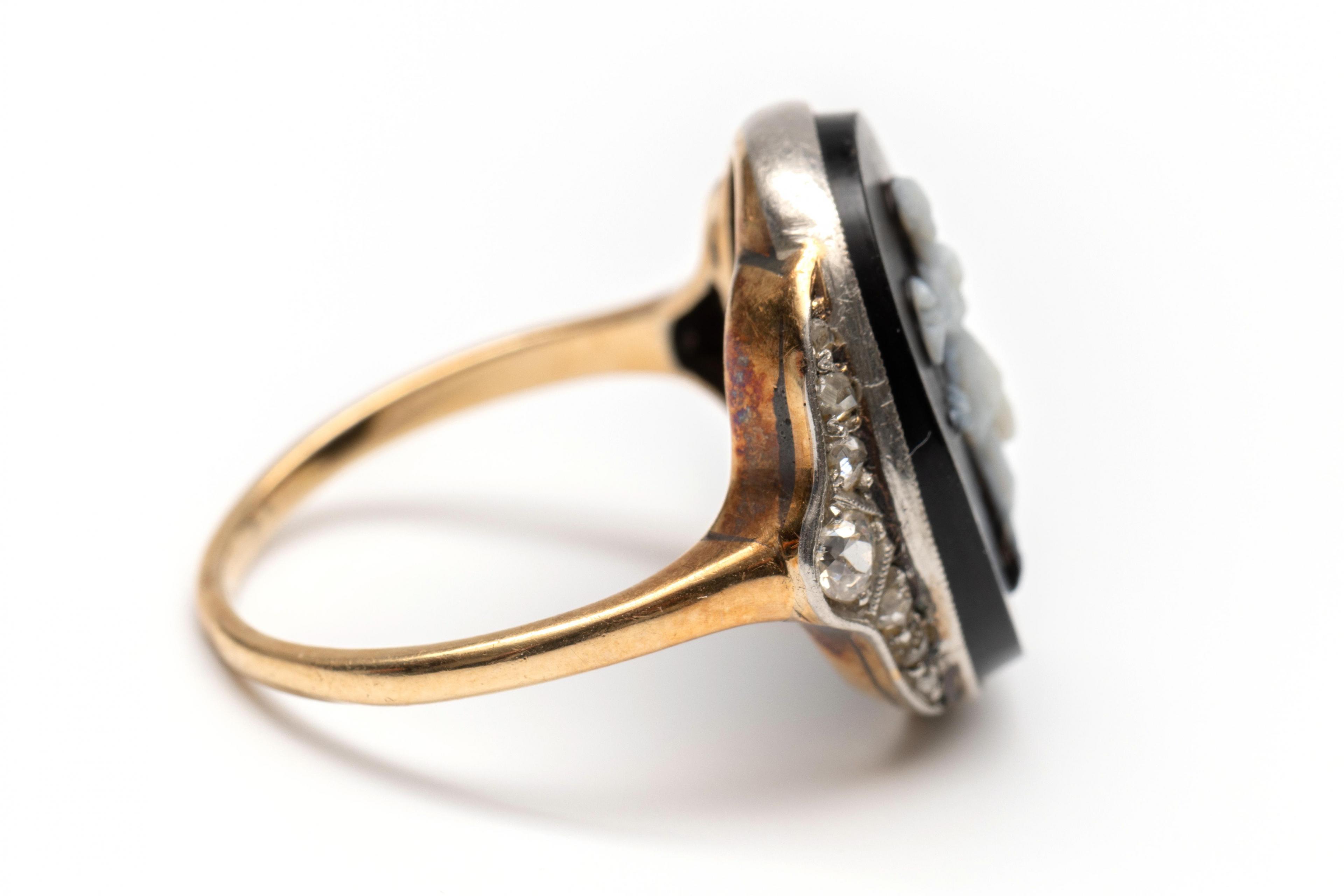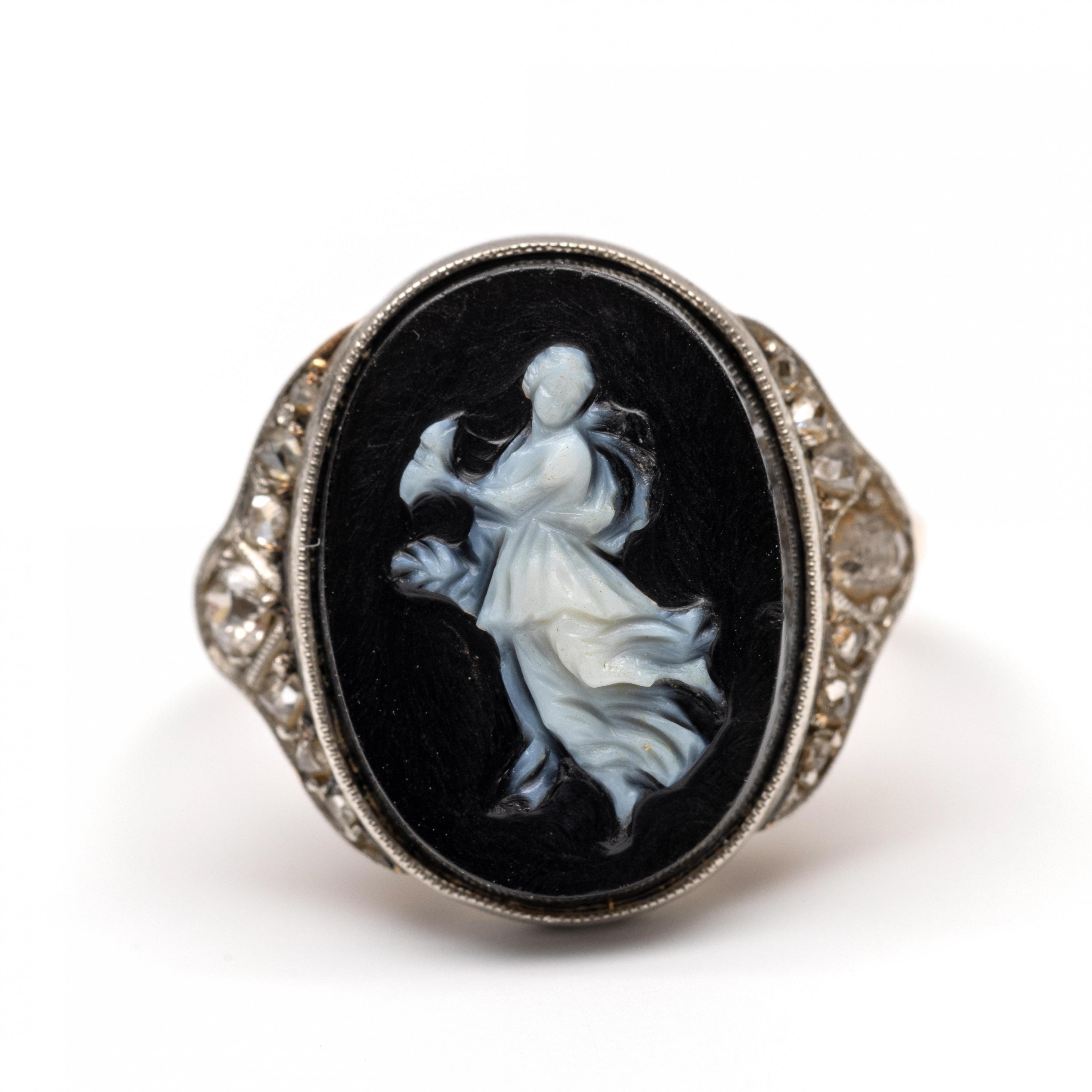 14 k. Gold ring, Belle Epoque. With an onyx cameo depicting a lady in a flowing dress. The shoulders set with small old brilliant-cut diamonds and rose-cut diamonds.
