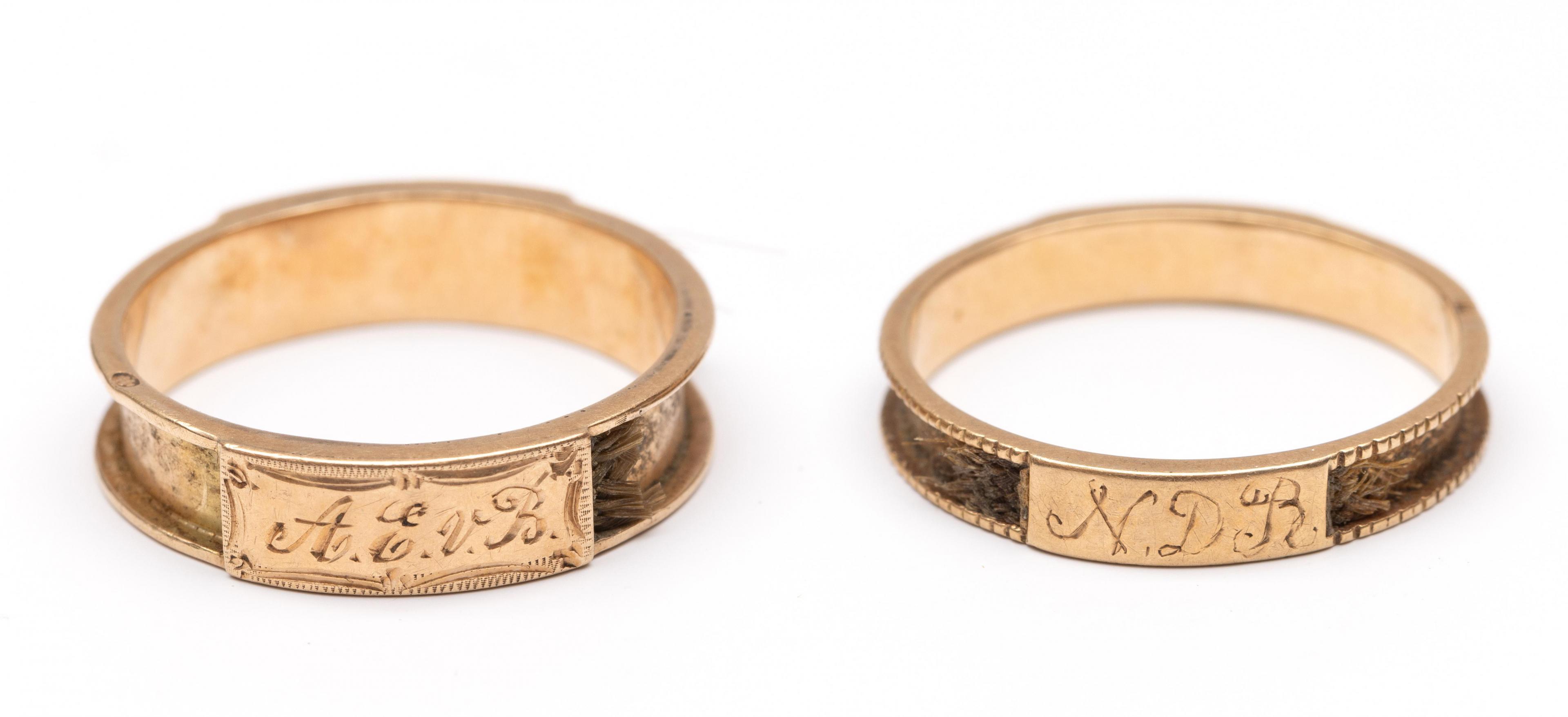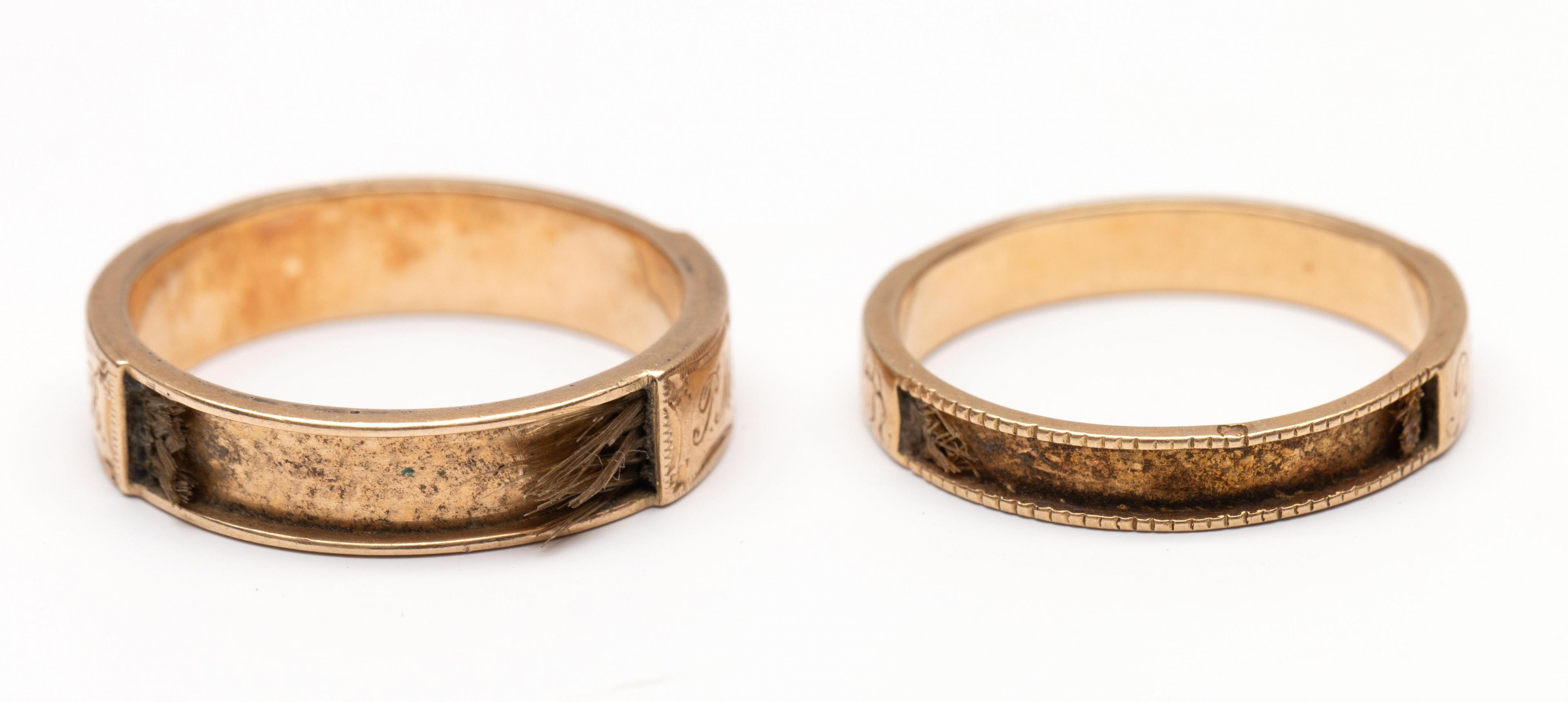 One 14 kt and one 18 kt gold ring, 19th century. Probably wedding rings. Both with cartouche on the front and back engraved with monogram. With remains of braided hair (cut out)
