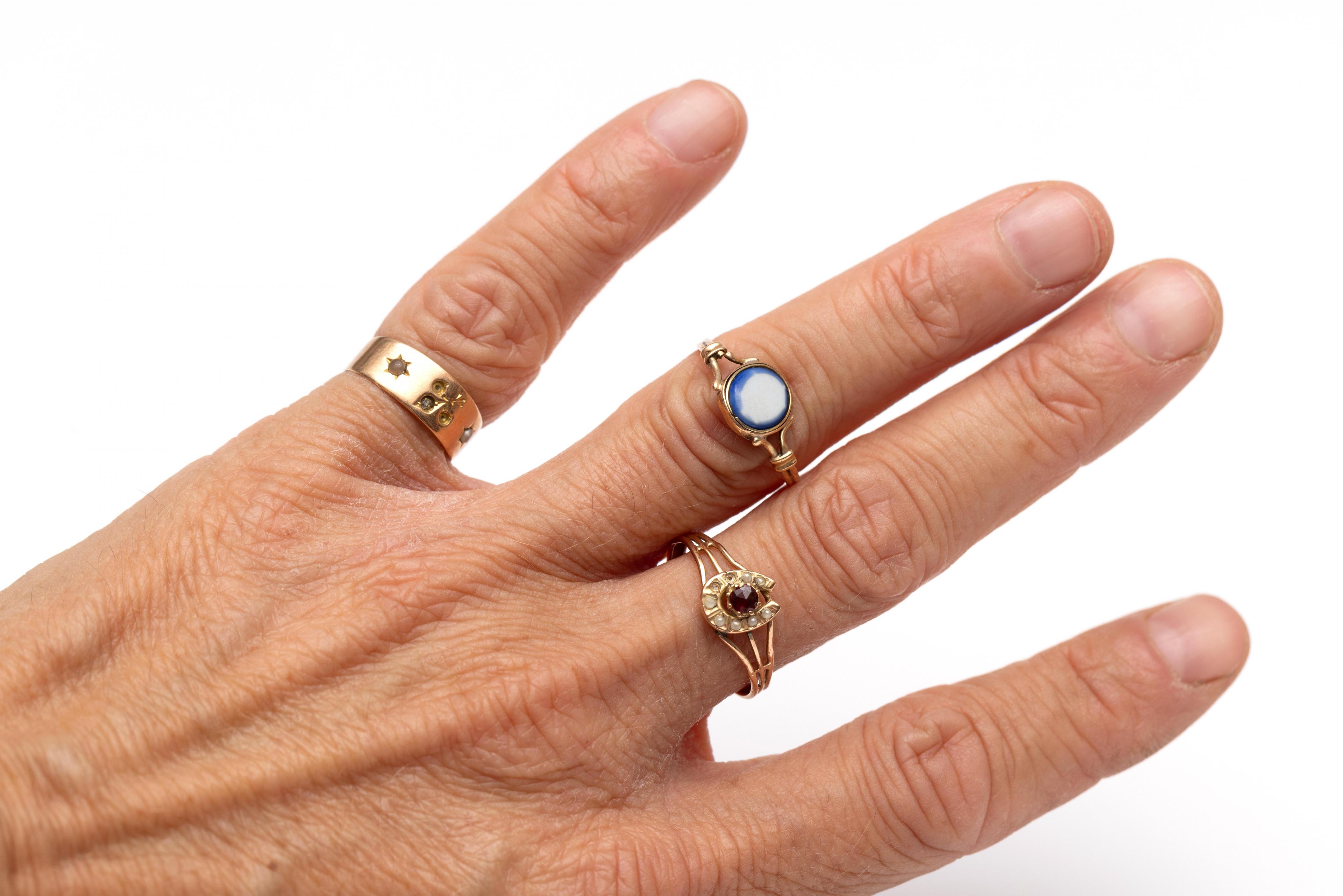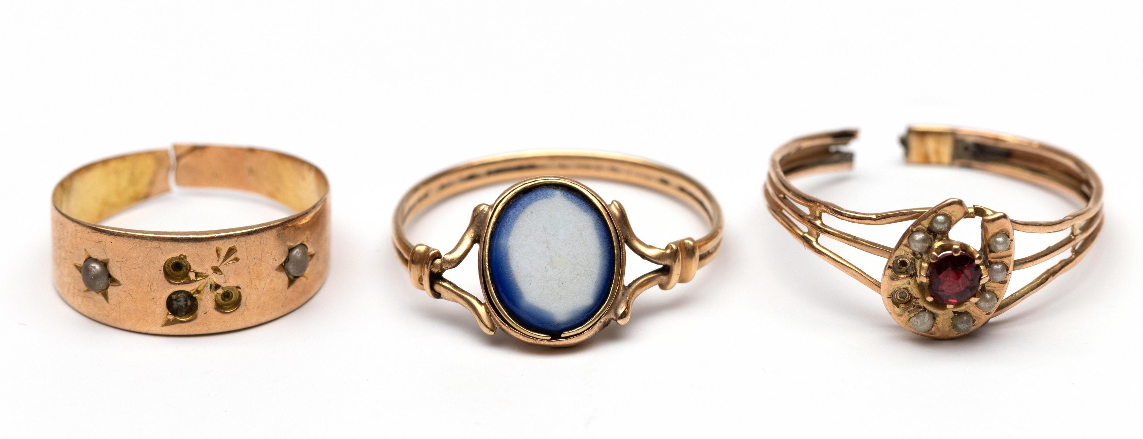 Three defective fine gold rings, 19th century. One with fleur de lis set with seed pearls (some missing), one with horseshoe set with seed pearls and ruby (chips) and one with white blue glass stone. All acid tested 14 k.