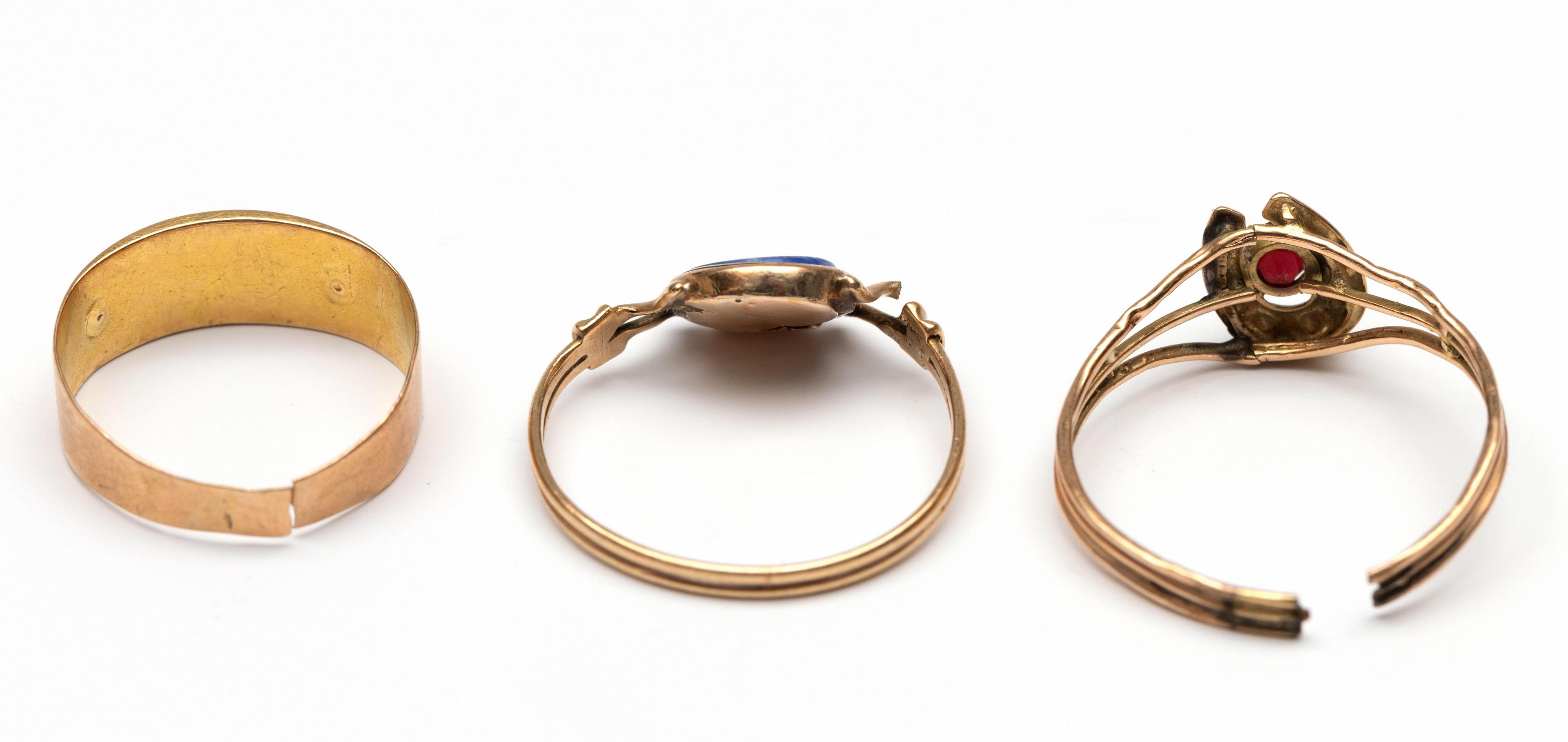 Drie defecte fijne gouden ringen, 19e eeuw.