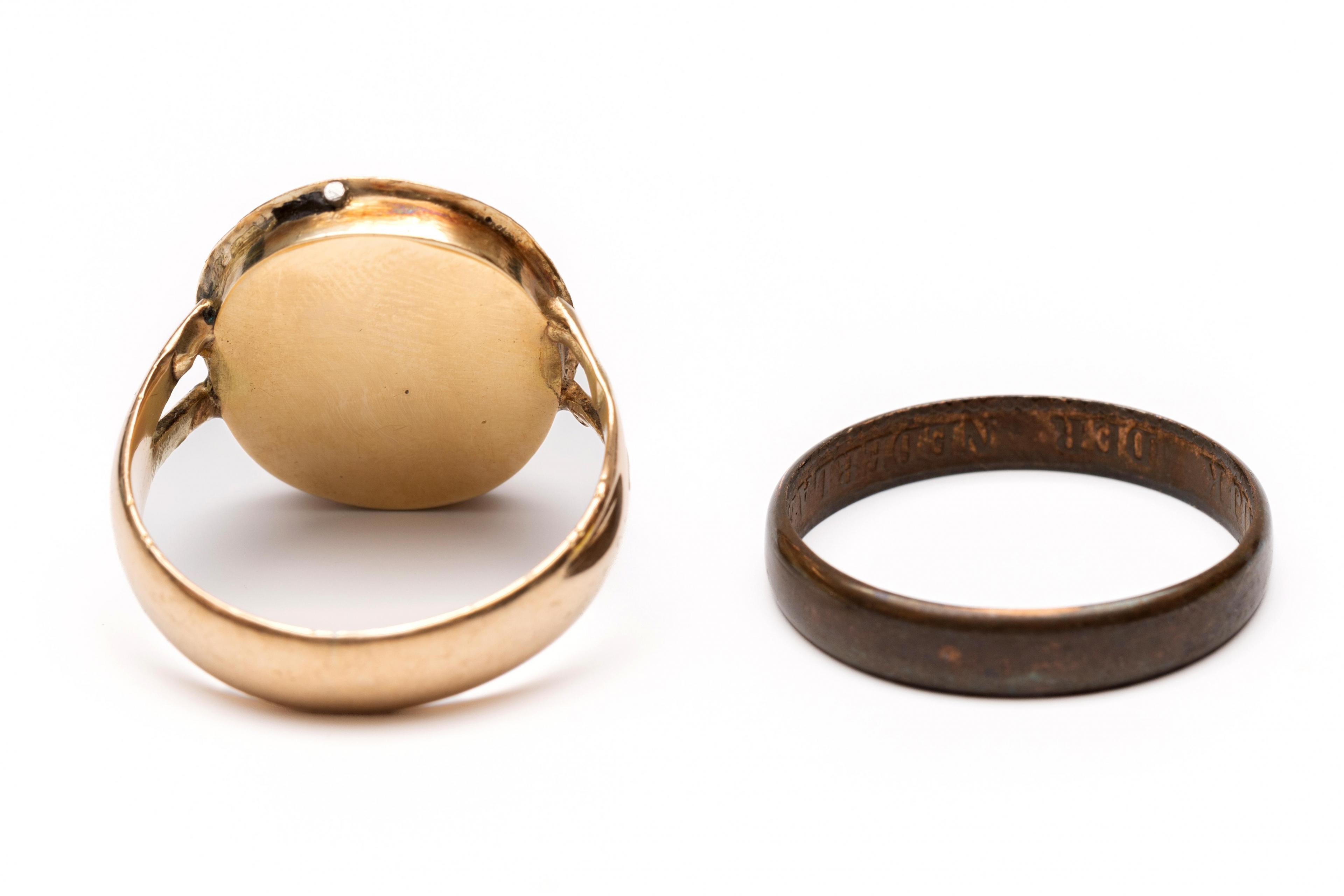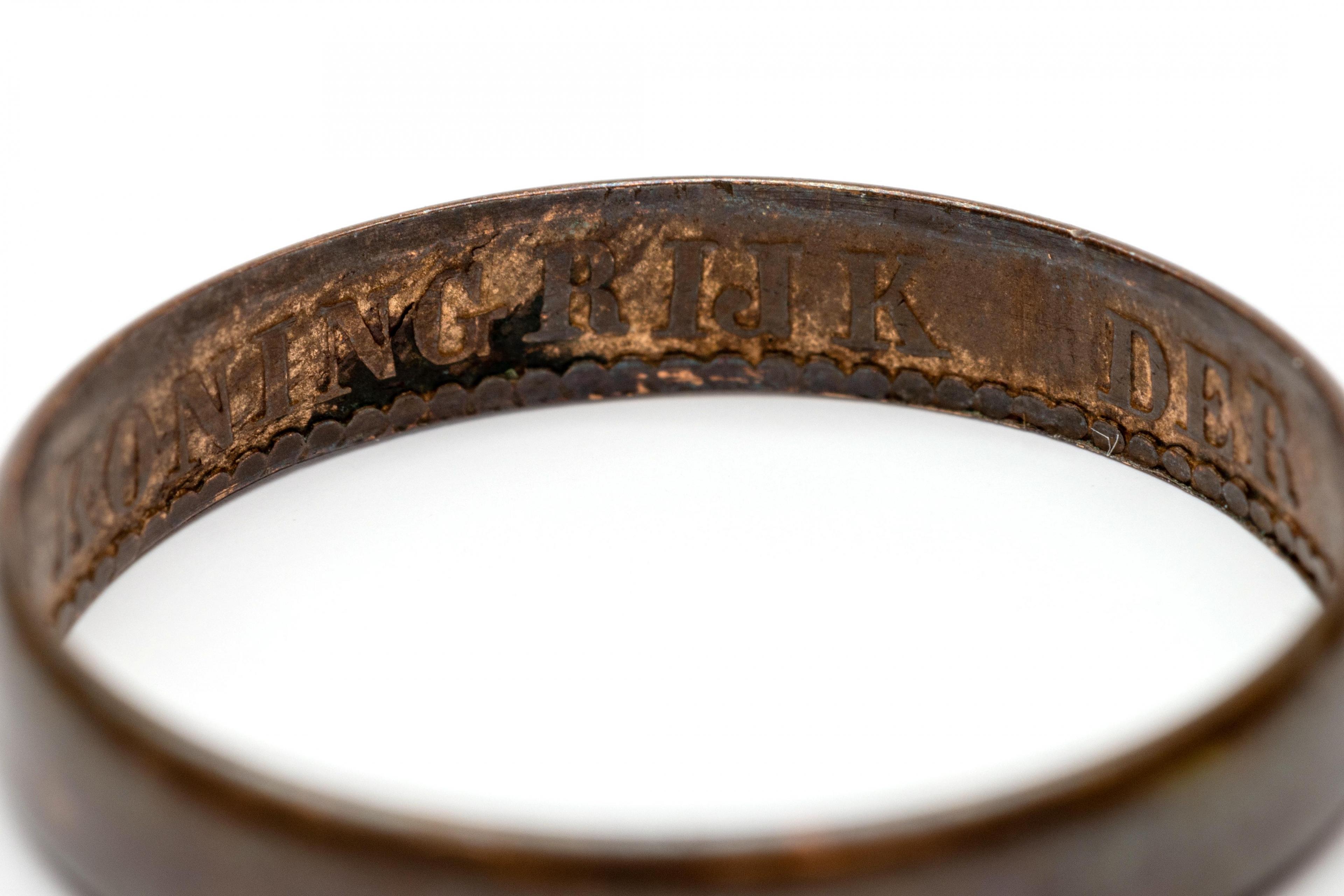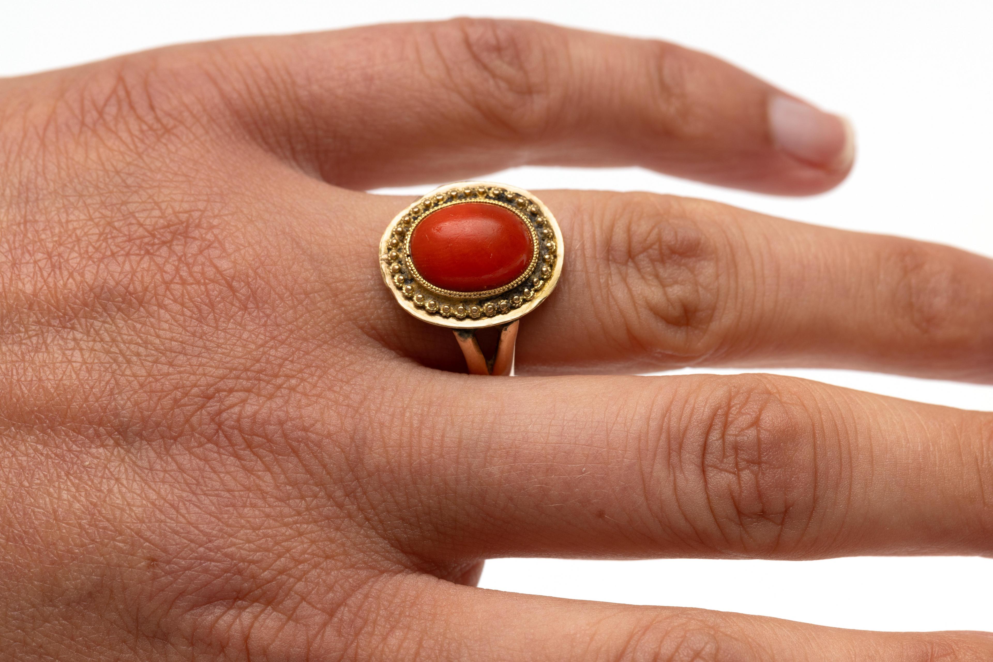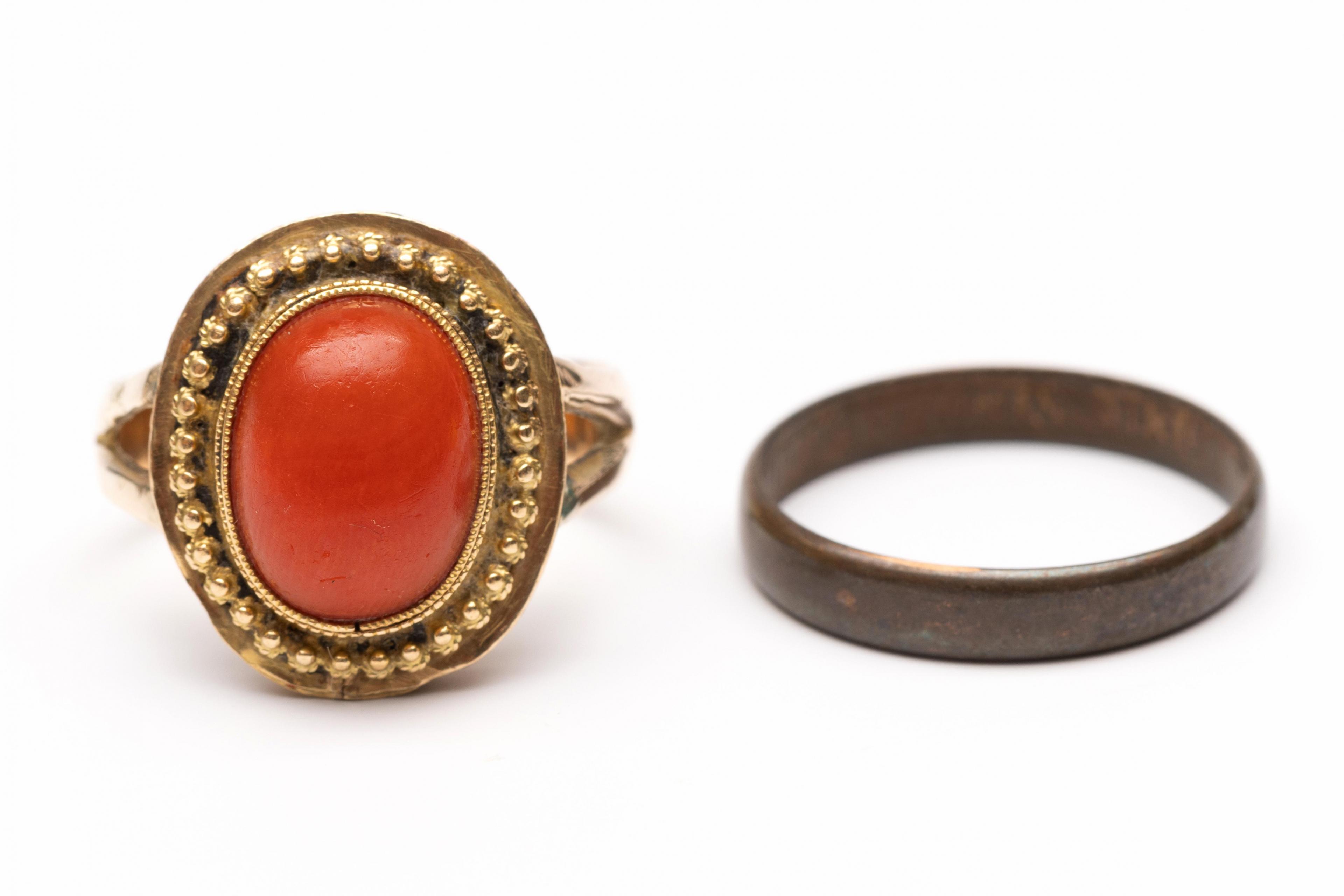 Gold ring, 19th century. Set with an oval cabochon cut blood coral (approx. 12 x 9.3 mm), the bezel decorated with cannetille. Hereby a copper ring, made of a half 'stuiver' from 1877