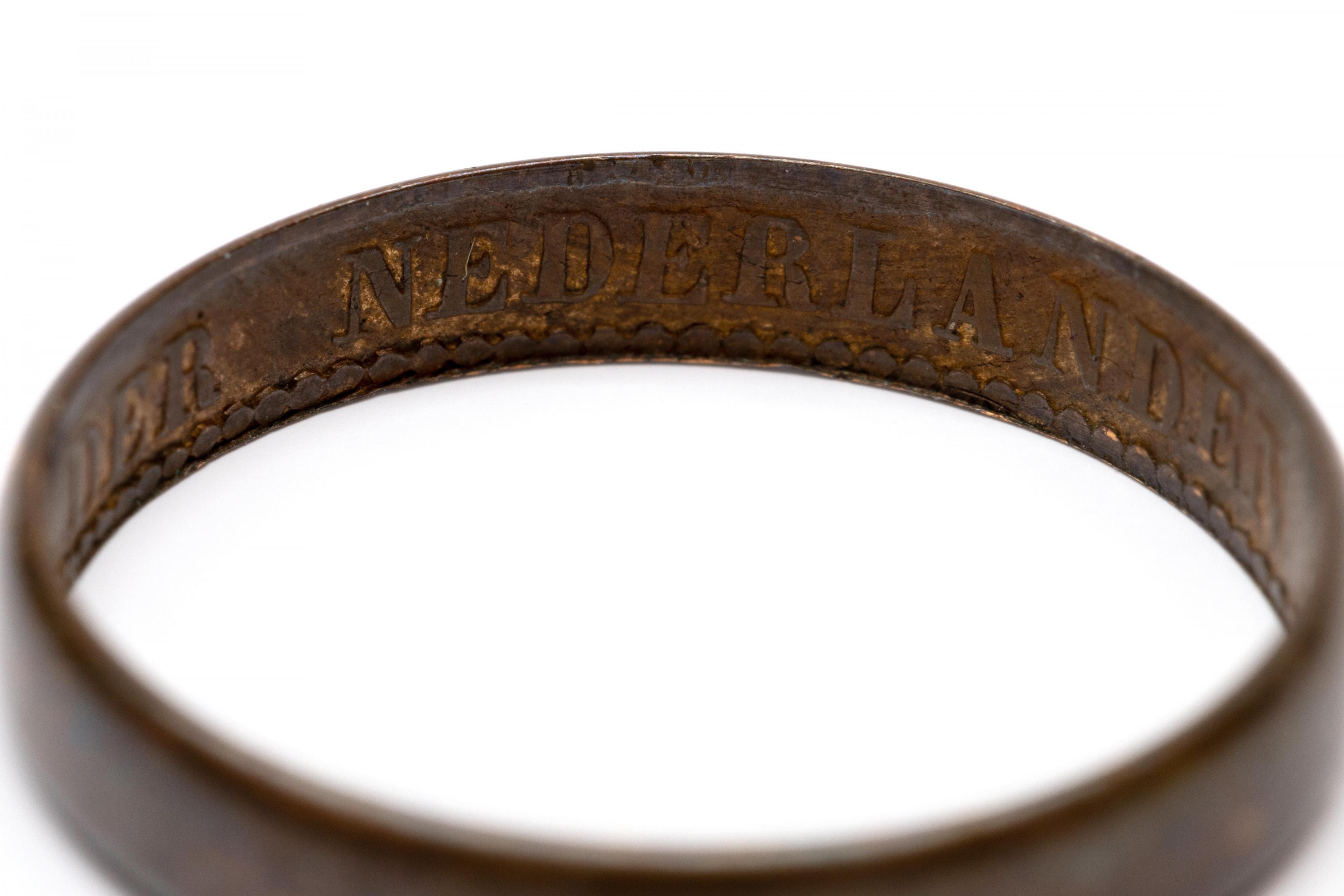 Bezet met een ovale cabochon geslepen bloedkoraal (ca. 12 x 9,3 mm), de rand gedecoreerd met spinnetjes. Hierbij een koperen ring, gemaakt van een halve stuiver uit 1877