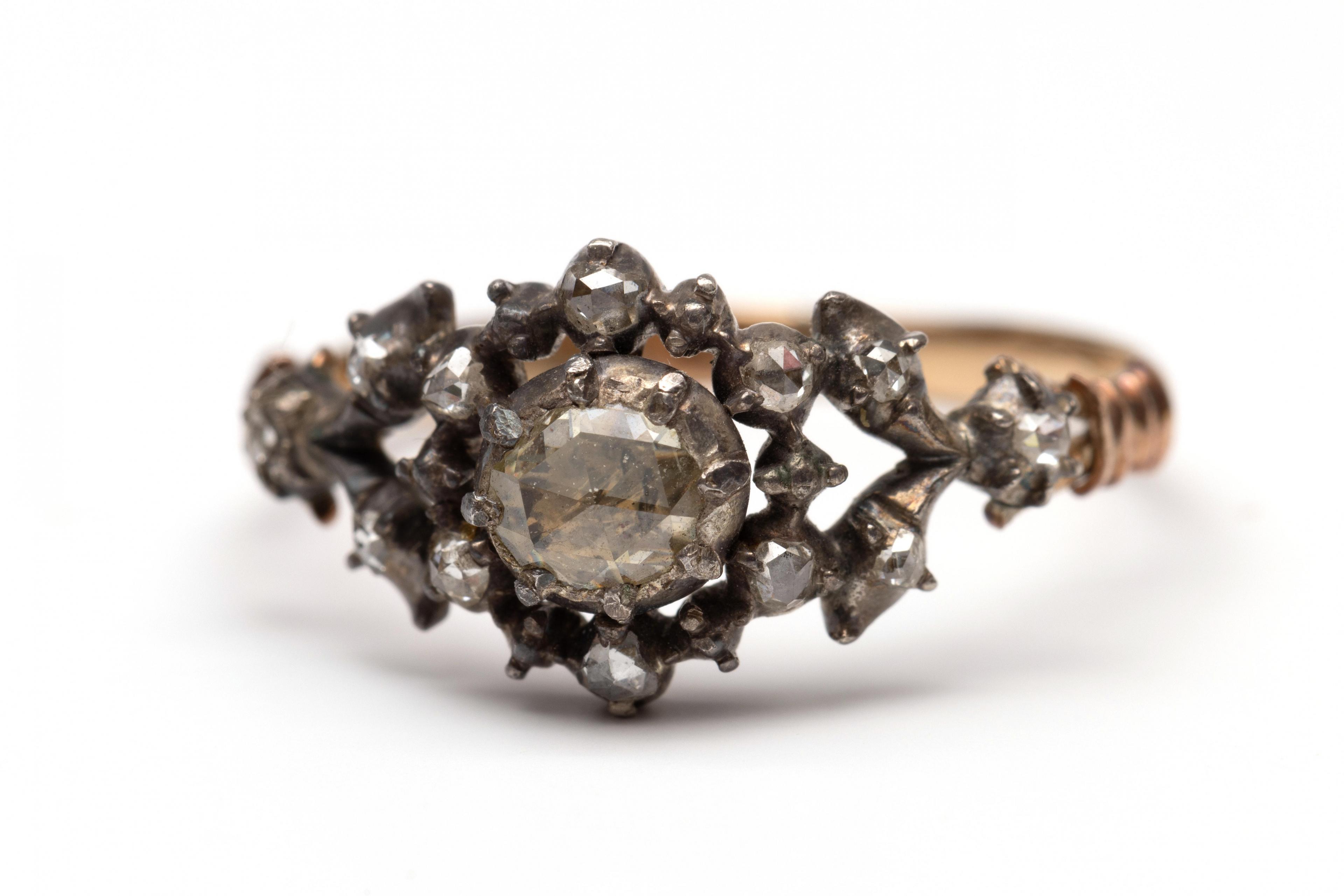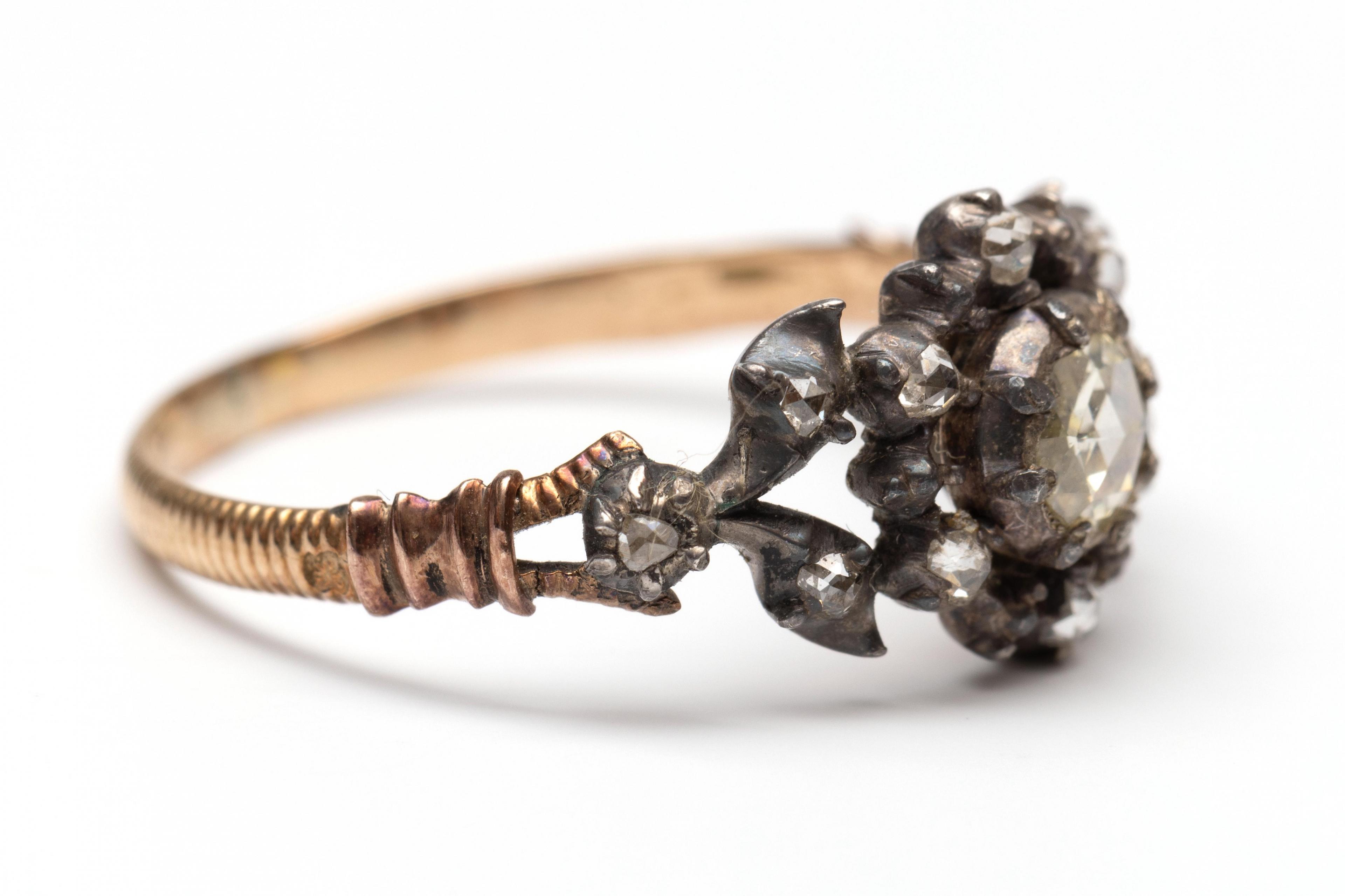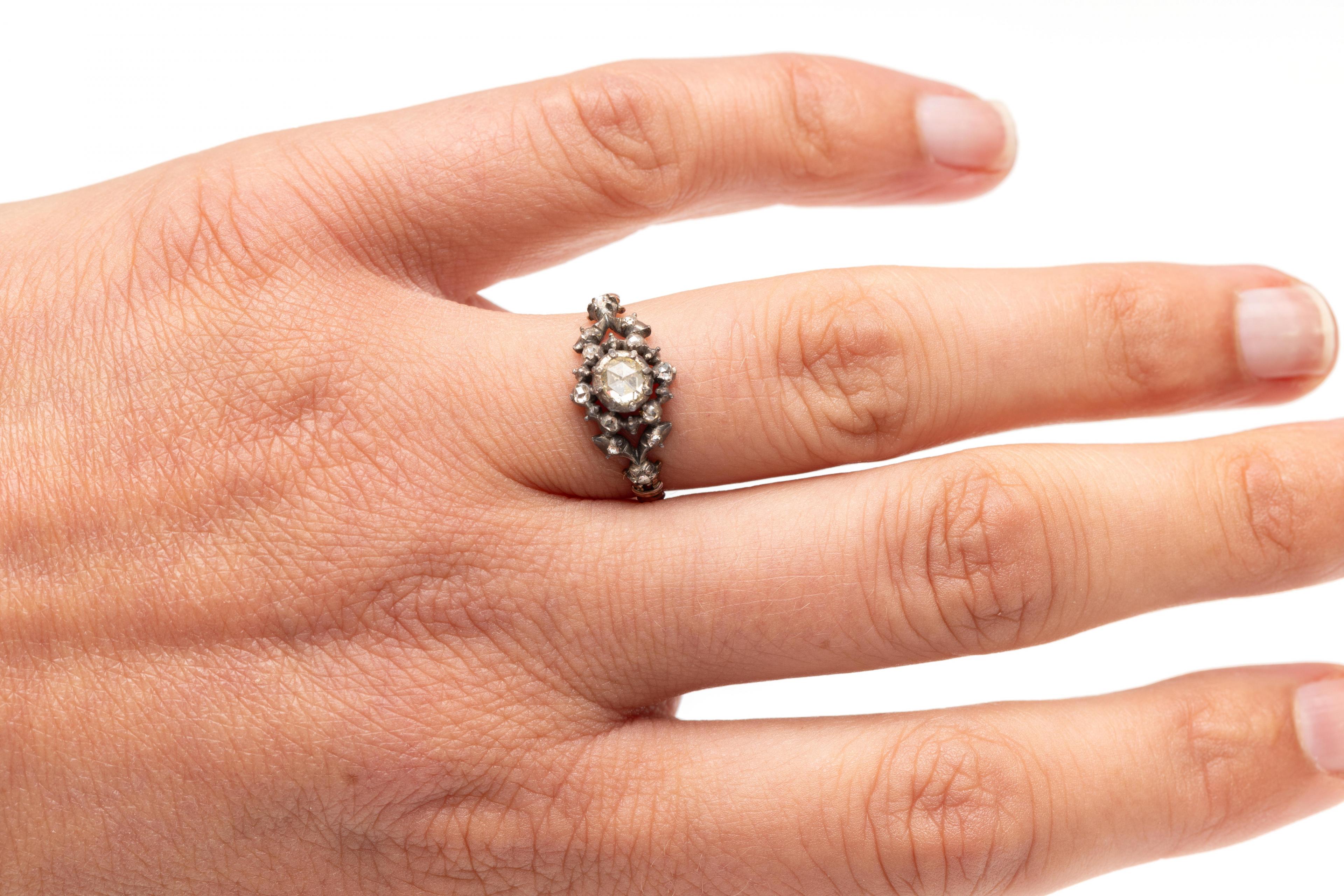 18 k. Gold and silver ring, 19th century. The top with a rosette and fine leaf motifs, set with rose-cut diamonds. Makers mark illegible