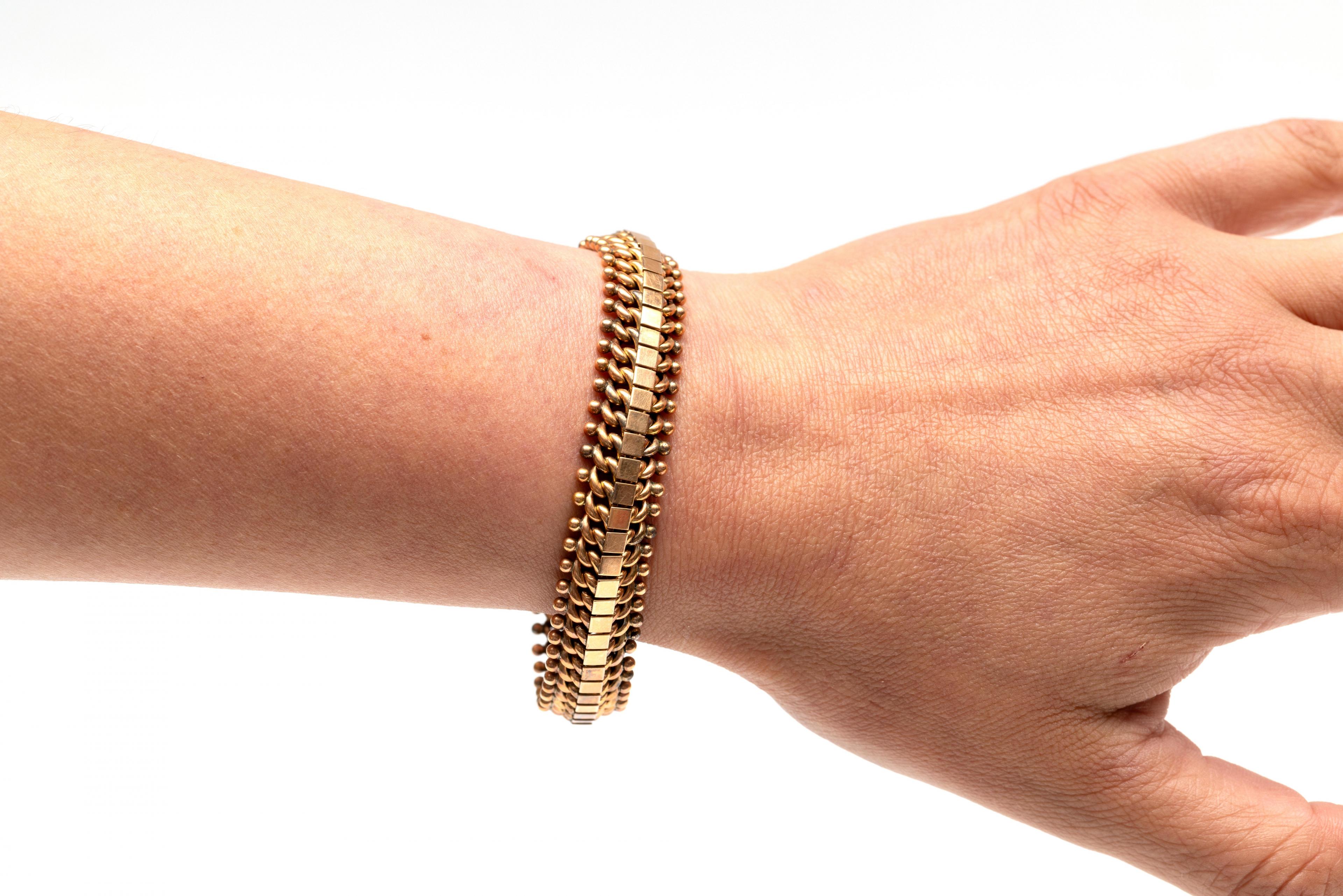 14 k. Red gold bracelet, first half 20th century. Constructed from a double row of curb links on which a row of square blocks. The sides decorated with spheres.