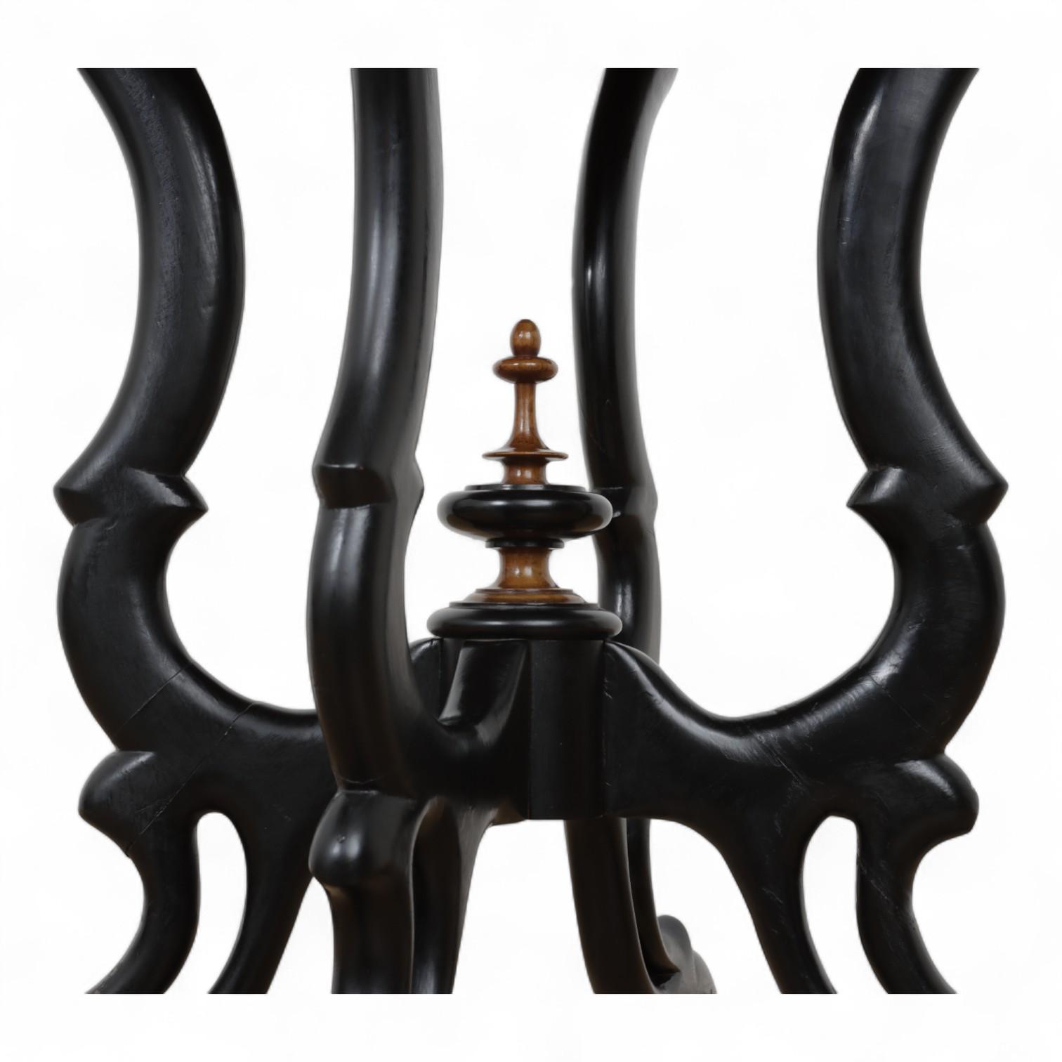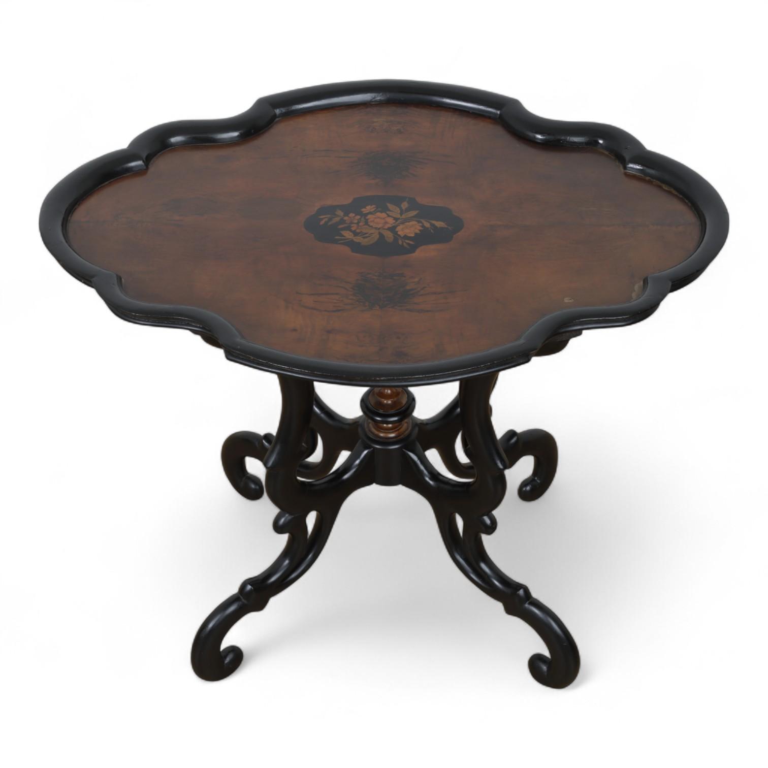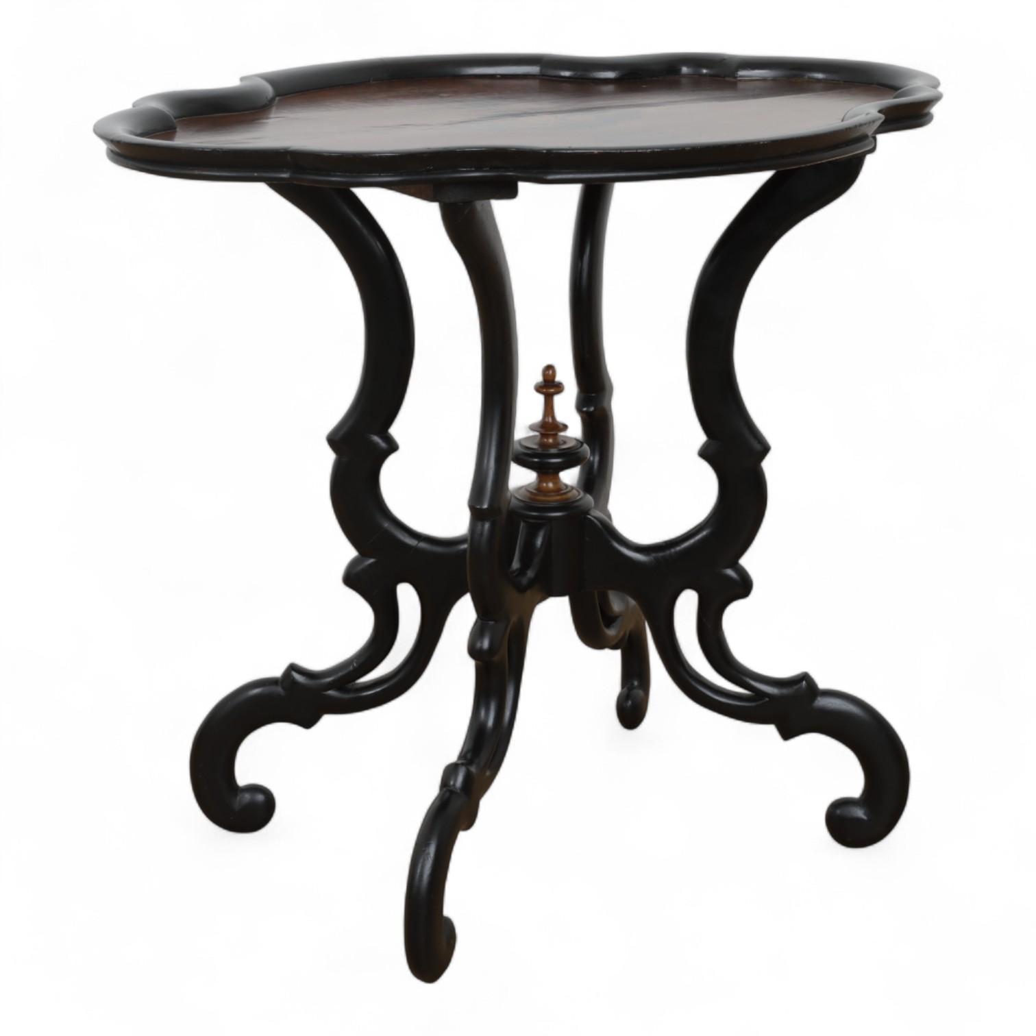 Het gecontourneerde notenhouten blad met inlegwerk. Op vier voluutvormige poten, waartussen gedraaide knop (één knop ontbreekt)