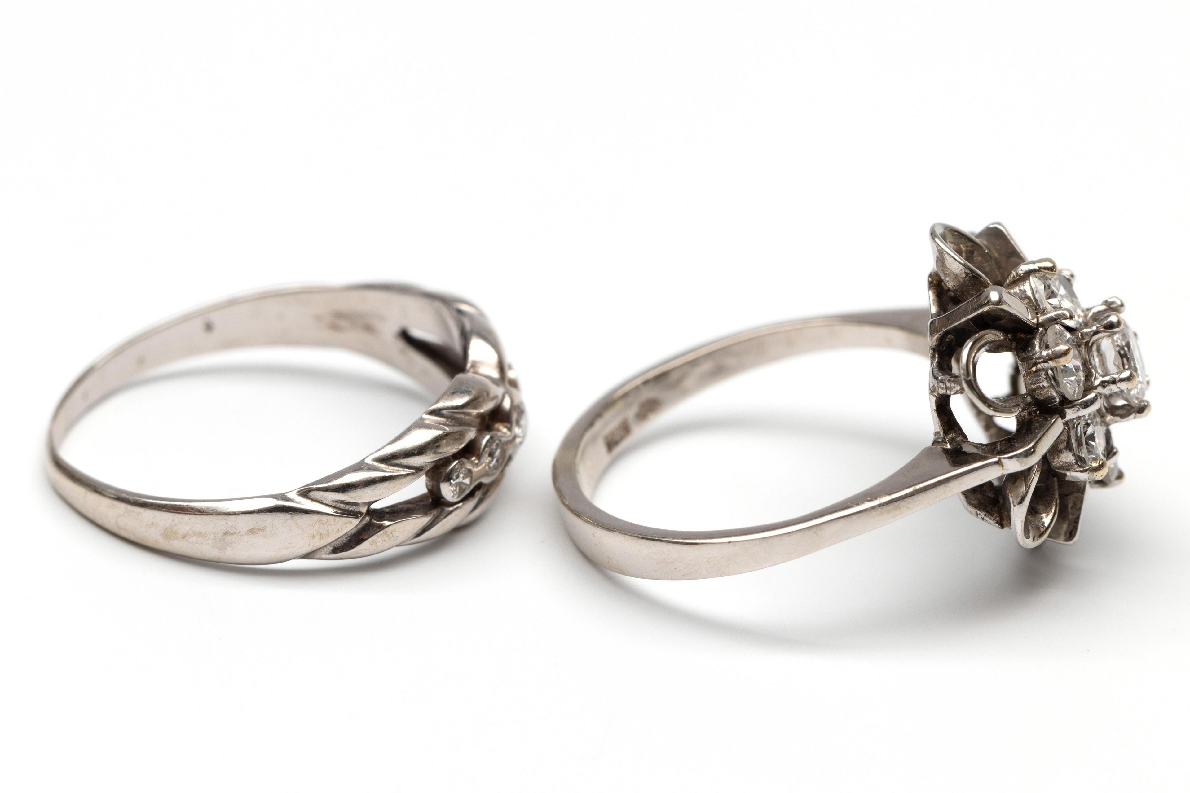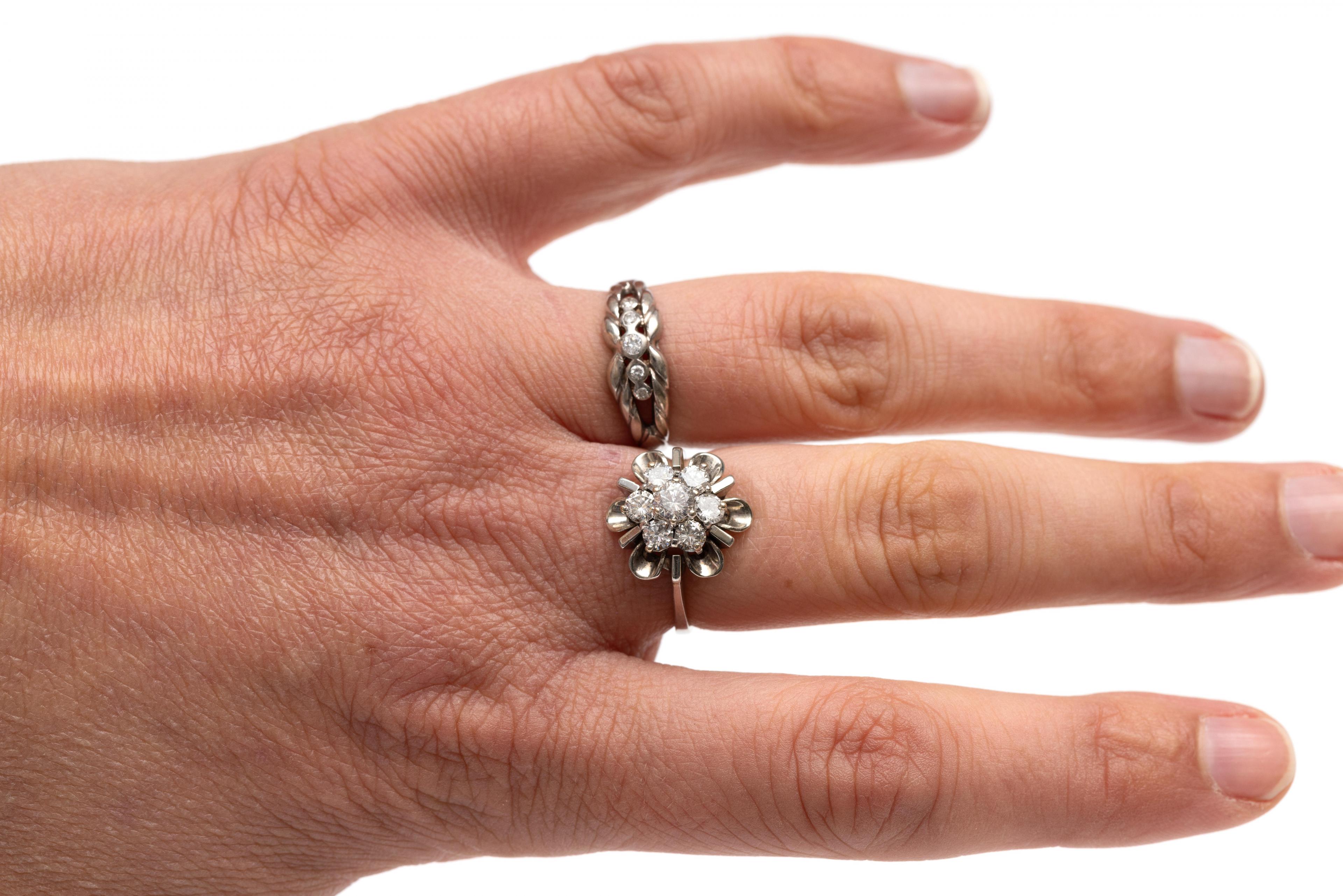 14 k. White gold ring. The top shaped like a rosette and set with a brilliant-cut diamonds weighing approximately 0.80 ct. Herewith a delicate white gold ring with a braided pattern, set with five small brilliant-cut diamonds.
