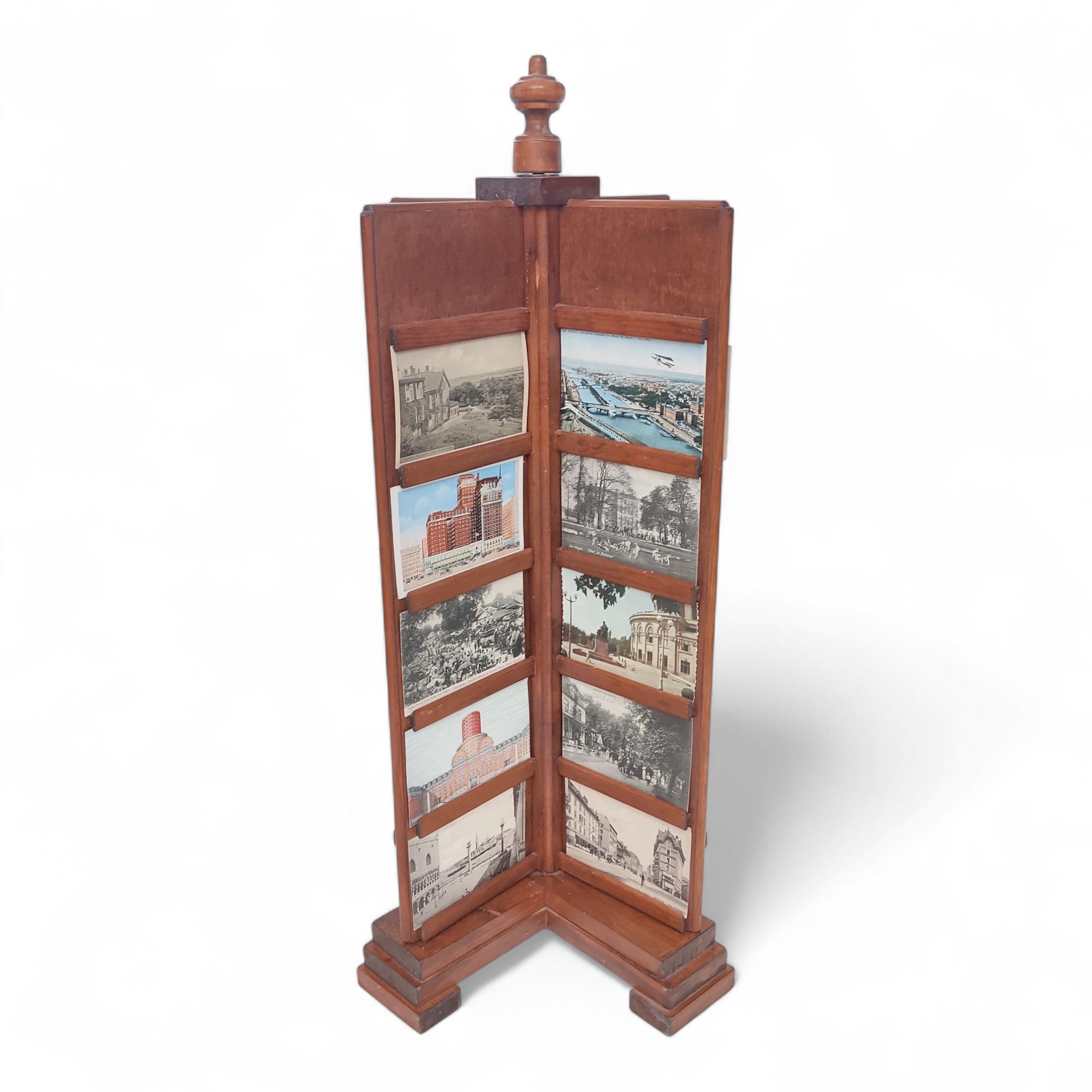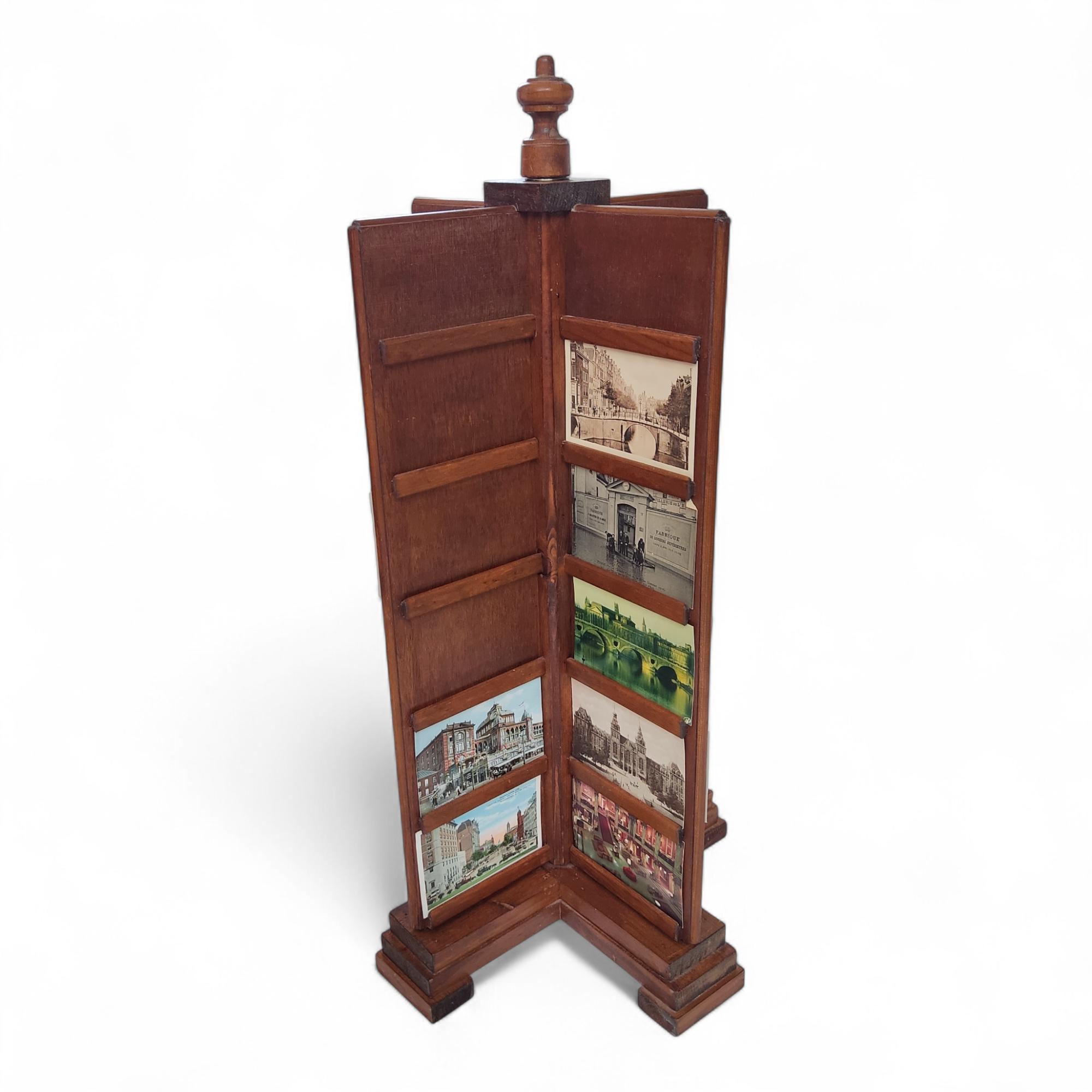 Uitgevoerd met plaats voor achtenveertig ansichtkaarten, geplaatst op spil met kantige, getrapte voet.