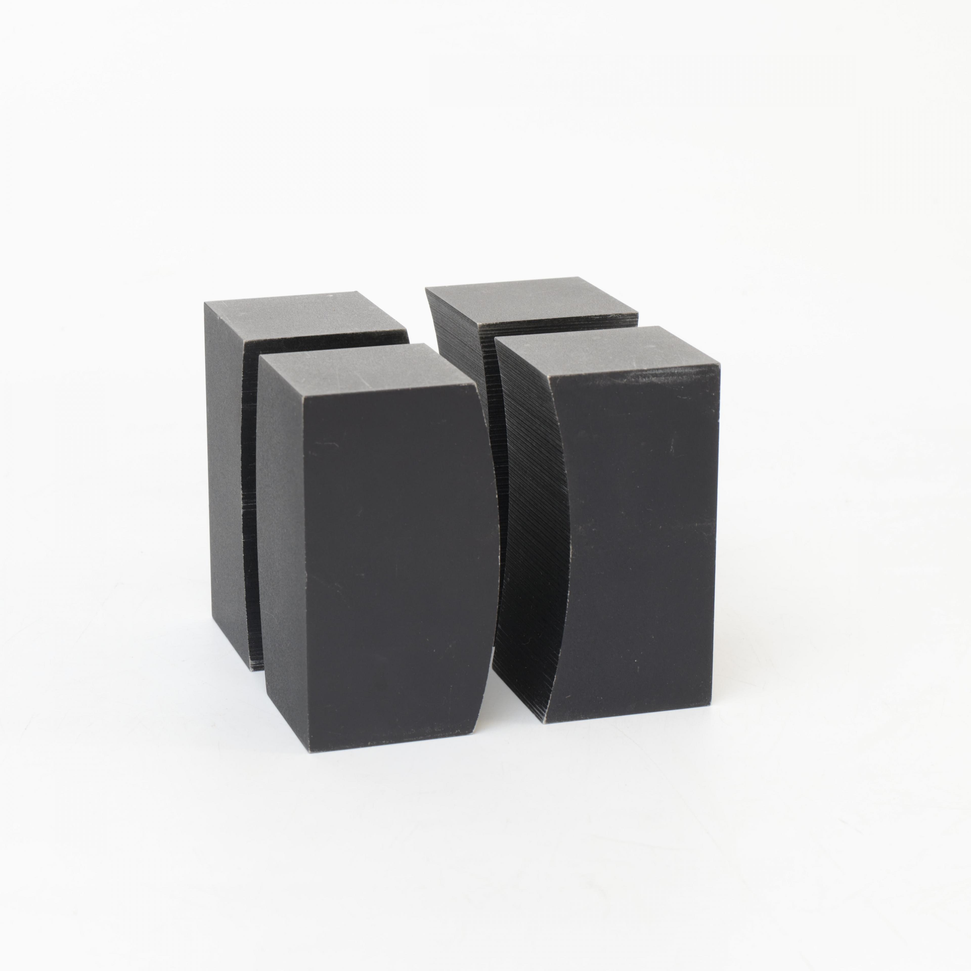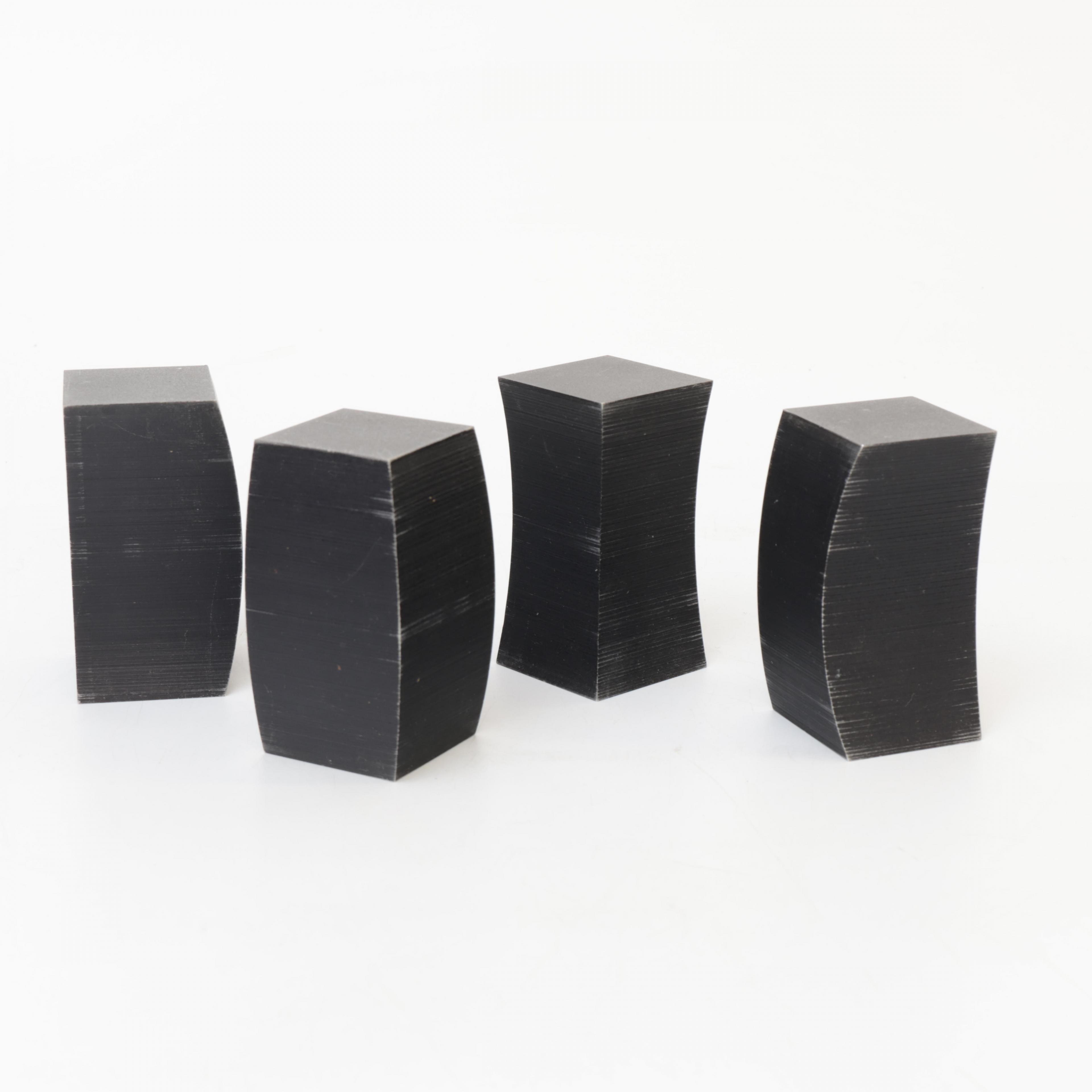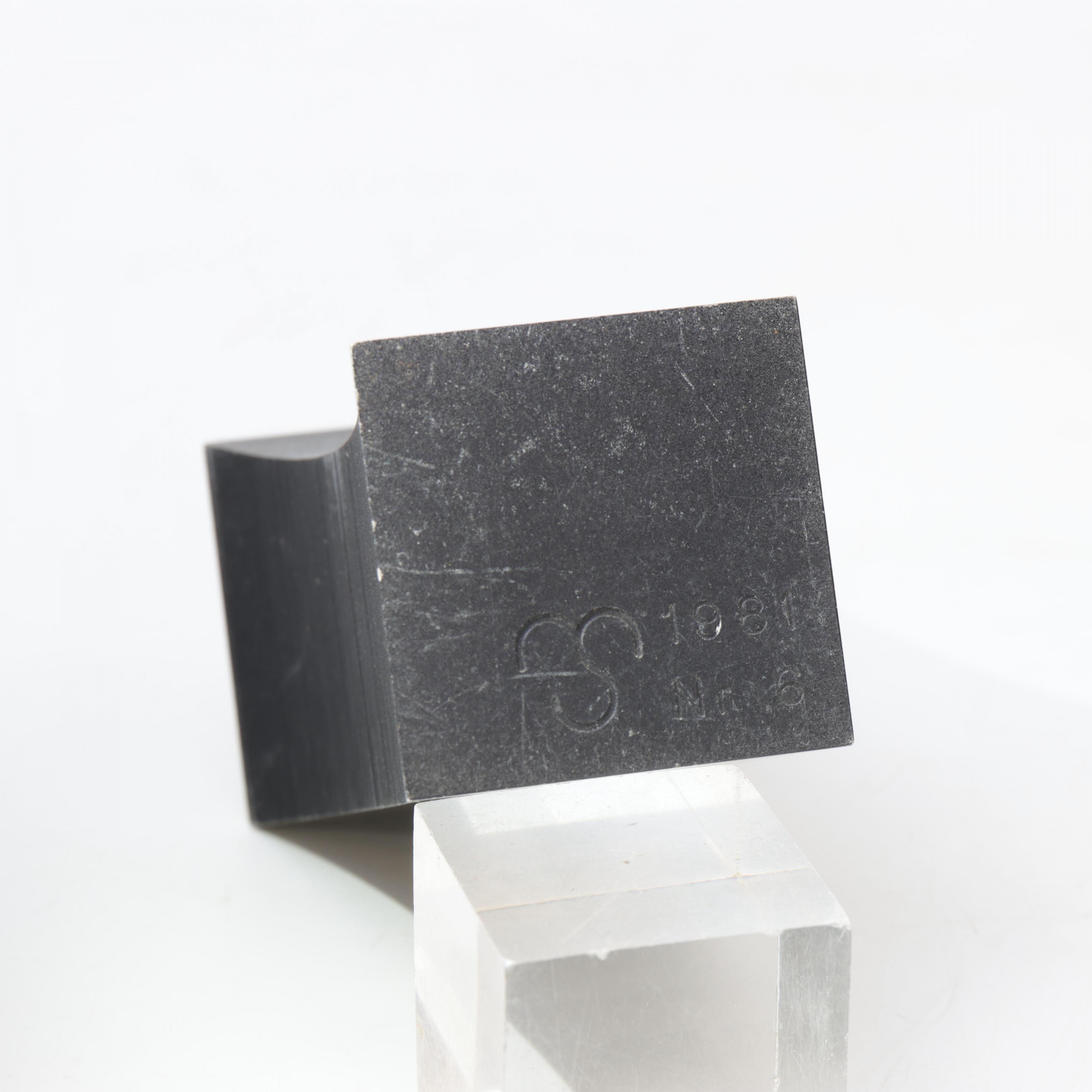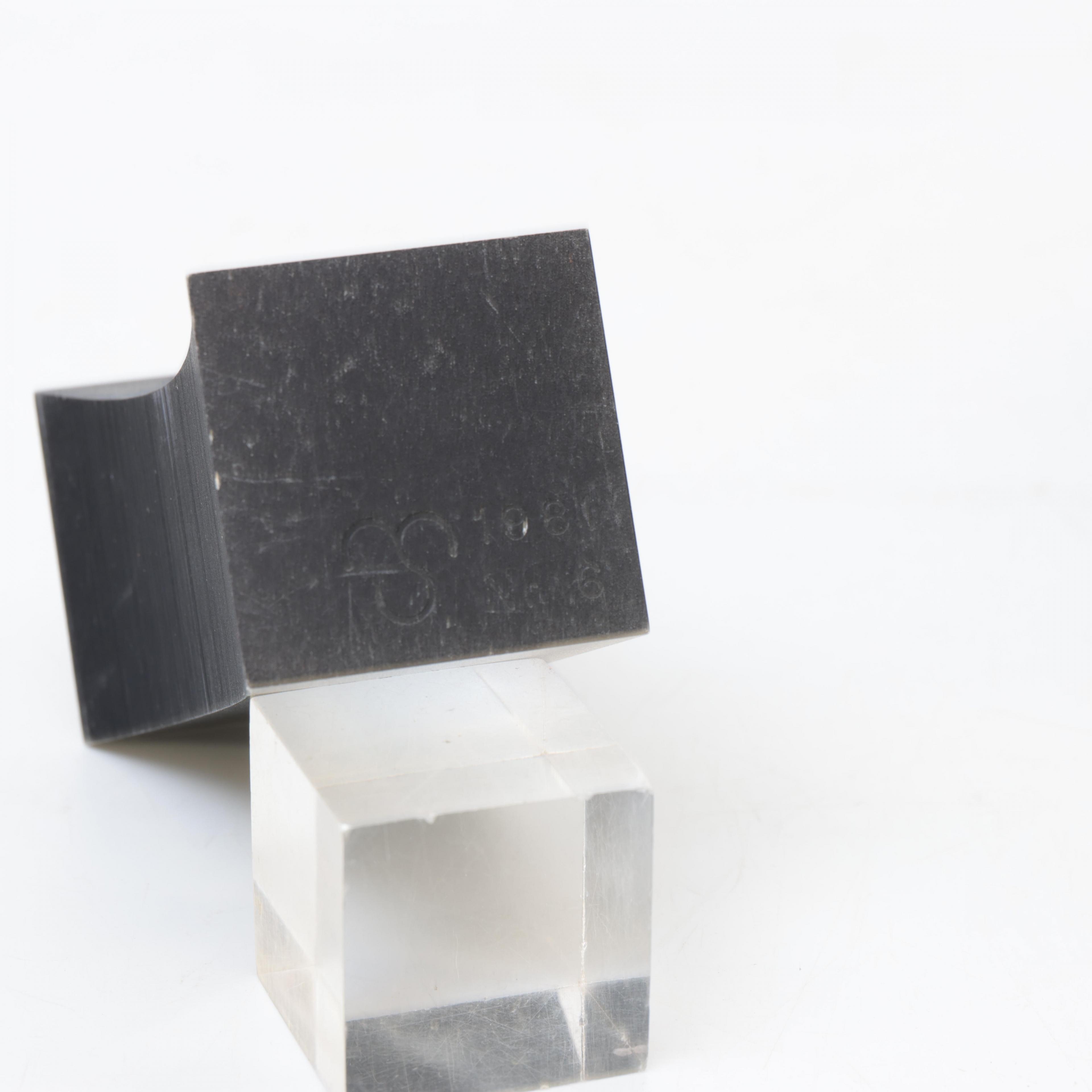 Bestaande uit vier elementen met inwendige uitsparingen welke een kubus vormen. Onder zijde met monogram en jaartal 1981 en Nr 6.