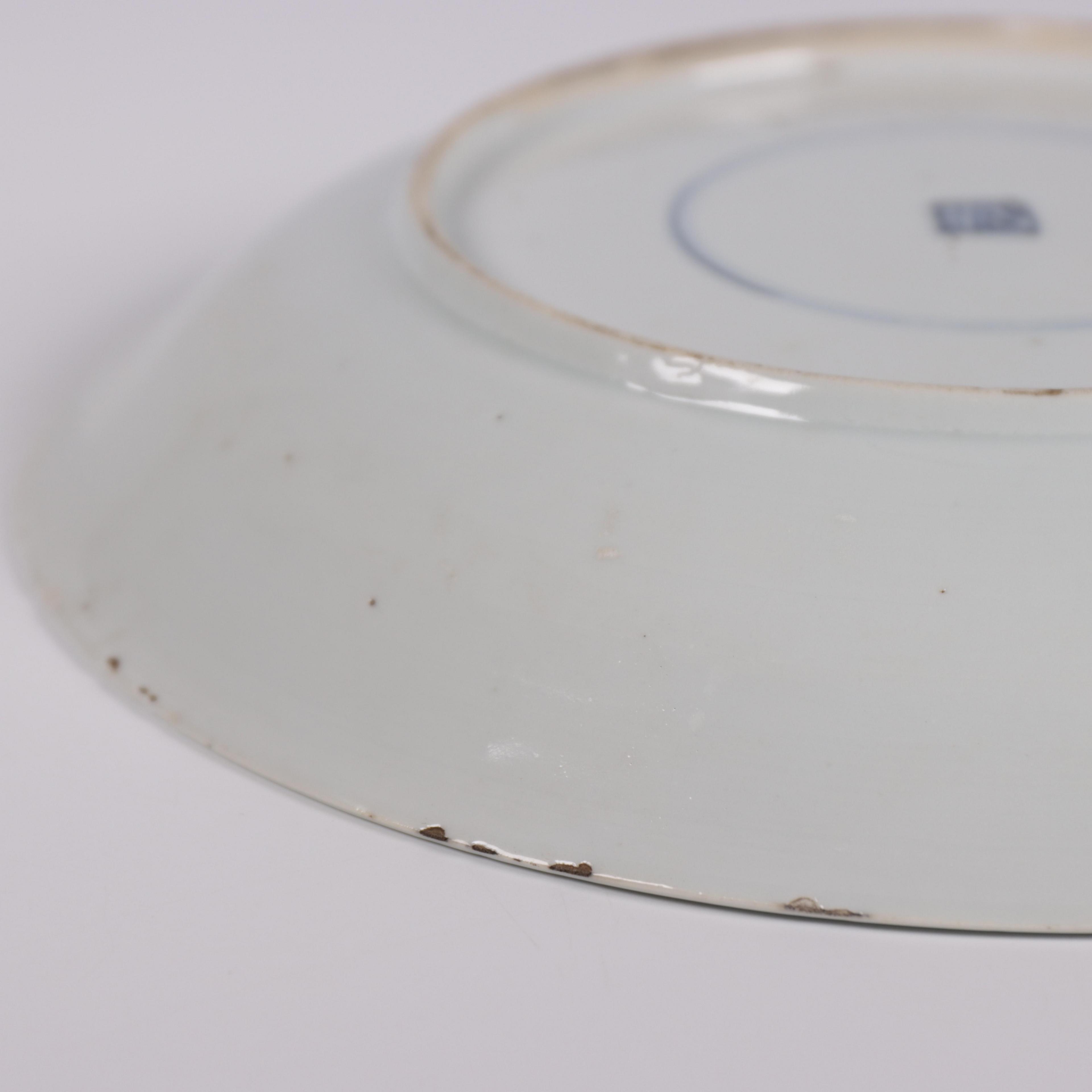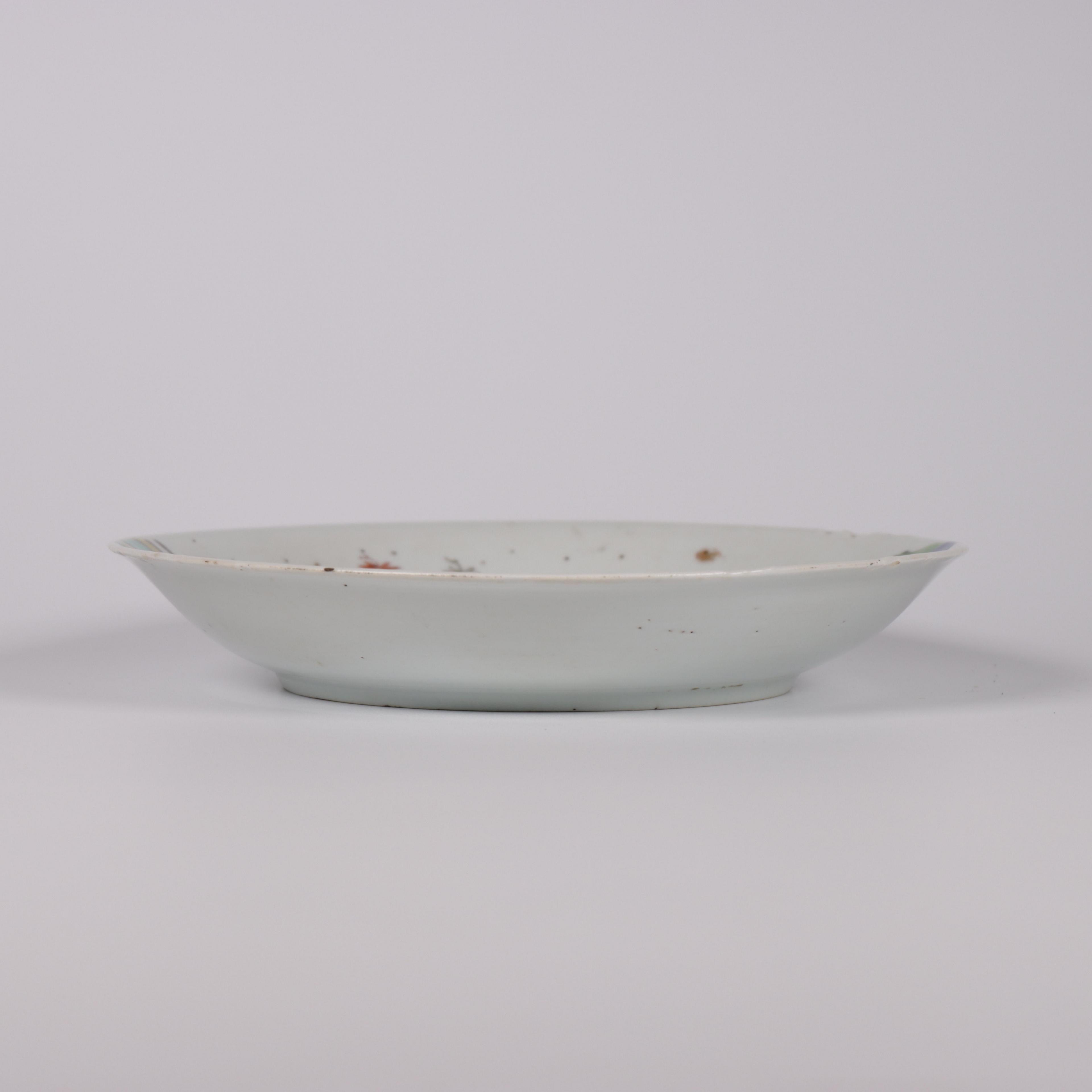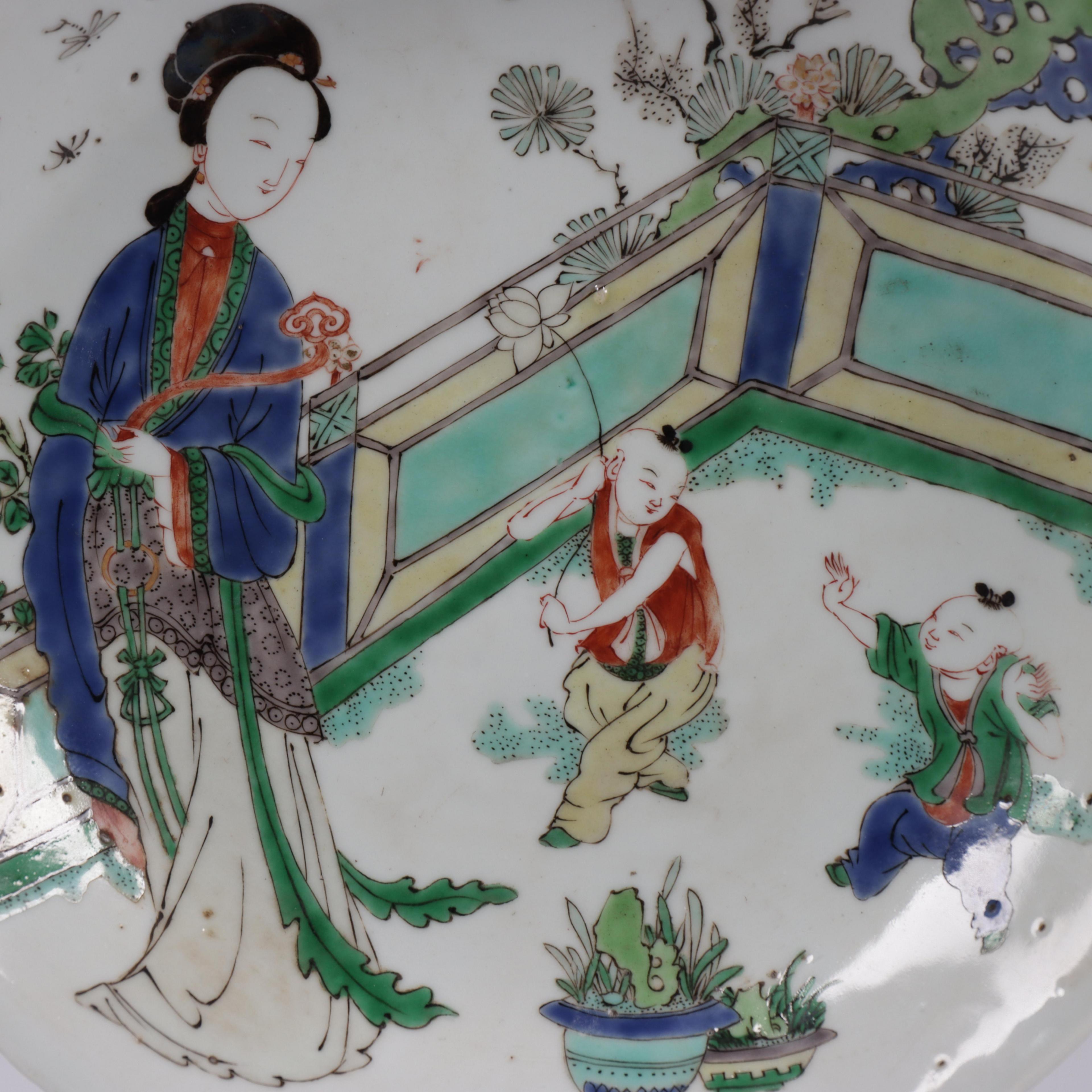 painted with a lady holding a ruyi-sceptre and two boys with lotus in a fenced garden (iron spots, glaze flaws, glaze scratch)