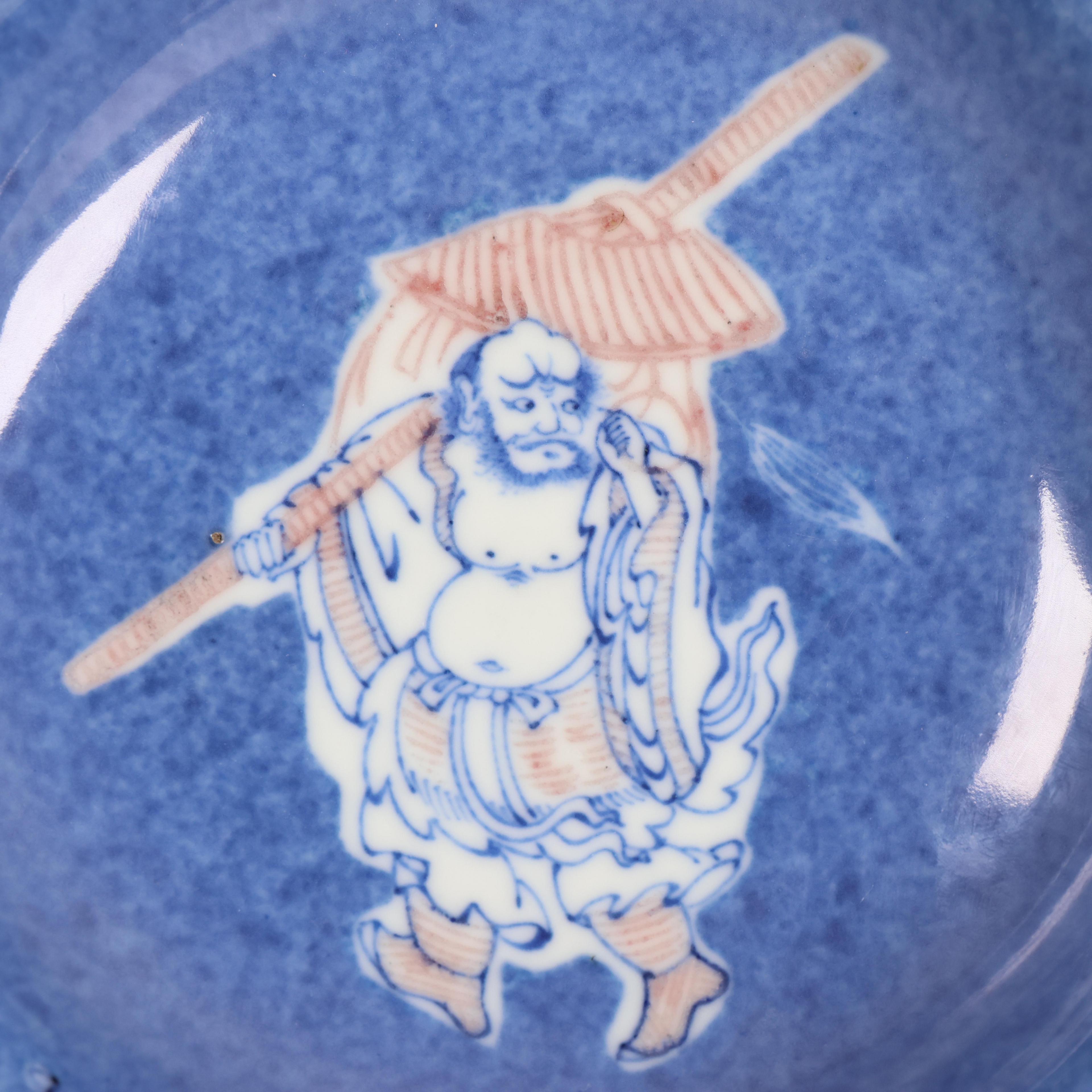 painted after the Kangxi example with a figure of a fighting monk, reserved on a mottled powder-blue ground, the reverse with apocryphal Ming mark