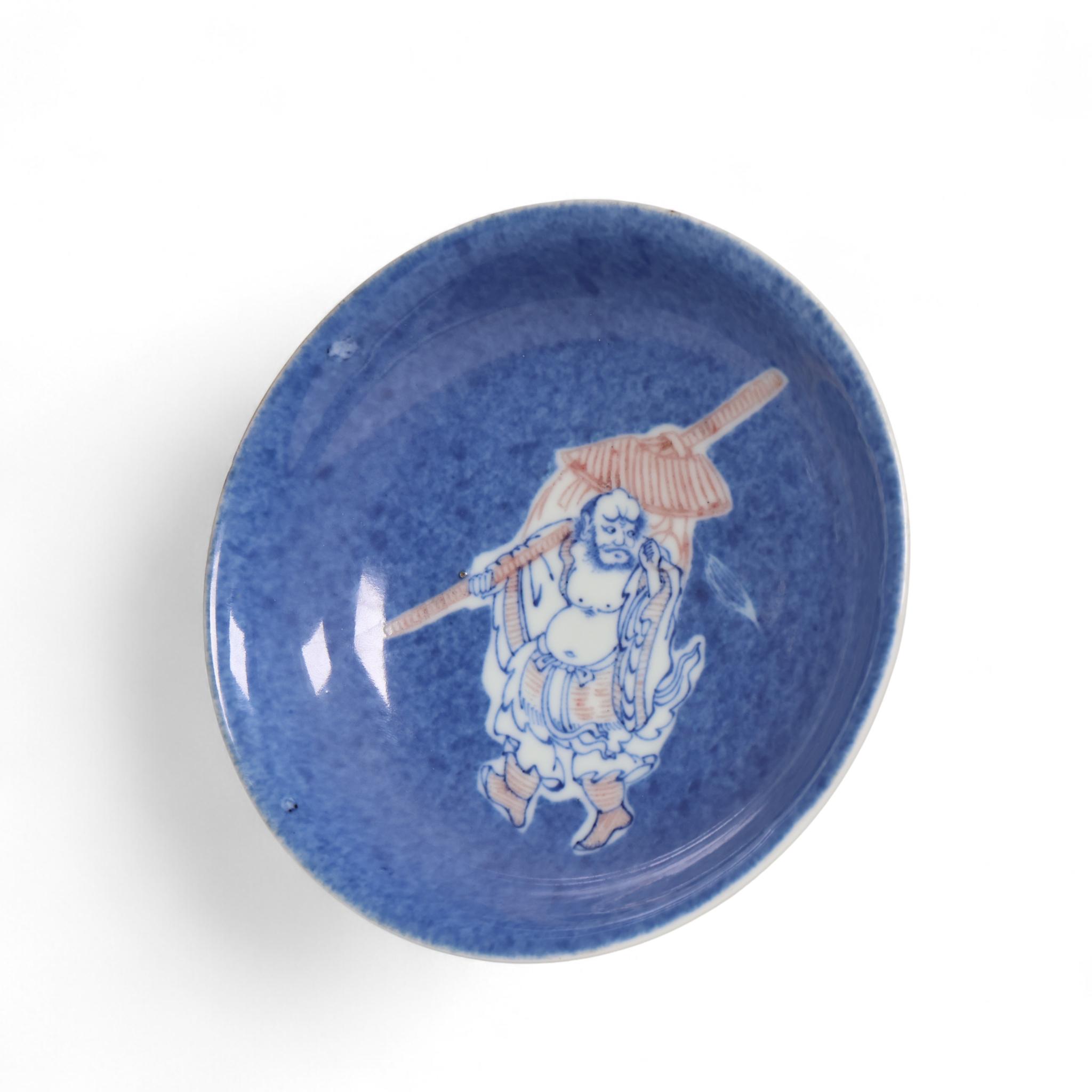 Compare a similar larger plate in the Rijksmuseum Amsterdam, inv. nr. AK-RBK 15847, where the figure is identified as a character from the tale 'Shuihu zhuan' which tells about various dubious figures, including the fighting monks. The current figure may be identified as the monk Hua, who is a master of stickfighting.