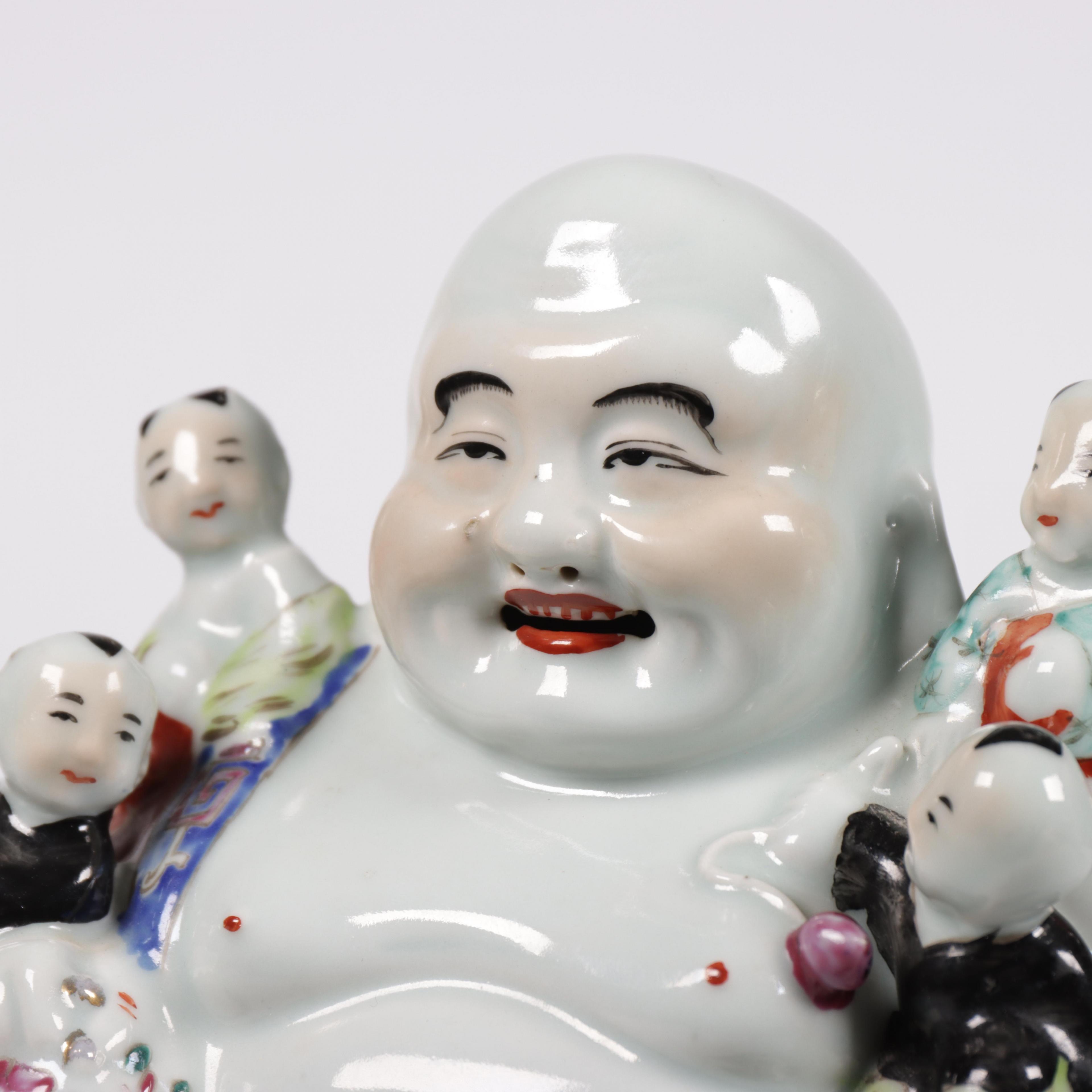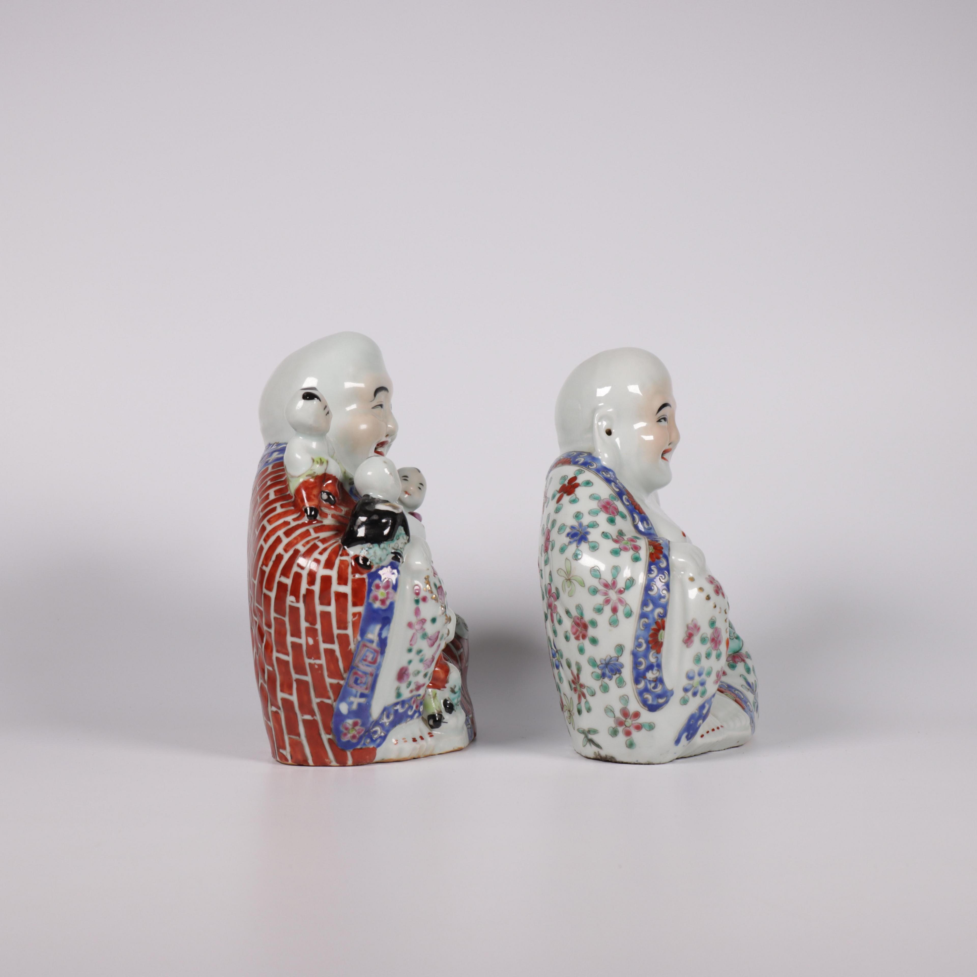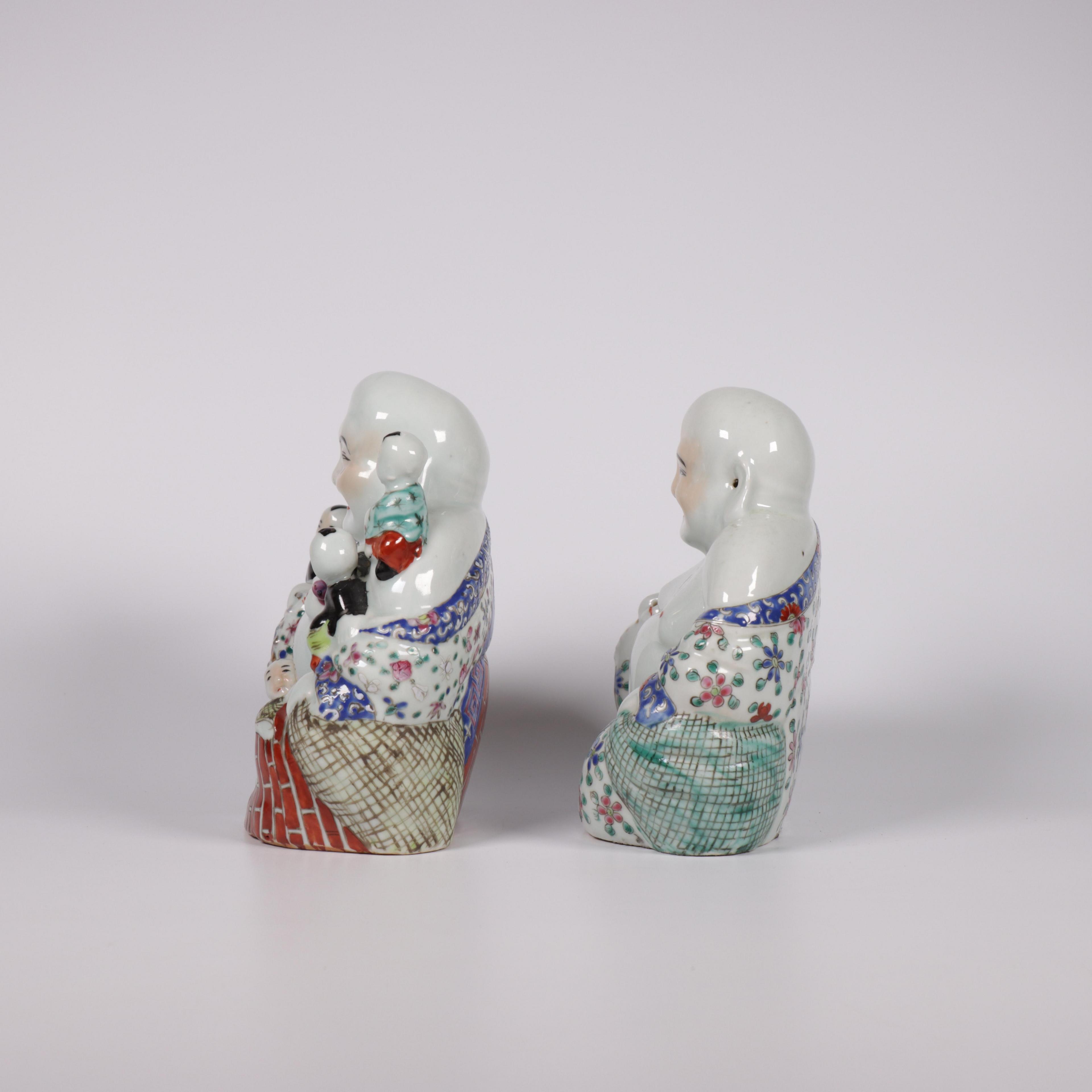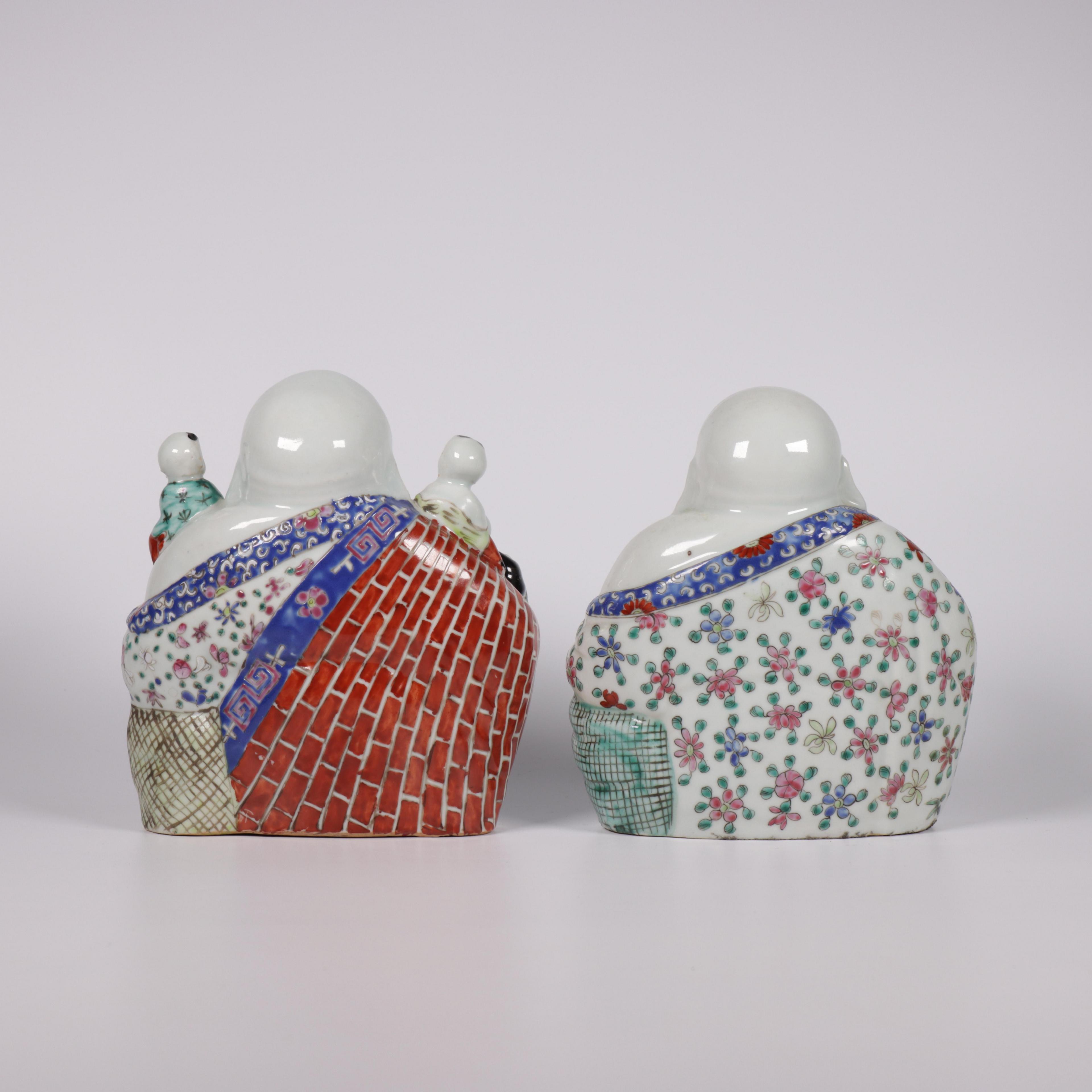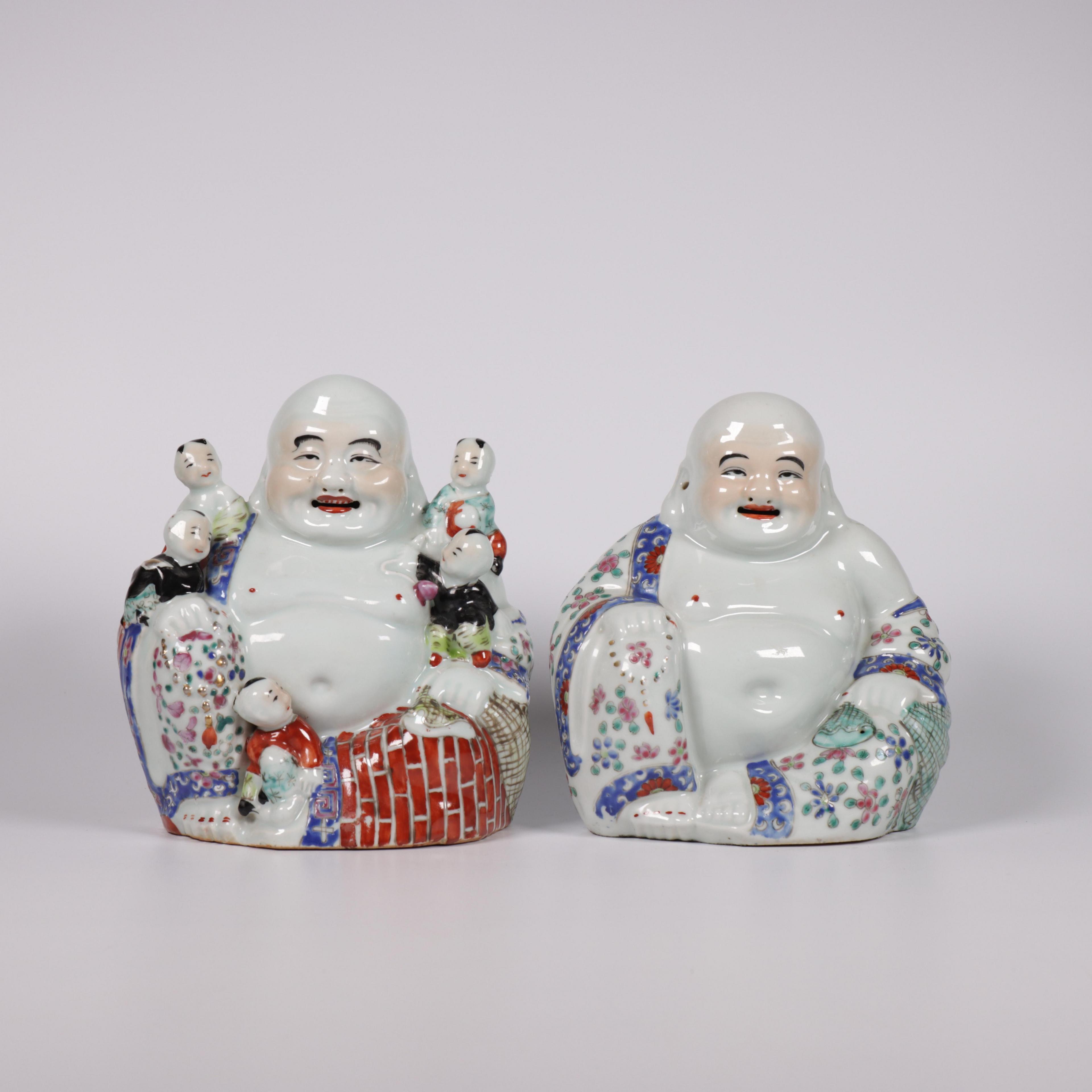 both seated with big exposed bellies, one with children clambering on his sides (one with glaze frit)