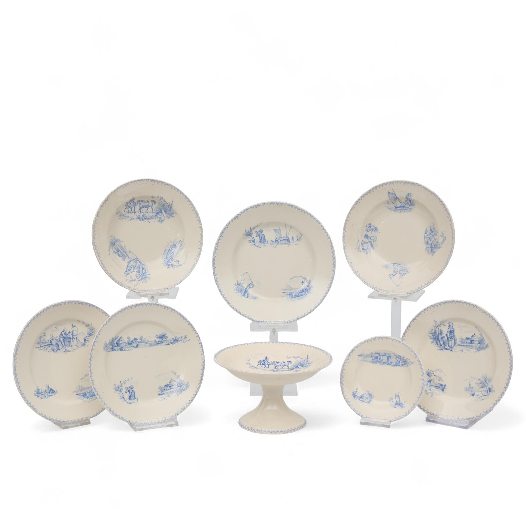 bedrukt in transferprint met boerderij- en visserscènes, bestaande uit vier bordjes, twee diepe bordjes, een schoteltje en een tazza, gemerkt