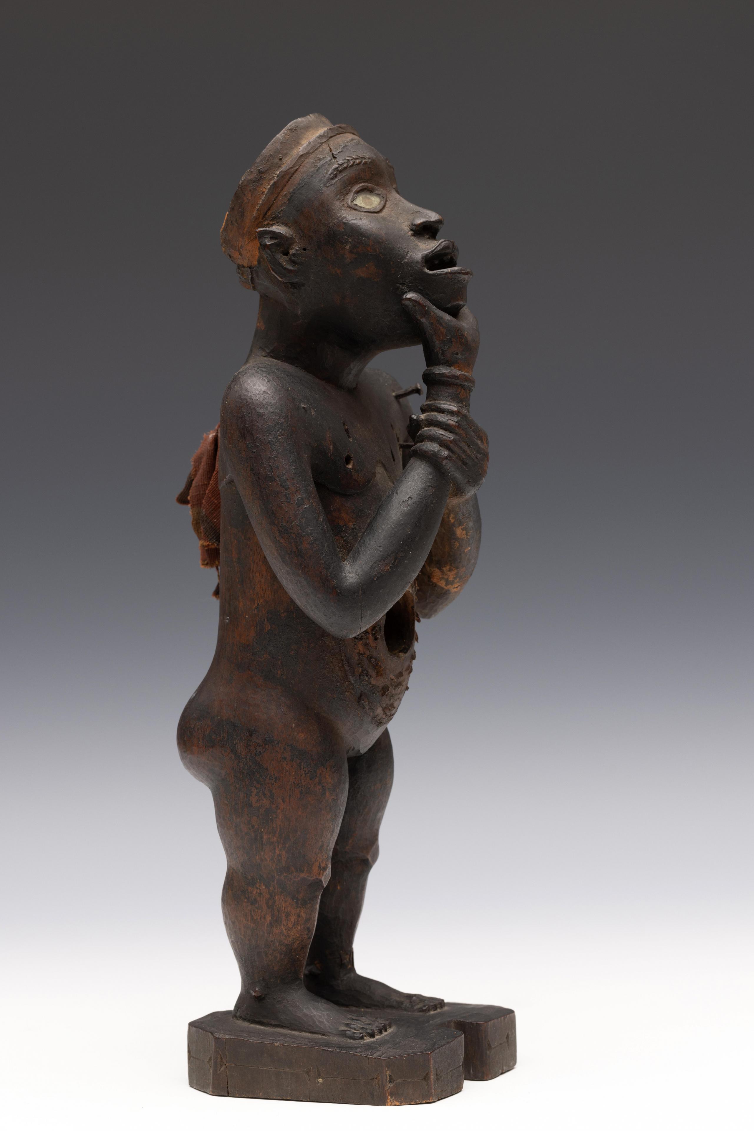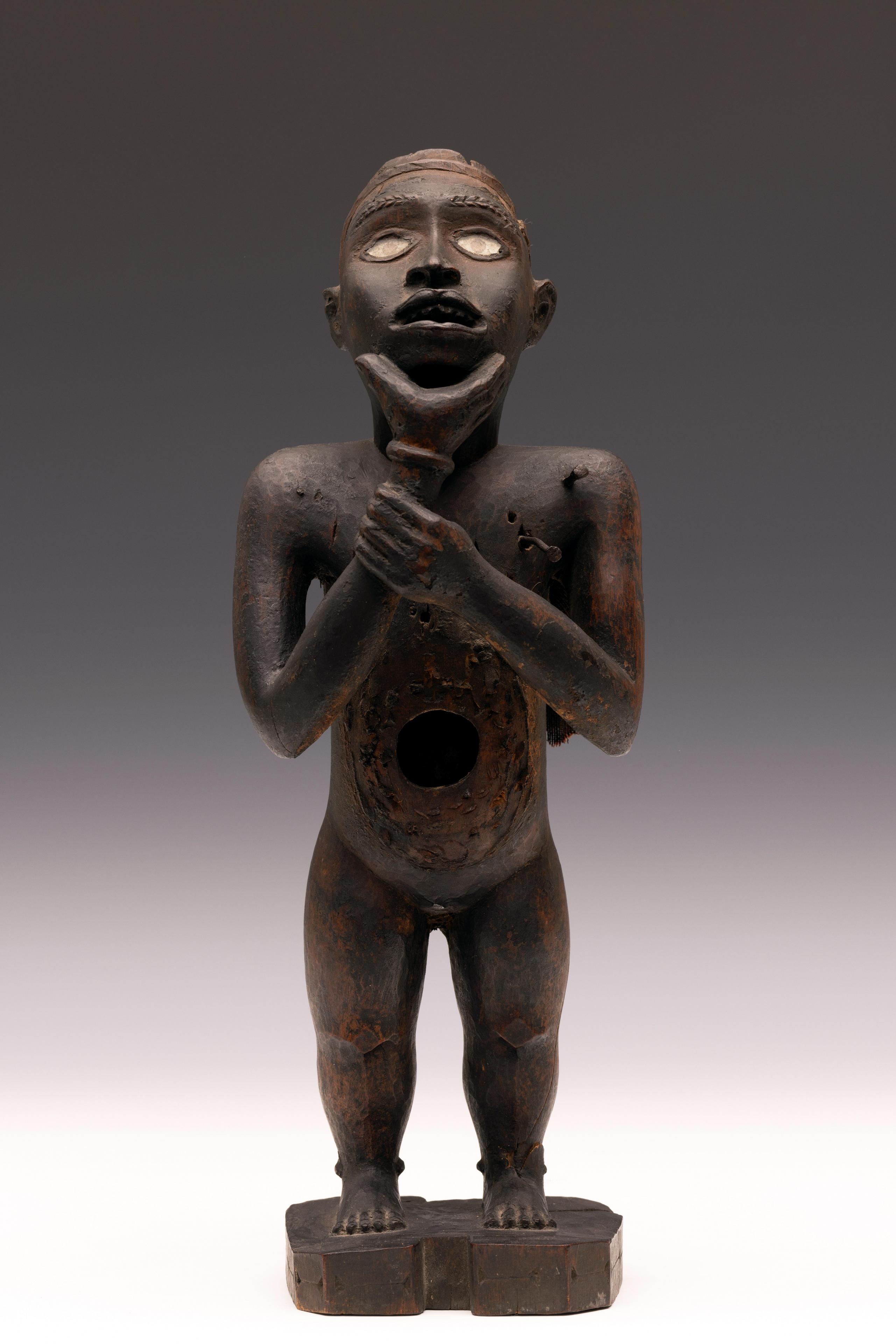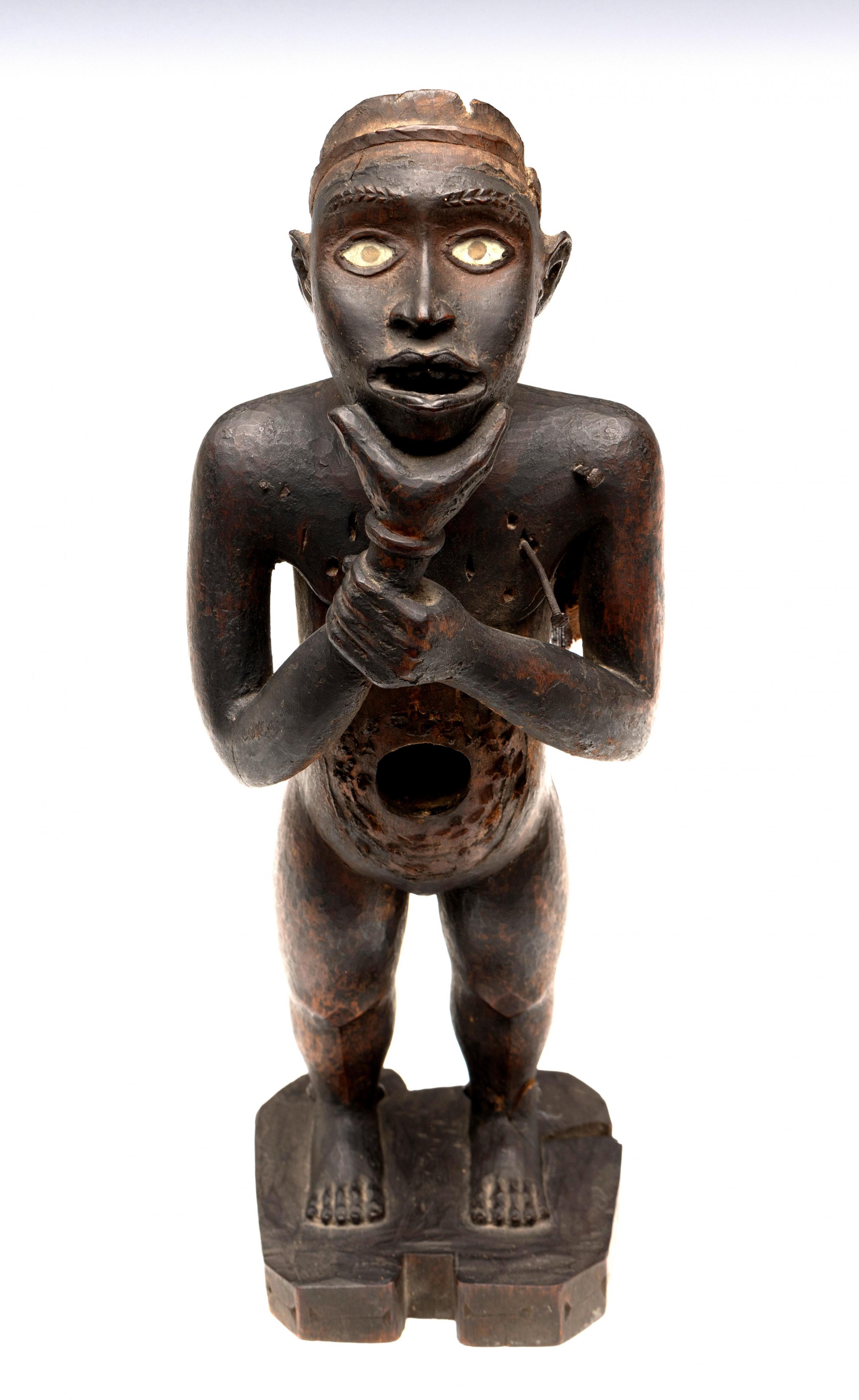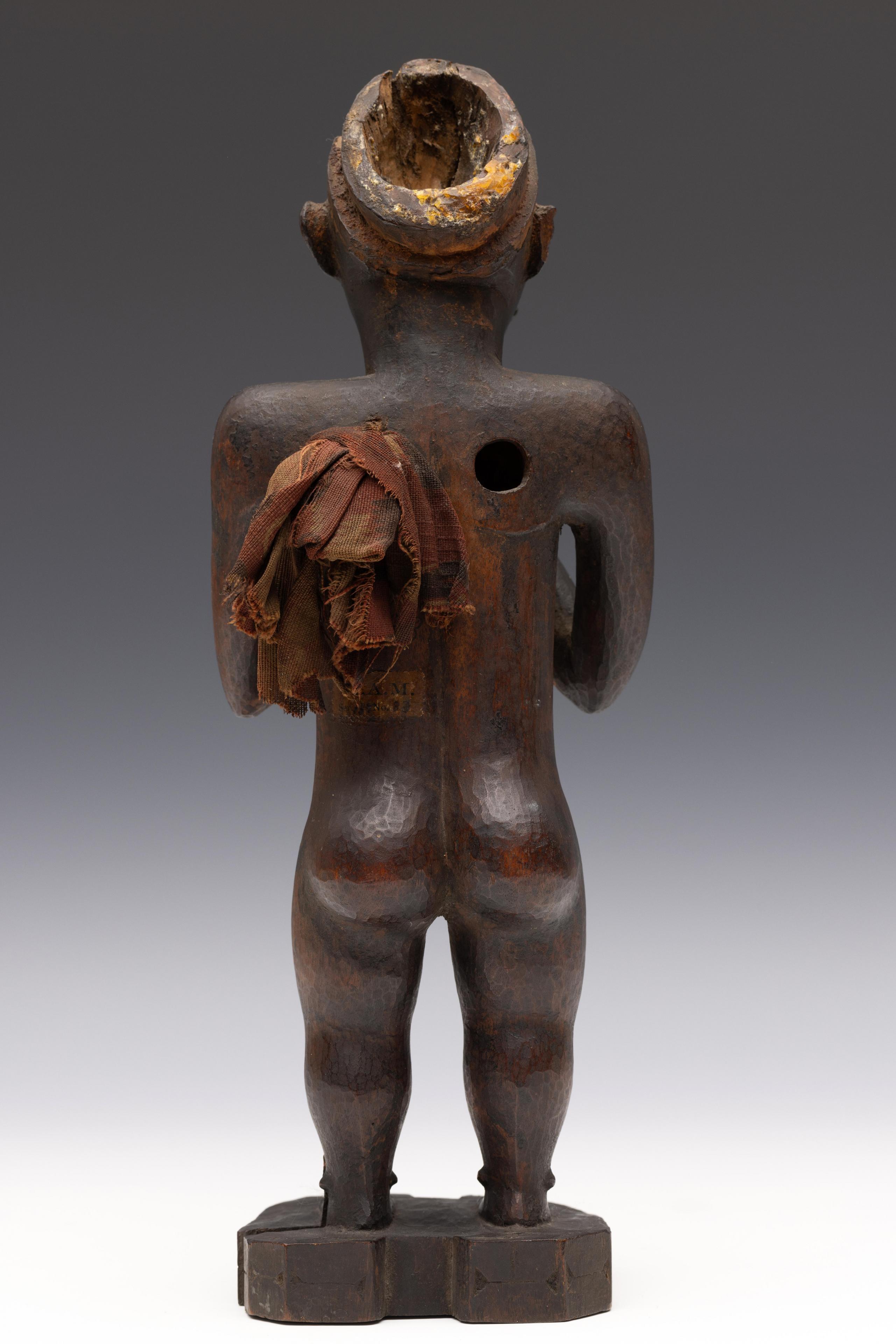 a standing muscular figure holding his right hand to the chin, his left firmly holds the lower right arm; the expressive face with detailed features; the belly shows a deep circular cavity surrounded by traces of an oval box which was affixed to the body; circular cavities can also be seen at the back and back of the head; a piece of trade cloth is inserted in one of the cavities.