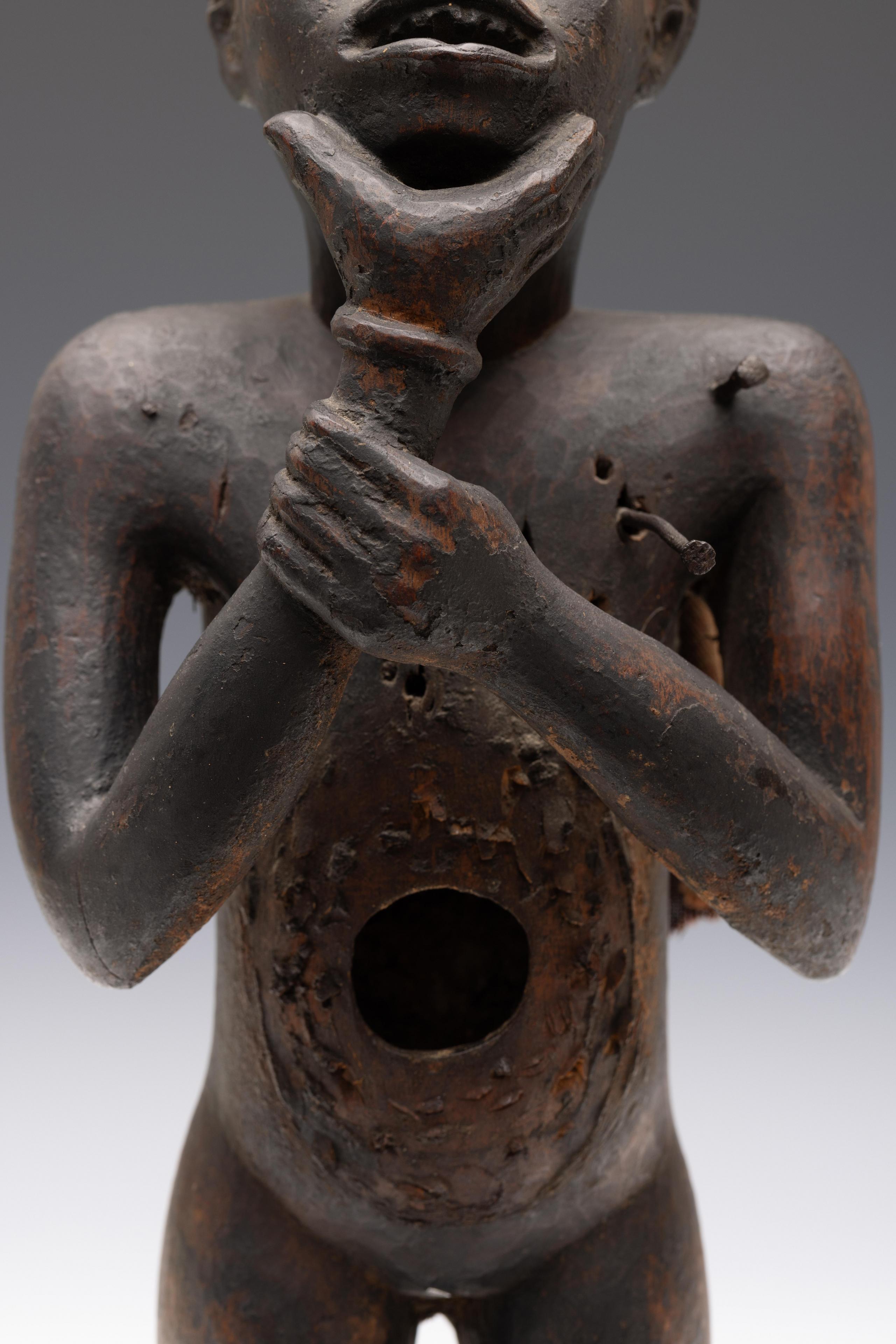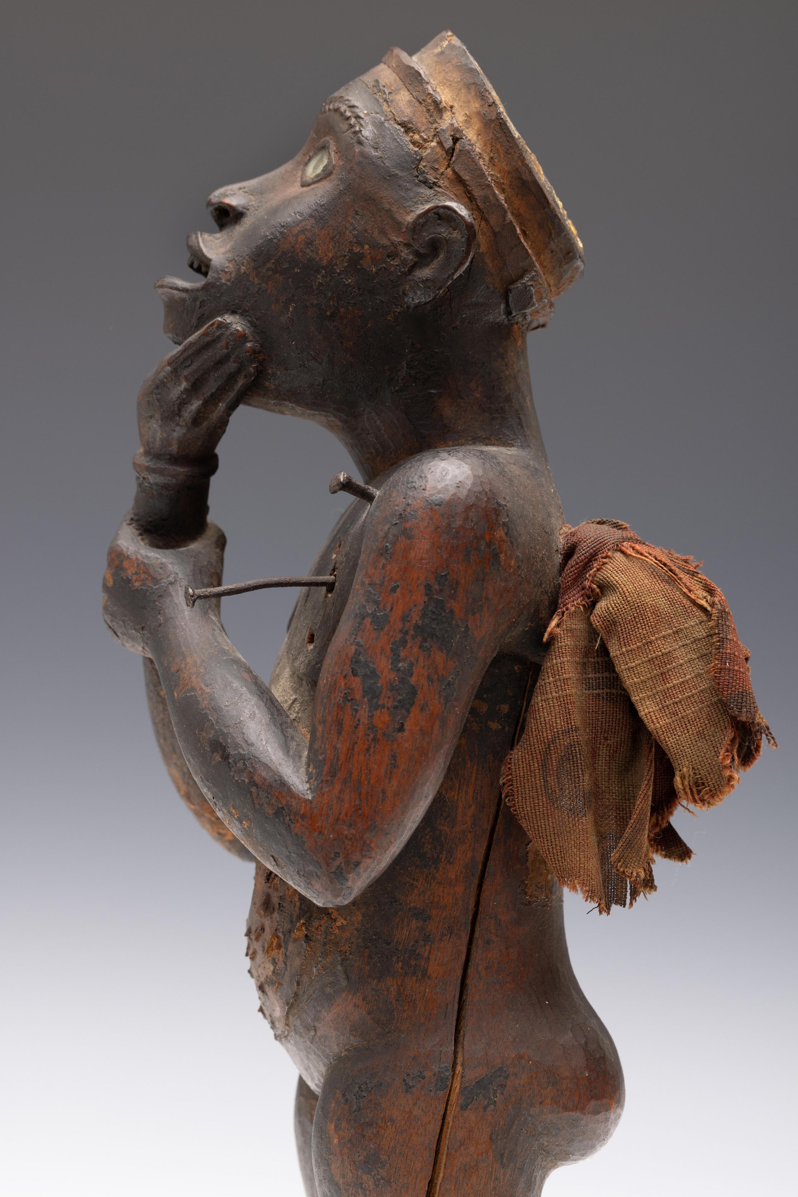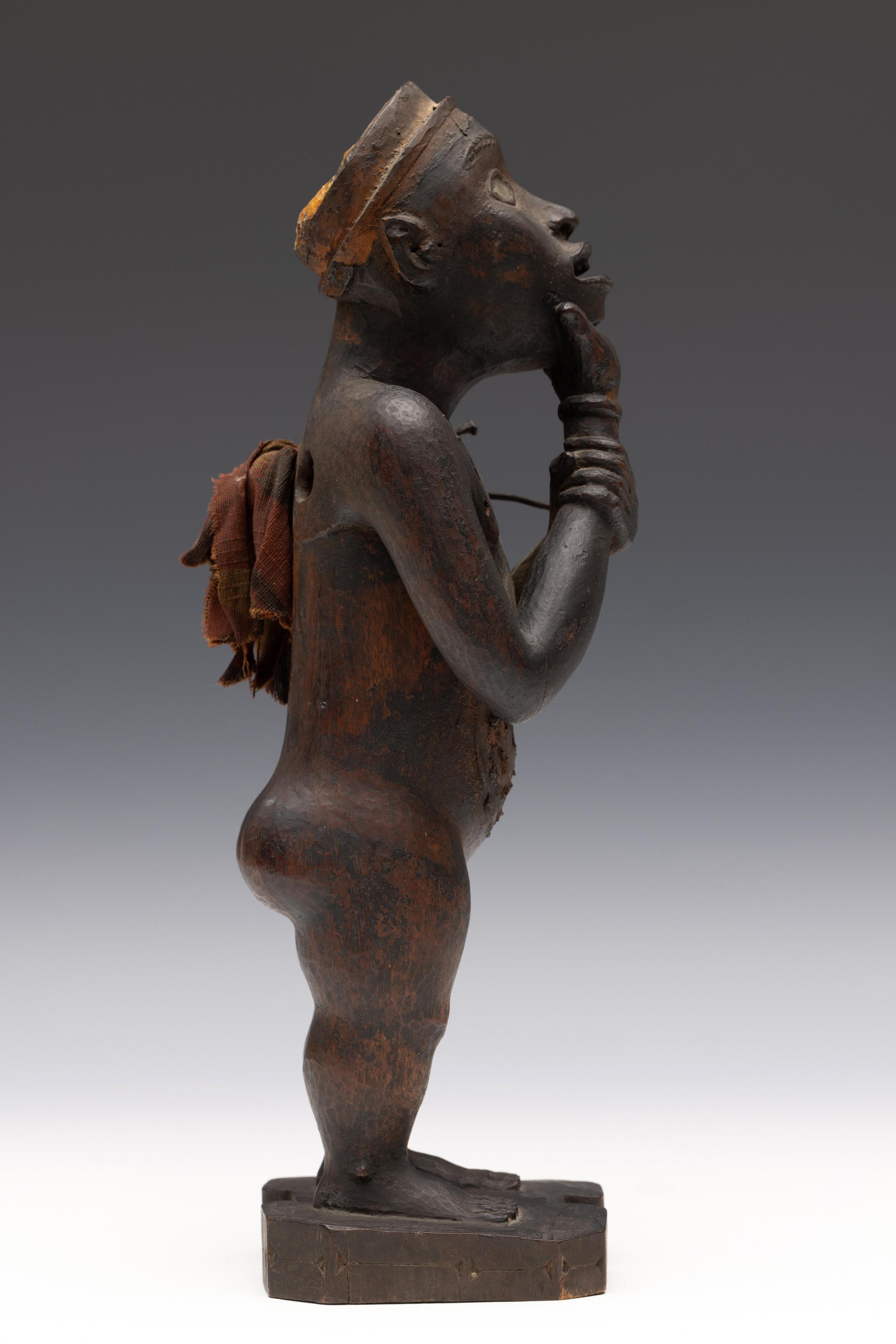 a standing muscular figure holding his right hand to the chin, his left firmly holds the lower right arm; the expressive face with detailed features; the belly shows a deep circular cavity surrounded by traces of an oval box which was affixed to the body; circular cavities can also be seen at the back and back of the head; a piece of trade cloth is inserted in one of the cavities.