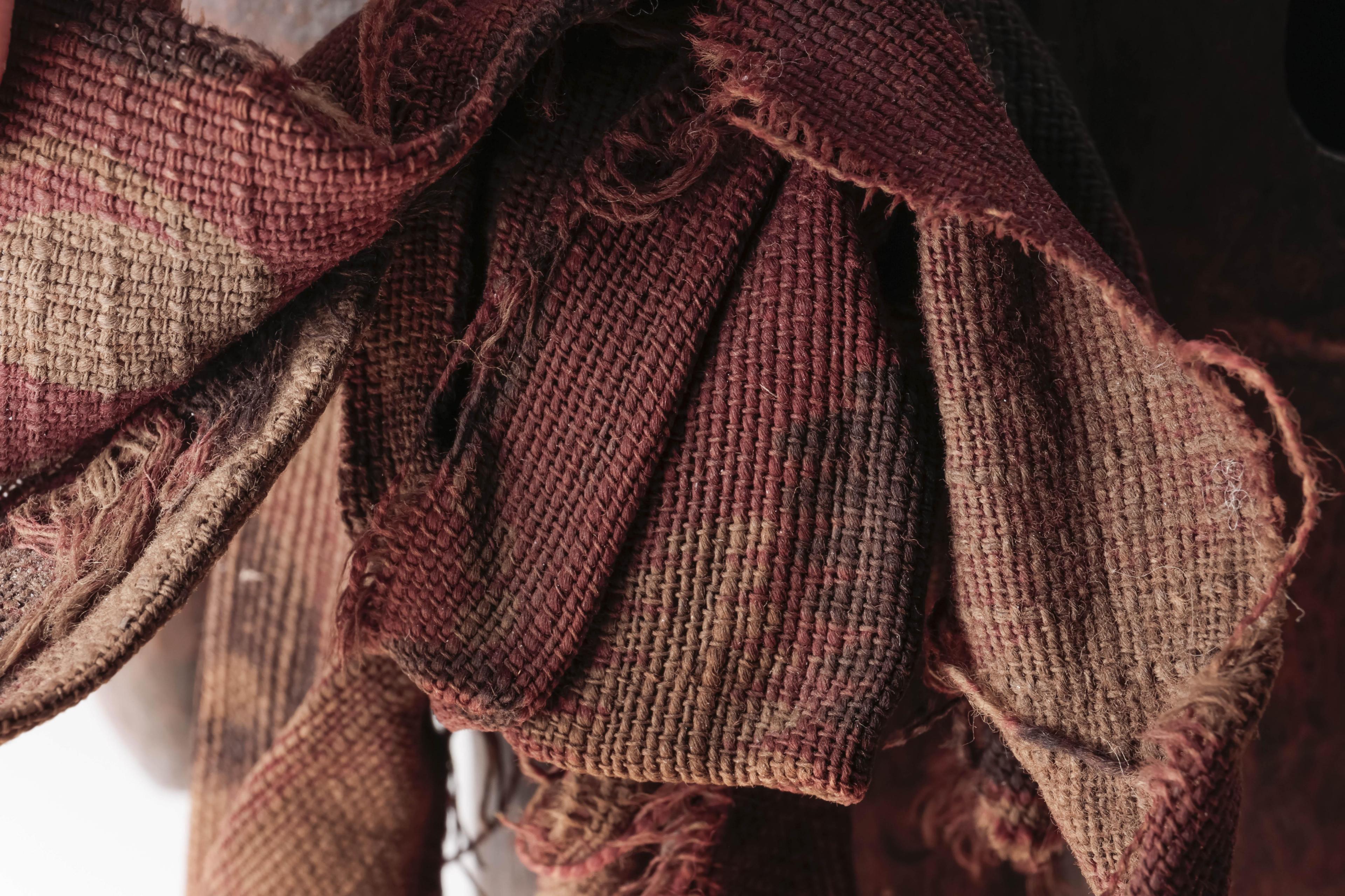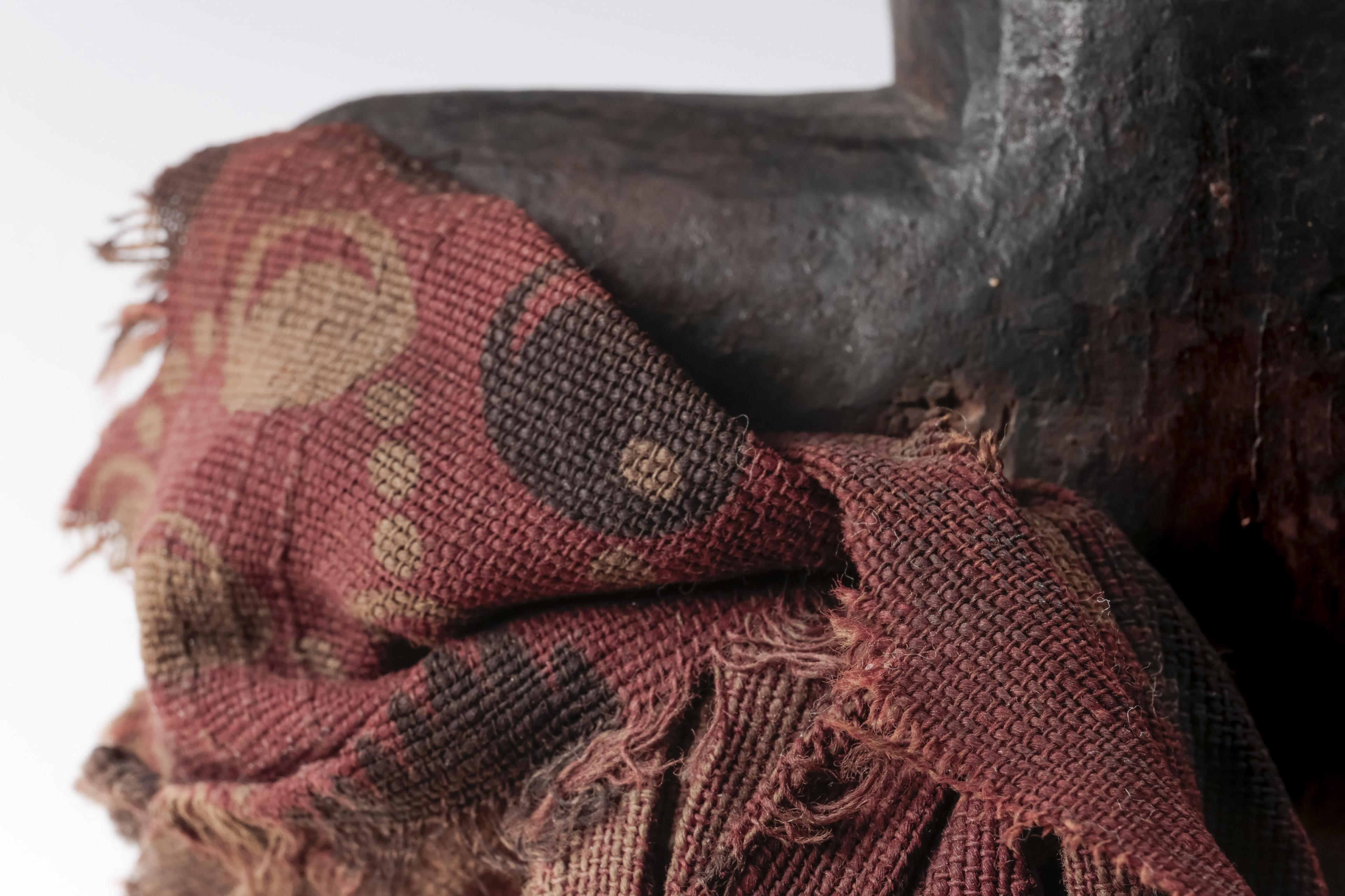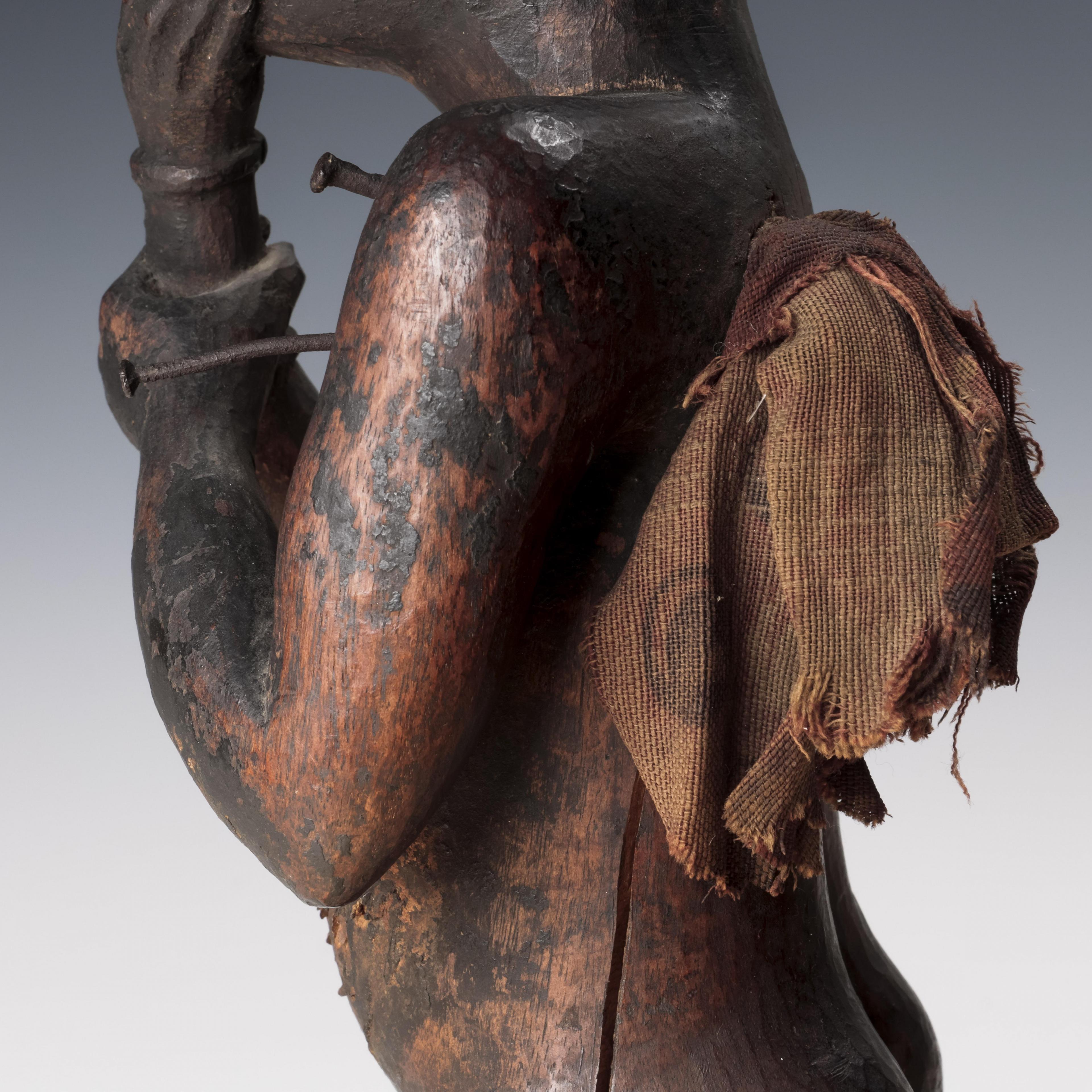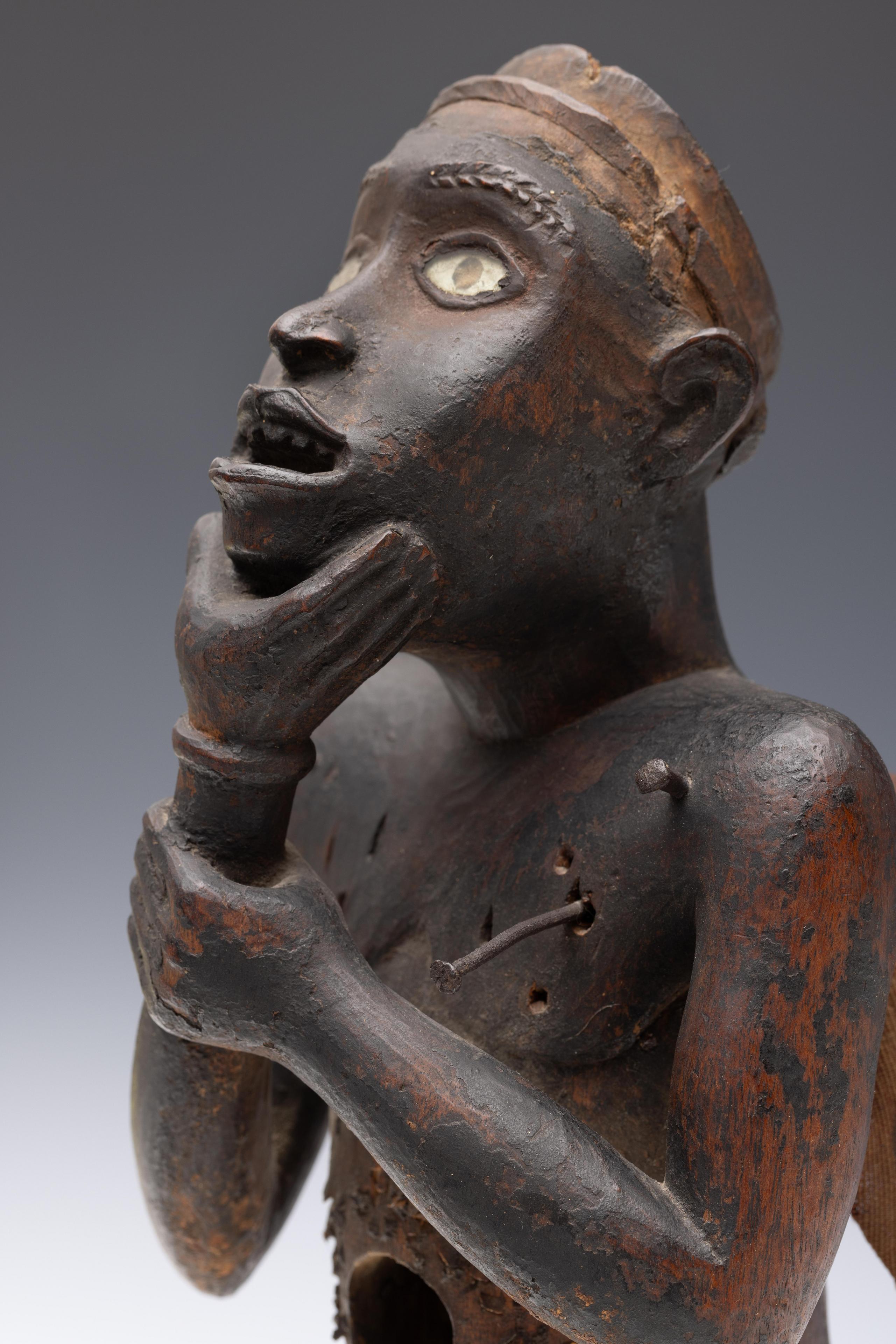 a standing muscular figure holding his right hand to the chin, his left firmly holds the lower right arm; the expressive face with detailed features; the belly shows a deep circular cavity surrounded by traces of an oval box which was affixed to the body; circular cavities can also be seen at the back and back of the head; a piece of trade cloth is inserted in one of the cavities.