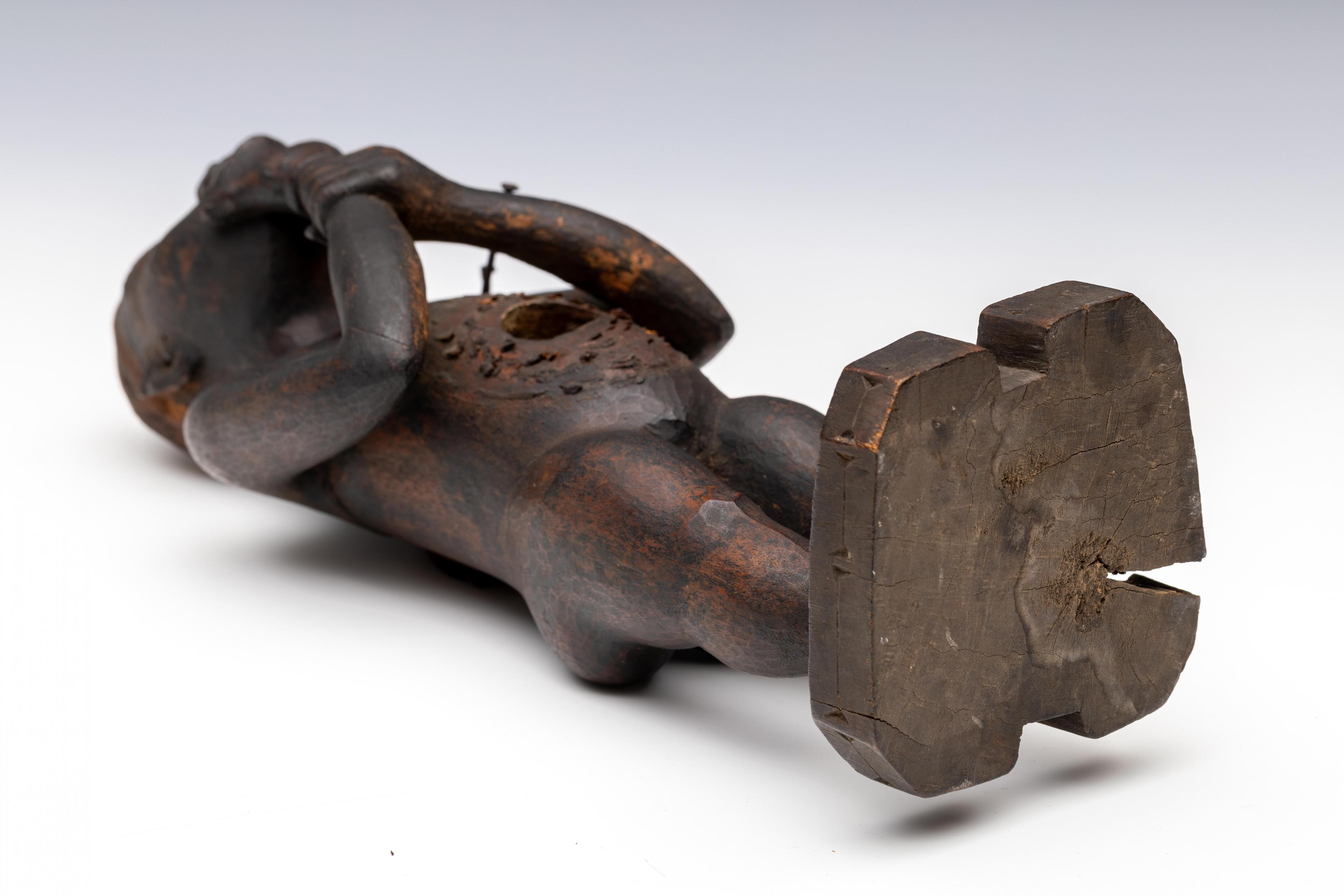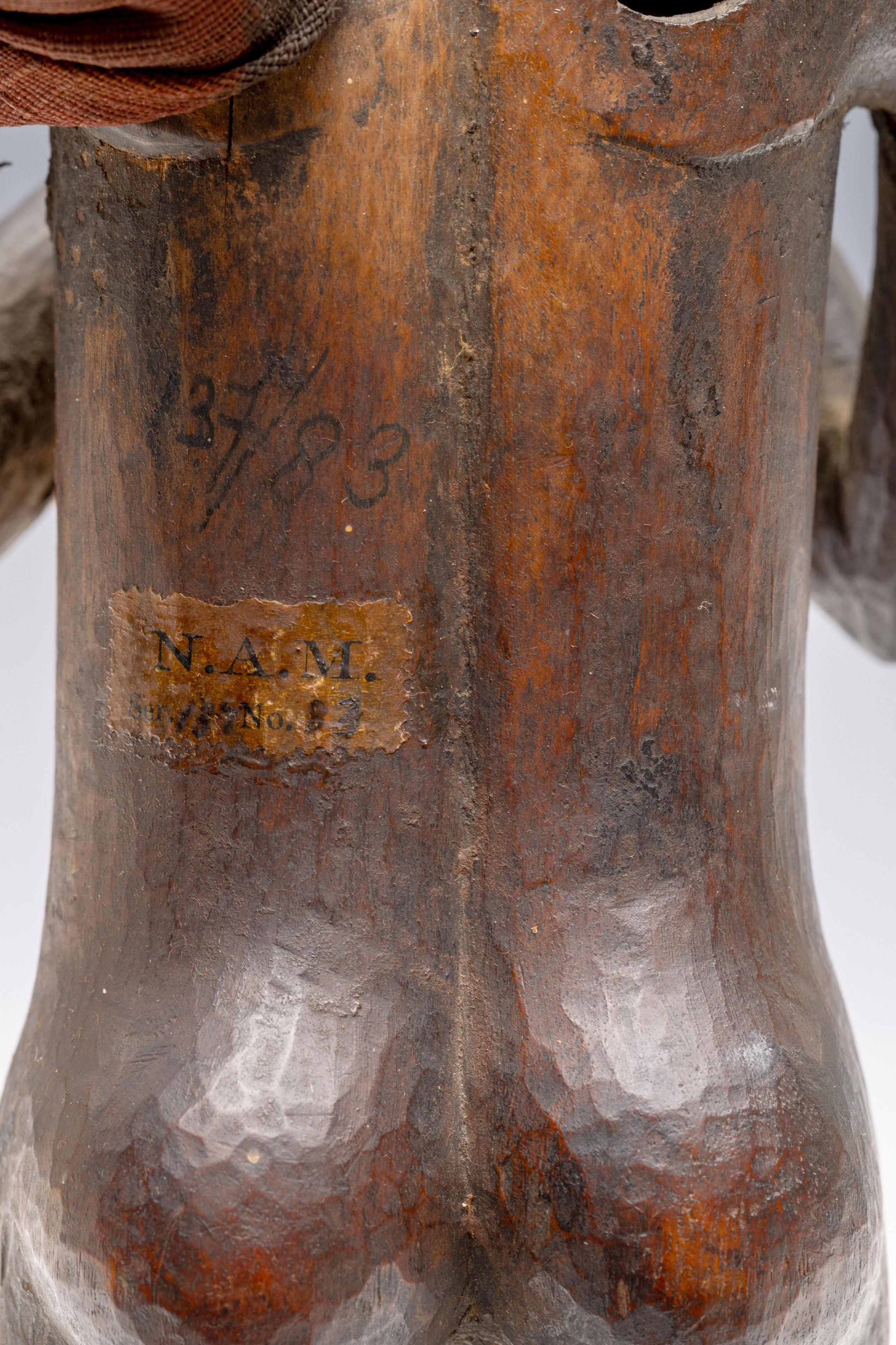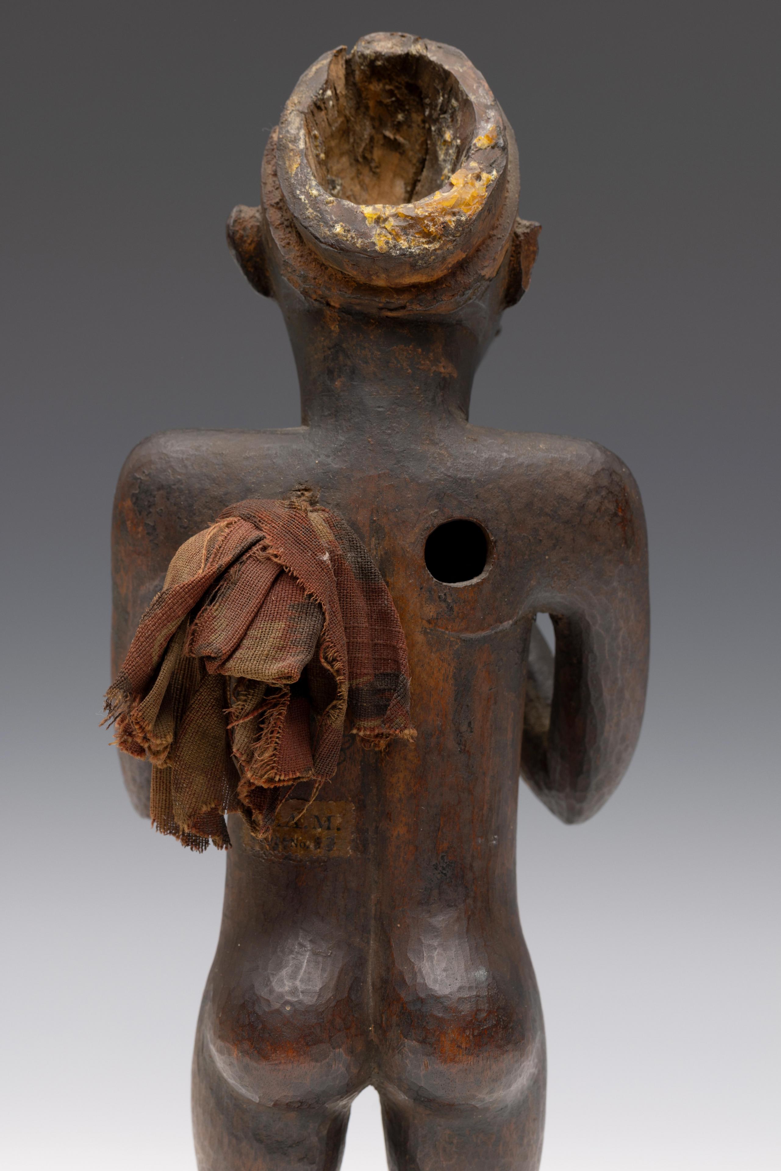 Provenance: Johan August Abraham Marcusson (1853-1926) worked between 1876 and 1885 as a commercial agent for the Nieuwe Afrikaansche Handelsvennootschap (NAHV) in the Lower Congo region. During his uninterrupted ten-year stay he acquired several items, including power figures, he referred to as fetishes. In 1885 he donated part of his collection to the Ethnographic Museum of the Amsterdam zoo Natura Artis Magistra.  Natura Artis Magistra (N.A.M.), with written numbers at the back and a sticker: N.A.M. / Ser. 137 nr. 83; deaccessioned. Collection C.T. Bertling, Bloemendaal.