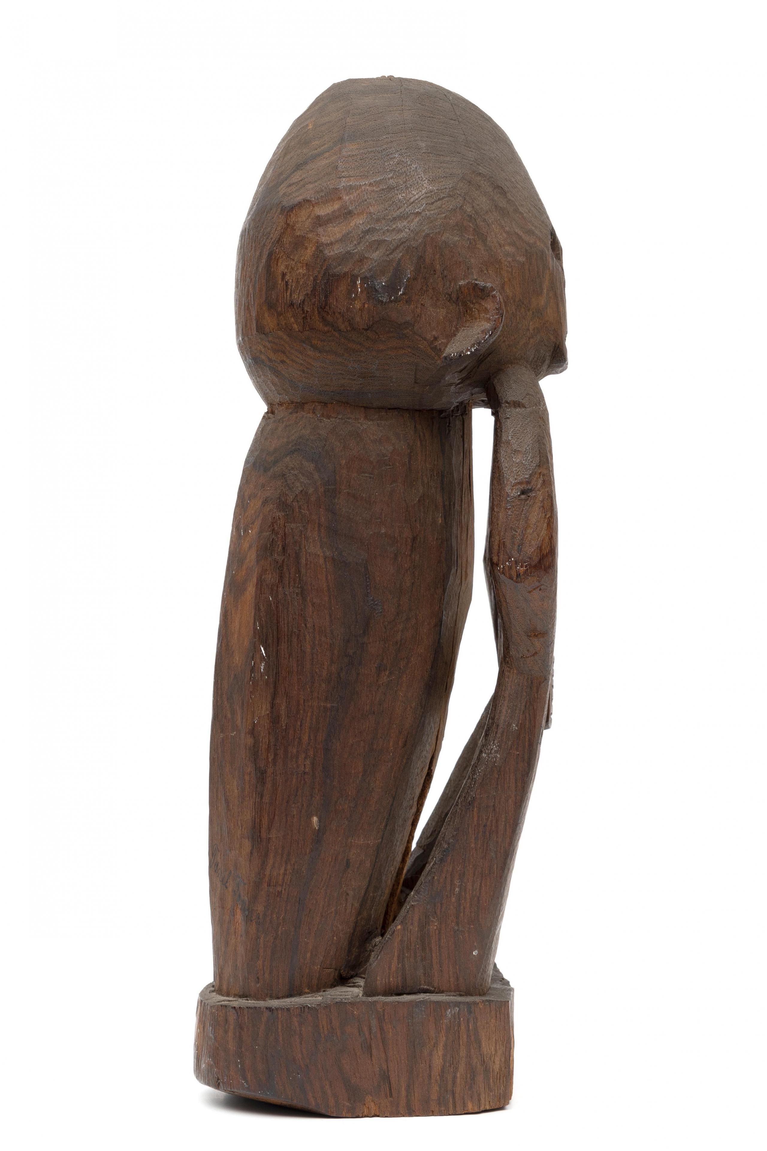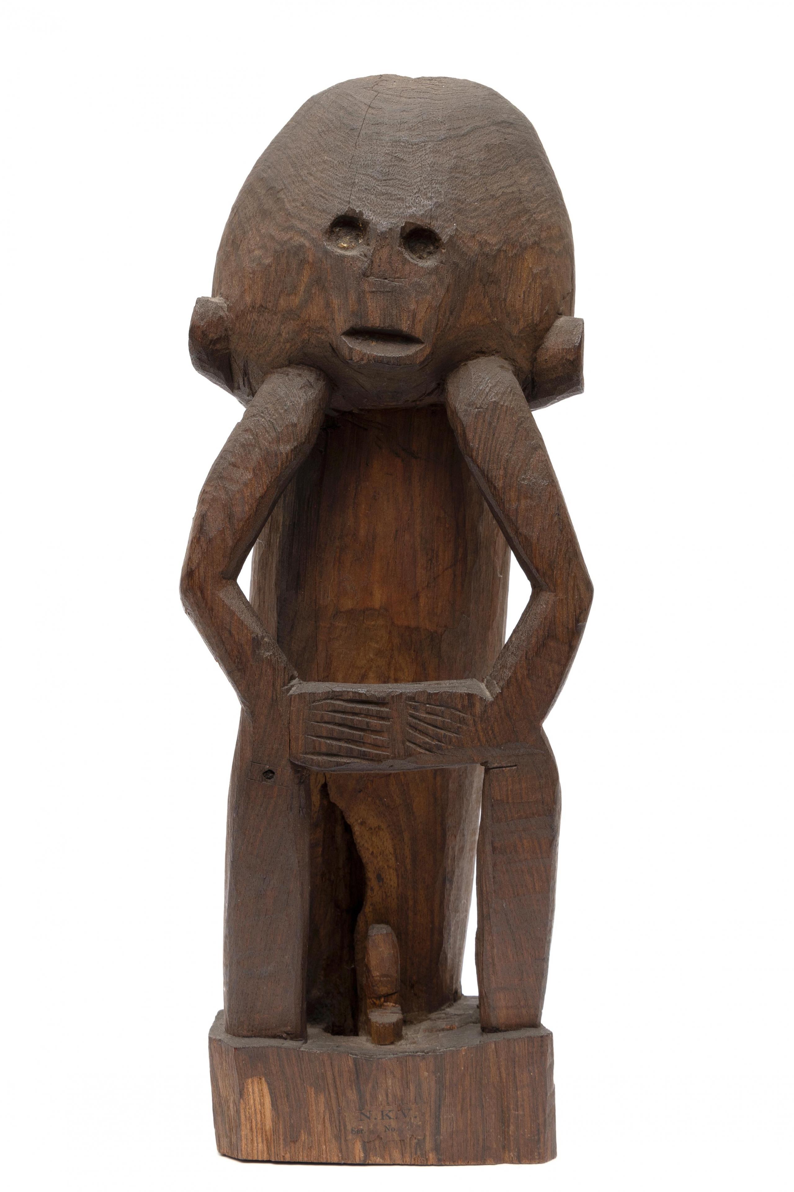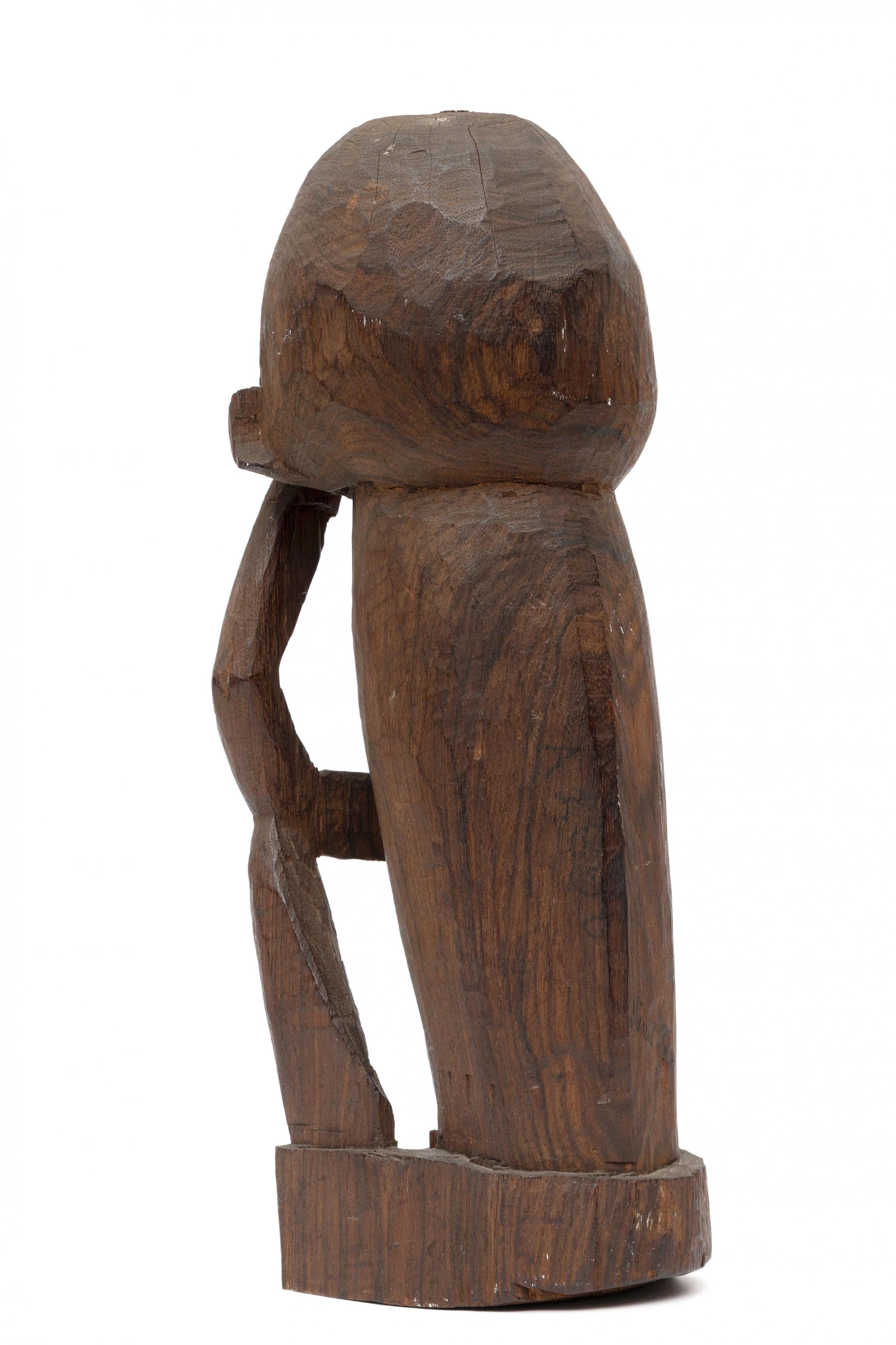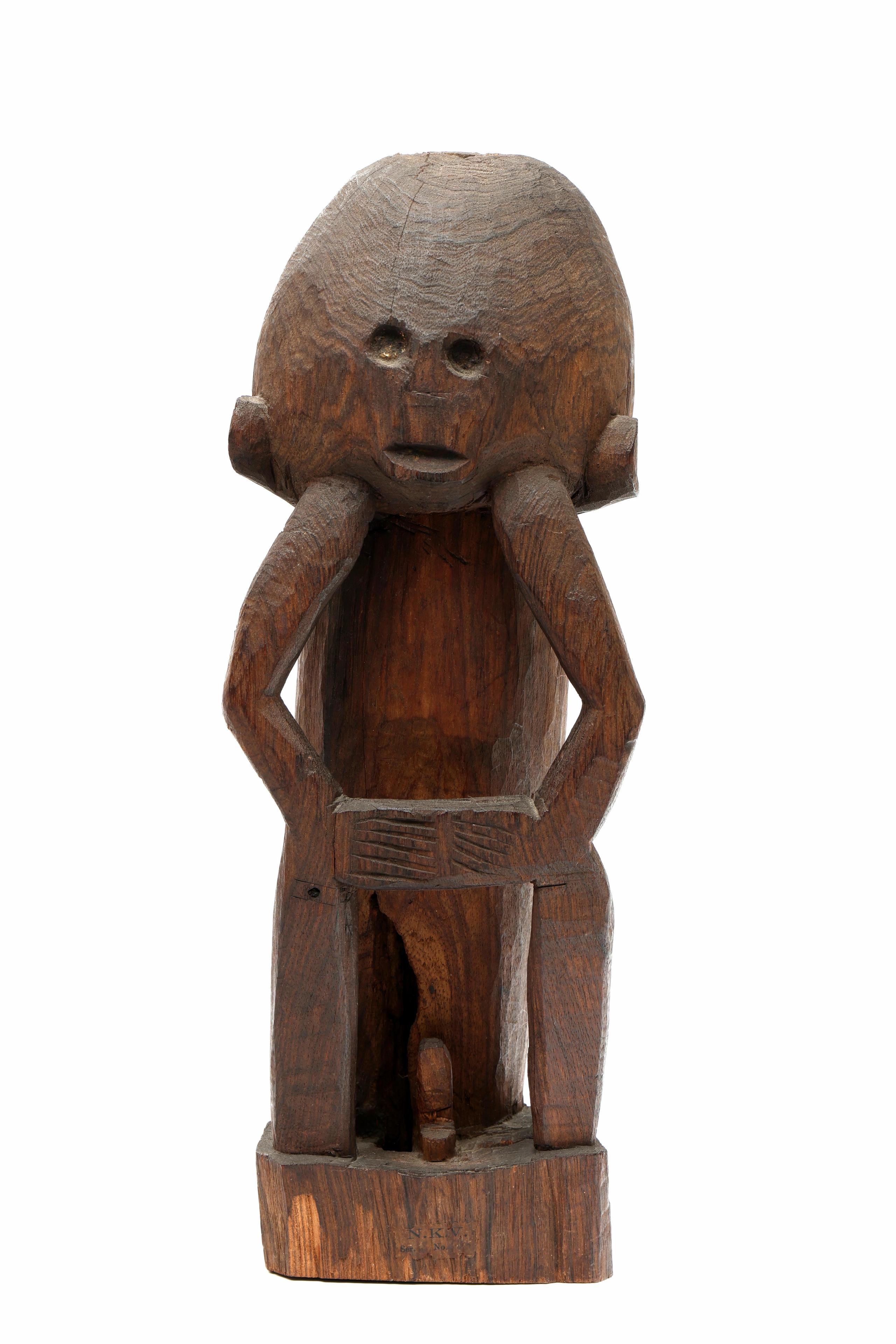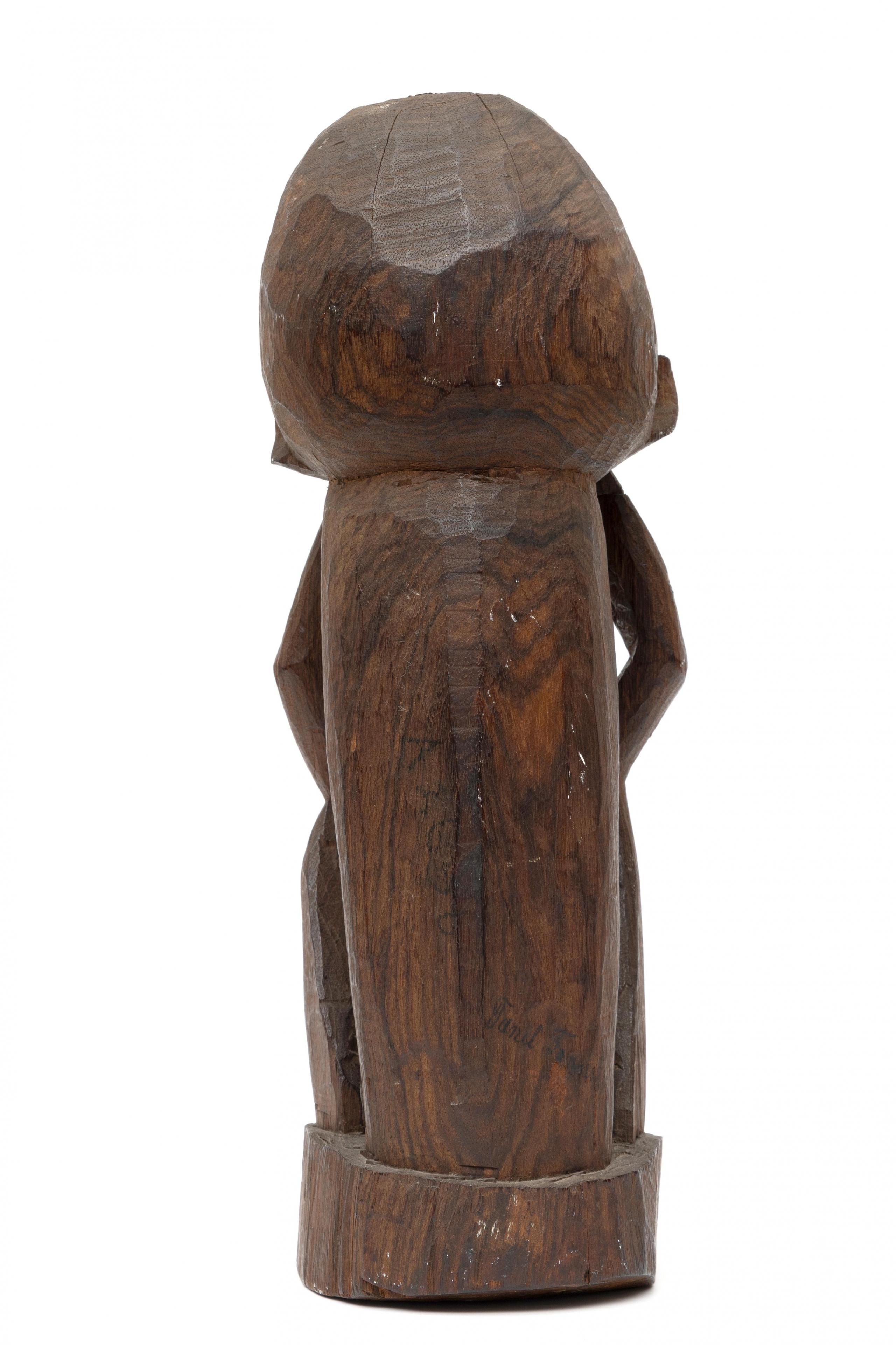 in a squatting posture, disproportionate large head with hollowed circular eyes, small and flat triangular nose, reversed ears, free carved arms and legs in a continuous configuration in front of an elementary torso with spine. On the back is written 'Tanil Tana' and on the bottom partly written in white A 2.. The bottom partly cut.