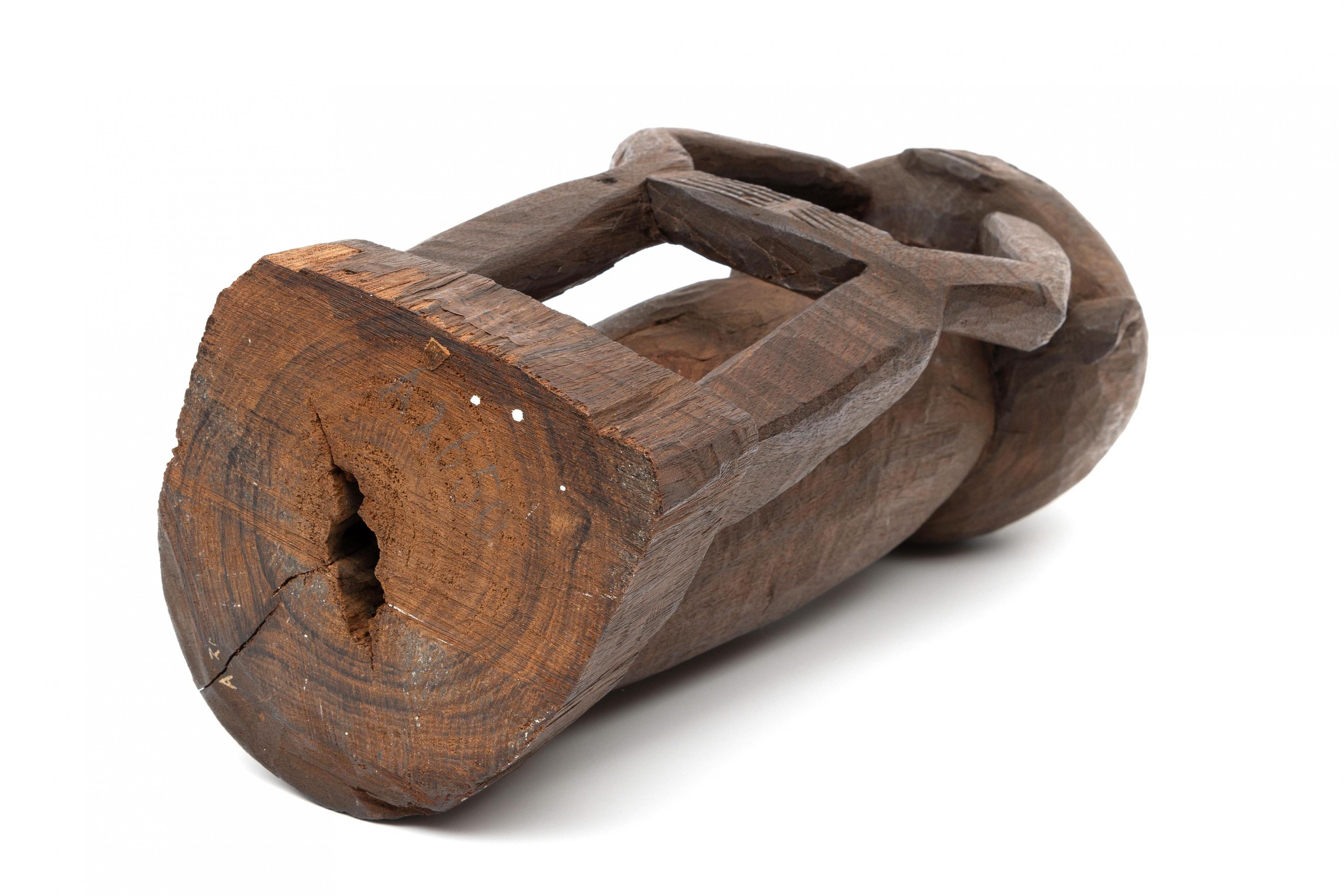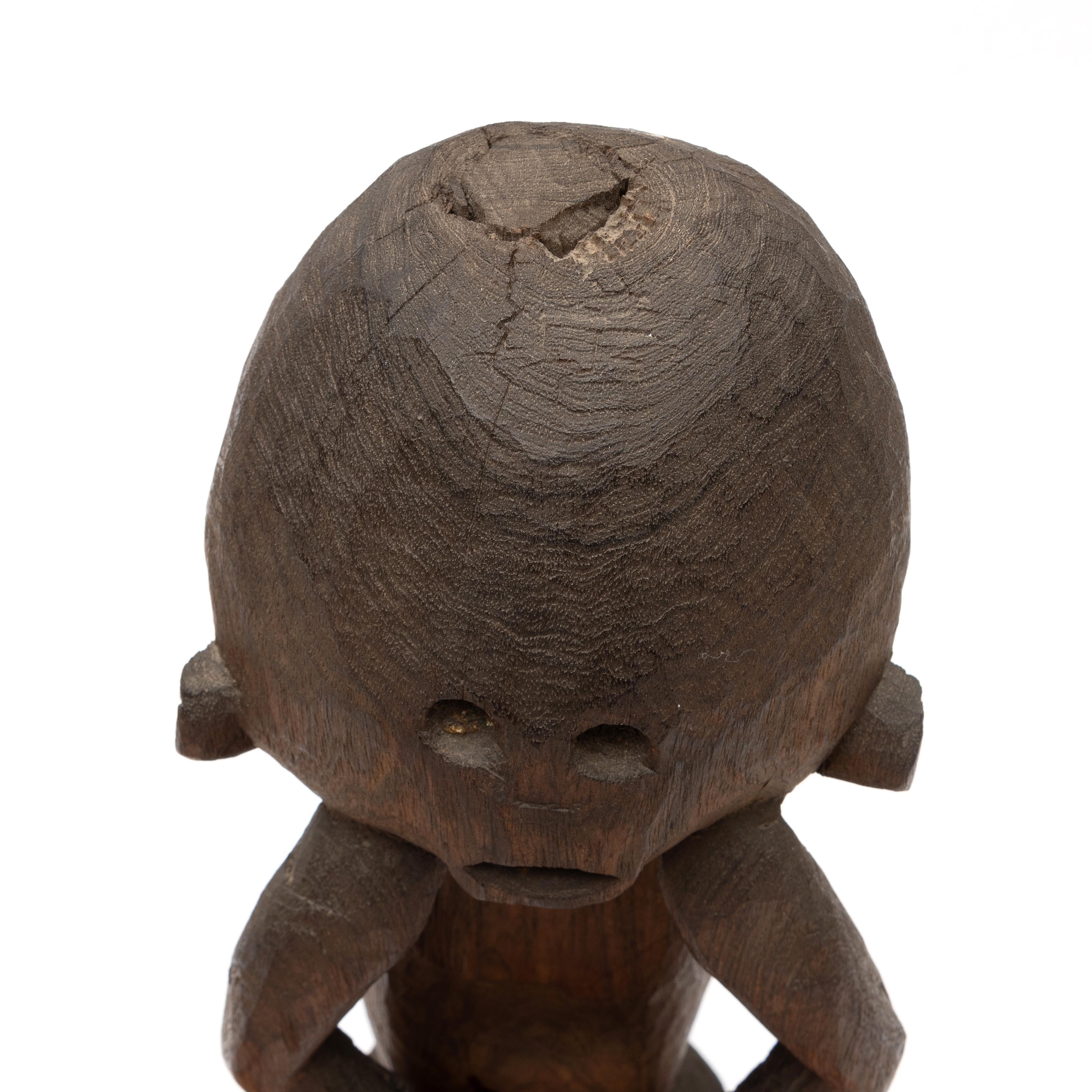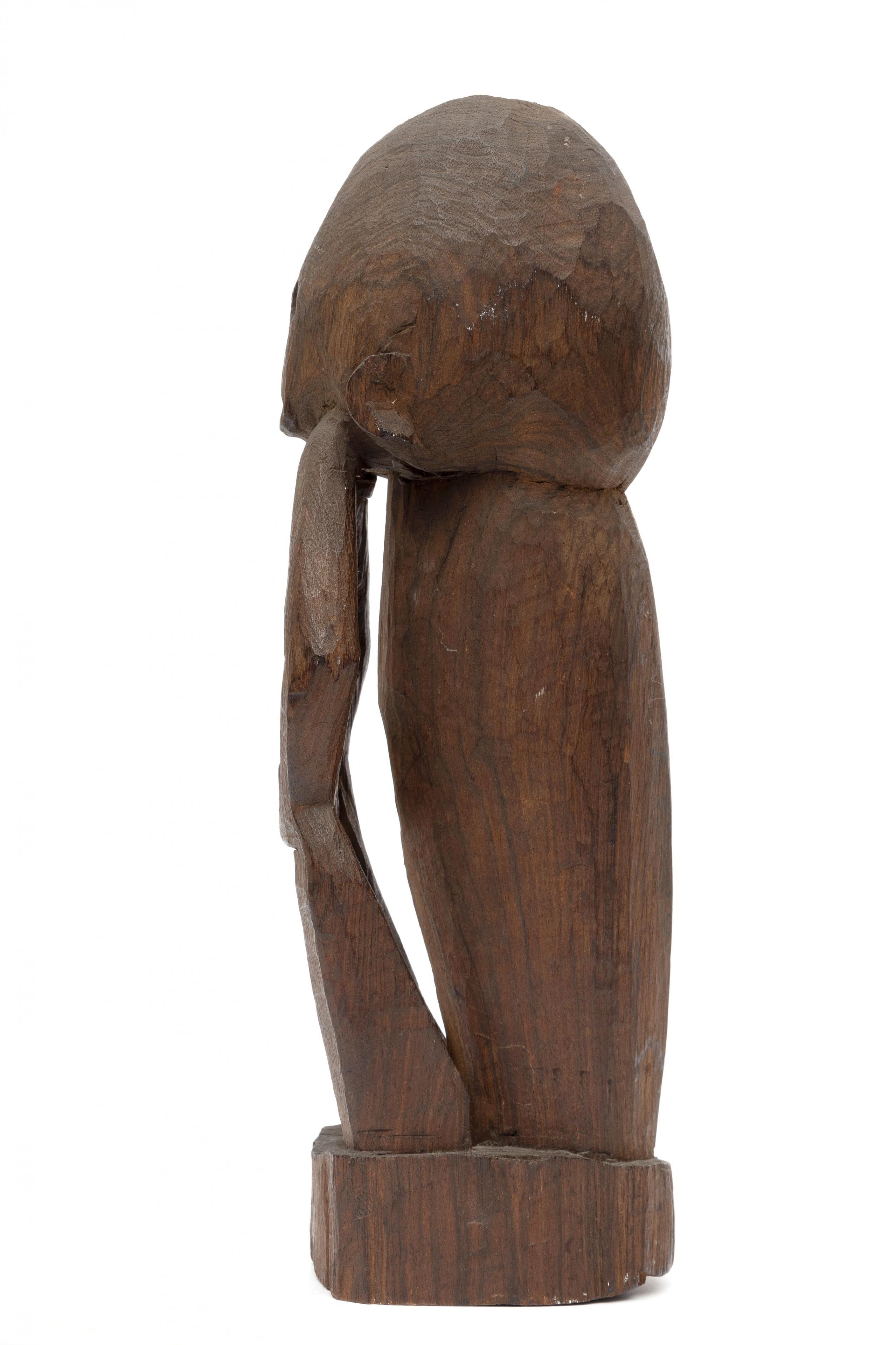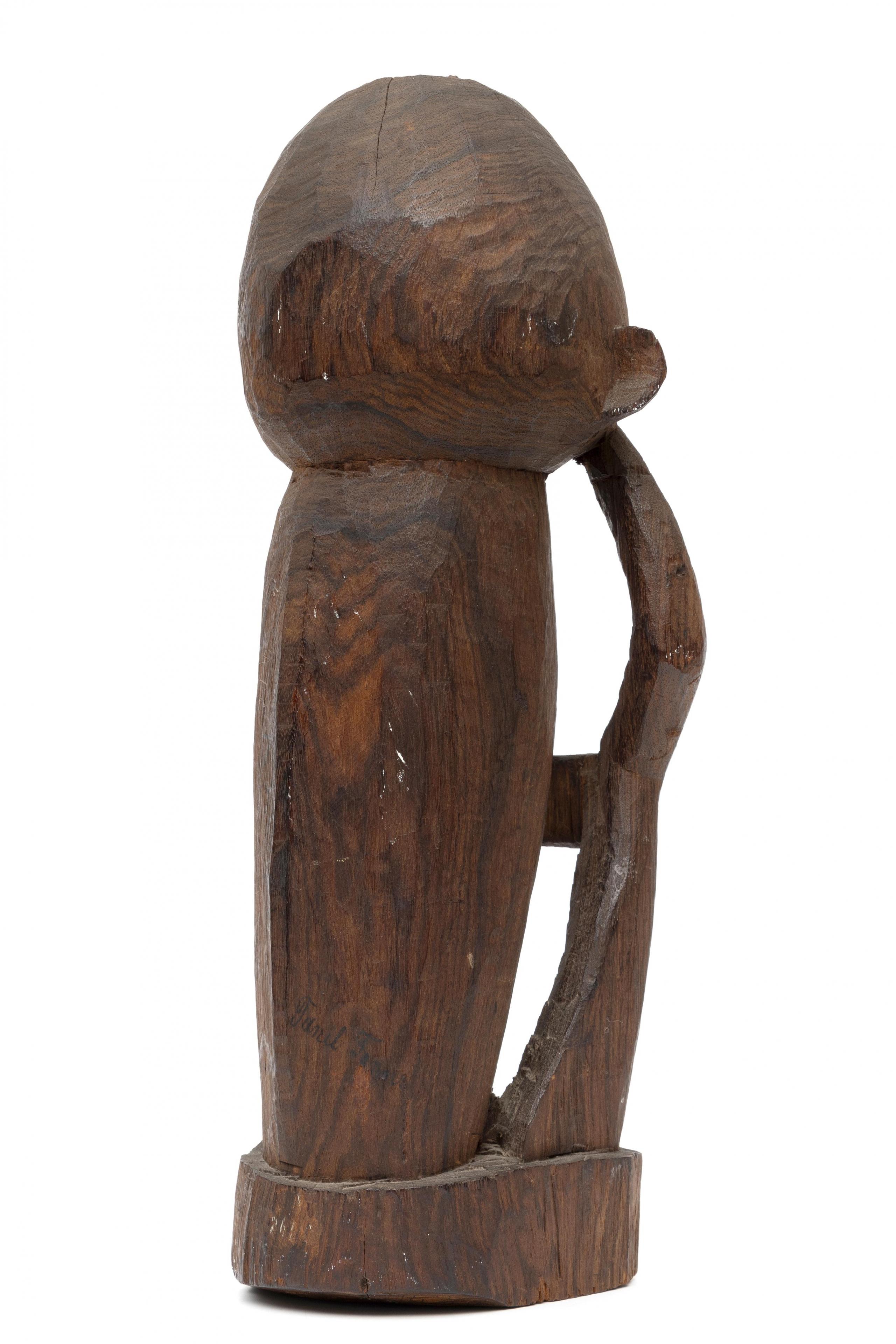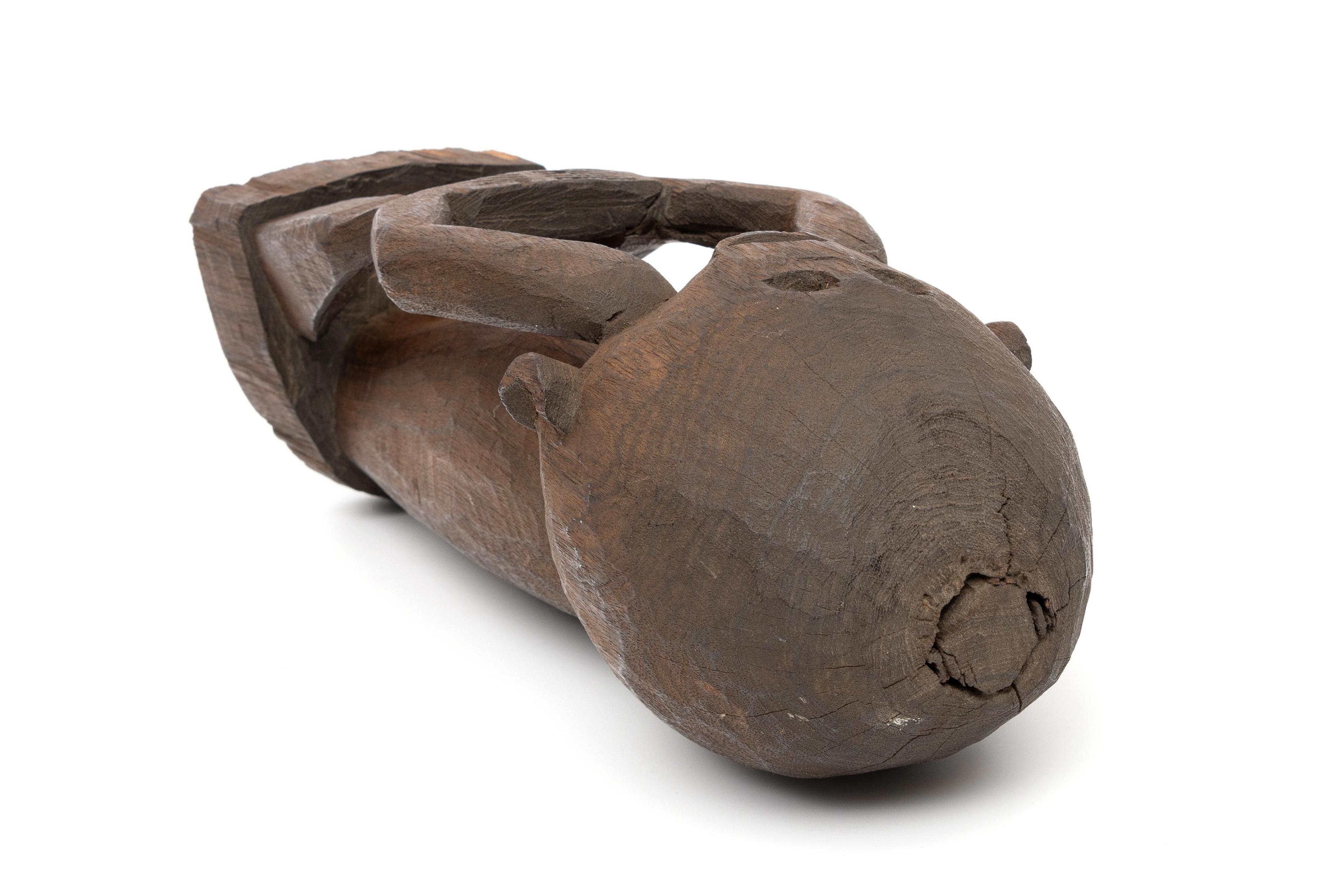 in a squatting posture, disproportionate large head with hollowed circular eyes, small and flat triangular nose, reversed ears, free carved arms and legs in a continuous configuration in front of an elementary torso with spine. On the back is written 'Tanil Tana' and on the bottom partly written in white A 2.. The bottom partly cut.
