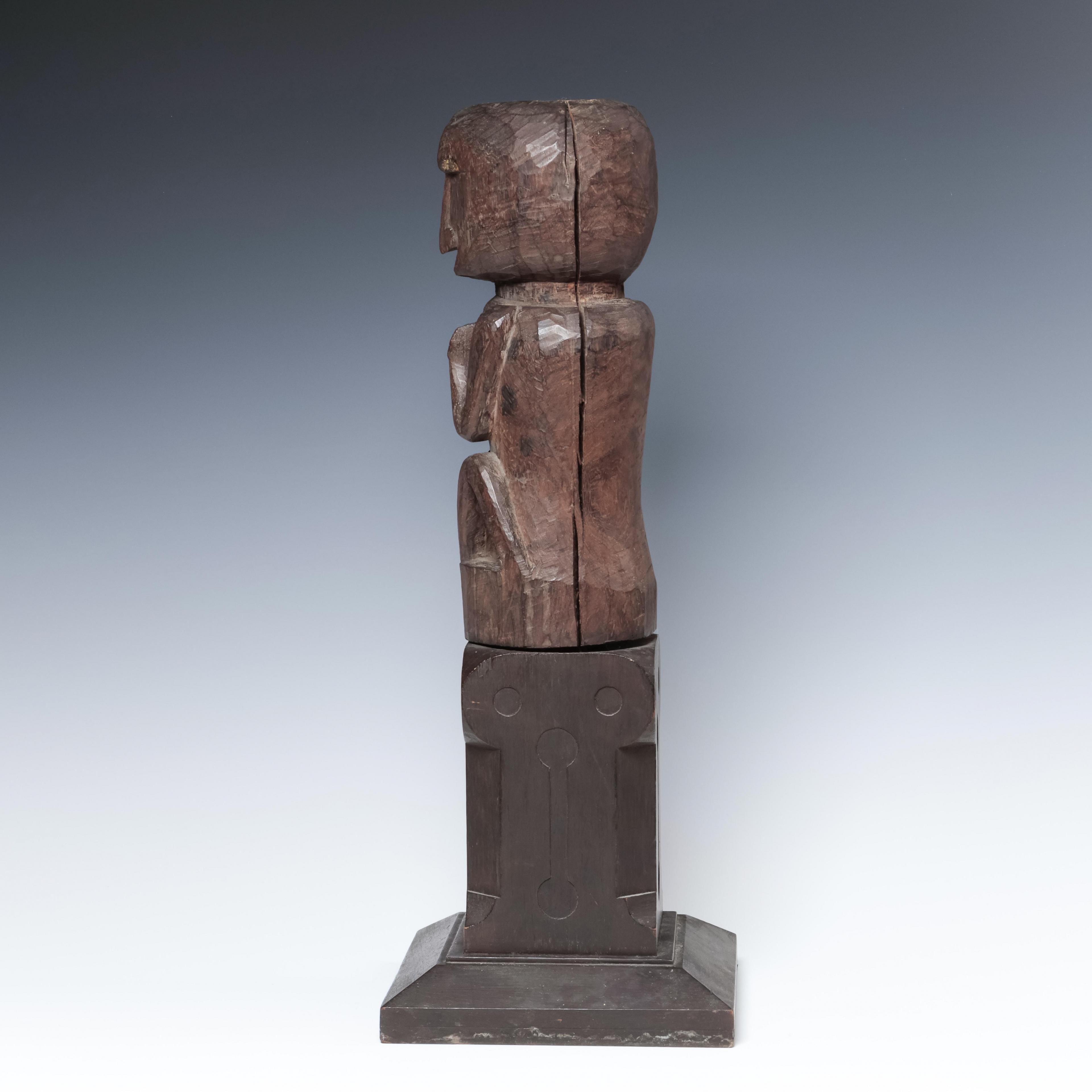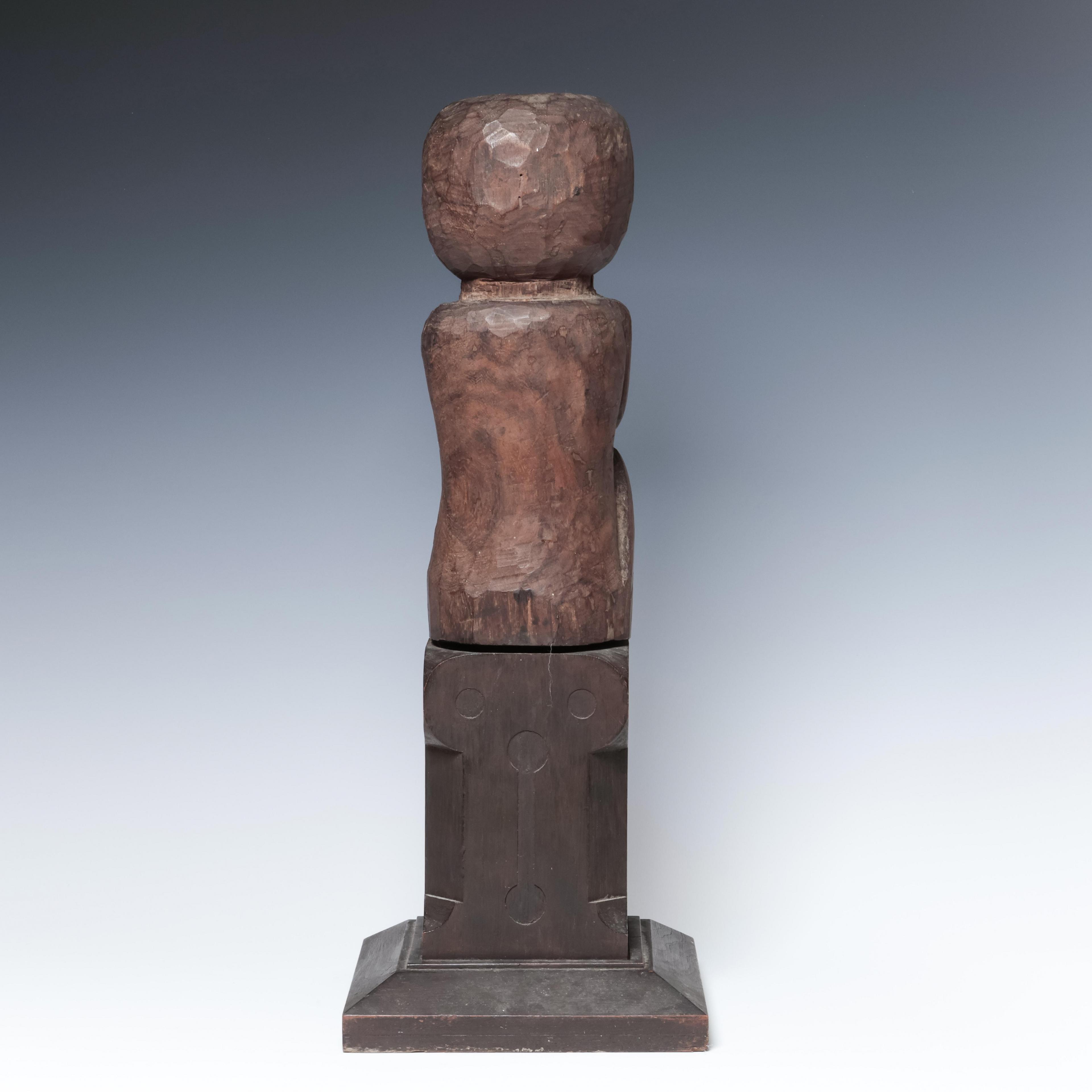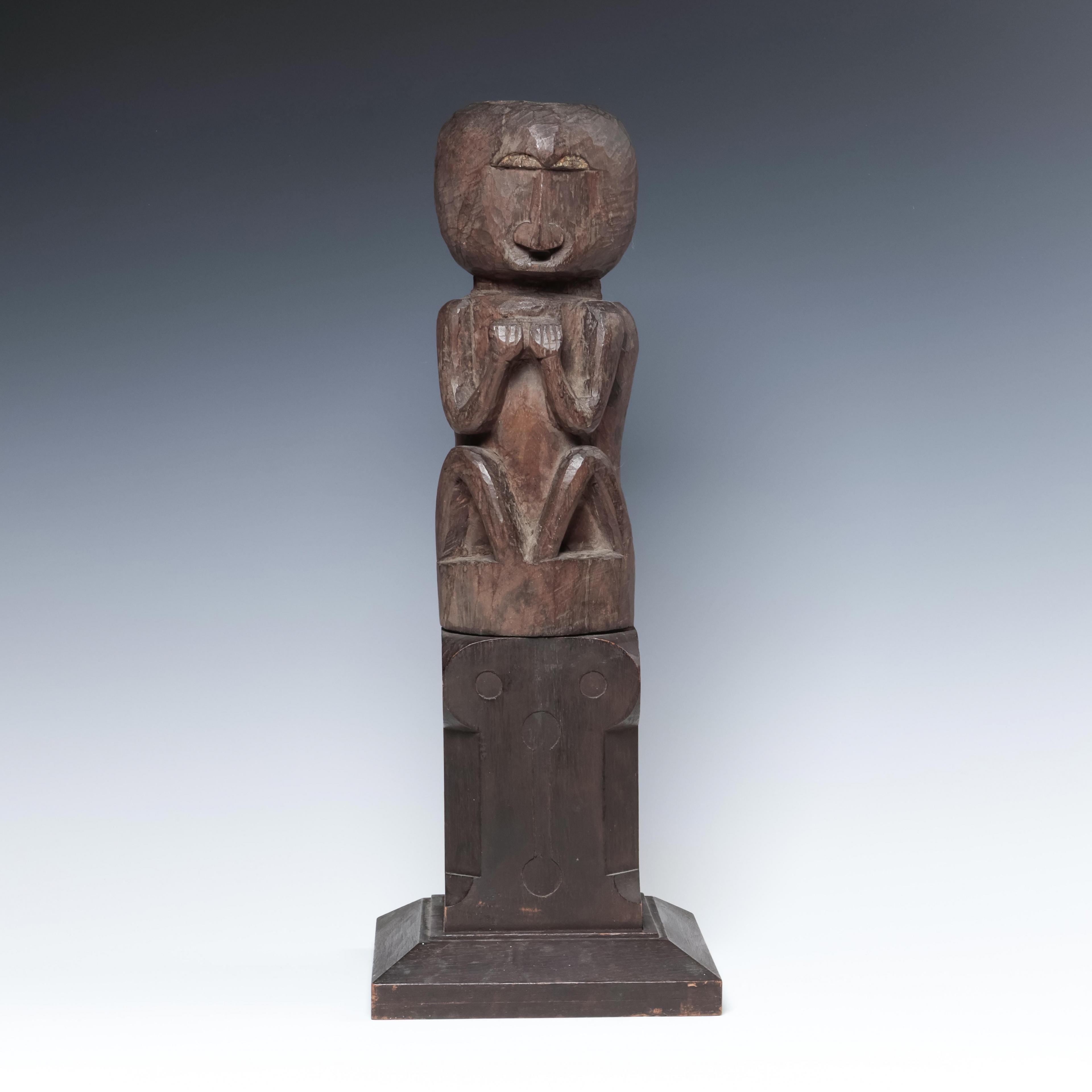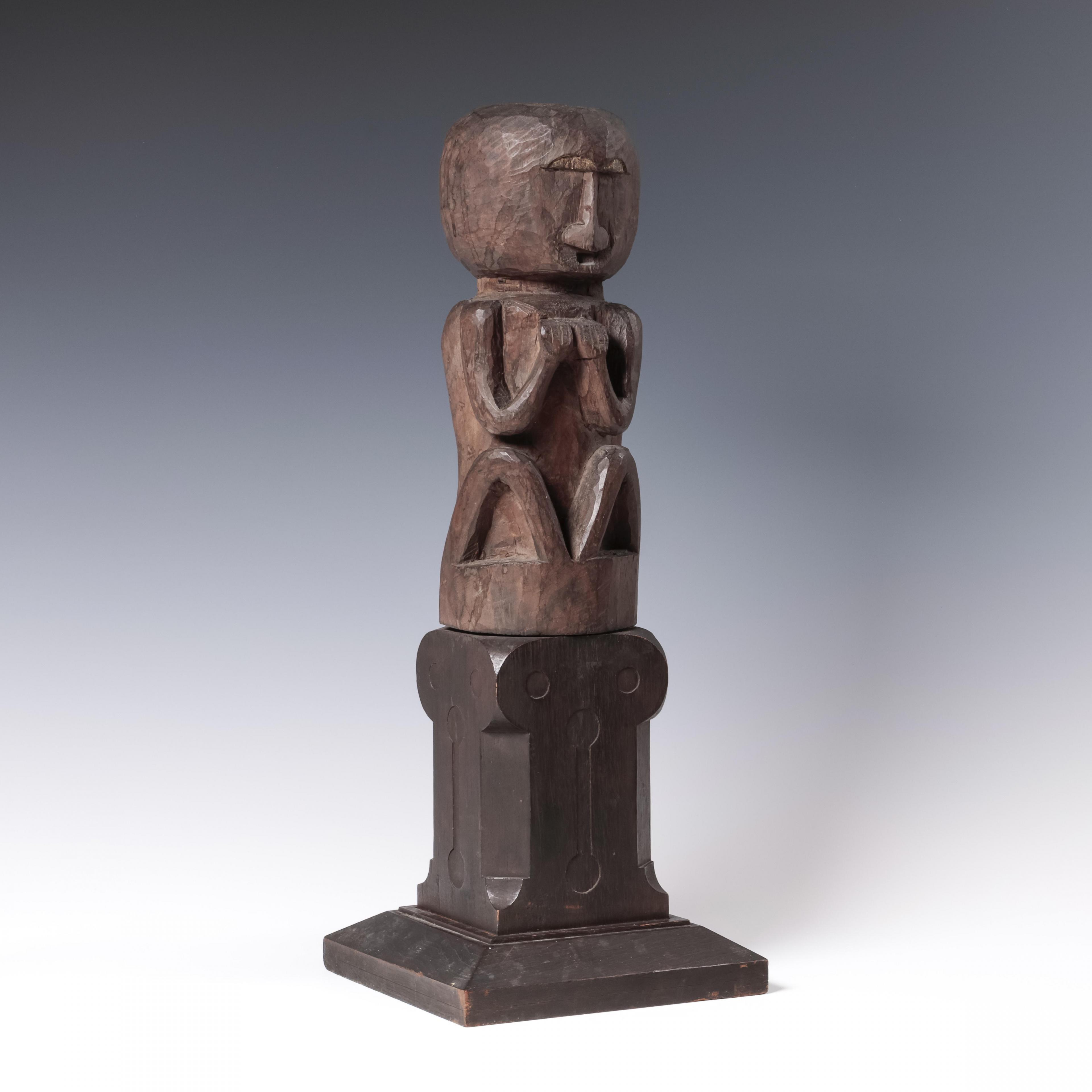in crouching position, bent arms and legs, the crescent eyes whitened, rectangular mouth below prominent nostrils. Included in this lot is a woodcut depicting this figure, made by C.T. Bertling himself.