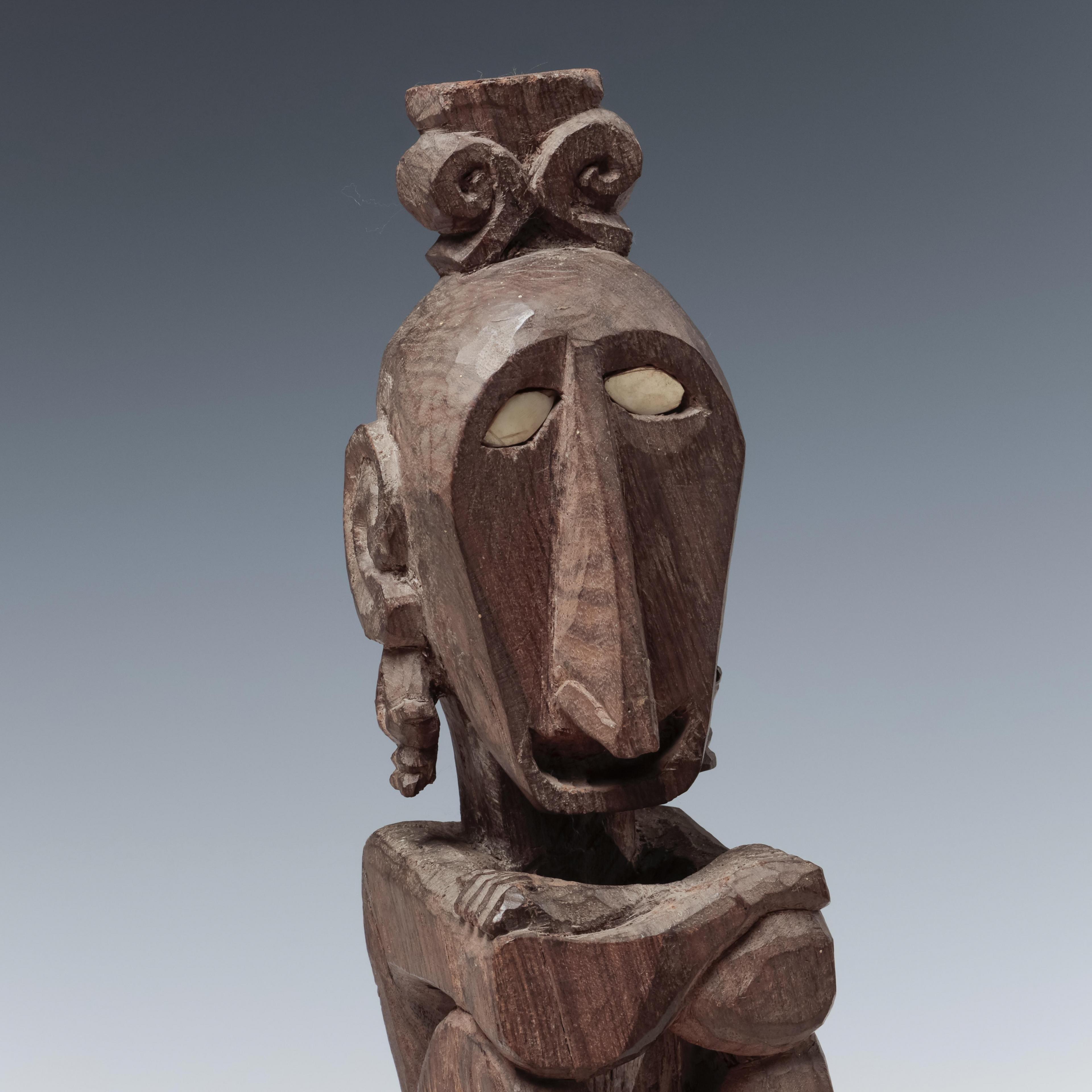 in a squatting position, crossed arms resting on the raised knees, four legs below the plinth, inset pearl shell eyes.