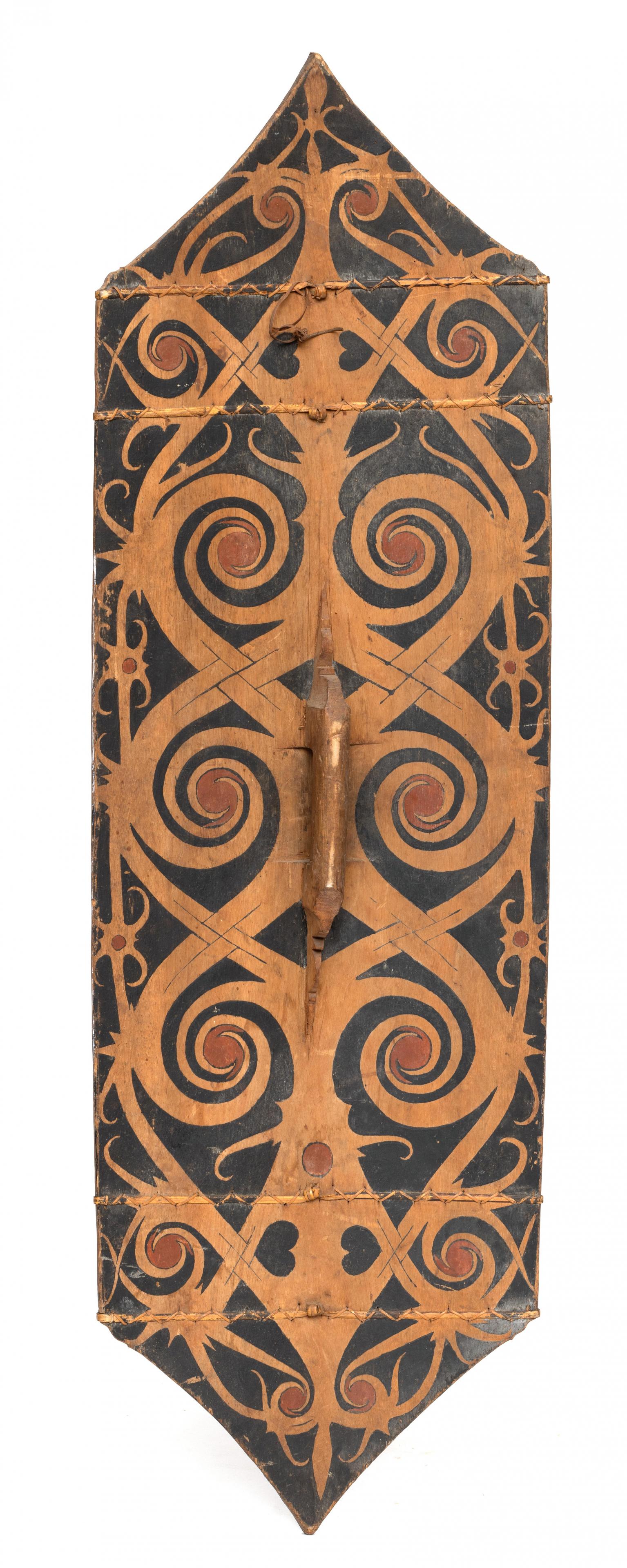 the hexagonal shield with a central ridge and four rattan reinforcements showing a central monster face in the centre amidst scrolling patterns, the reverse with a spiral pattern in red and black