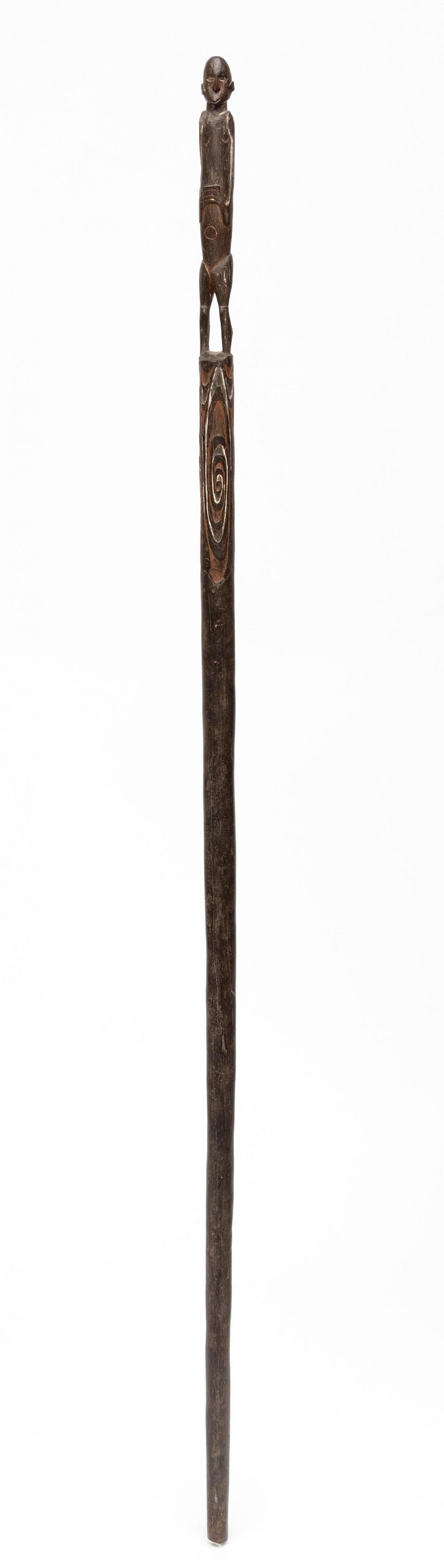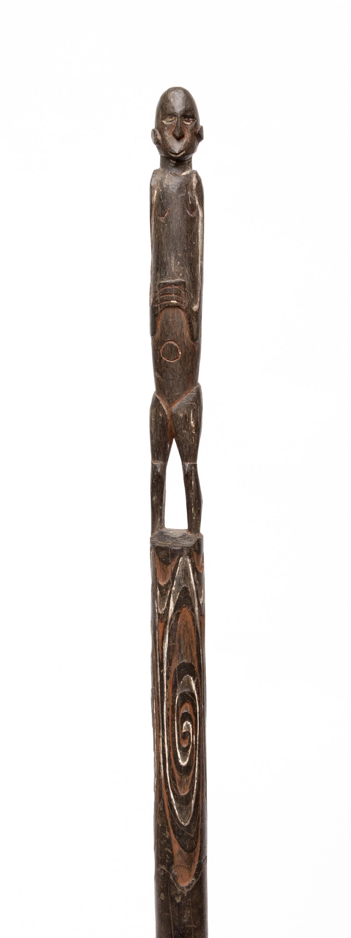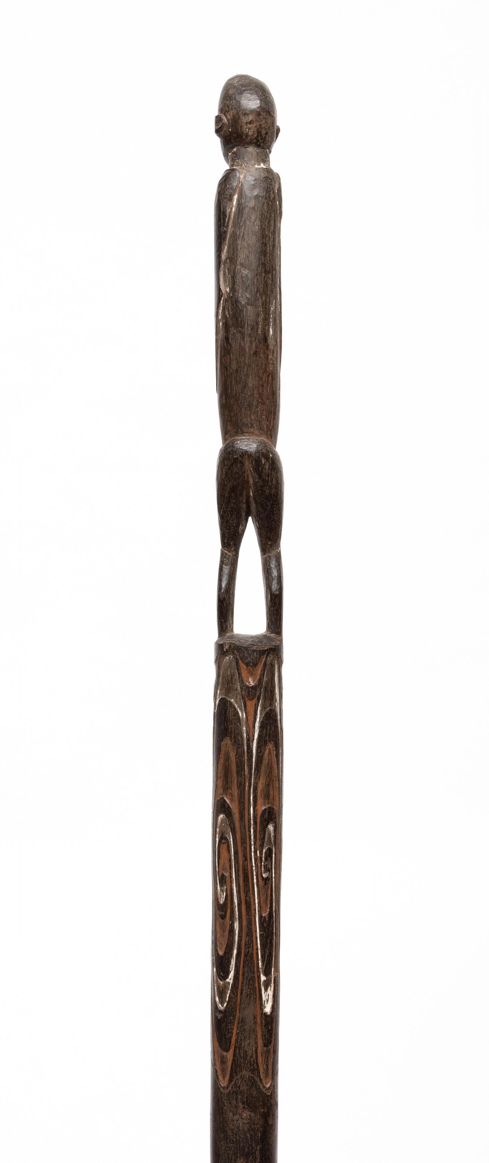 the upper part of the tubular shaft decorated with a double spiral pattern, surmounted by a standing anthropomorphic figure, traces of red and white pigments.