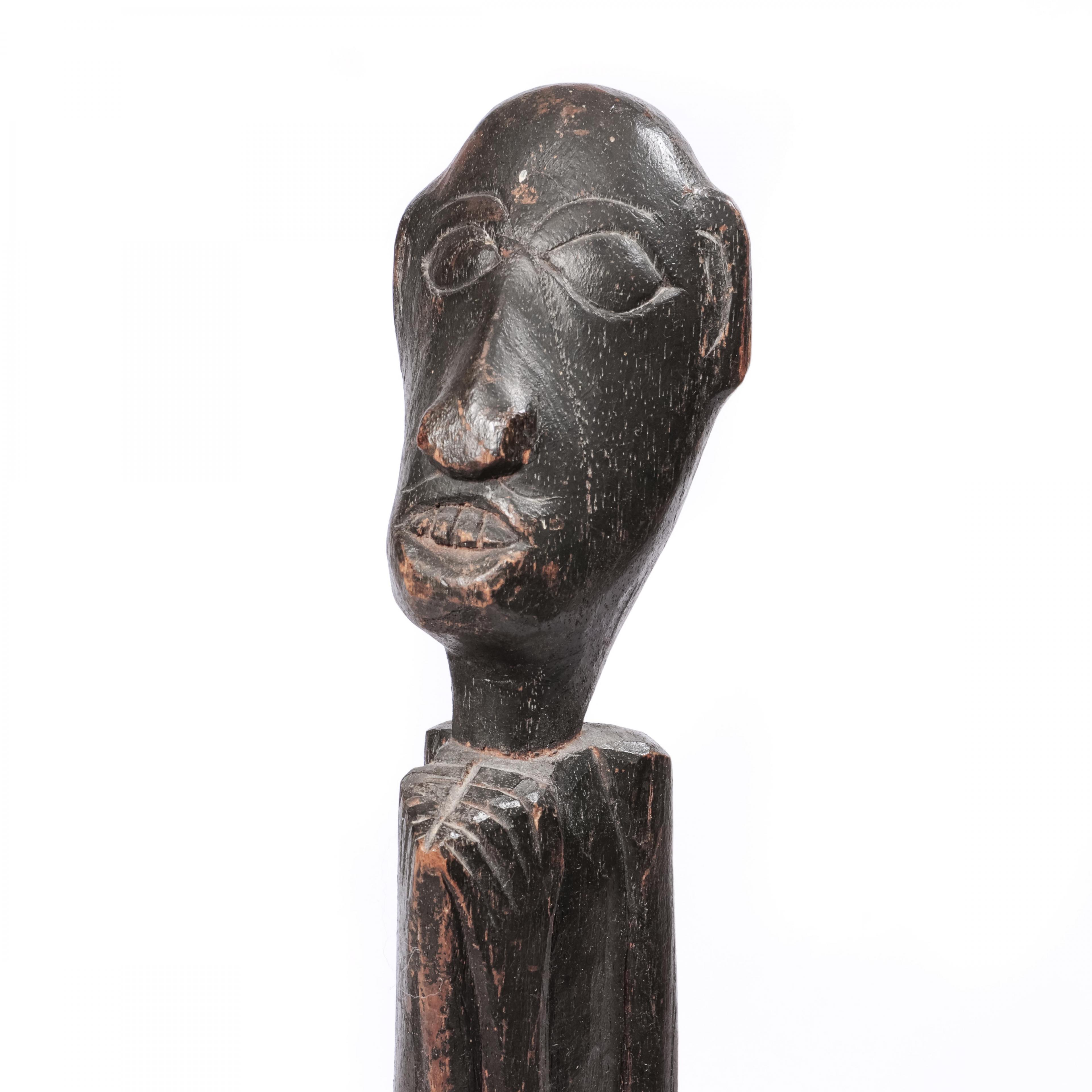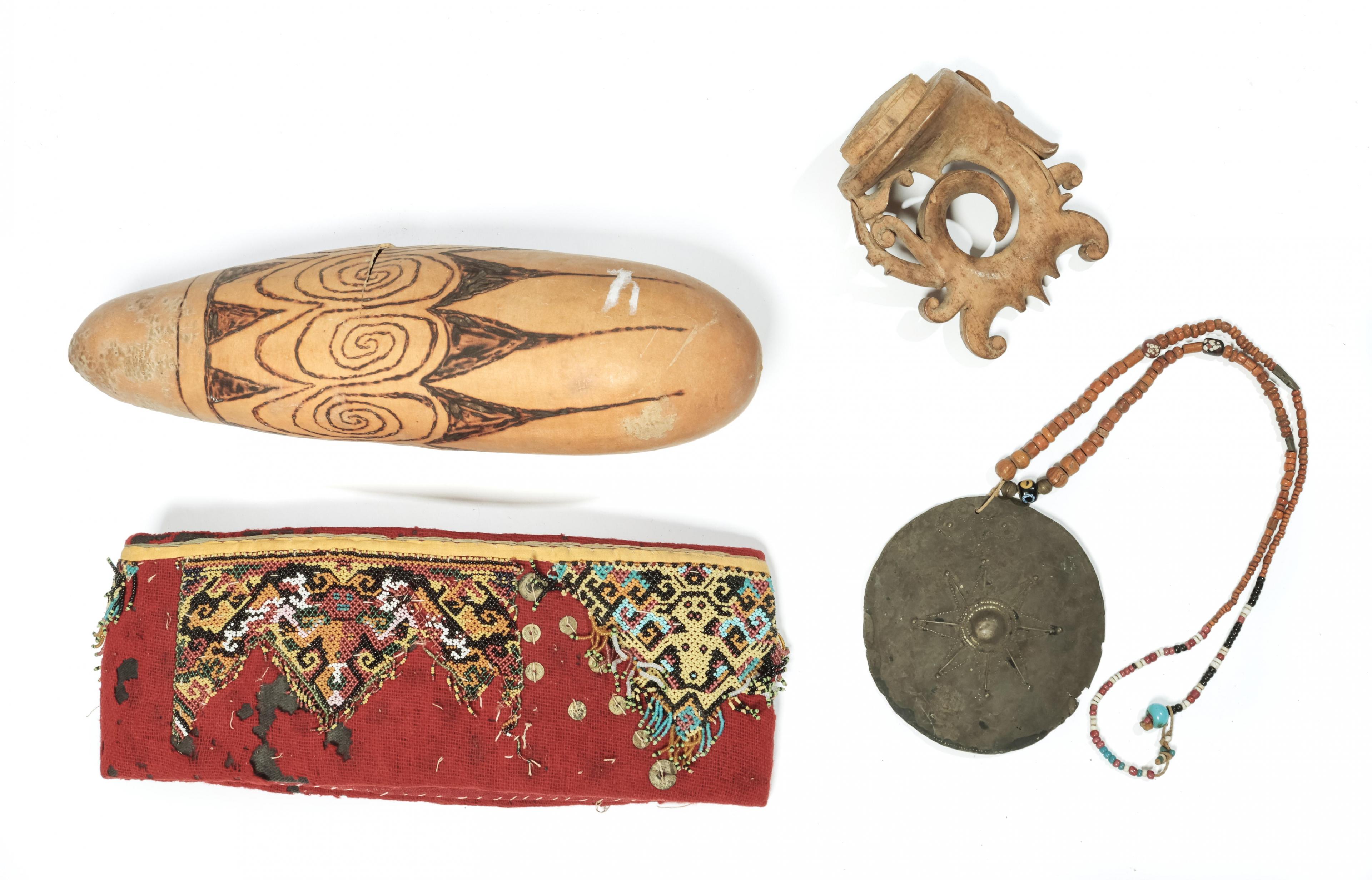 A collection of various Indonesian objects: two Dayak braided rattan bags, a Dayak plaited container, a Lake Sentani lime gourd (crack), a Dayak wooden lid, a Maloh Dayak beaded headdress (defects), Bali, a wooden statue, ca. 1920's and a Flores silvered