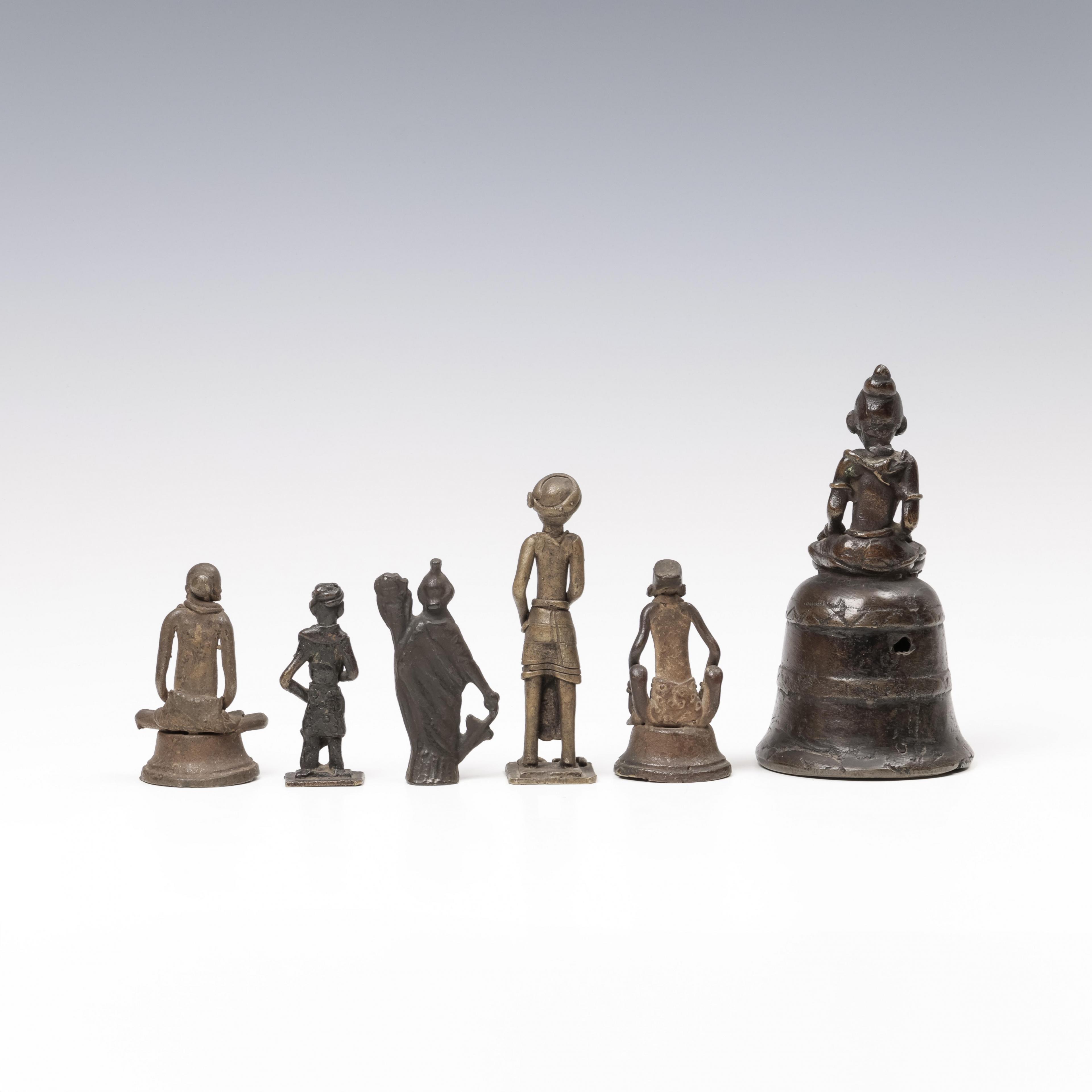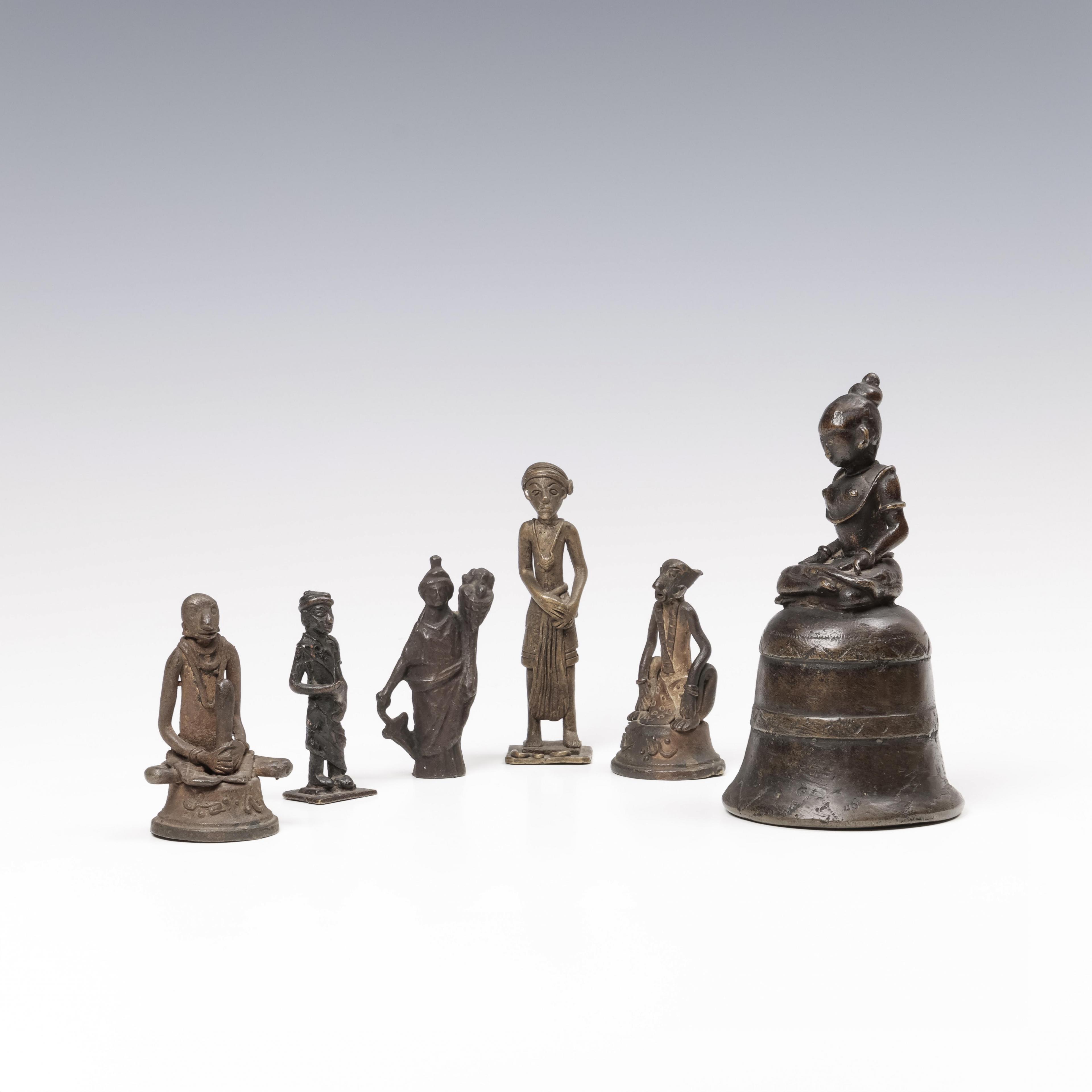Middle Java, a collection of four bronze figures and a bronze bell, ca. 19th century.