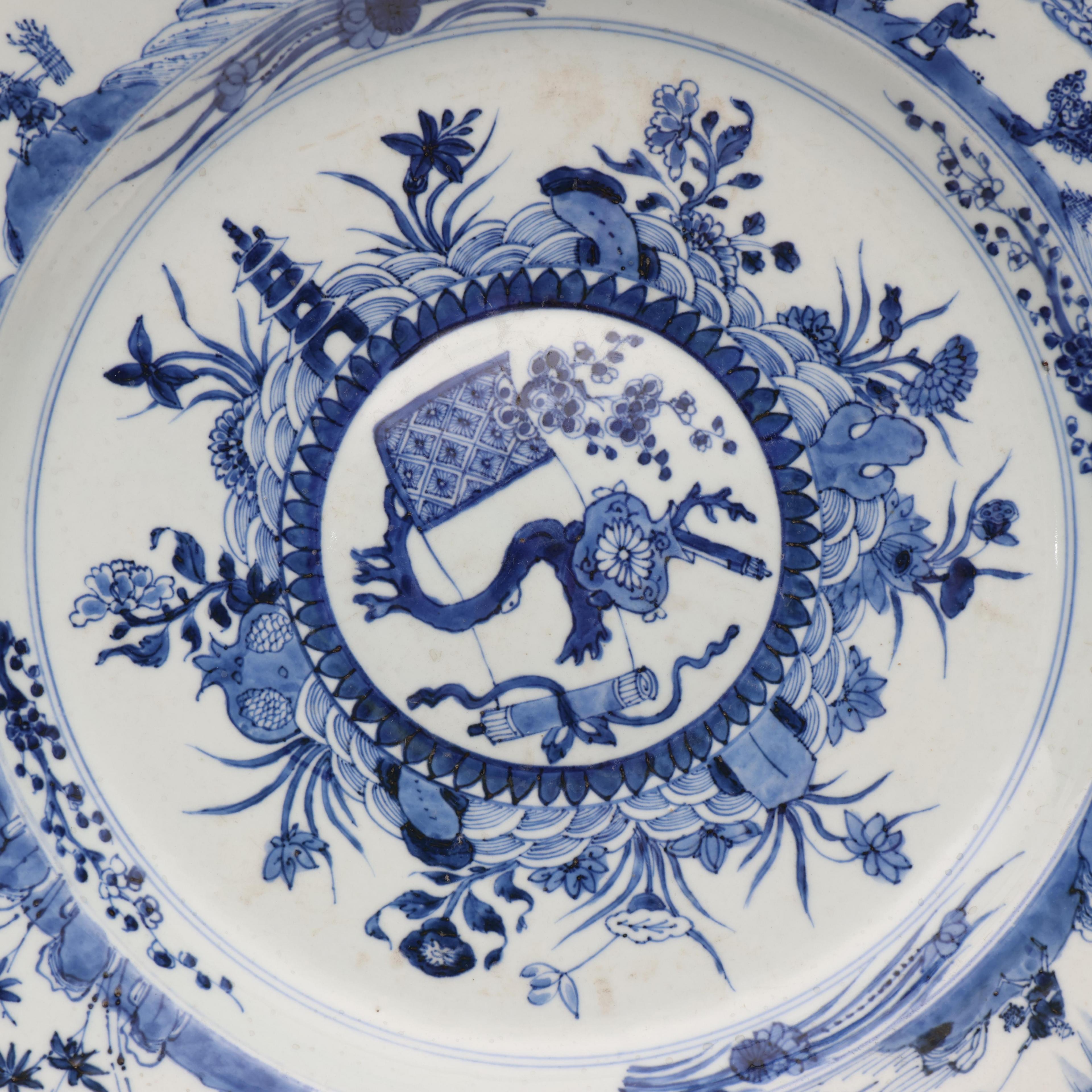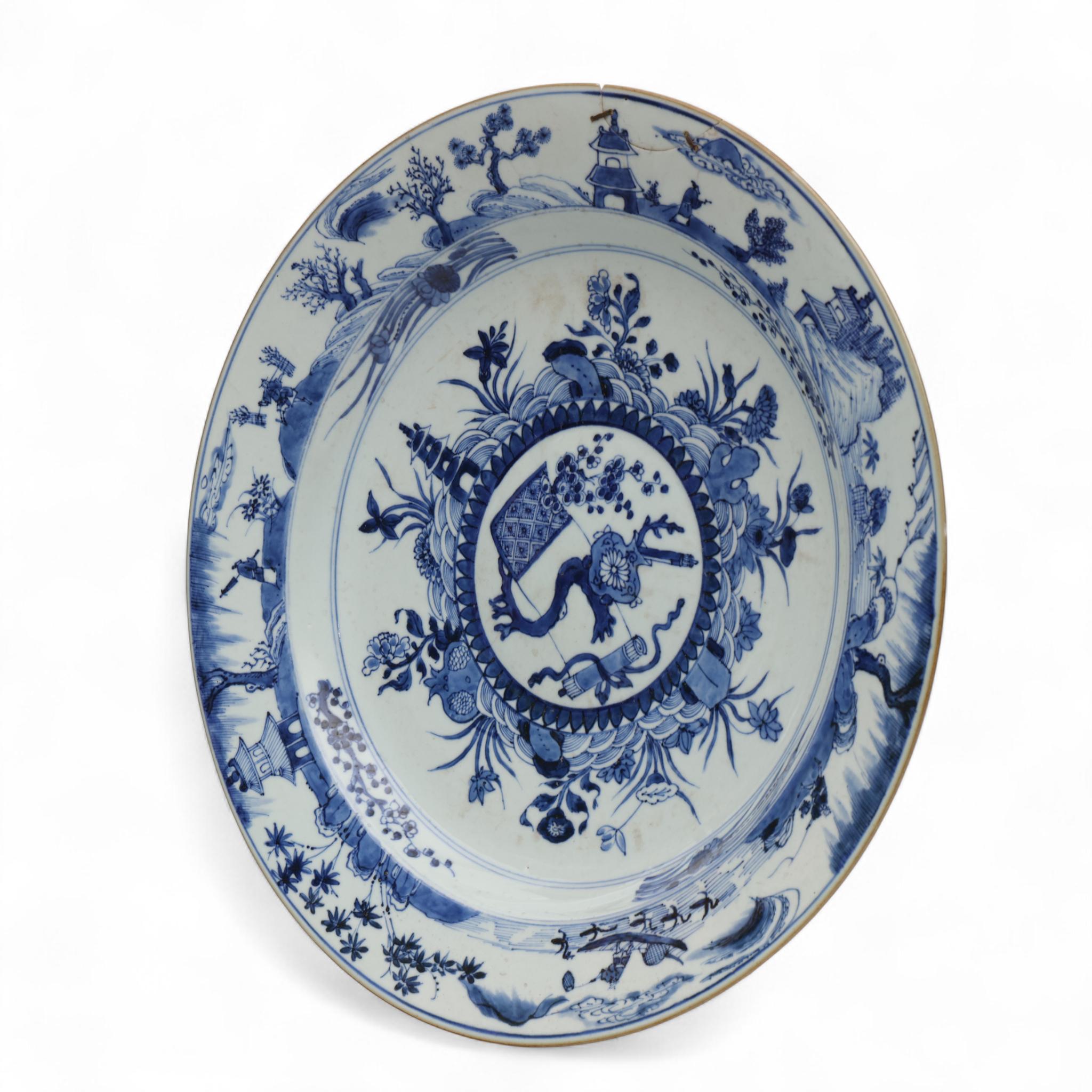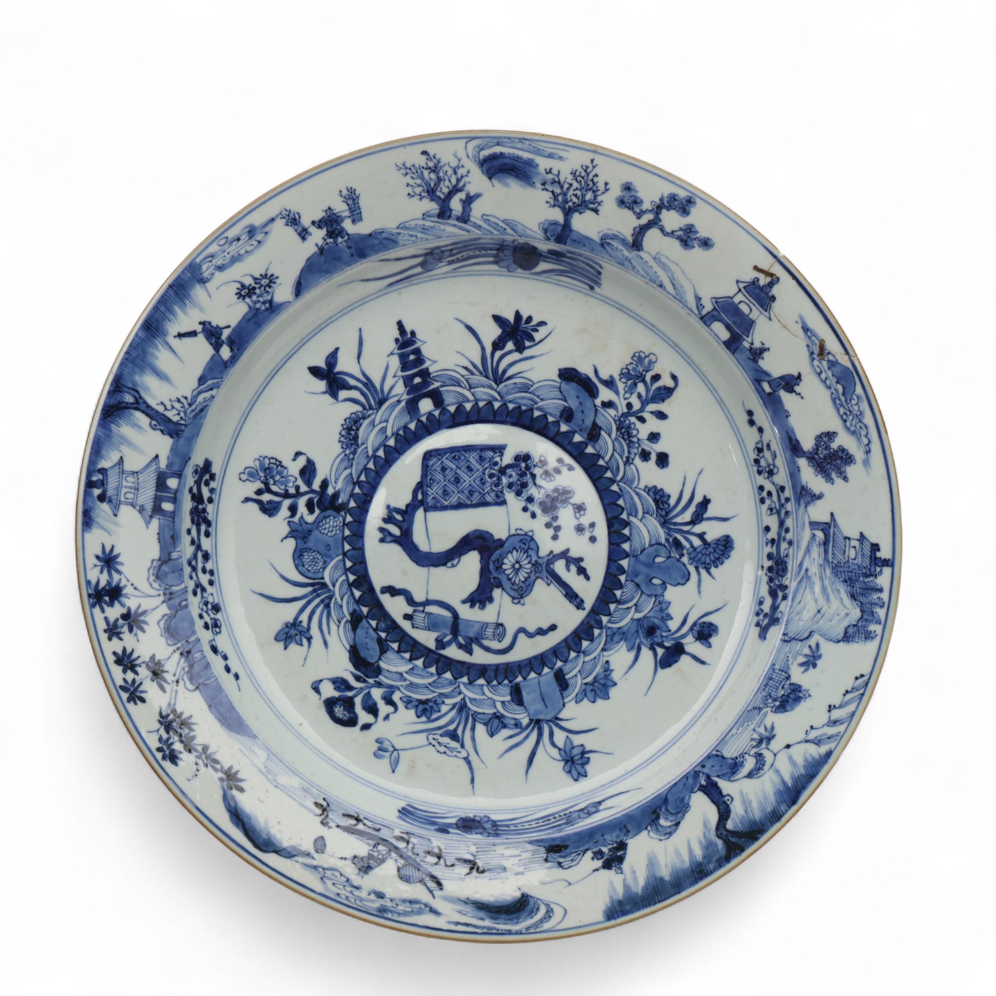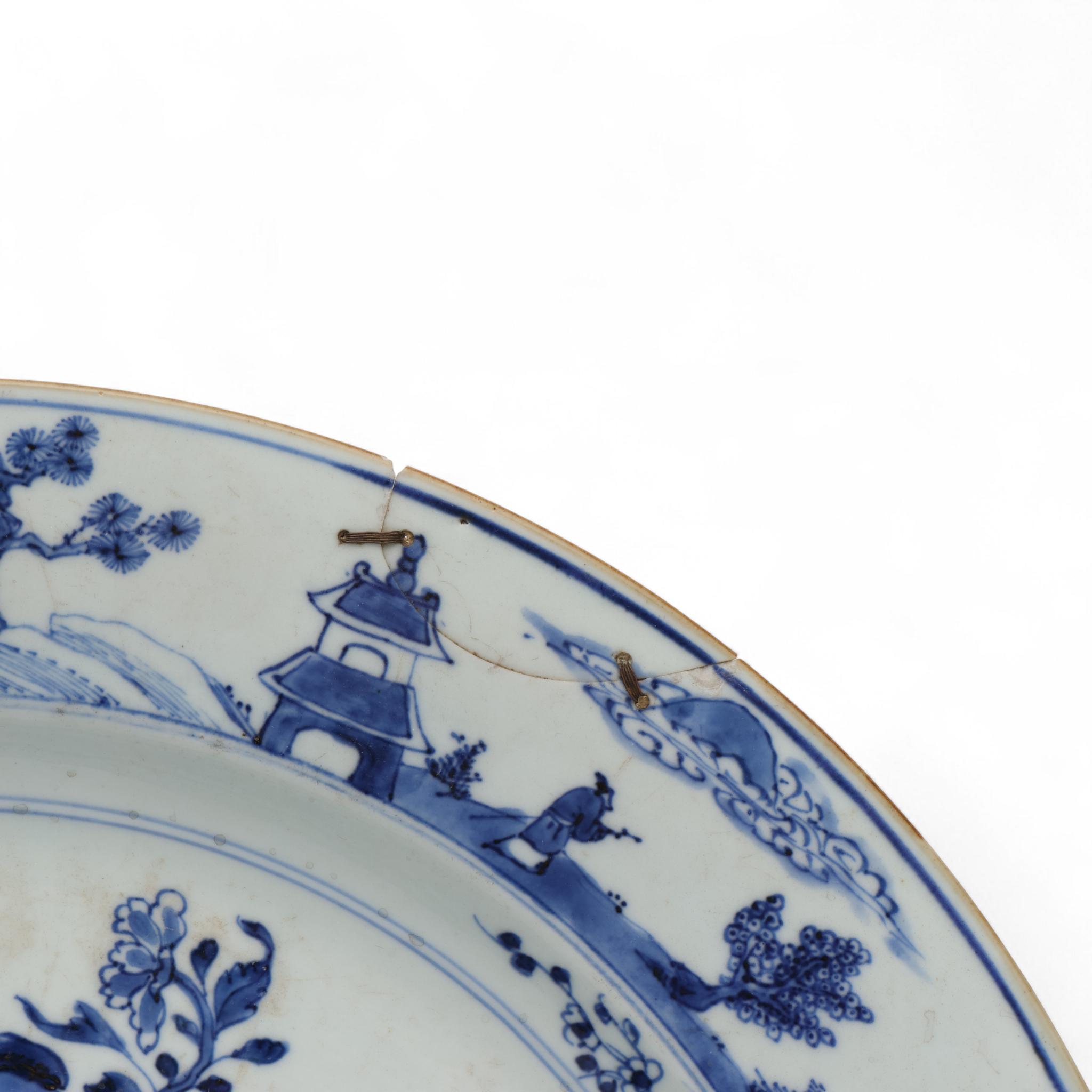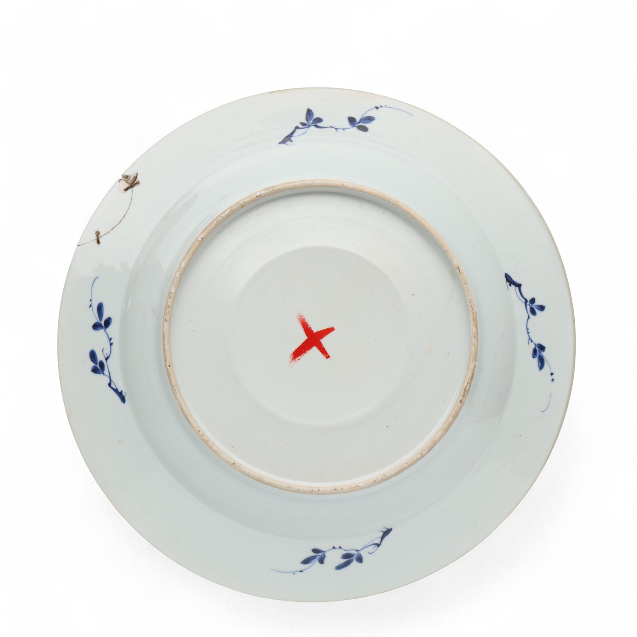 with raised centre painted with flower-vase and scroll painting, surrounded by bands of flowers and fishermen in riverscapes (rim check restored with crams of 6 x 2.5 cm)