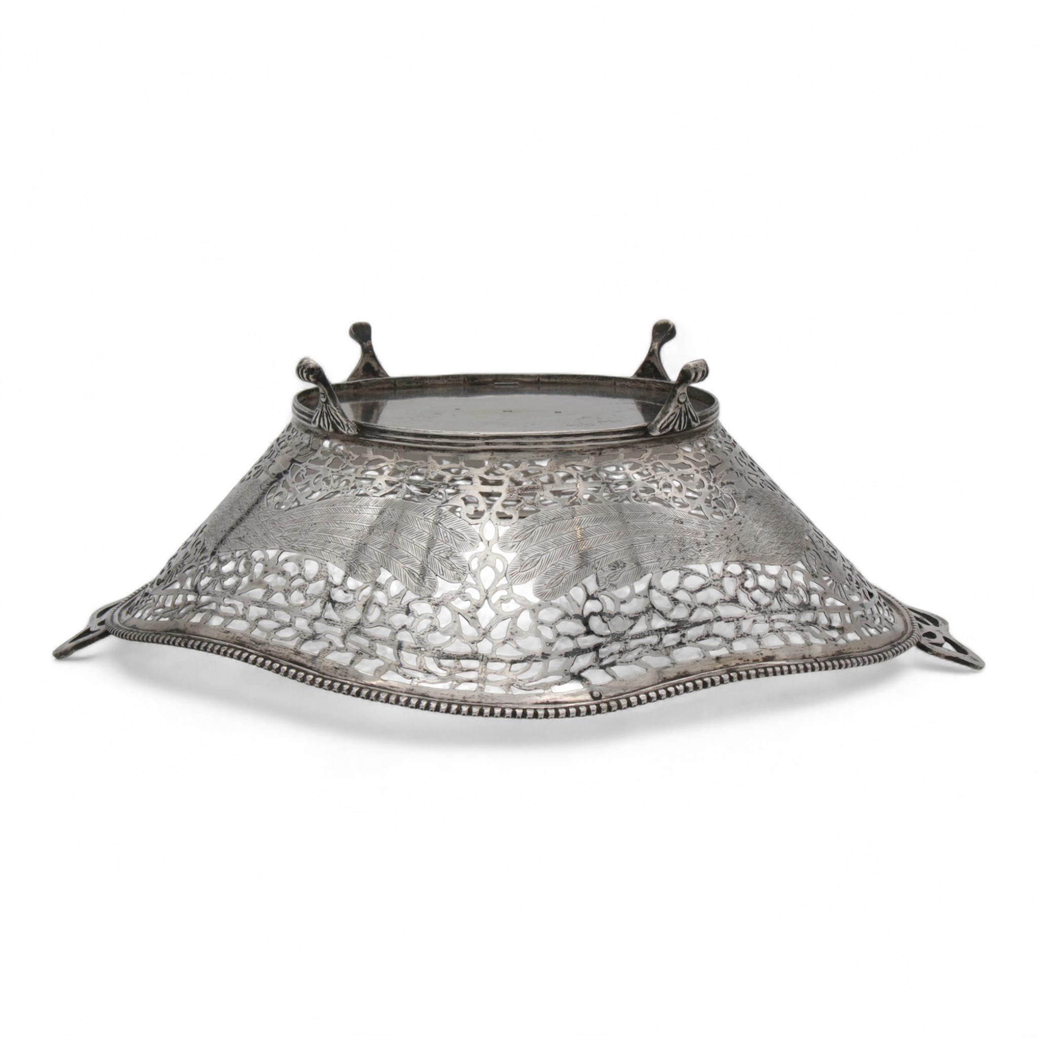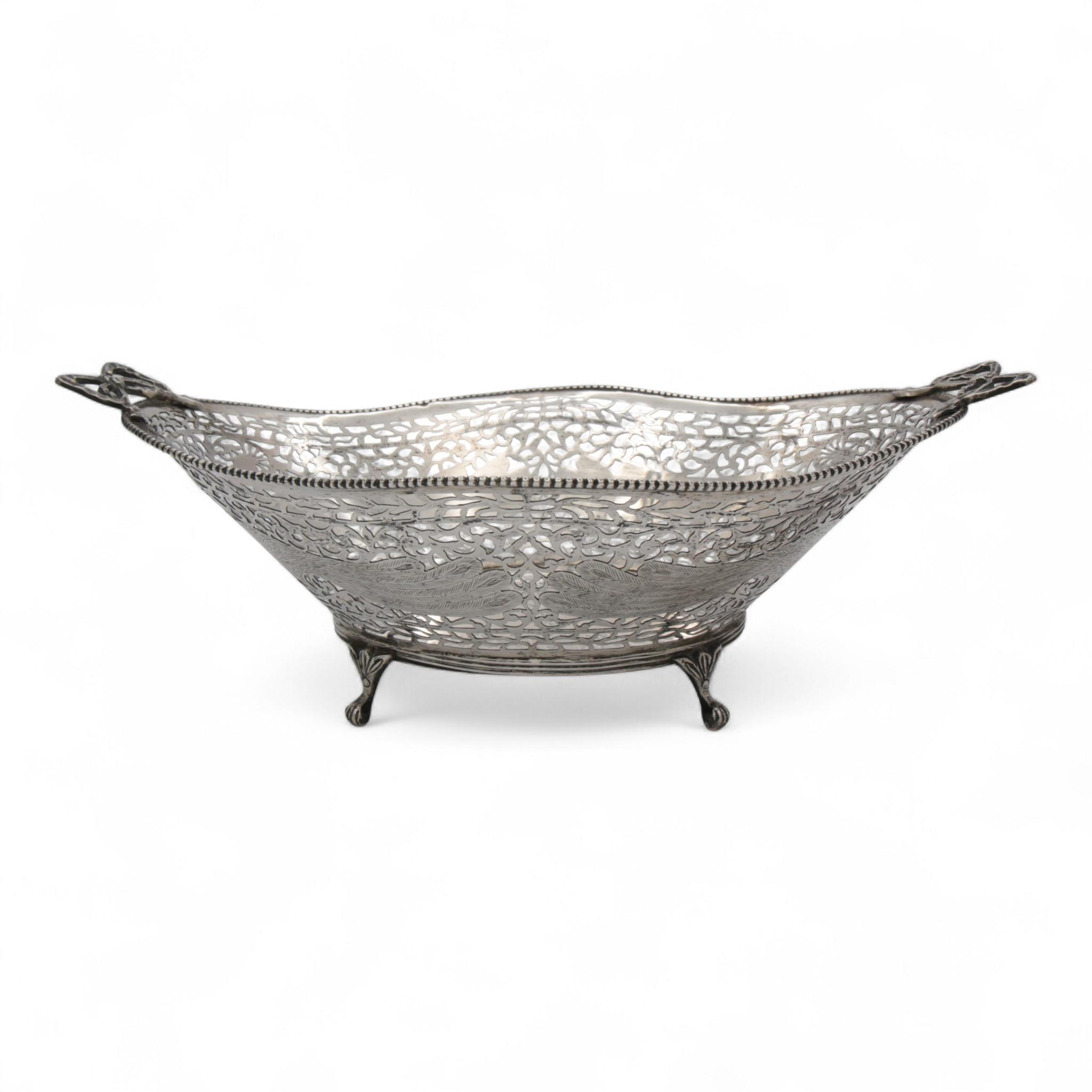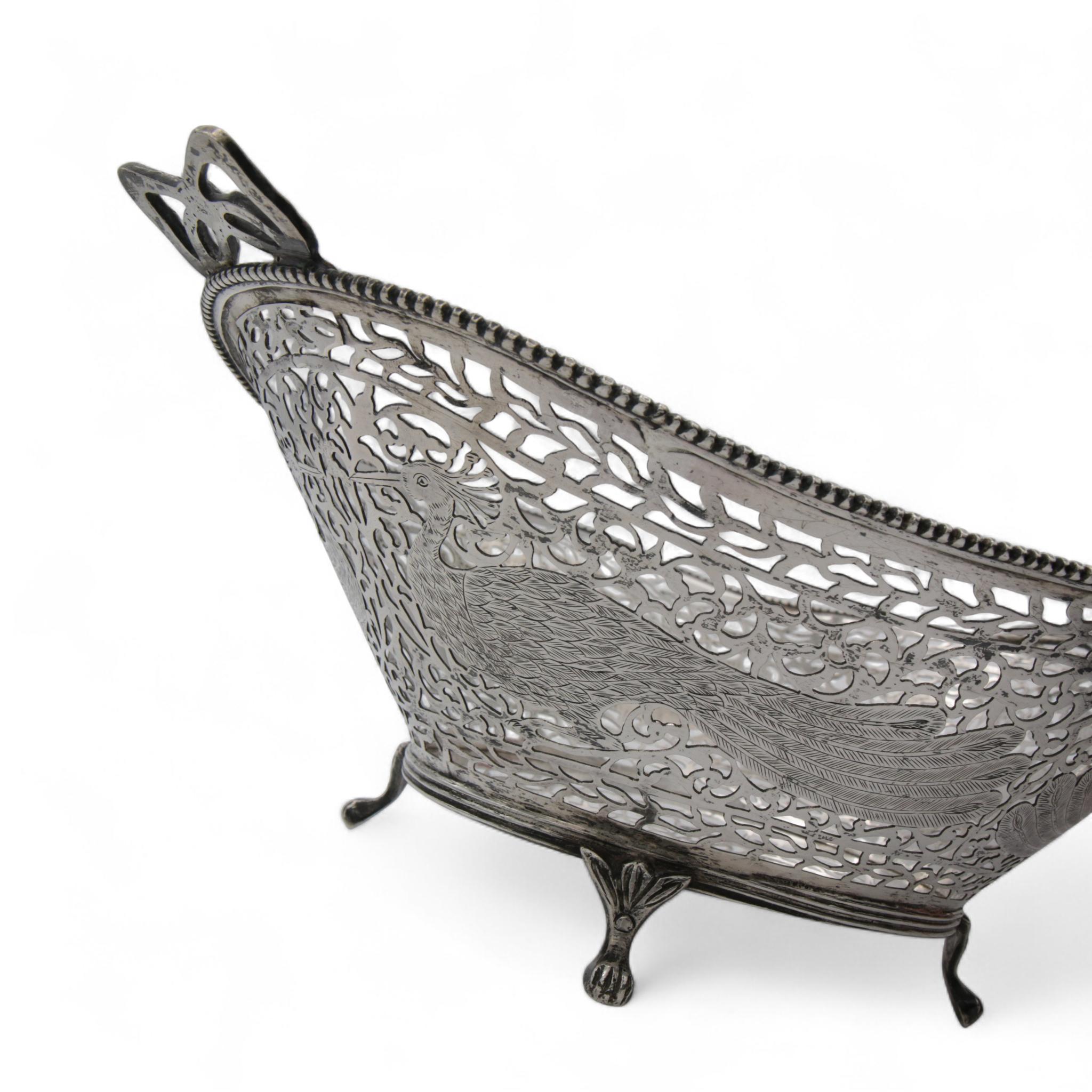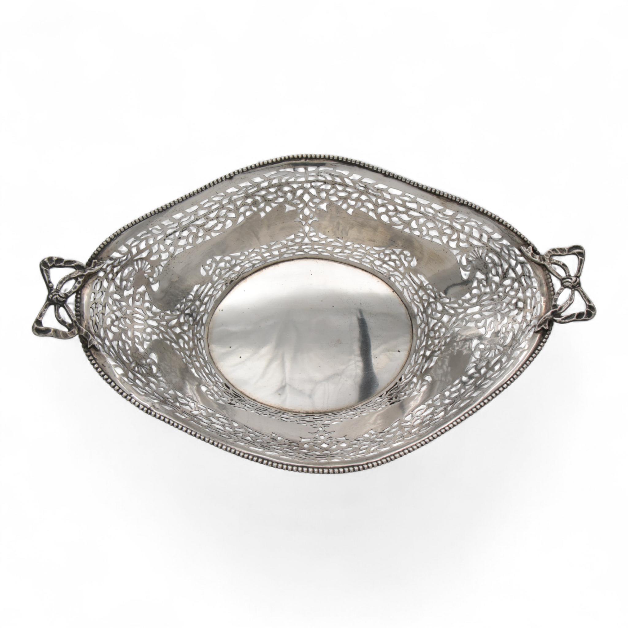 ajour met pauwmotieven, parelrand en strikvormen als grepen, staand op drie klauwvormiige pootjes, mt. J. Postmus Amsterdam/Alphen ad Rijn/Hoorn 1920 2e gehalte,
