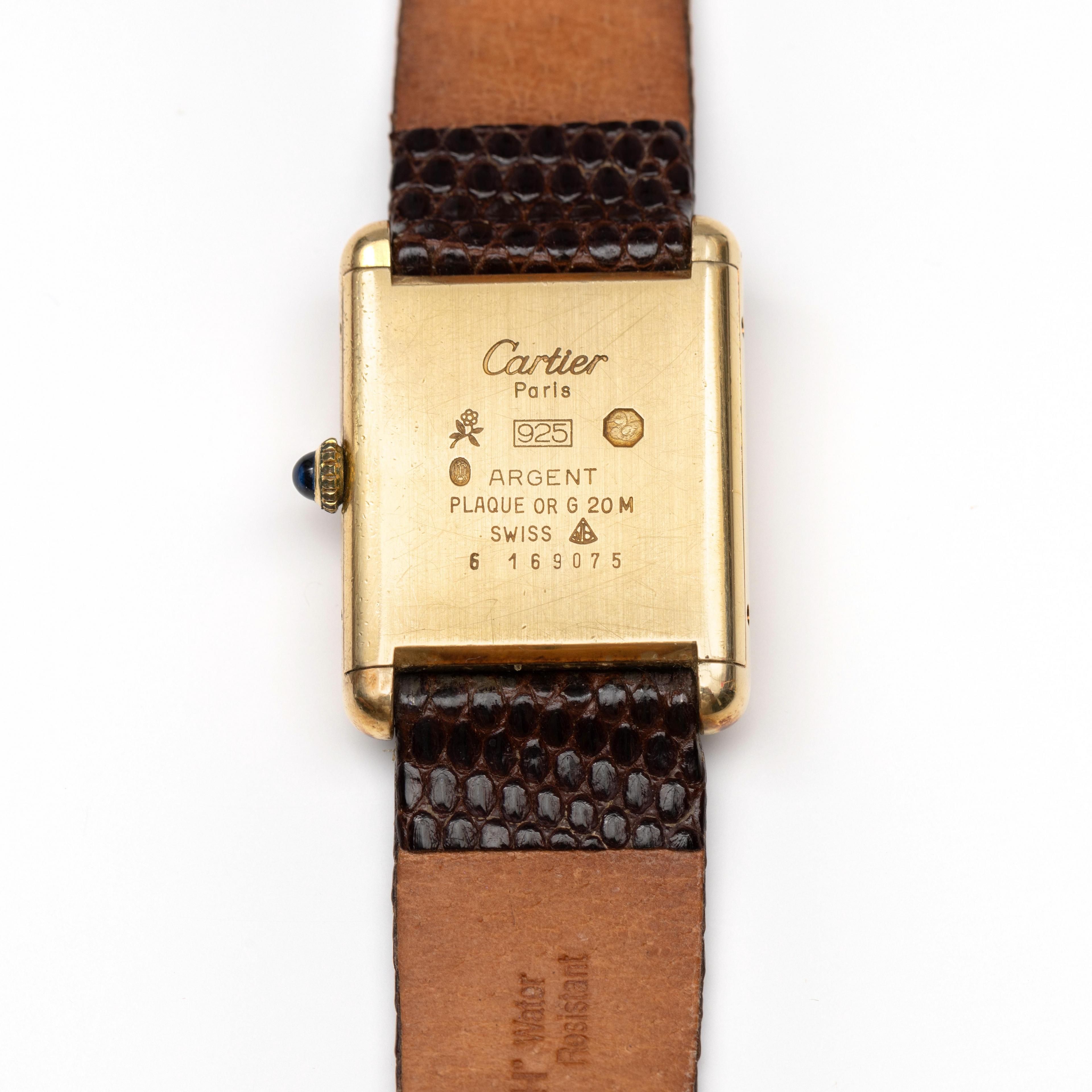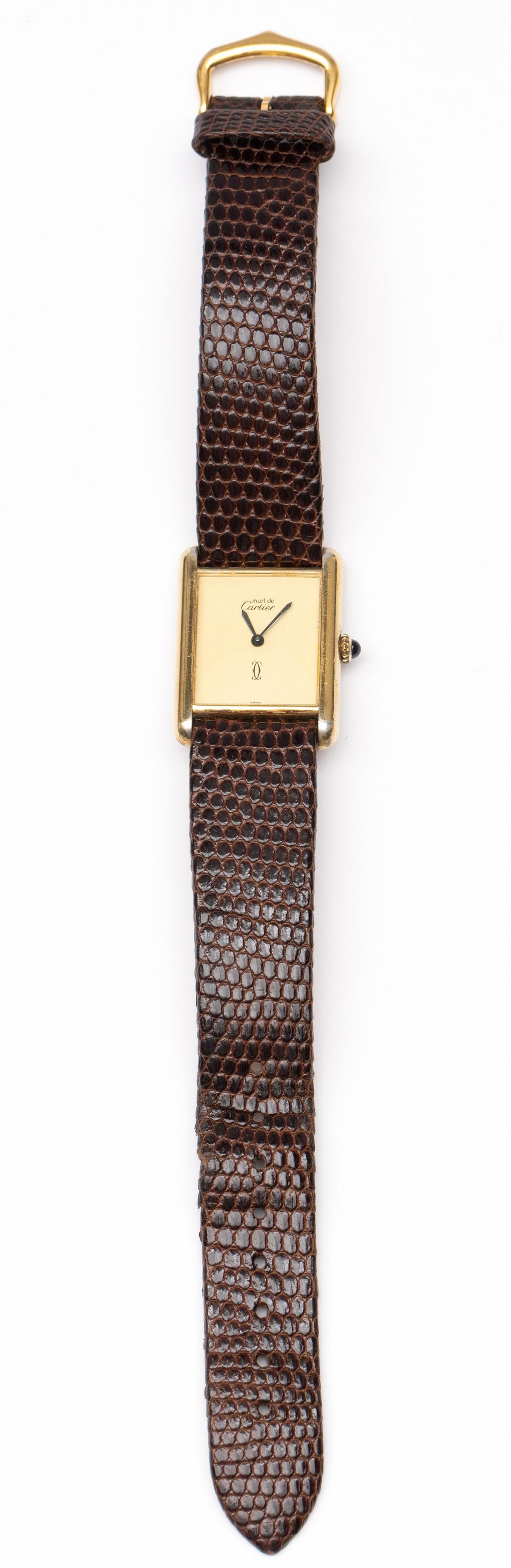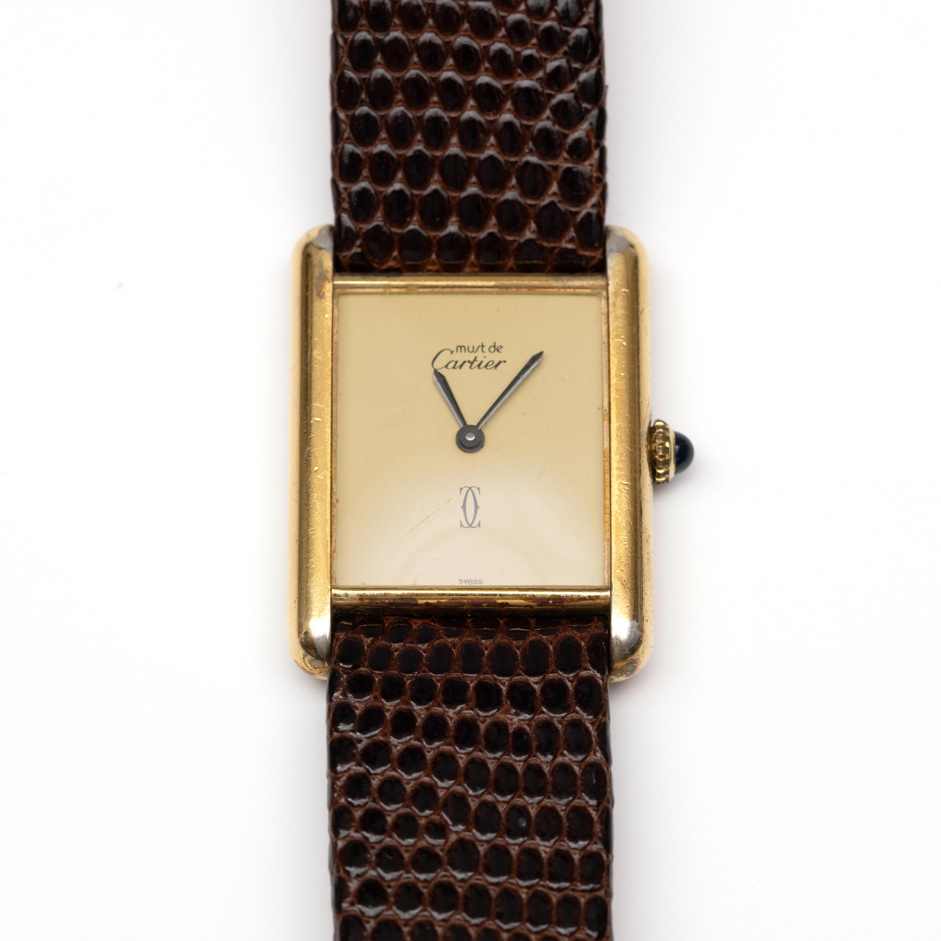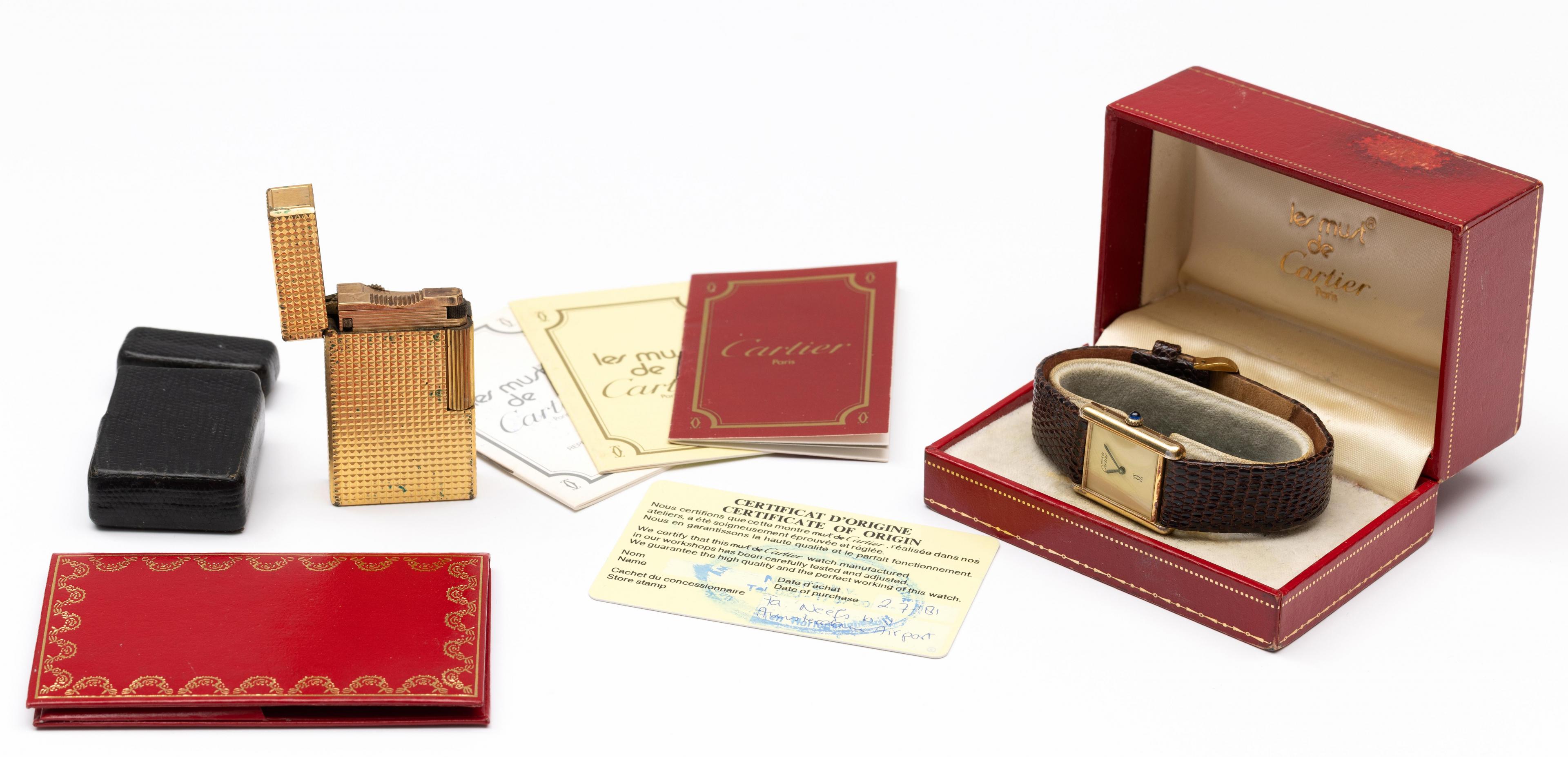 Must de Cartier, gold-plated silver watch. Tank model, manual wind. With a cream-colored dial without hour markers. On a brown leather strap with a double C-clasp. In box, with papers and certificate dated 1981. Also included is a Dupont, double-diamond lighter with a waffle finish, in a leather case.