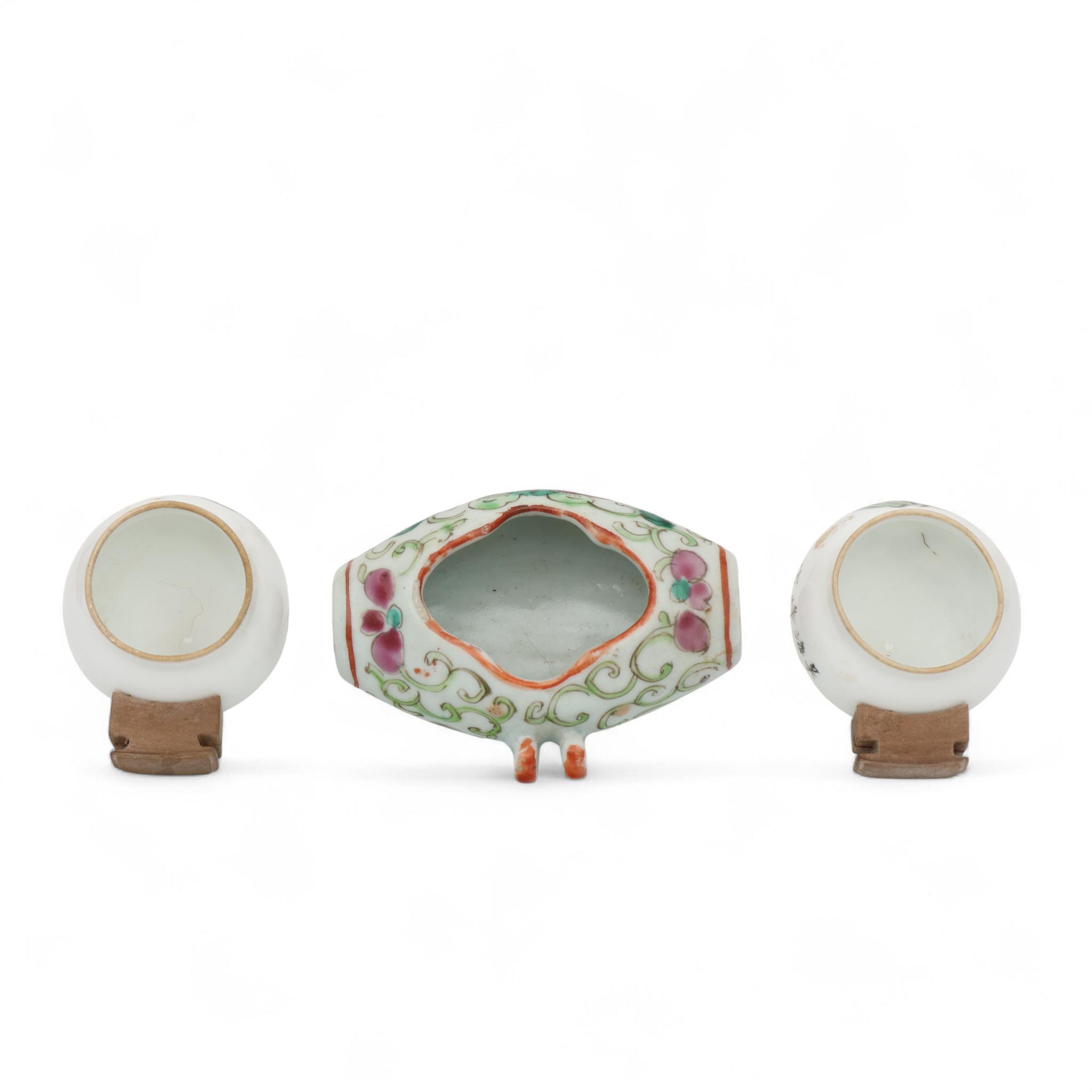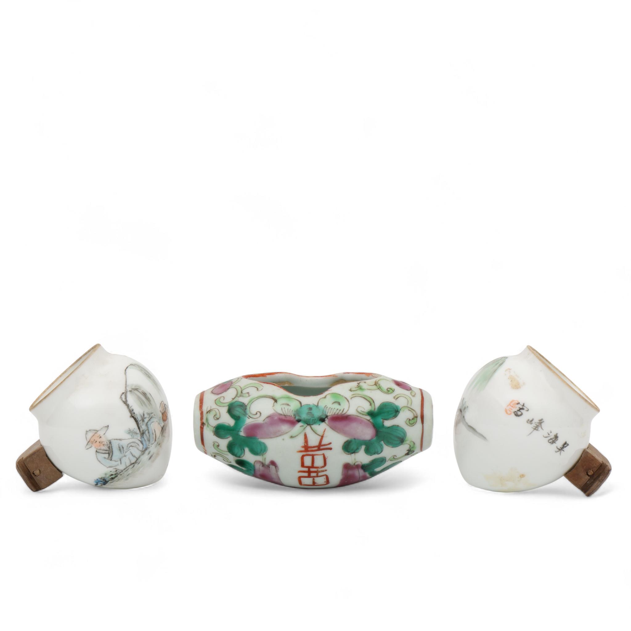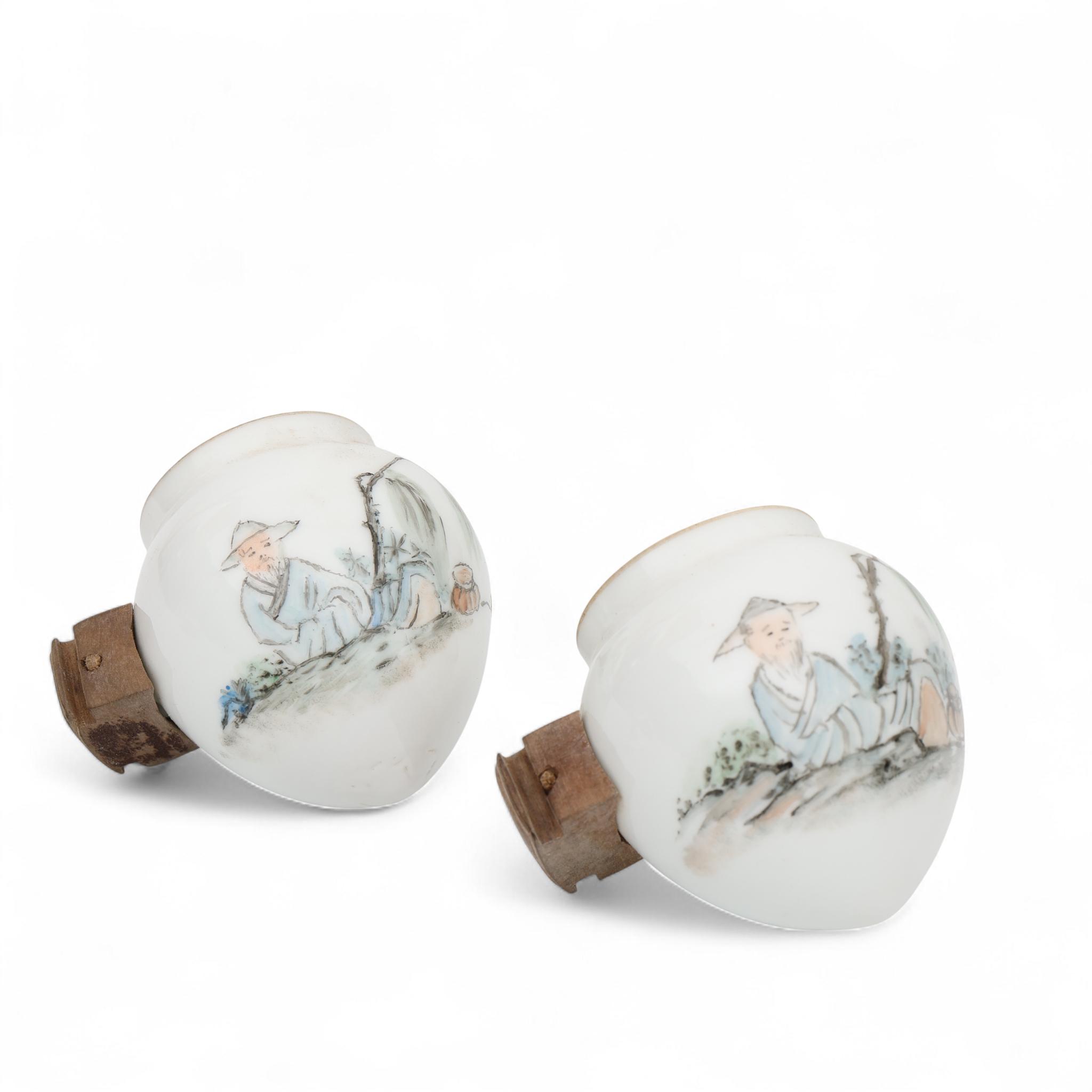 the pair painted with a figure seated in a garden, the single one with stylised flowers, inscribed and with seal marks