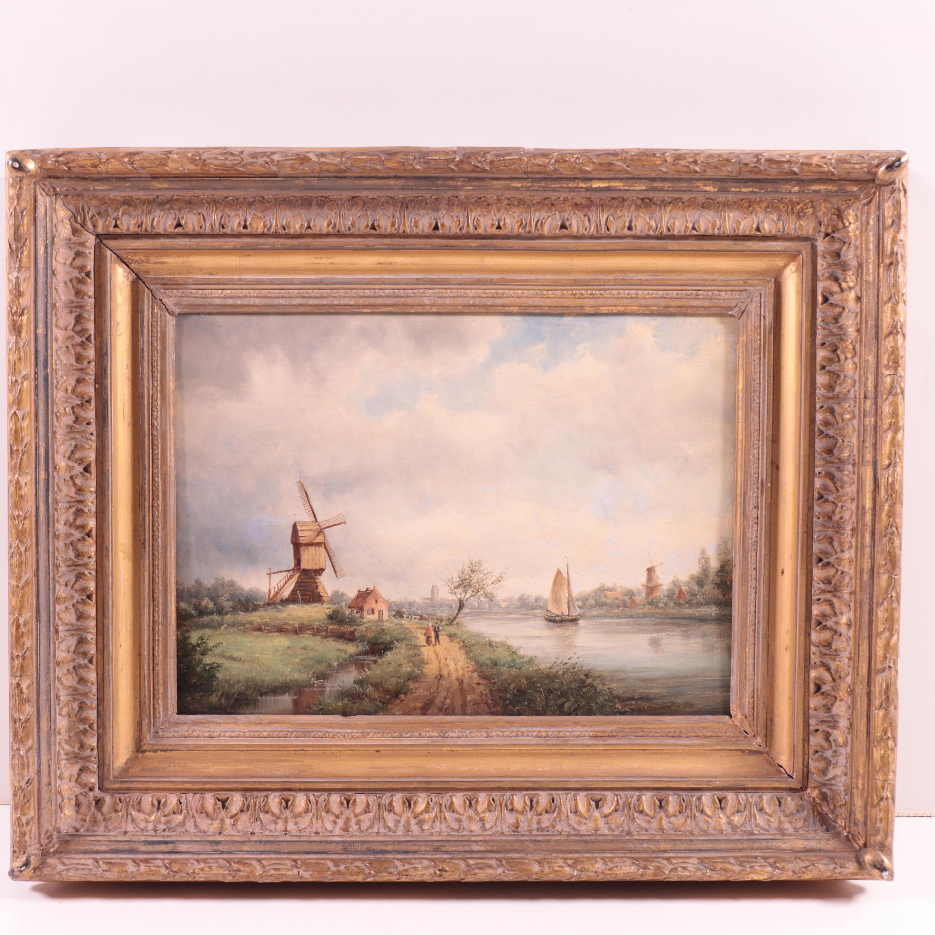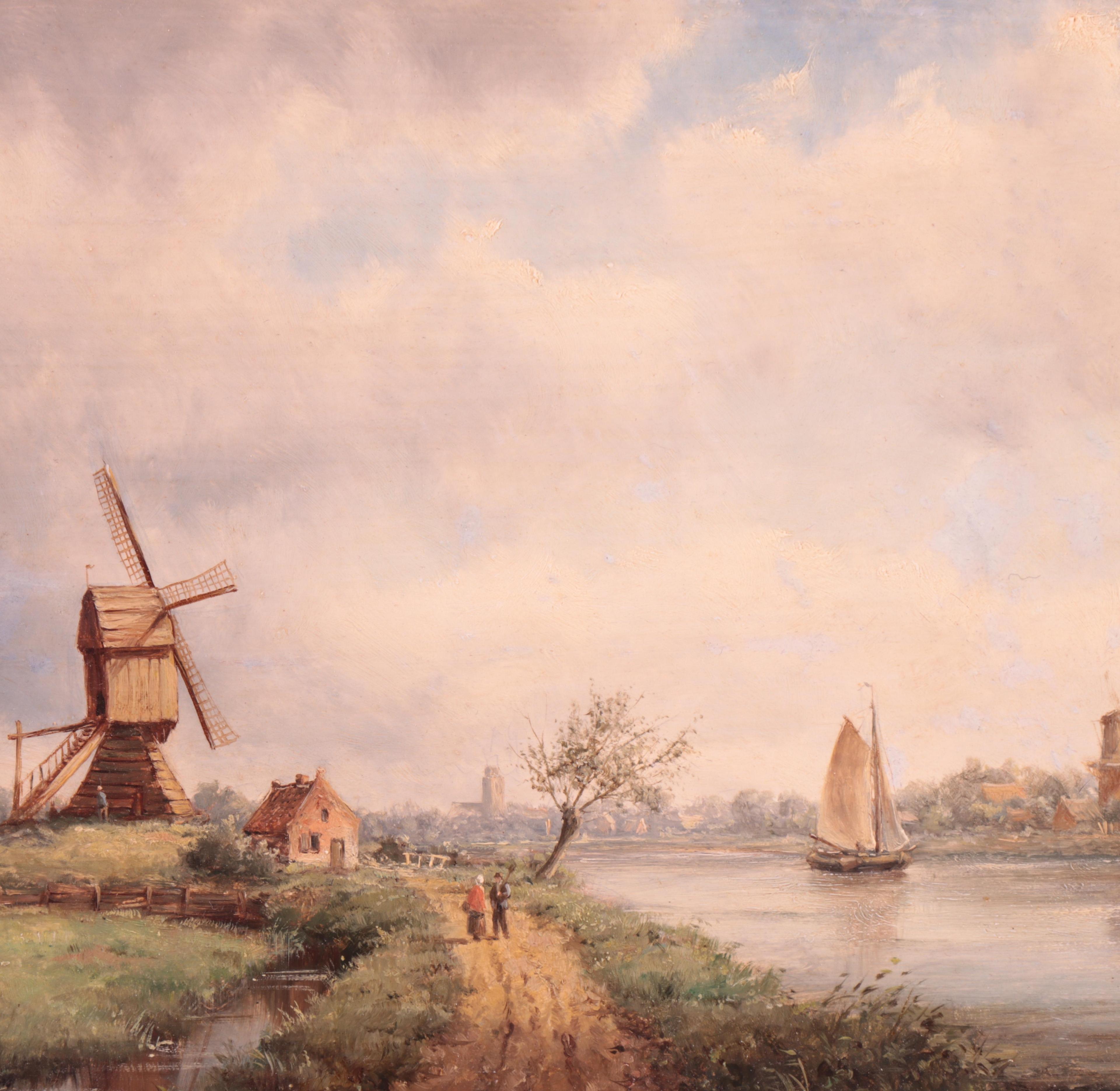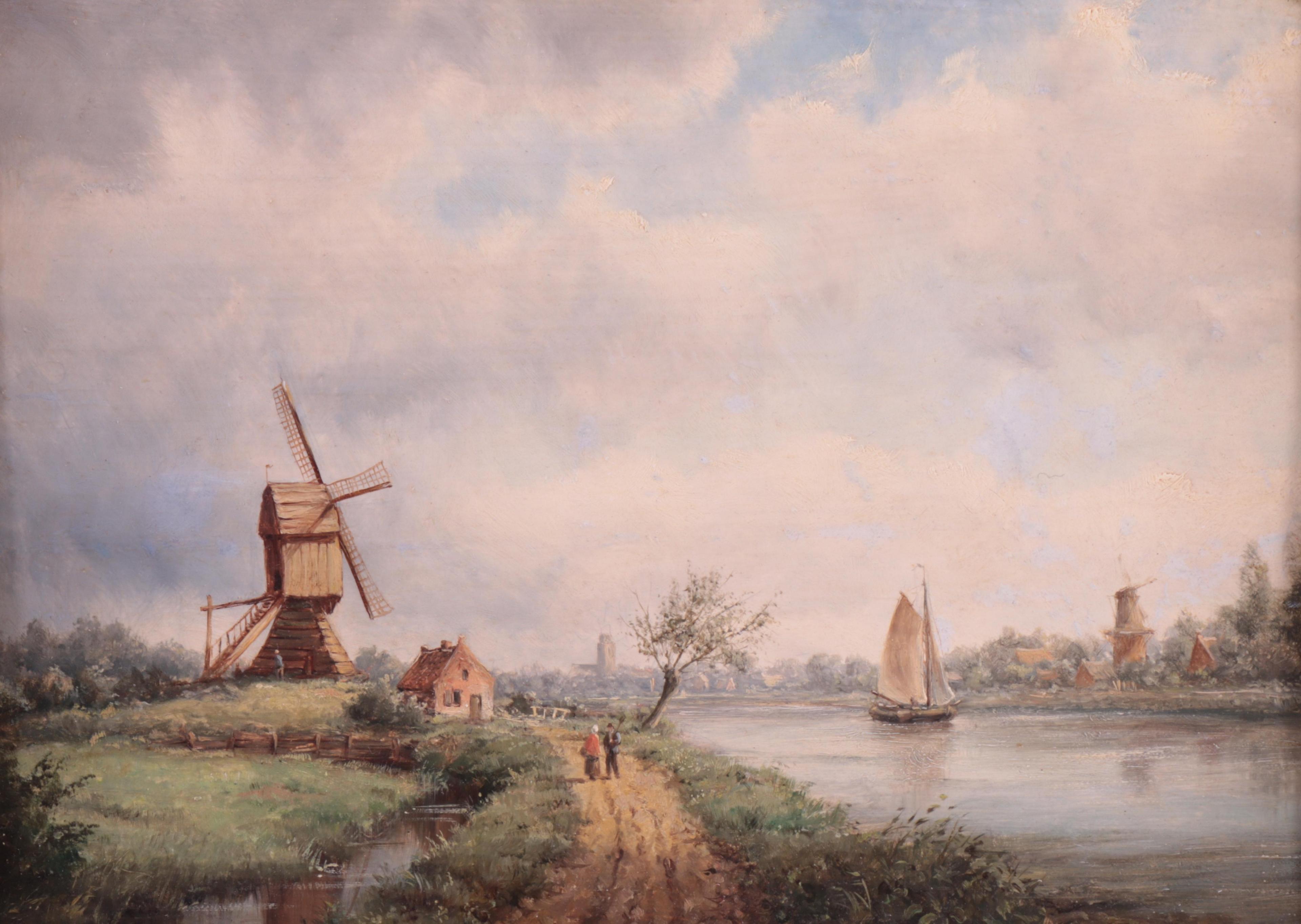 Wandelend paar op een pad bij een vaart en molen
