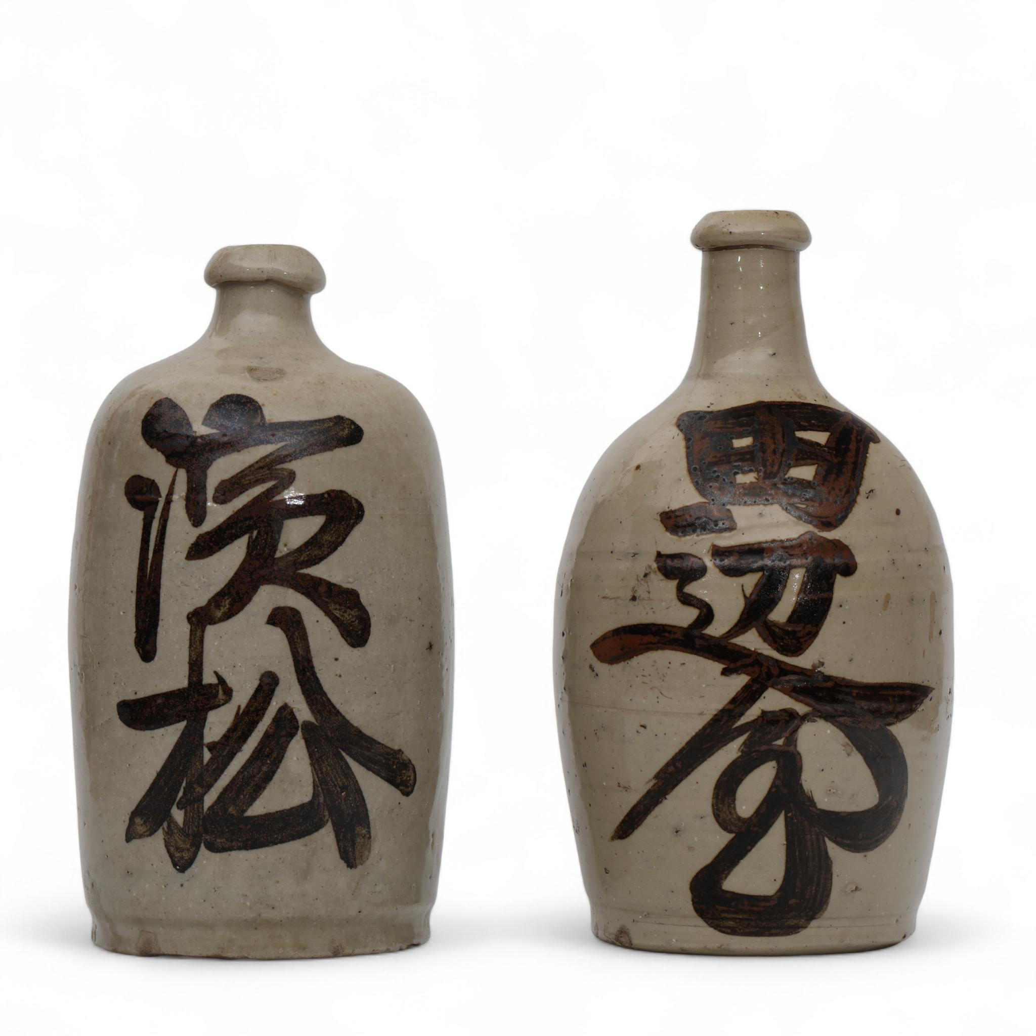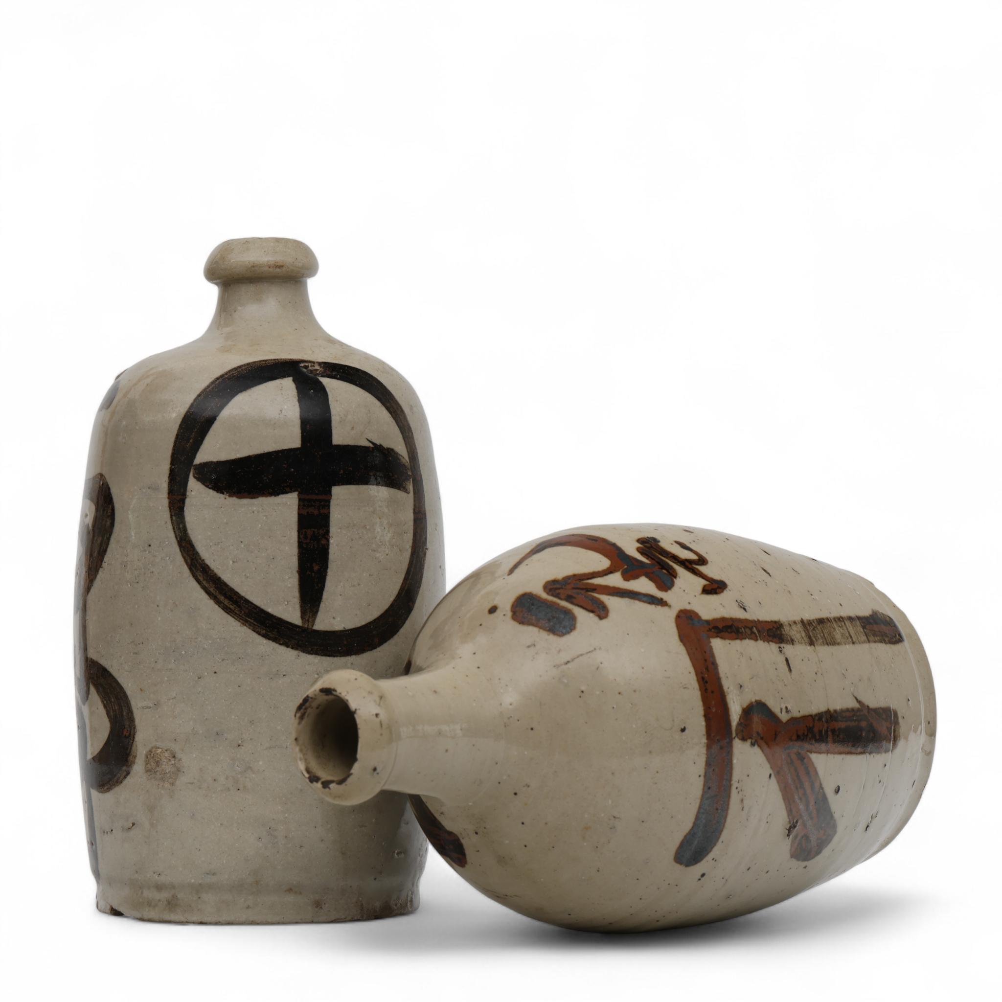 Japan, two inscribed earthenware tokkuri, sake-flasks, ca 1900,