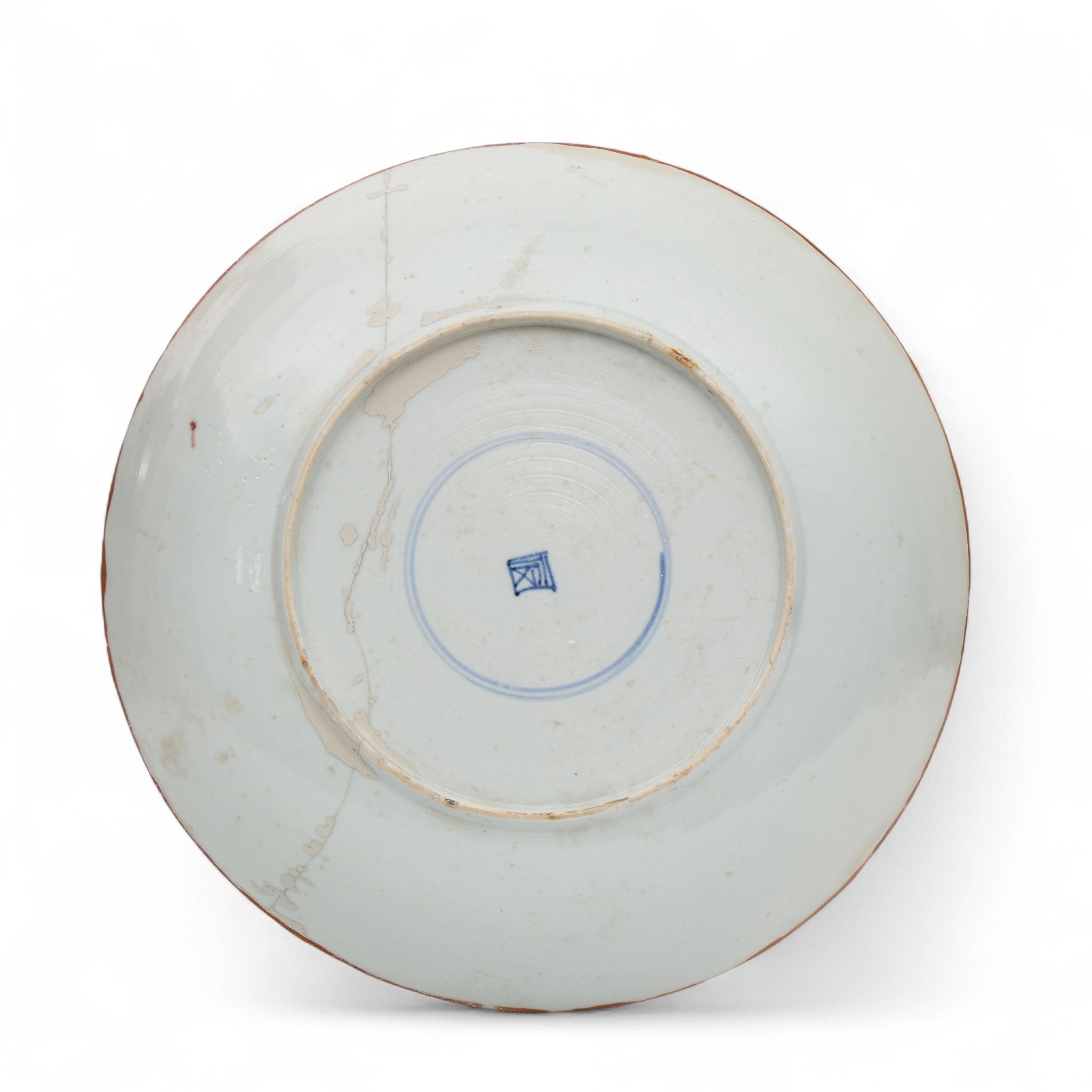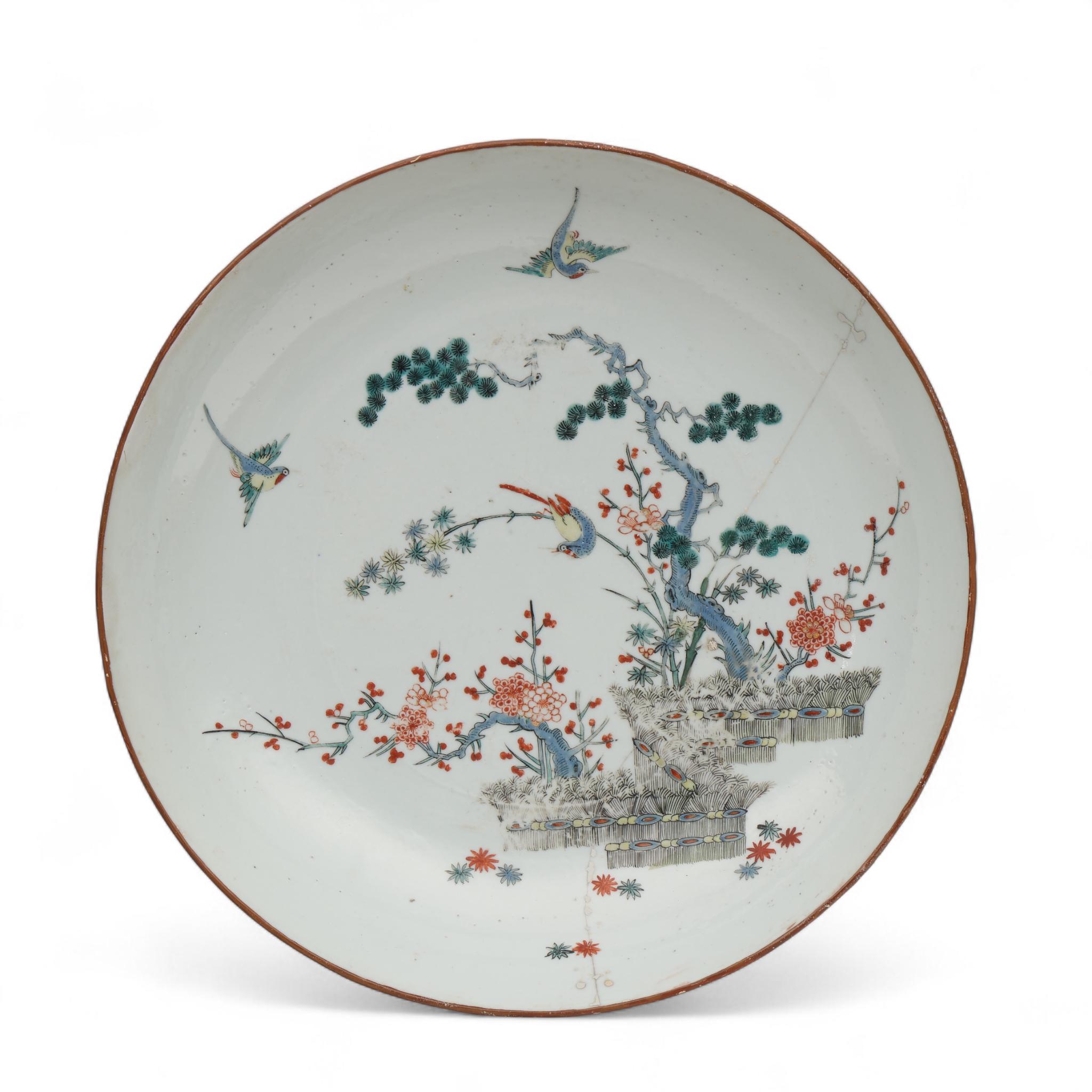 overdecorated in the Japanese Kakiemon style with birds in a garden with pine and prunus (broken and reglued, rim restorations)