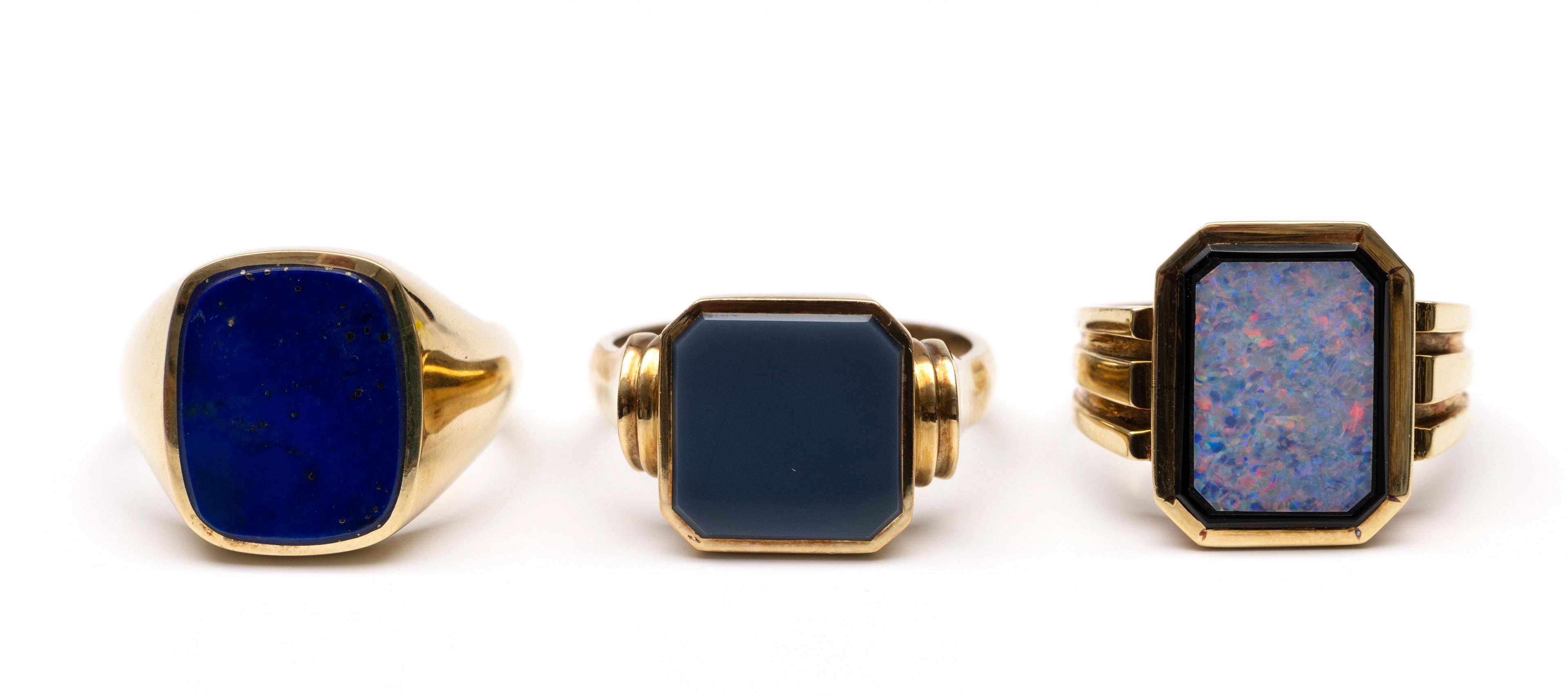 Three 14 k. gold signet rings. One set with an octagonal blue layered stone, one set with lapis lazuli, and one set with an octagonal opal doublet in onyx.