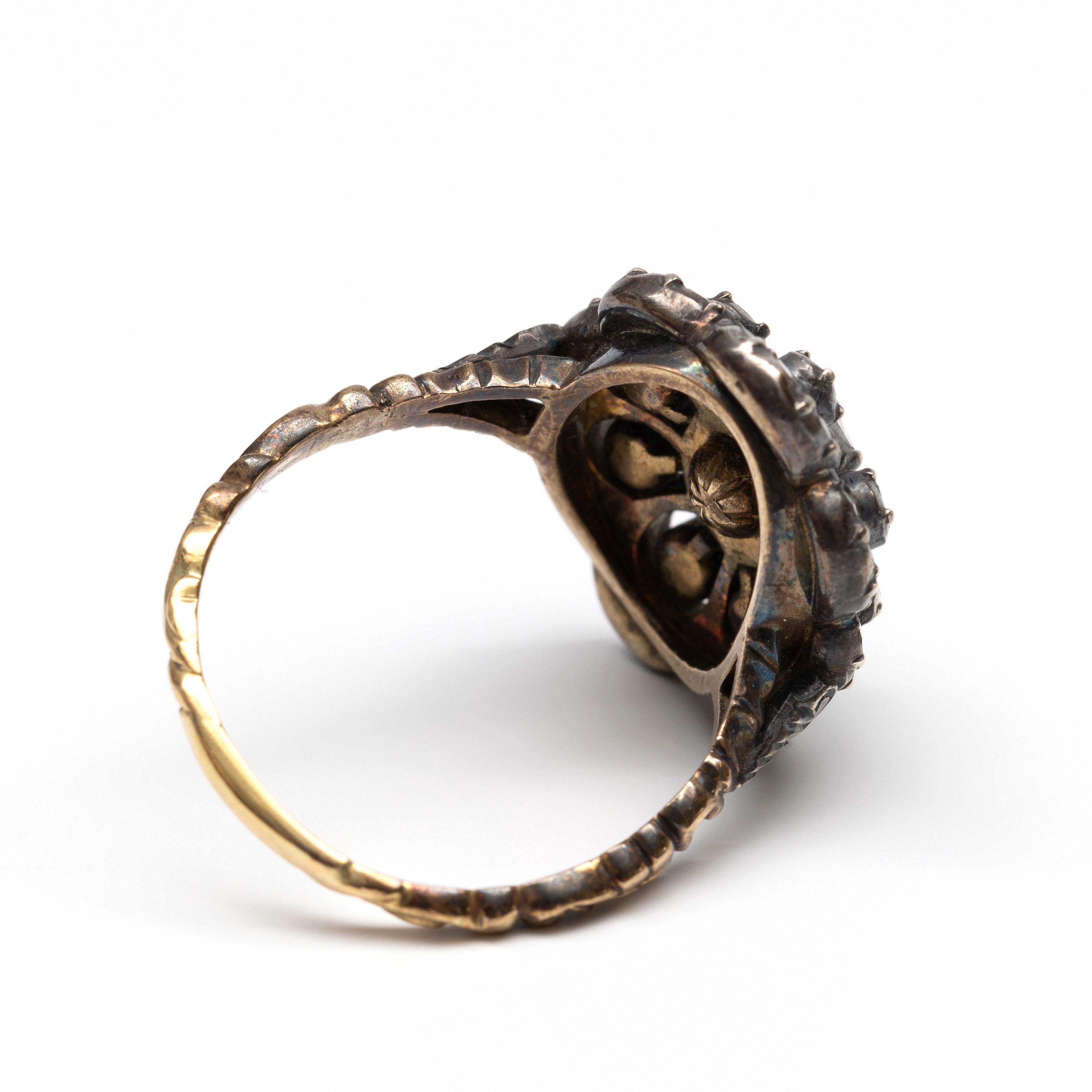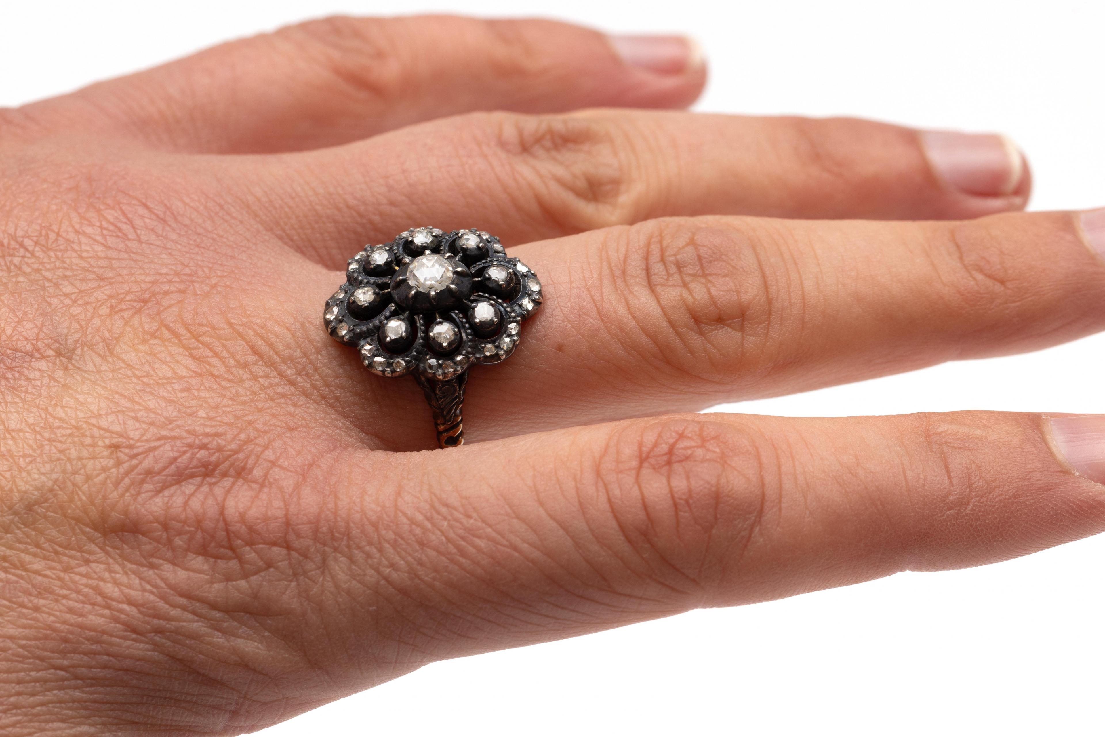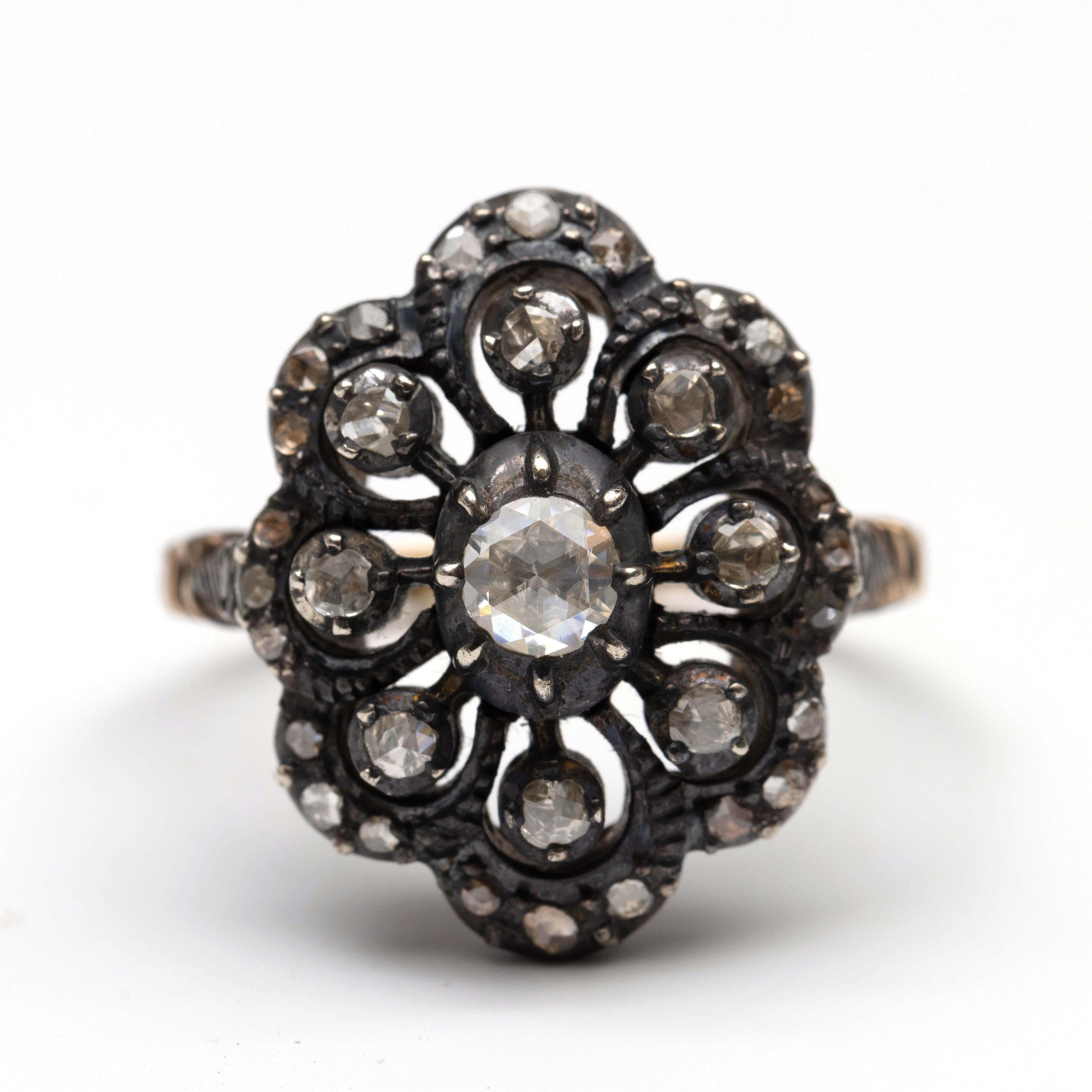 14 k gold and silver ring with an oval, flower-shaped, openwork top, set with rose-cut diamonds, the central stone has a diameter of approx. 4.5 mm.
