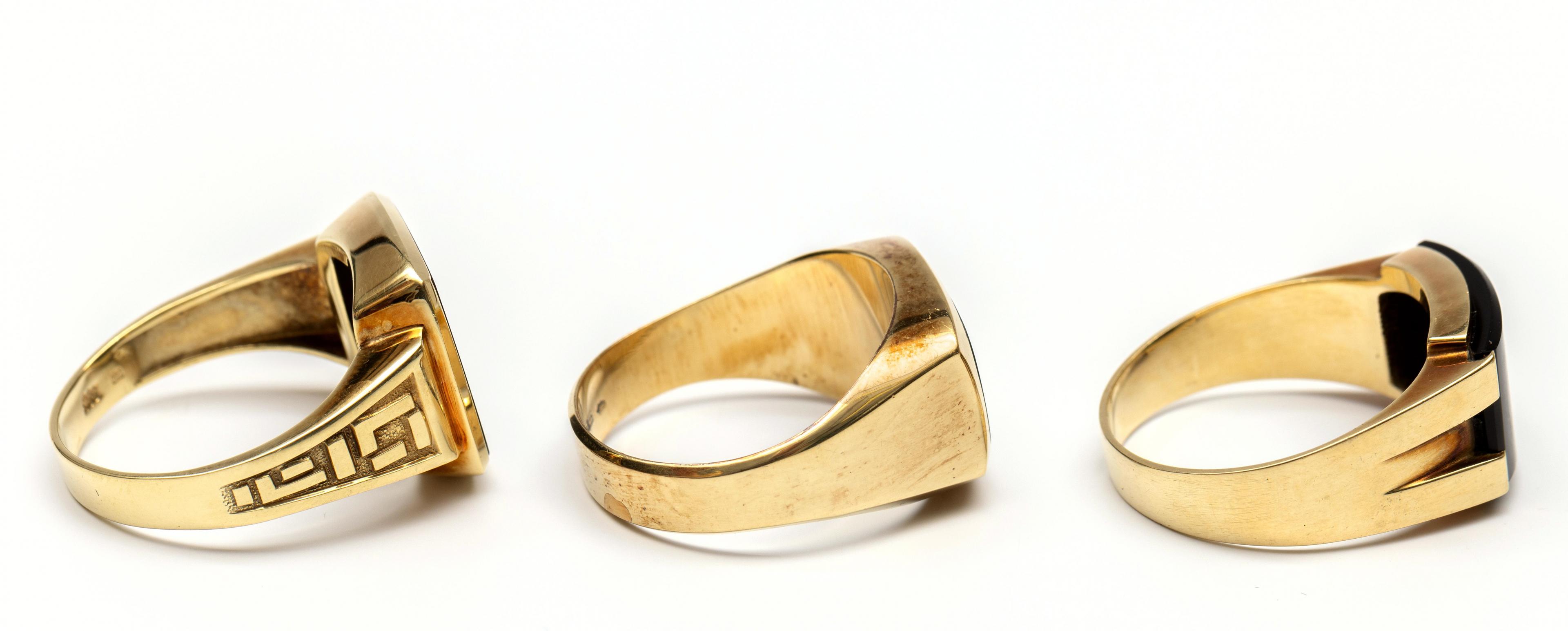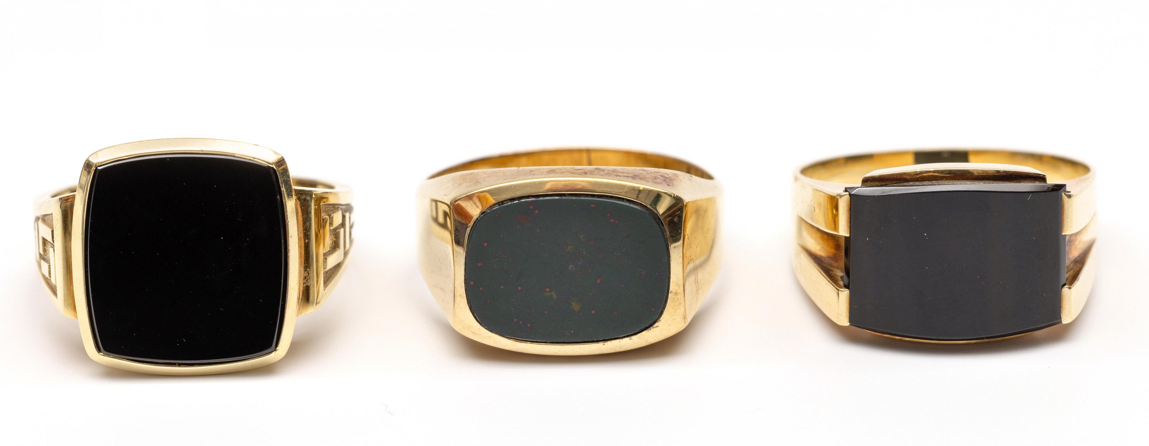 Two 14 k. gold signet rings. One set with a heliotrope, the other with onyx, the shoulders decorated with a geometric pattern. Herewith a 14k. gold men's ring set with onyx.