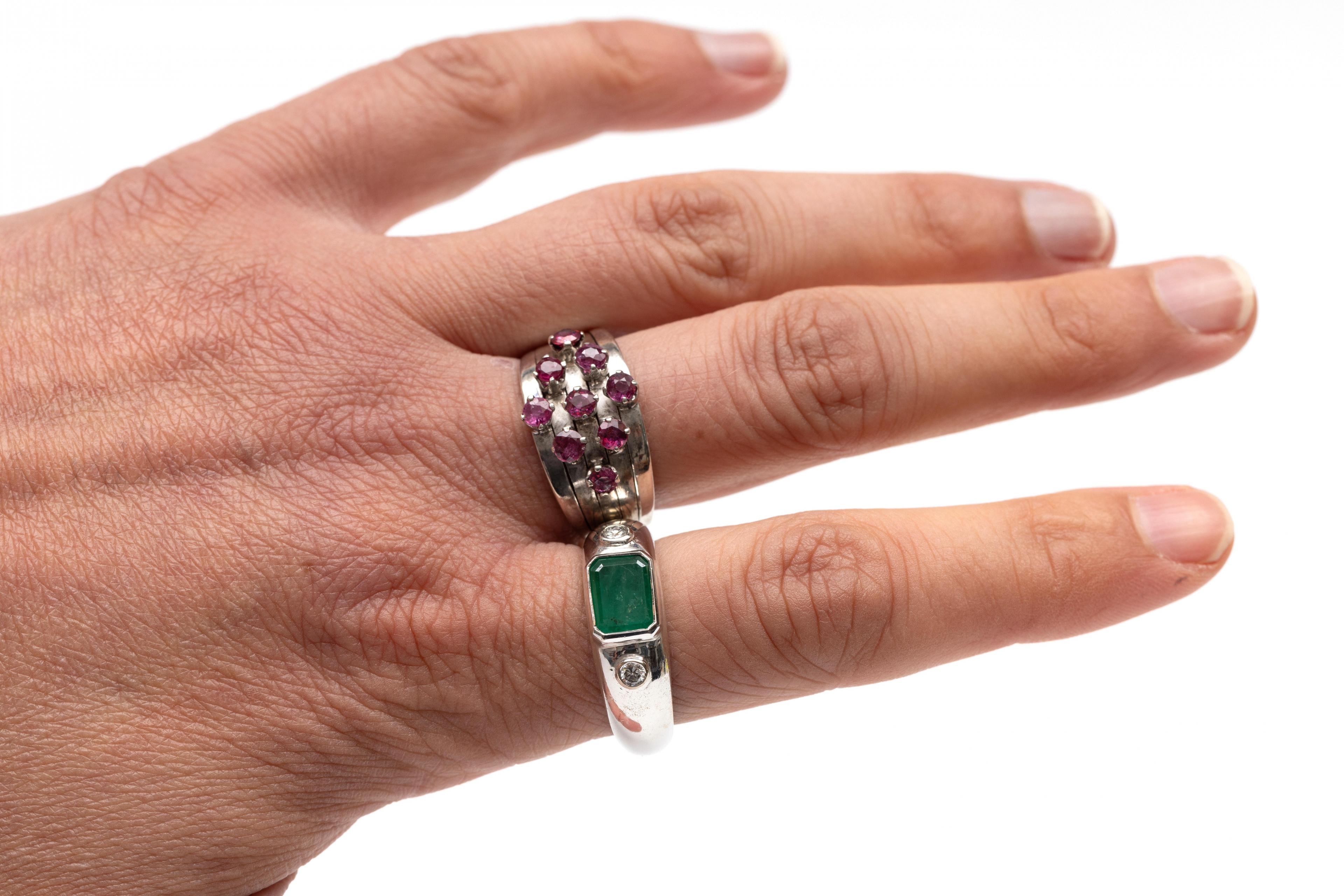 14 k. white gold ring, centrally set with an emerald-cut emerald (approx. 6 x 8 mm) with a brilliant-cut diamond of approx. 0.05 ct each on either side. Herewith a silver ring set with pink stones, set in a diamond shape.