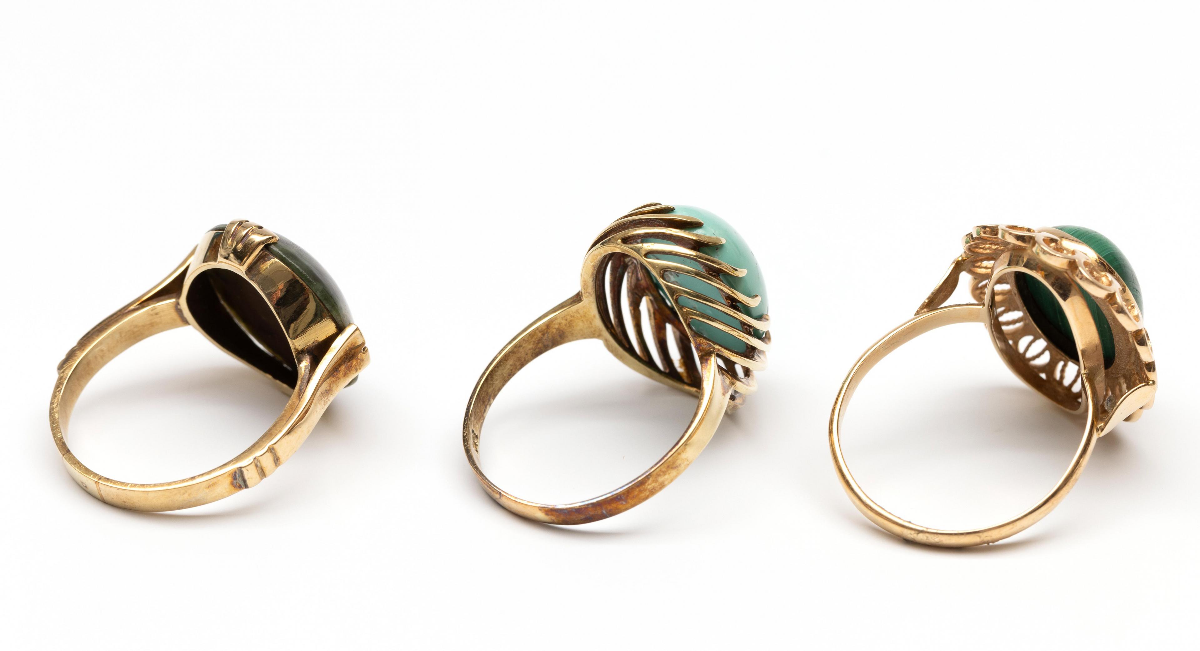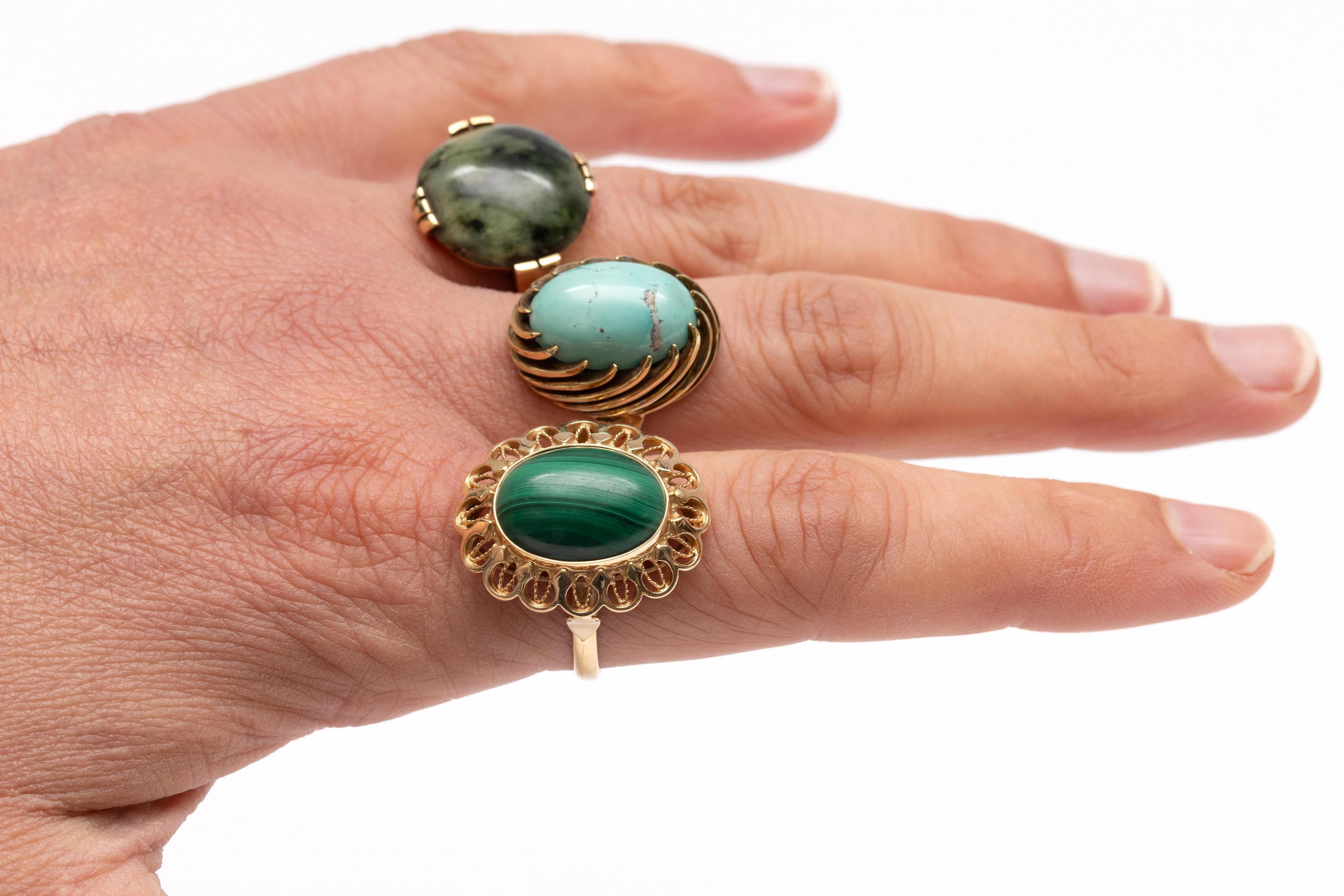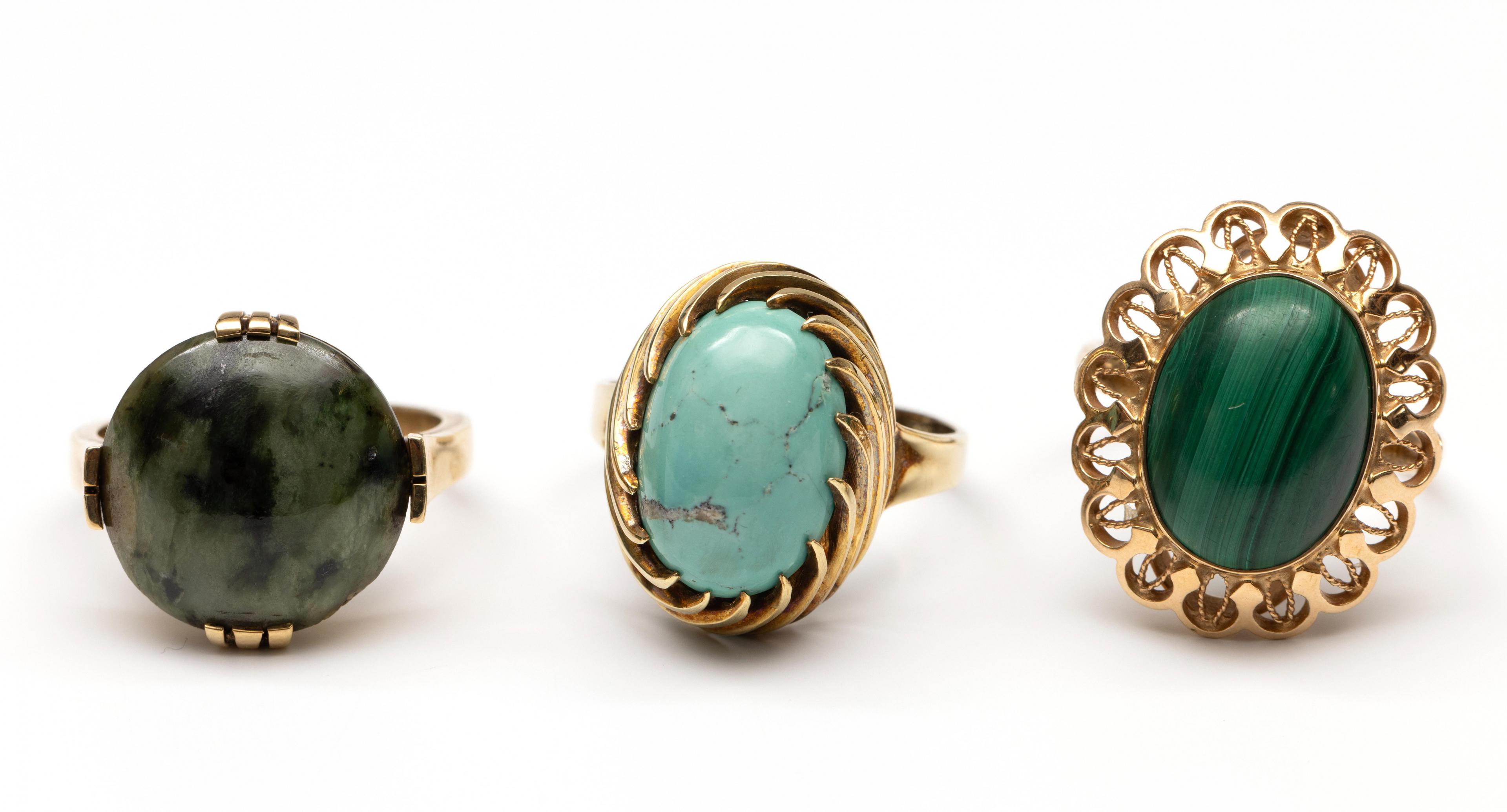 Three 14 k. gold rings. One set with a round cabochon-cut nephrite (approx. 17 mm in diameter), one with an oval cabochon-cut turquoise (approx. 16 x 11 mm), and one with a cabochon-cut malachite (approx. 15.5 x 11.5 mm).