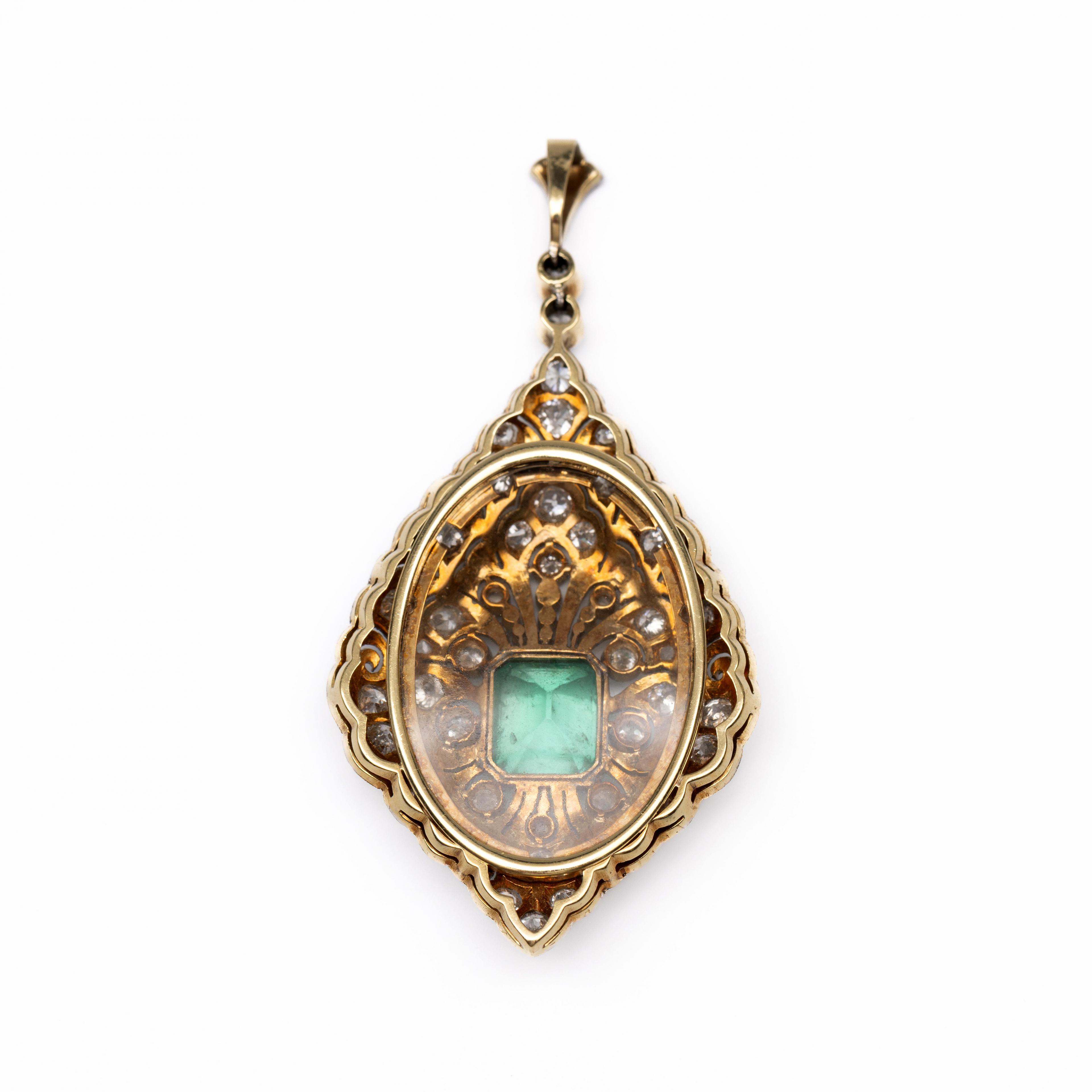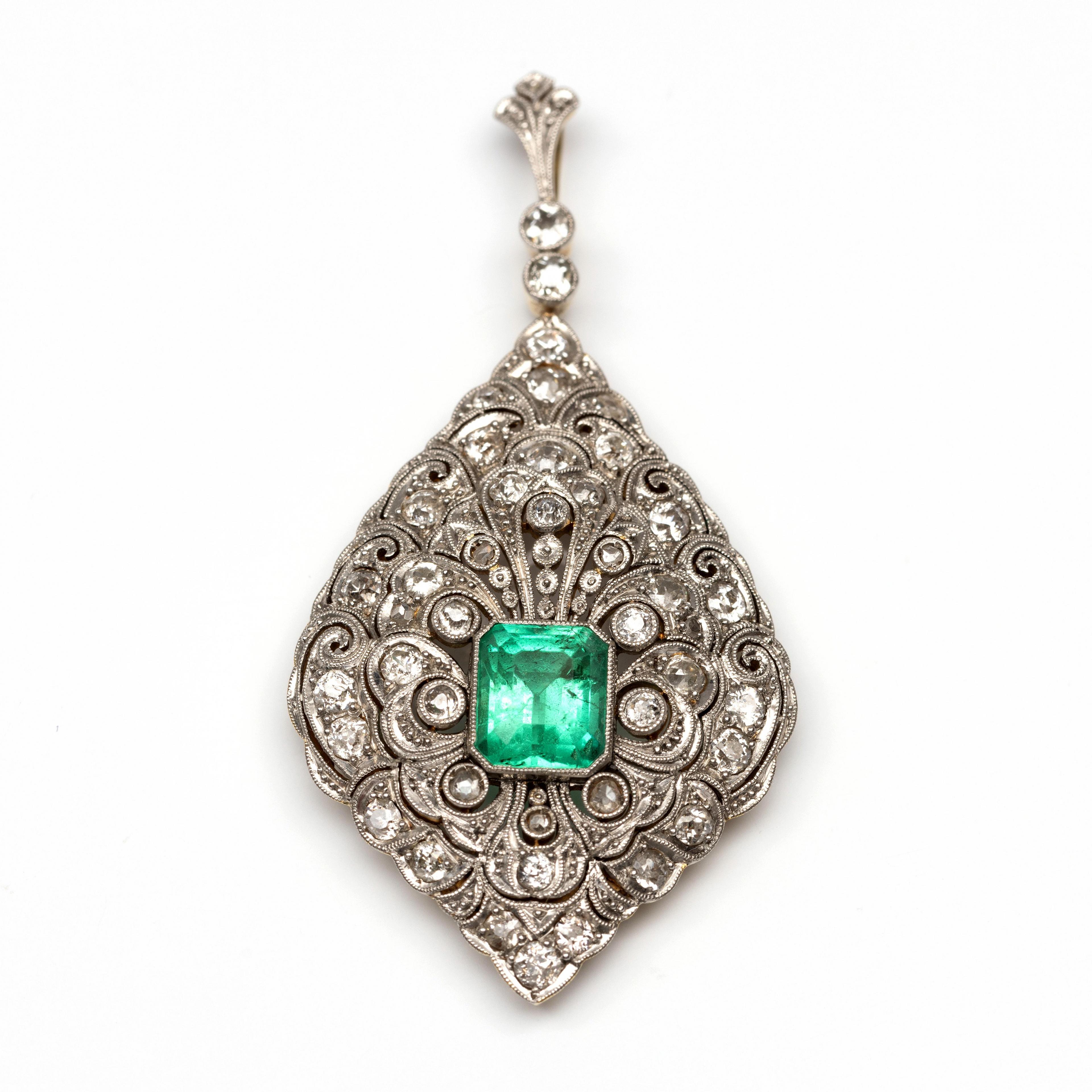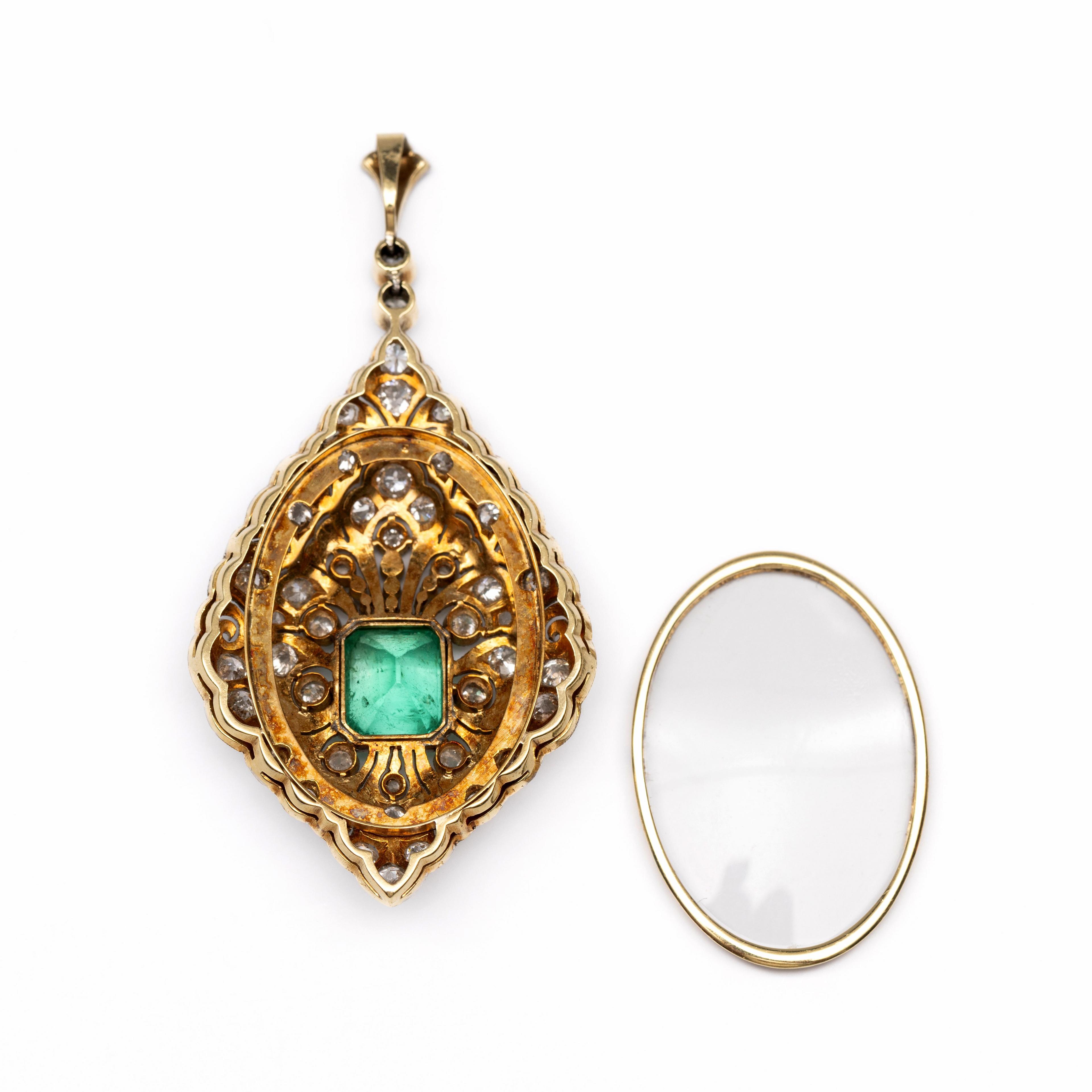 Gold drop shaped pendant, Belle Epoque. The front in white gold, openwork with leaf and scroll motifs and set with rose-cut and old brilliant-cut diamonds weighing approximately 1.80 ct. In the center an emerald-cut emerald weighing approximately 2.80 ct (approx. 8.77 x 7.61 mm). The back in yellow gold with glass to use as a locket .