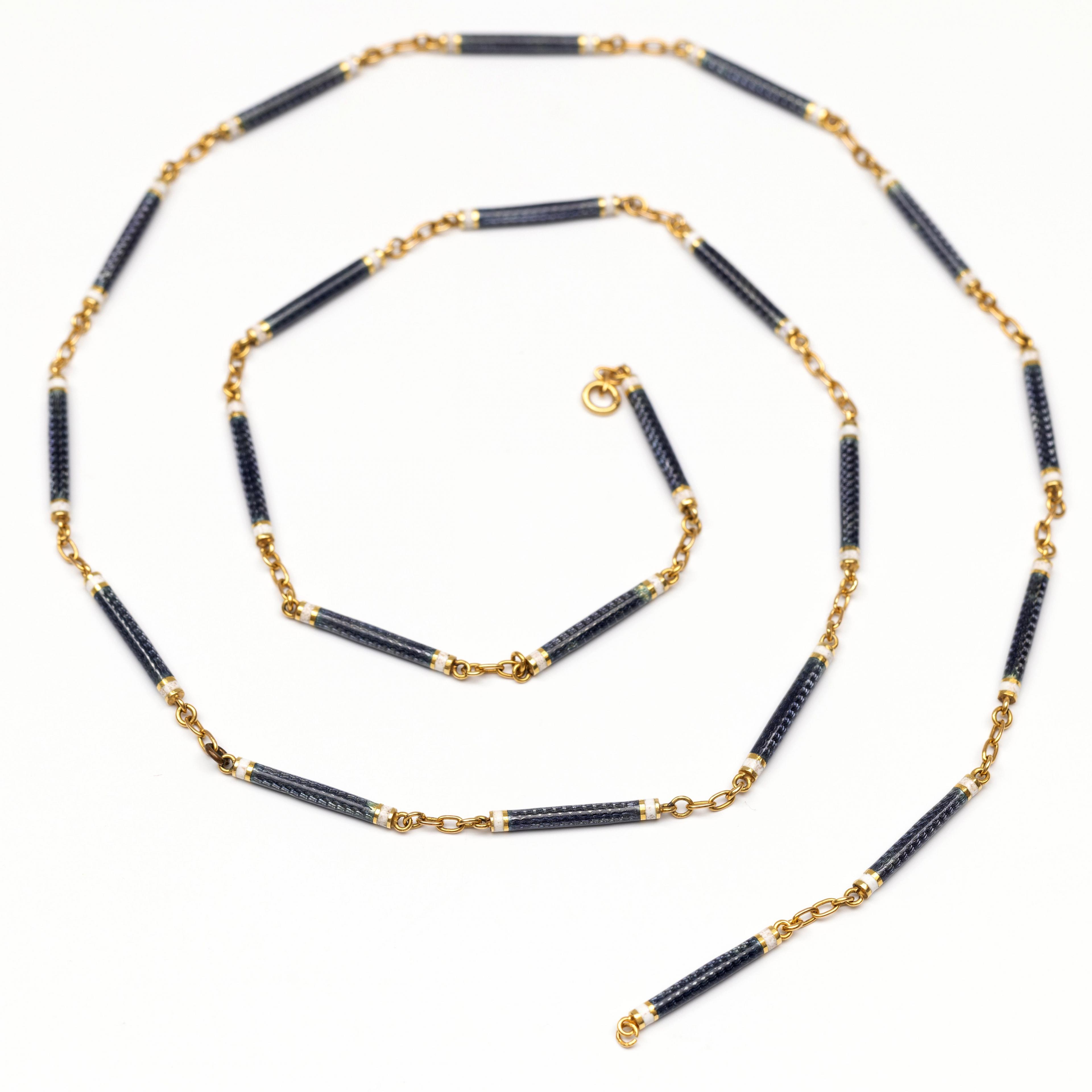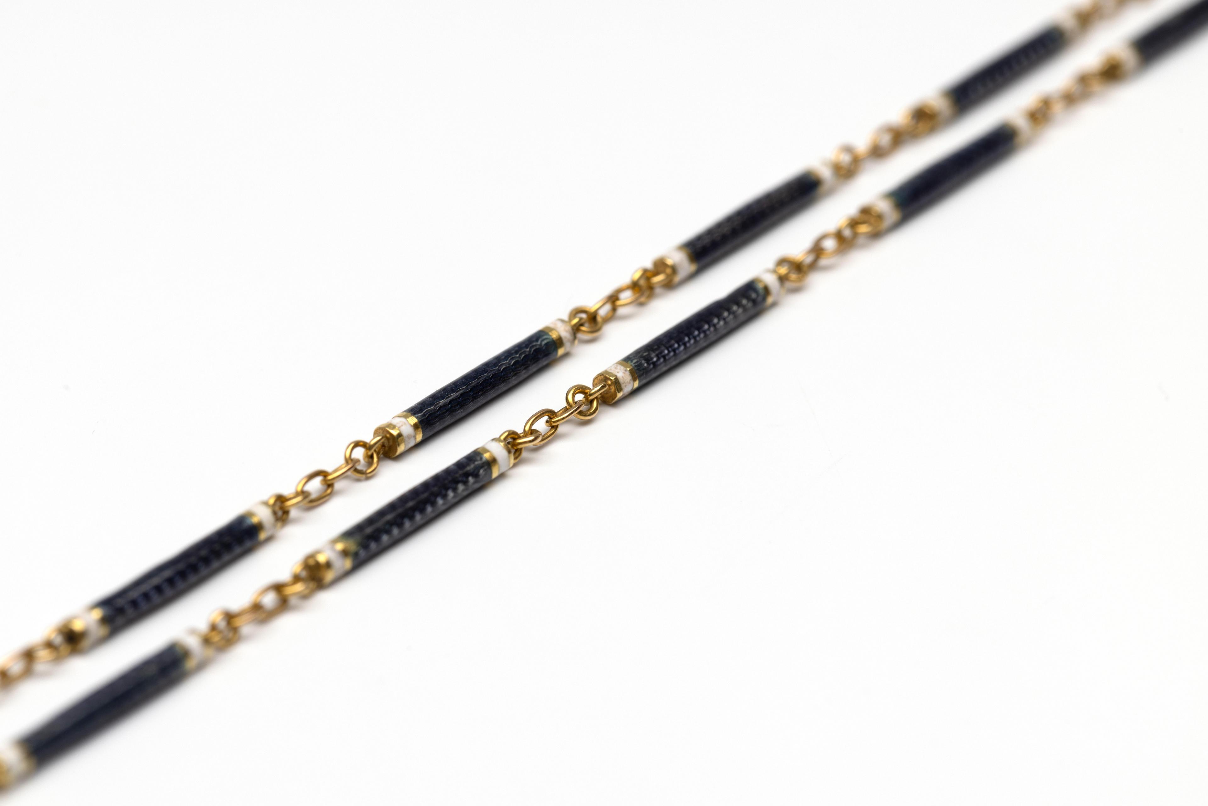 18 k. Gold necklace. Made up of cylindrical links with blue guilloche enamel, set between a white enamel band. The cylinders are connected by small oval links.