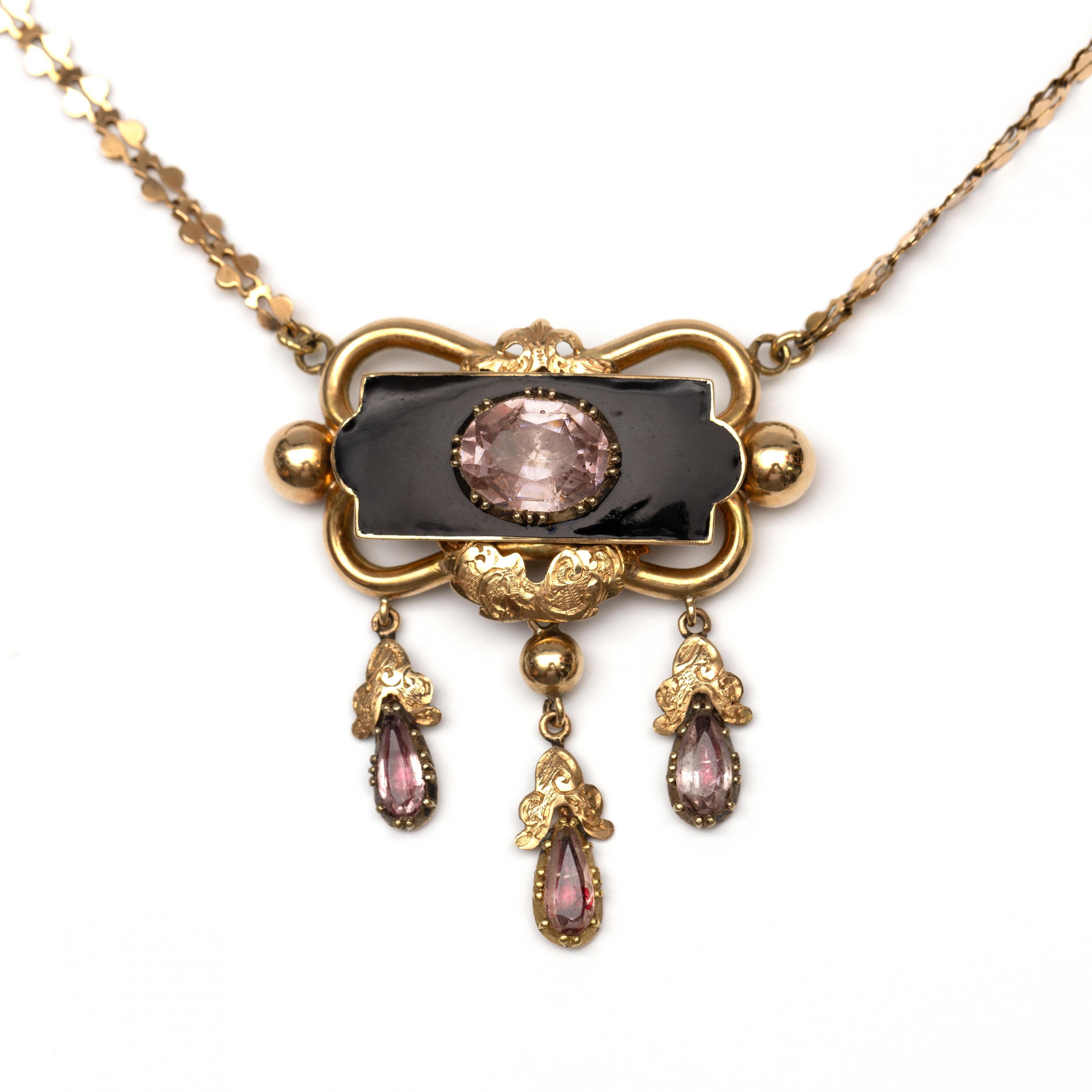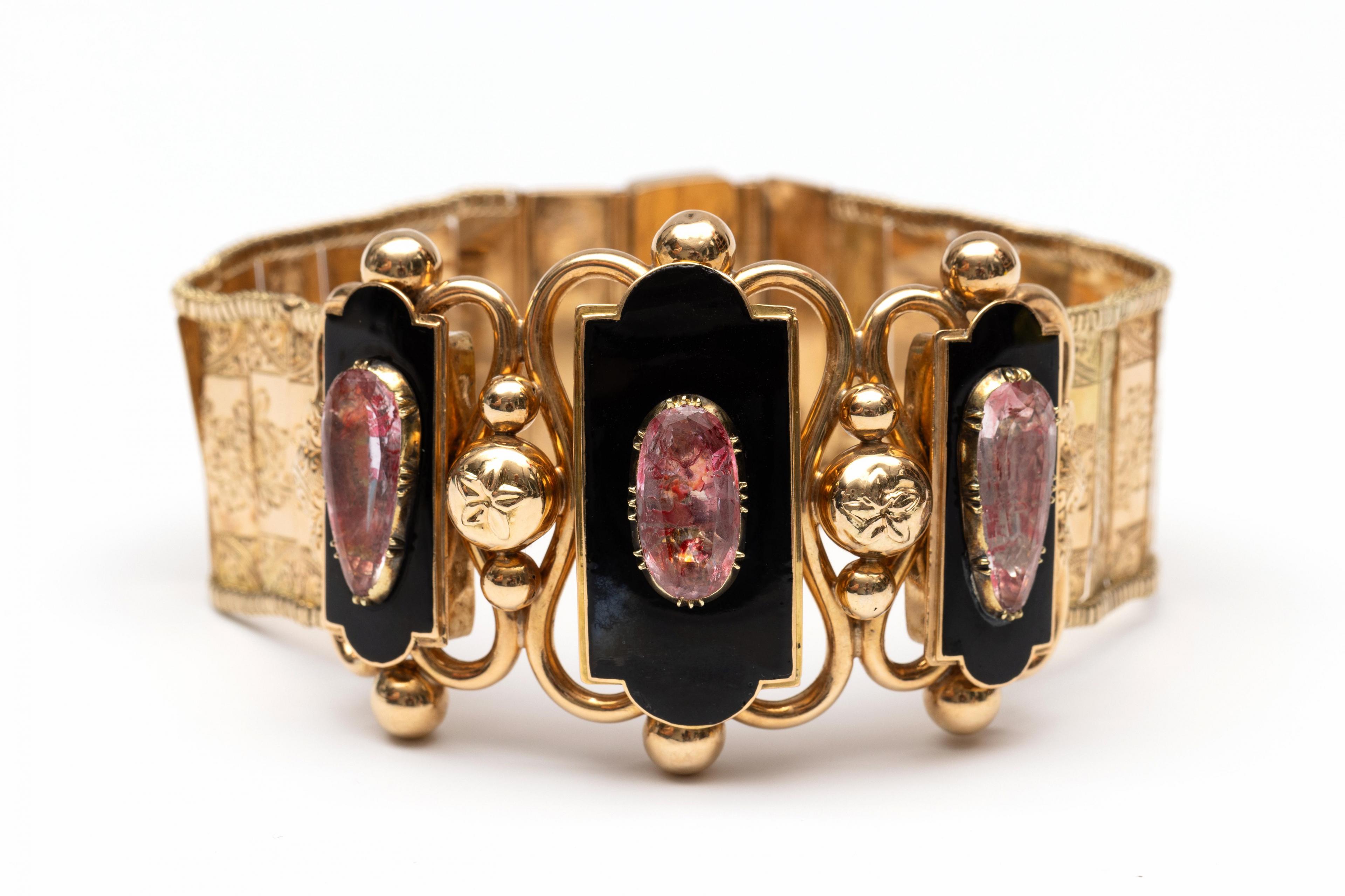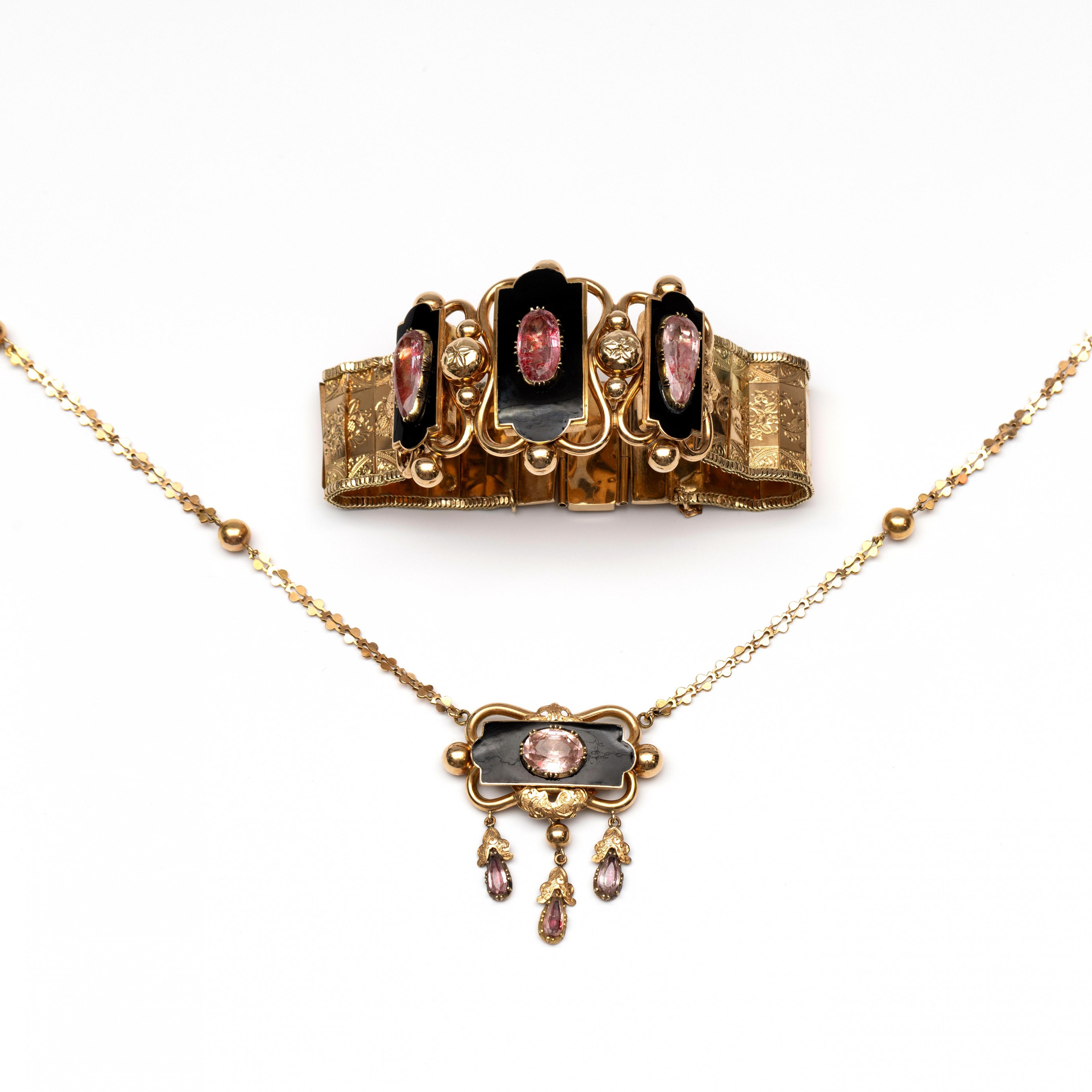 14 k. gold Dutch Biedermeier demi-parure. Consisting of a bracelet and a pendant. Both composed of cartouches. Each is centrally set with a faceted rock crystal on pink foil, against a black enamel background, surrounded by arches and spheres, the sides with leaf-shaped appliqués. The pendant with three drops, also set with rock crystal on foil. The pendant is attached to a fantasy link necklace, alternating with spheres. The bracelet attached to a band composed of rectangular panels with continuous engravings, connected by a foxtail link necklace.