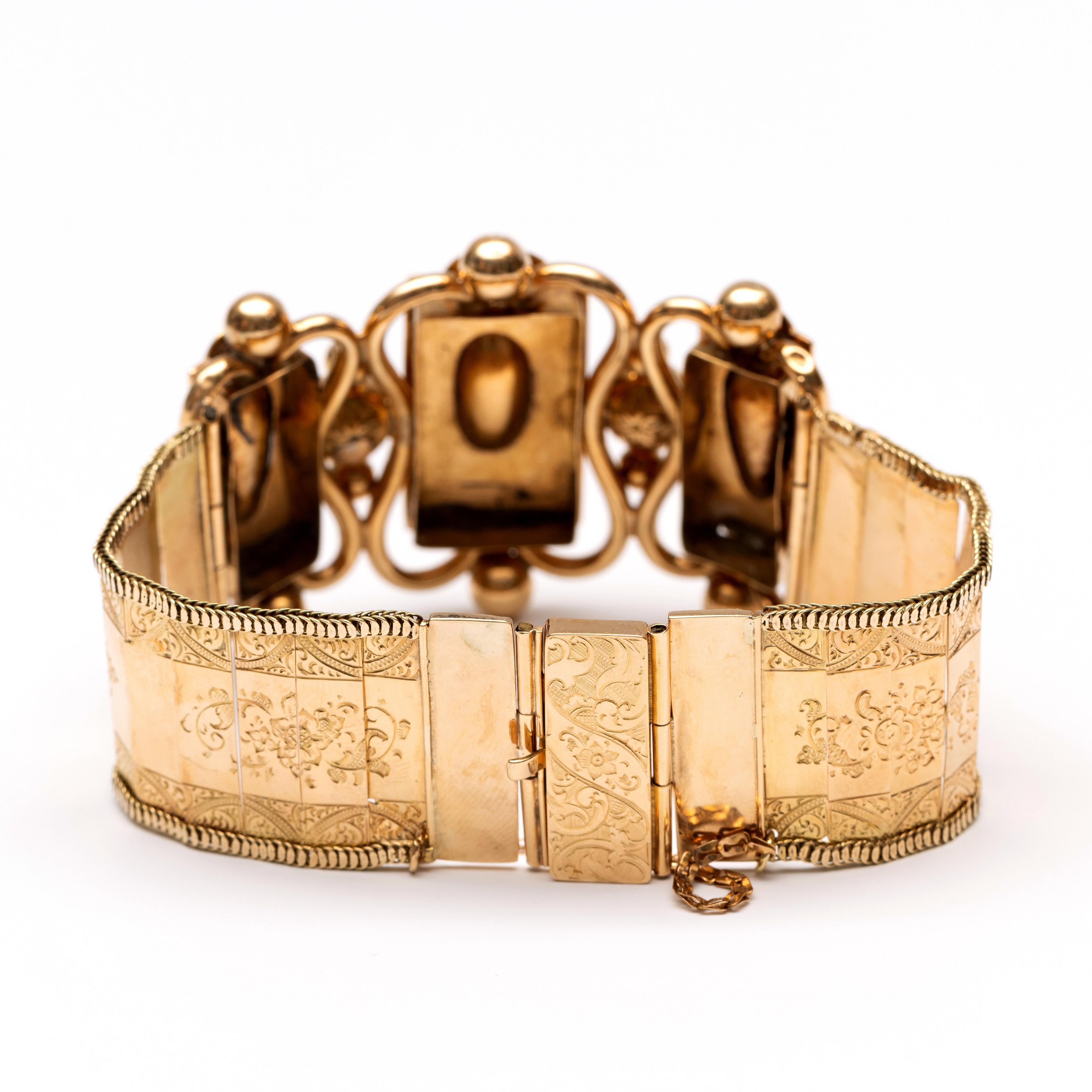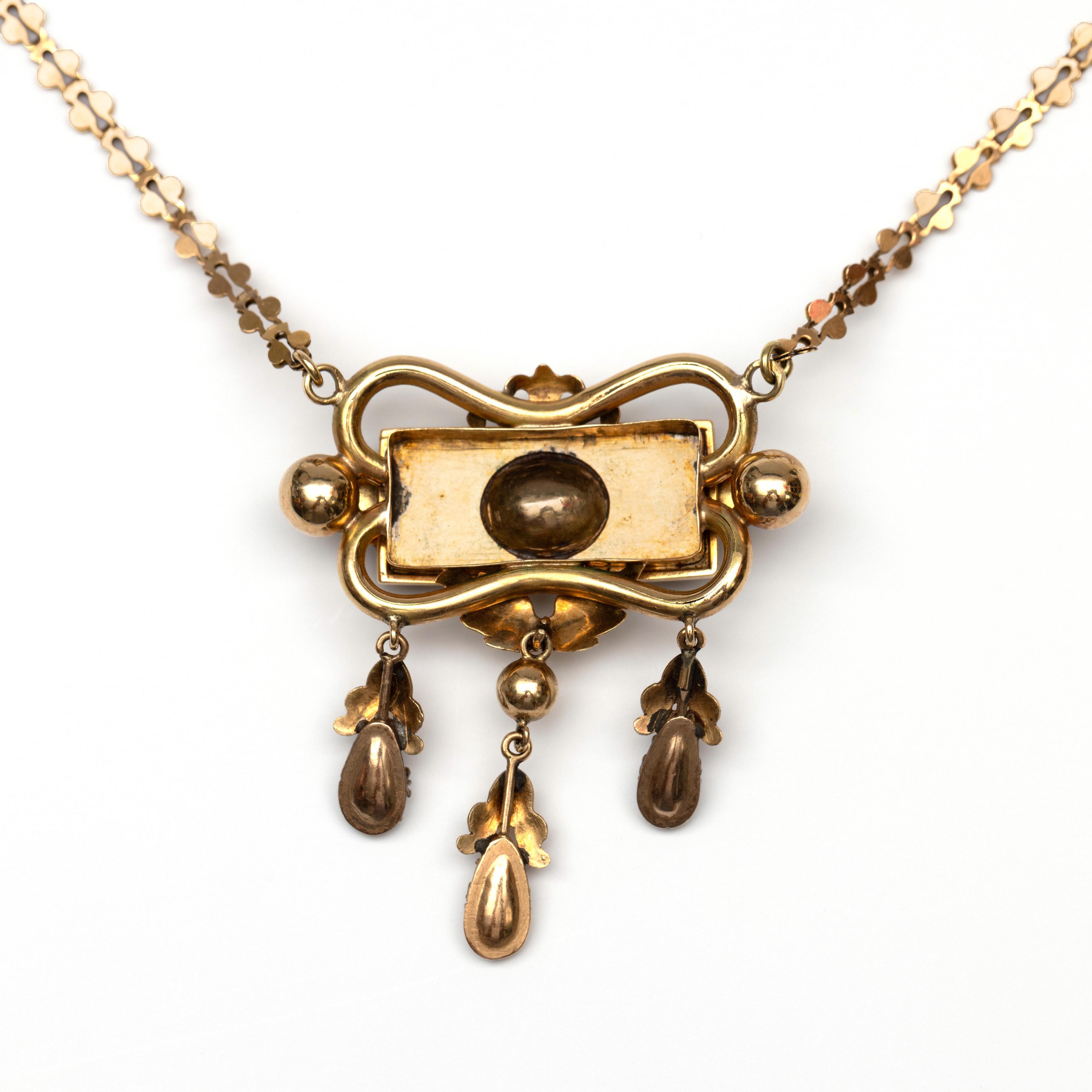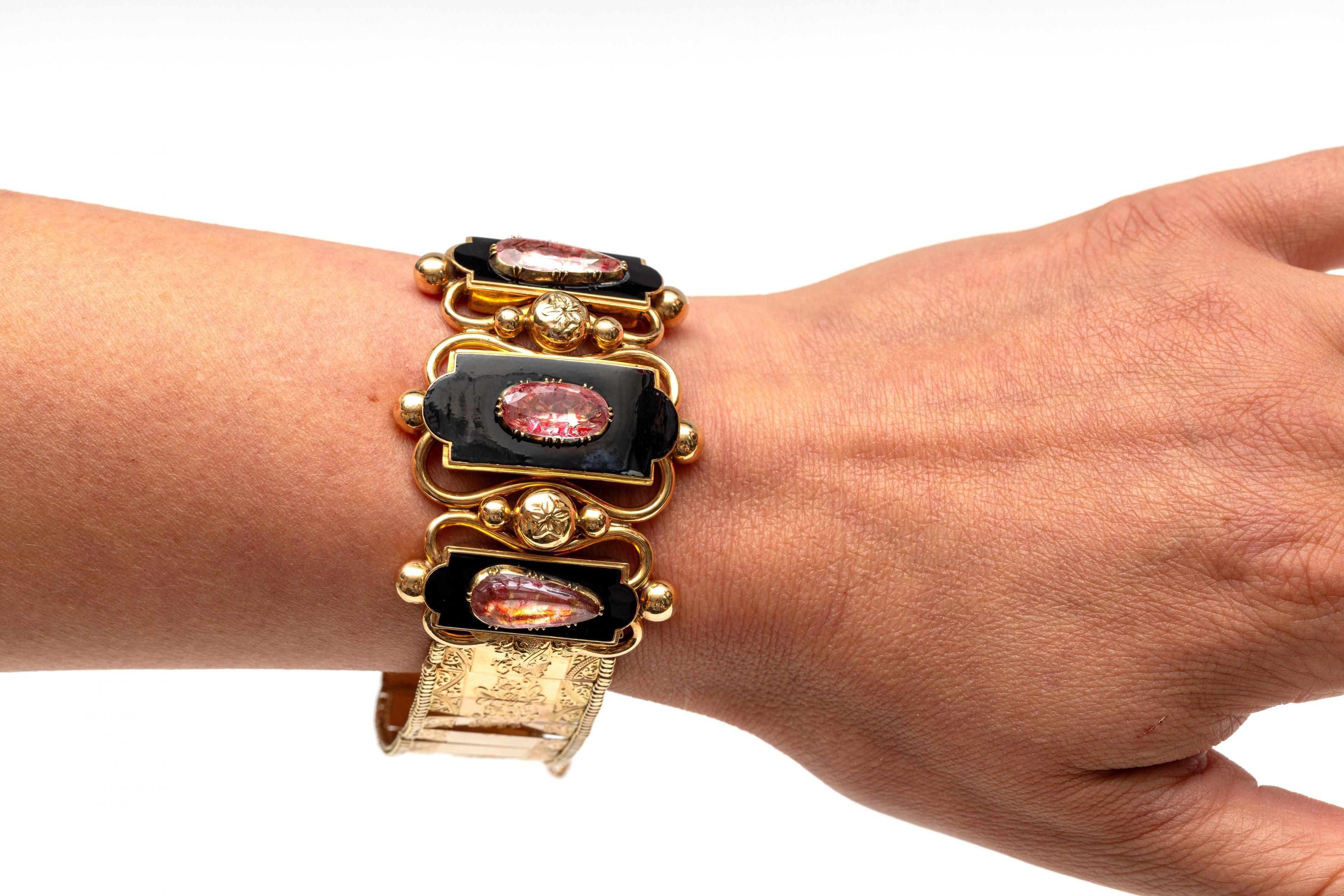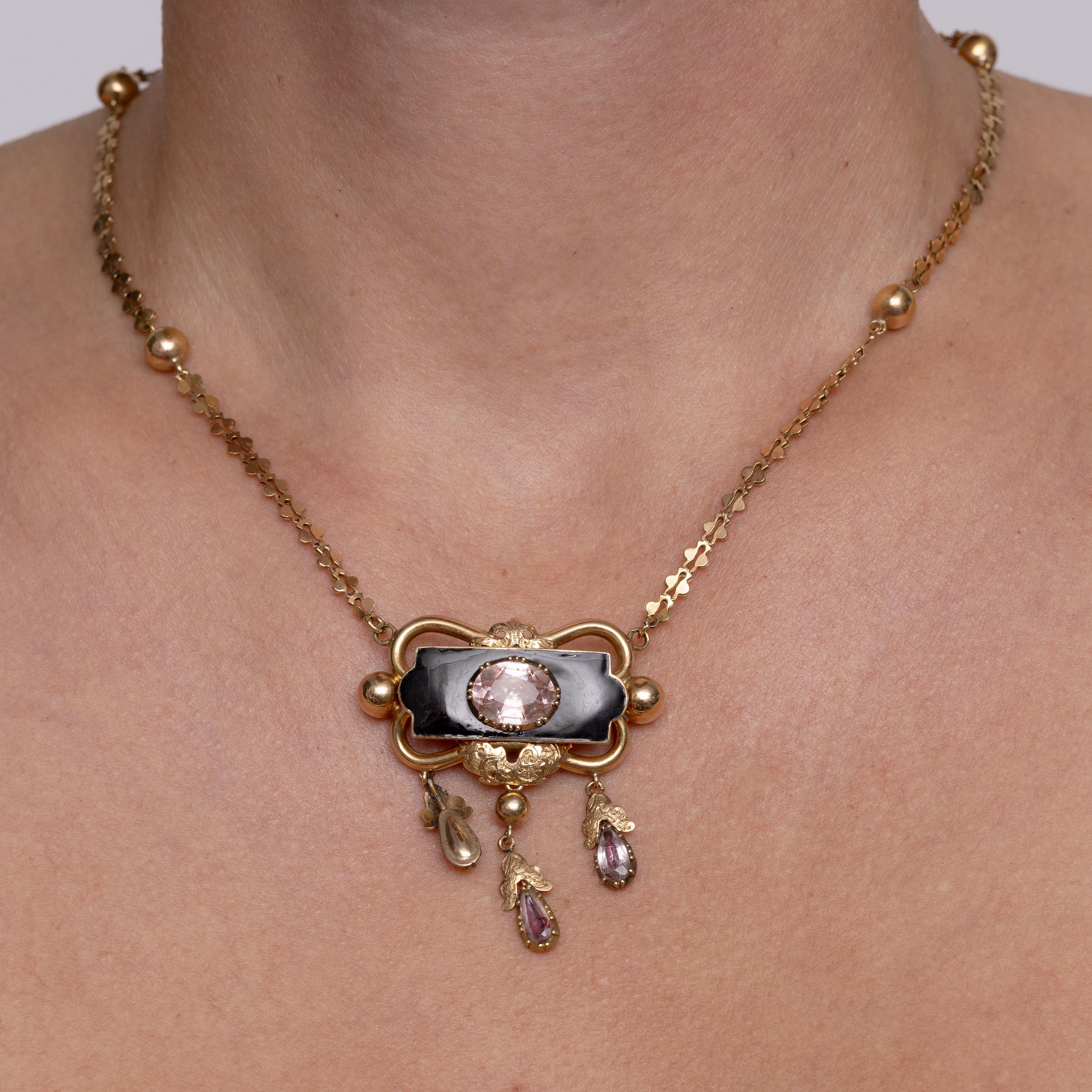 14 k. gold Dutch Biedermeier demi-parure. Consisting of a bracelet and a pendant. Both composed of cartouches. Each is centrally set with a faceted rock crystal on pink foil, against a black enamel background, surrounded by arches and spheres, the sides with leaf-shaped appliqués. The pendant with three drops, also set with rock crystal on foil. The pendant is attached to a fantasy link necklace, alternating with spheres. The bracelet attached to a band composed of rectangular panels with continuous engravings, connected by a foxtail link necklace.