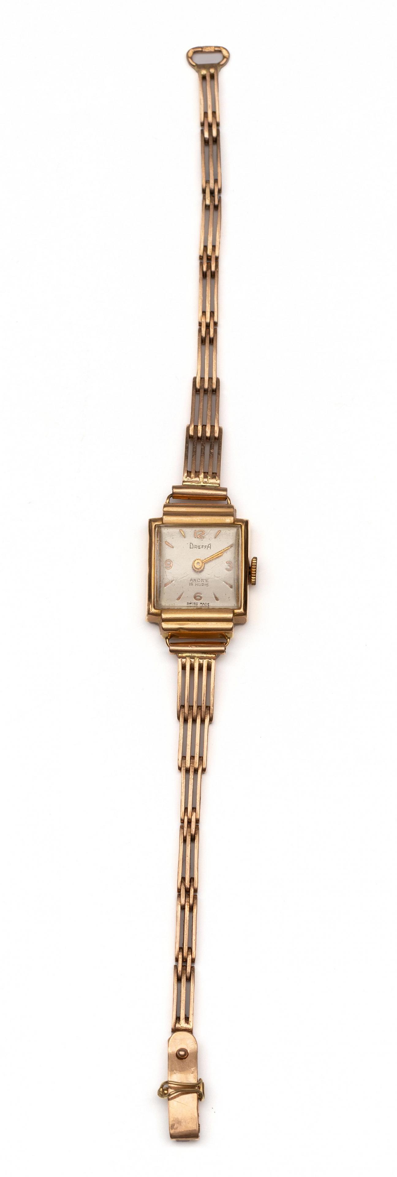 Dreffa, 18 k. gold wristwatch, 1930s-40s. Hand-wound. With a square silver-coloured dial with Arabic numerals and batons at the hours. On a 14 k. gold strap, tapering in width from the center, made up of bars.