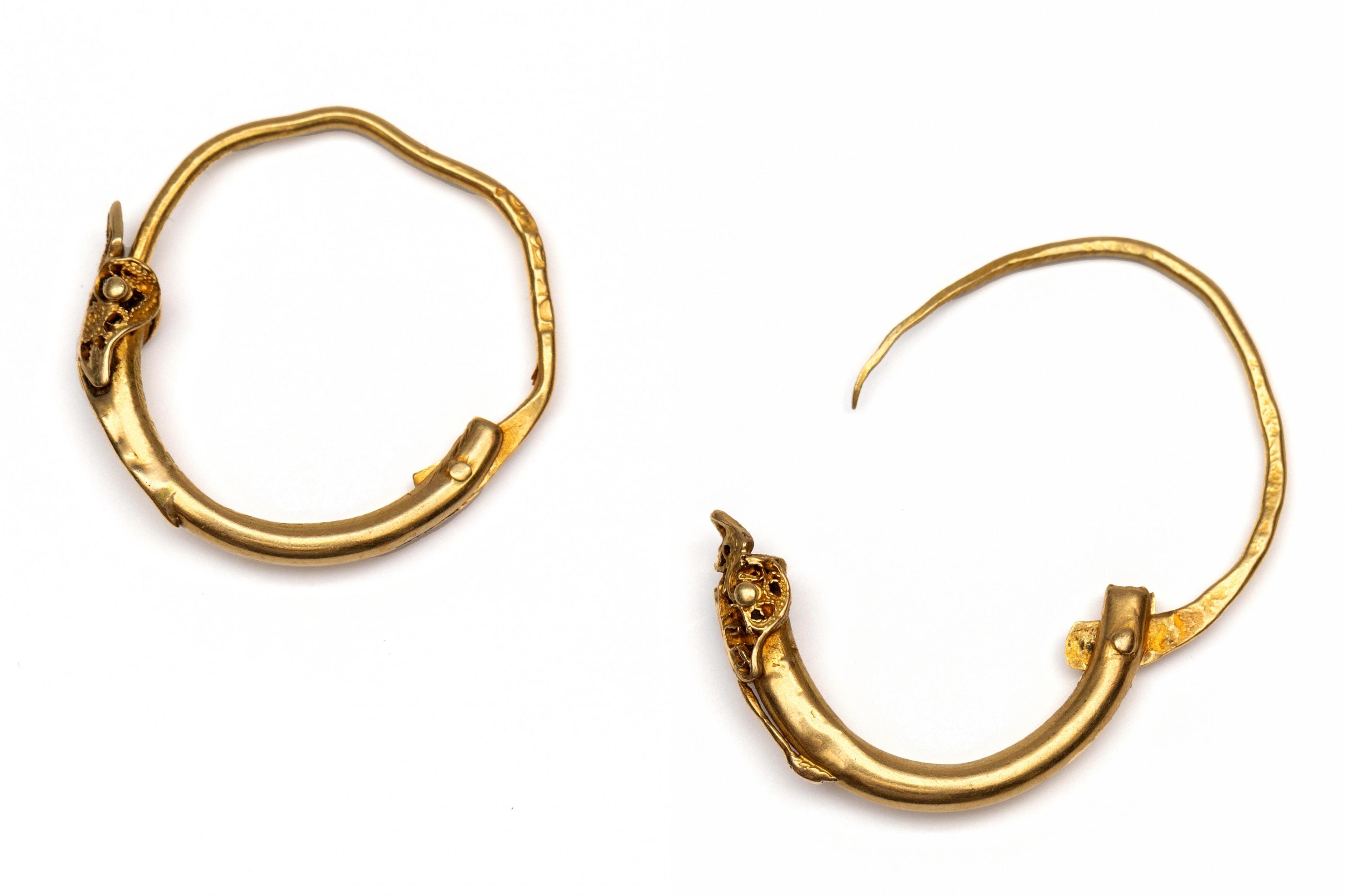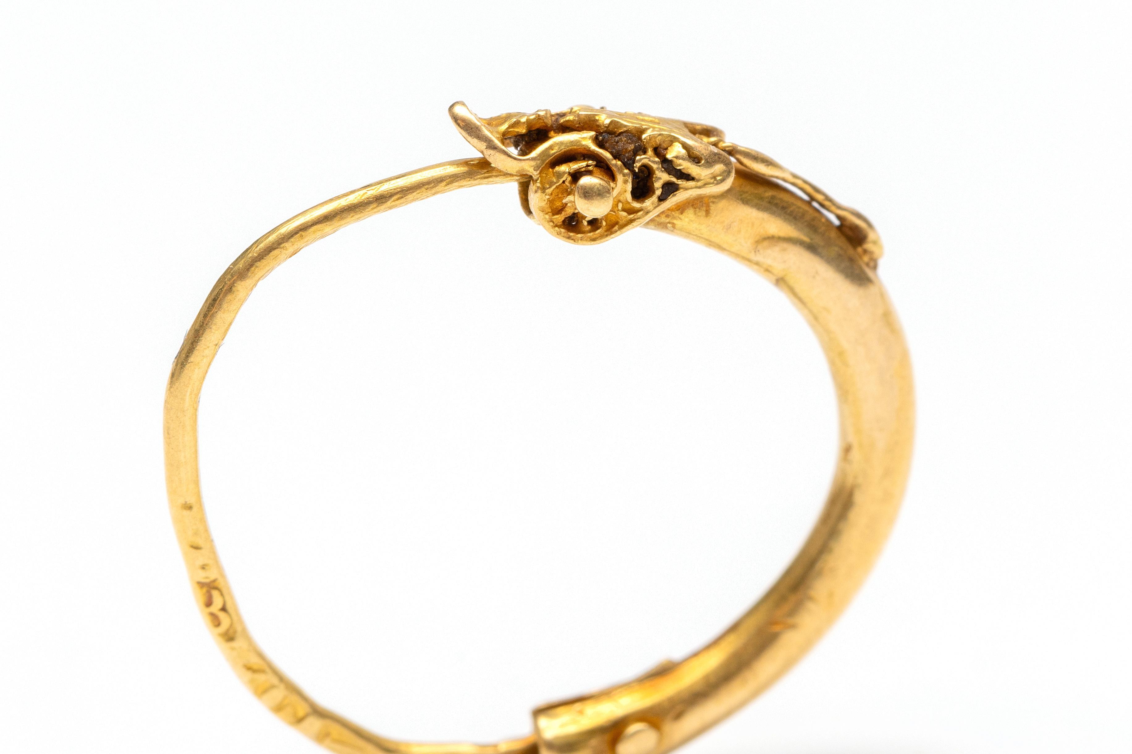 18 k. Gold hoop earrings, 19th century. Snake-shaped, the head decorated with filigree.