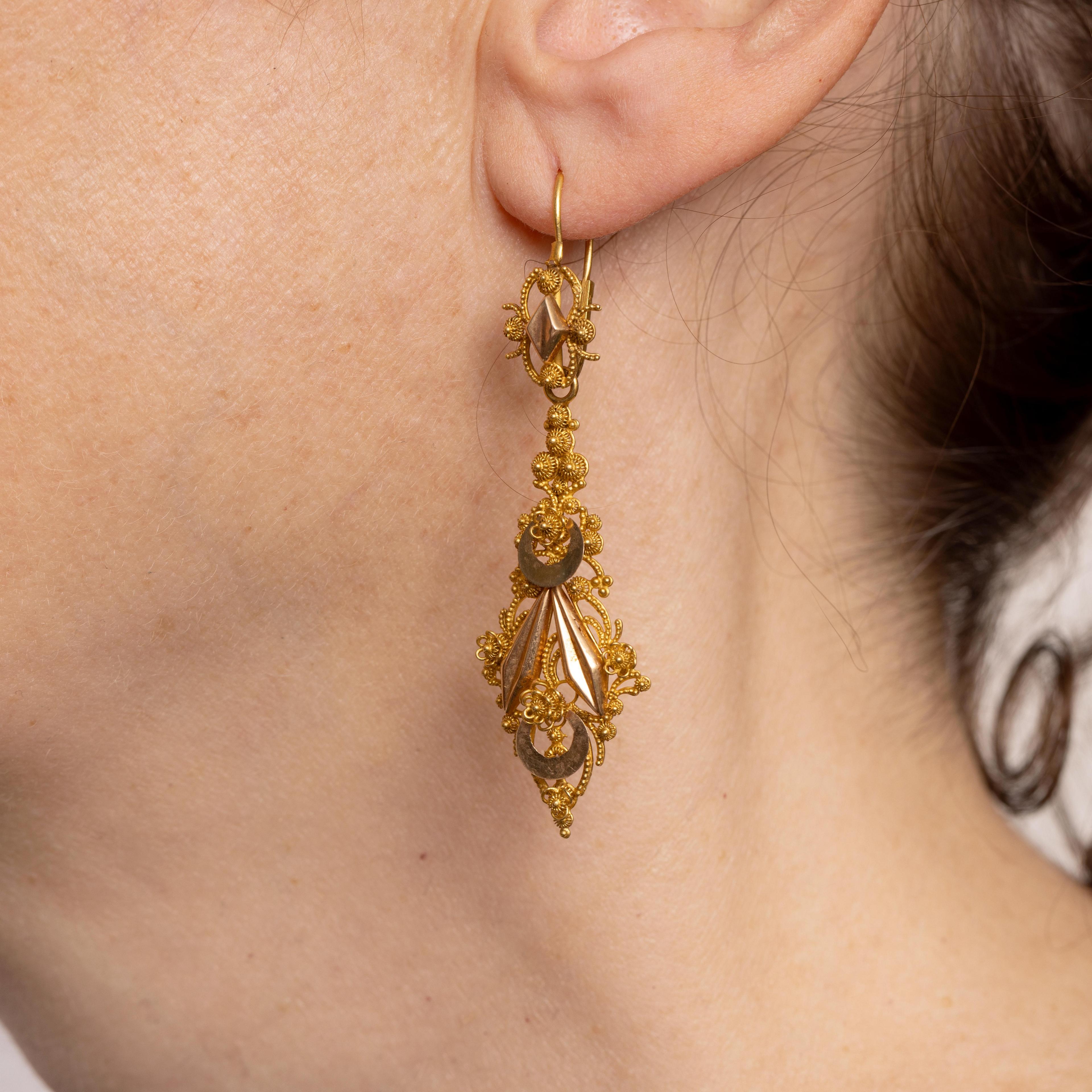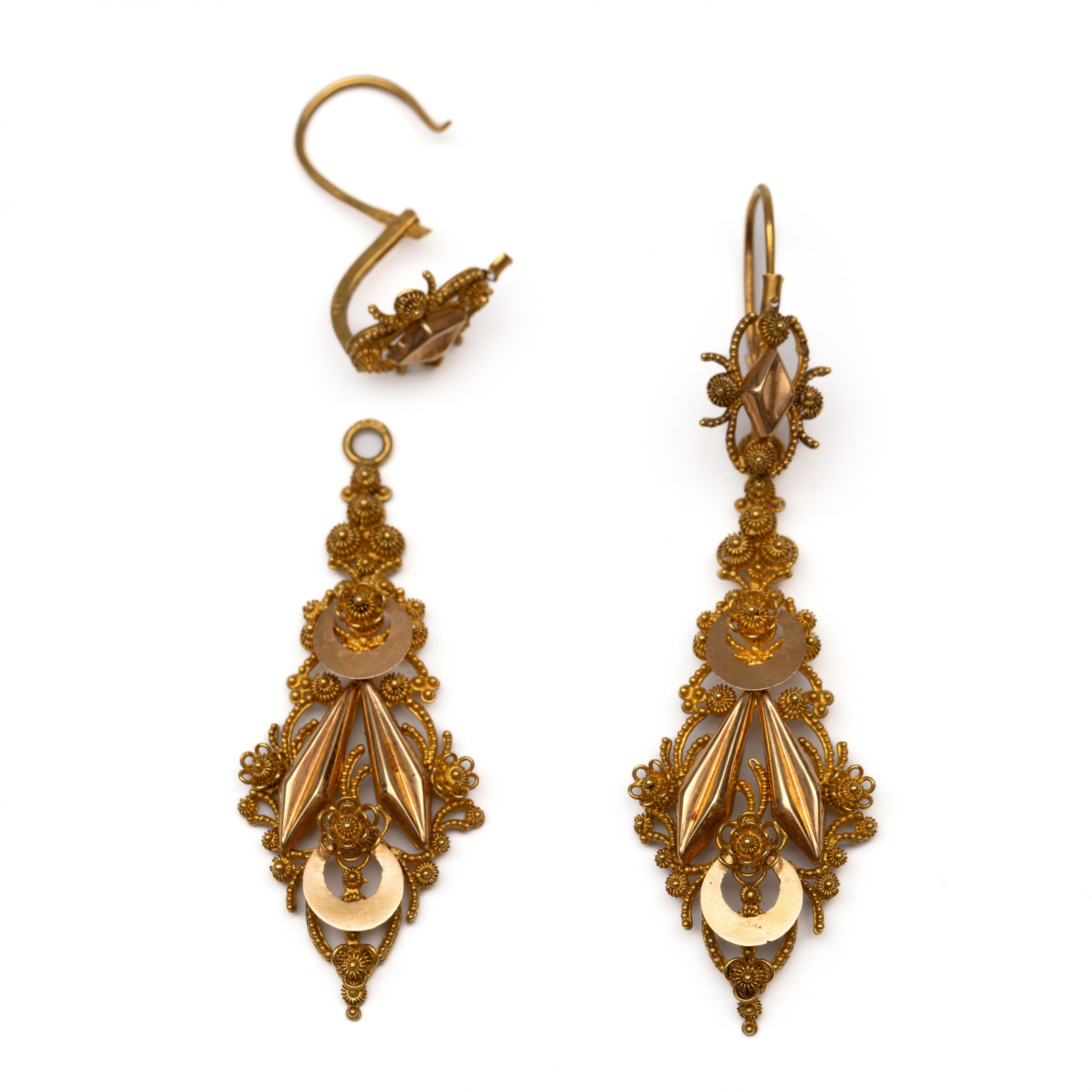 Gedecoreerd met filigrain, spinnetjes en, in roodgoud, repoussé. De oorbellen in een day & night model. Meesterteken wed. Bernardus Gillis, Den Bosch, 1833-1859