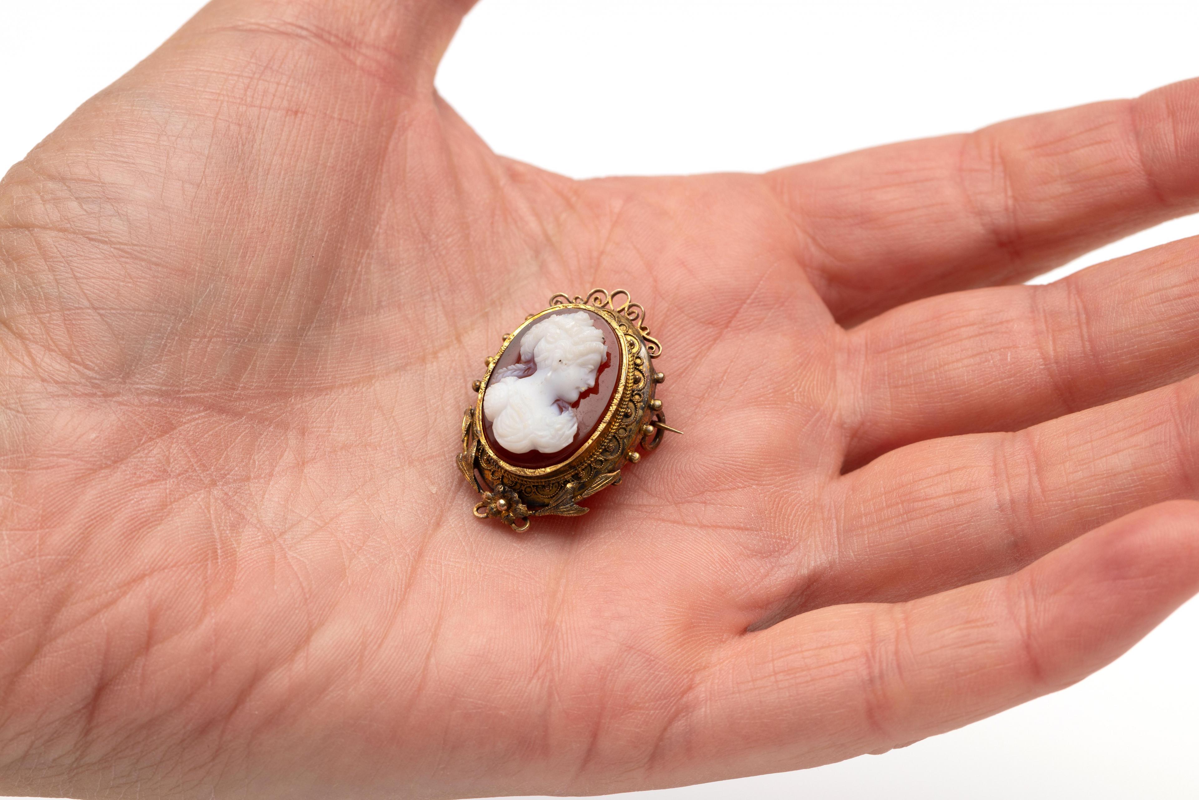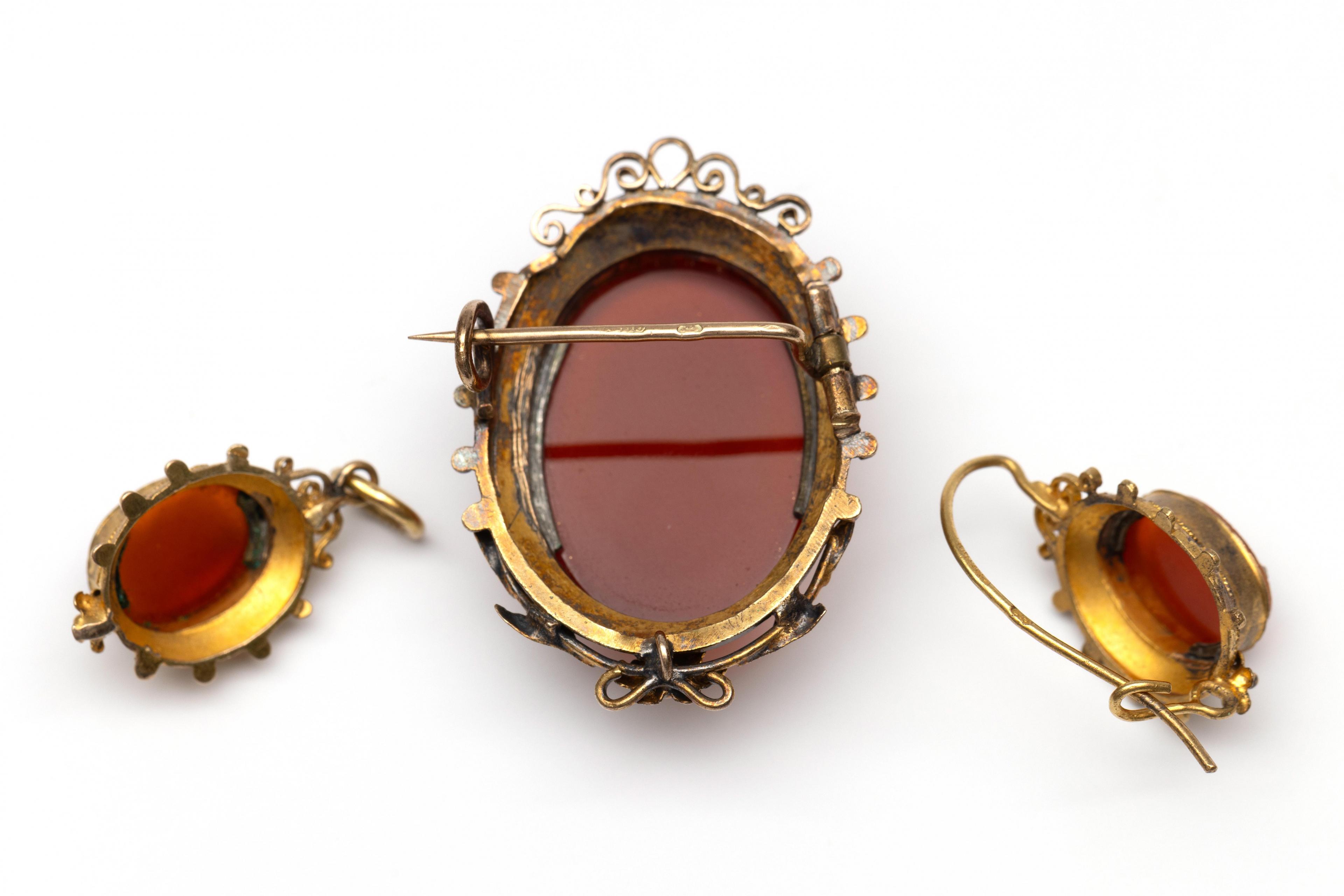 14 k. gold brooch and earrings. Each with a cameo made of agate depicting a lady. The rim decorated with floral and leaf motifs, scrolls, filigree, and spheres.