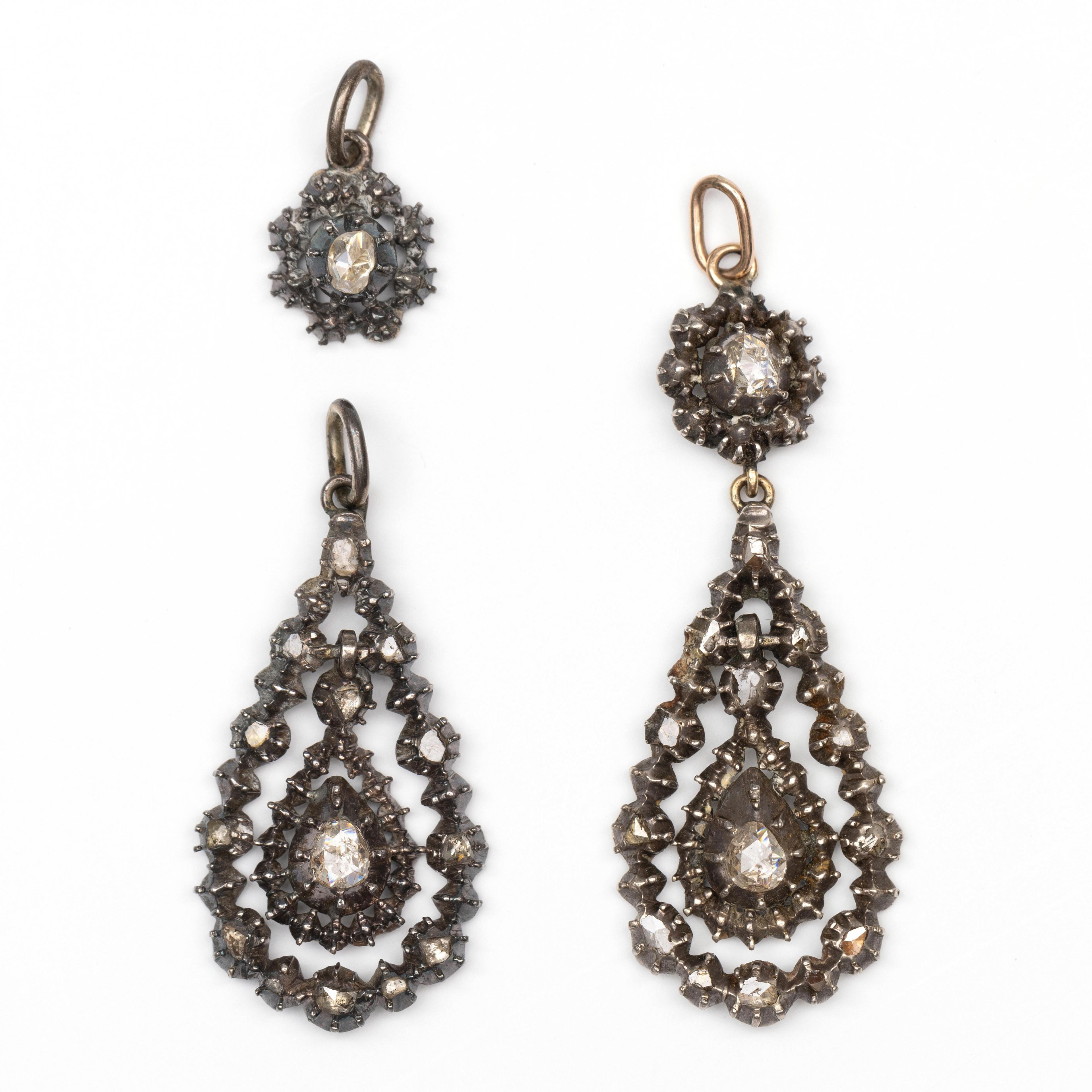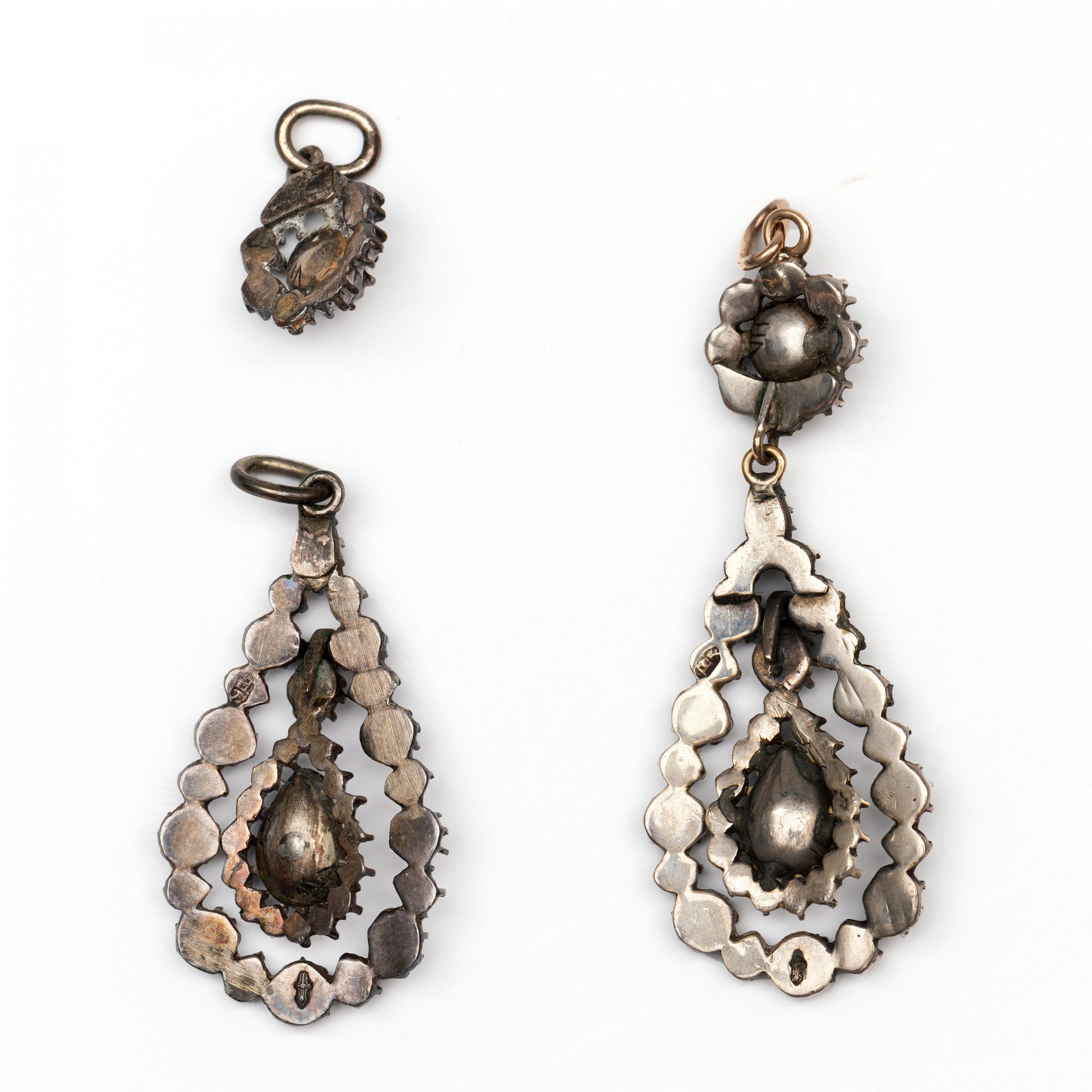 Two identical silver pendants, originally earrings, 19th century. Shaped like a drop with a rosette above it. In the center, dangling loosely, is another teardrop. Set with a rose-cut diamond. Maker's mark probably GH Barends, Amsterdam, 1852-1855
